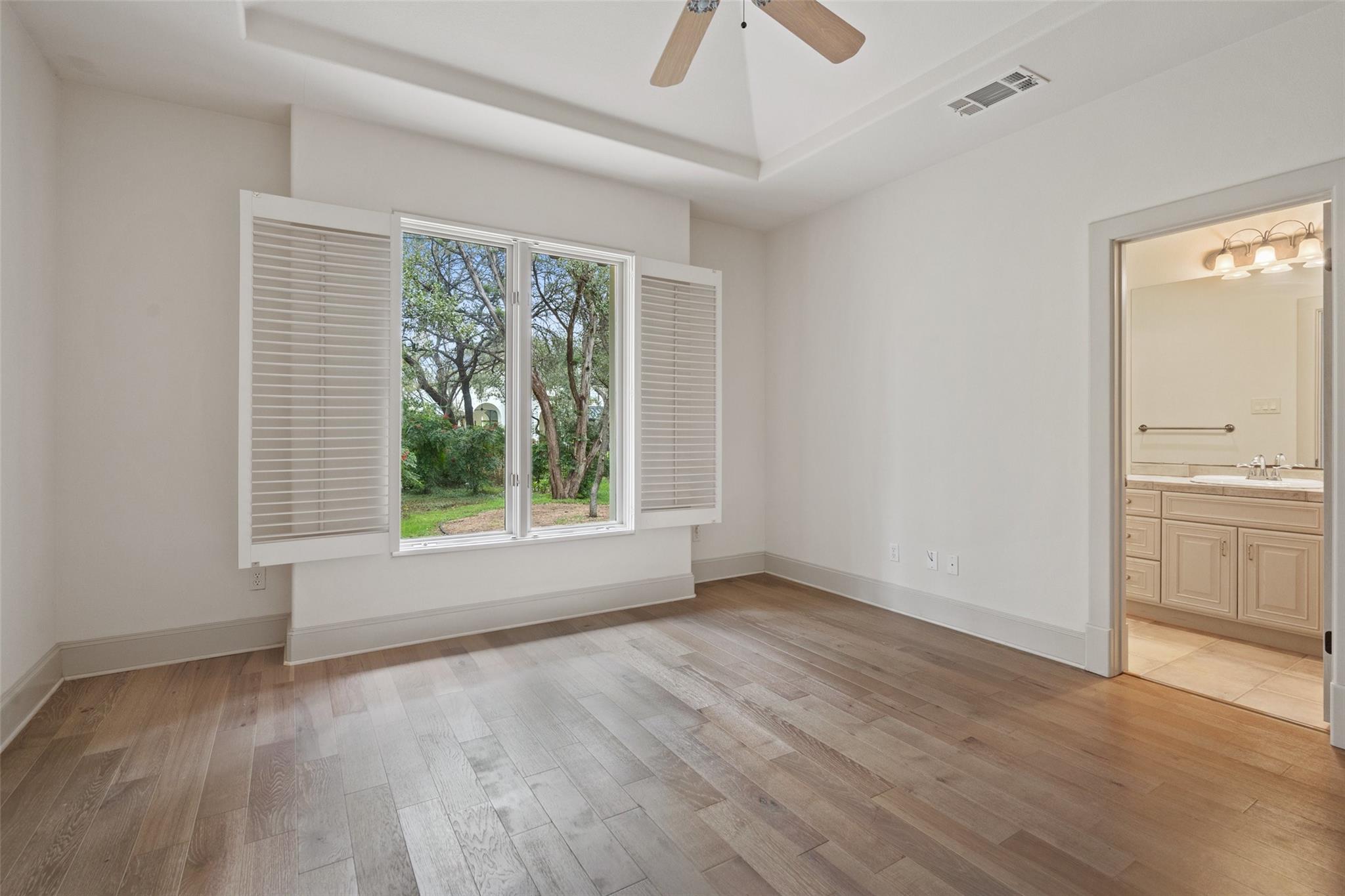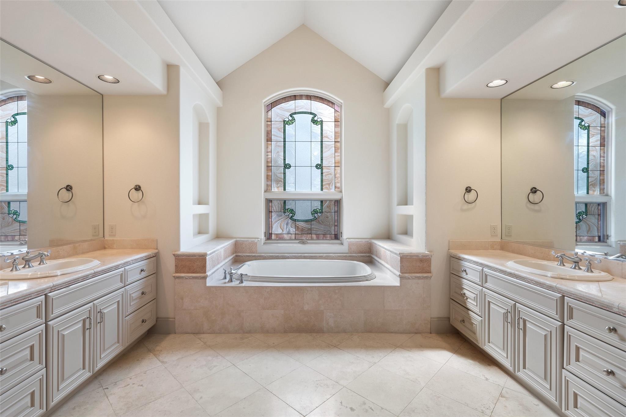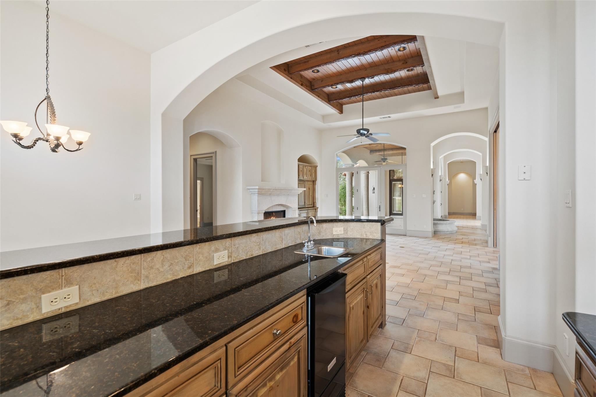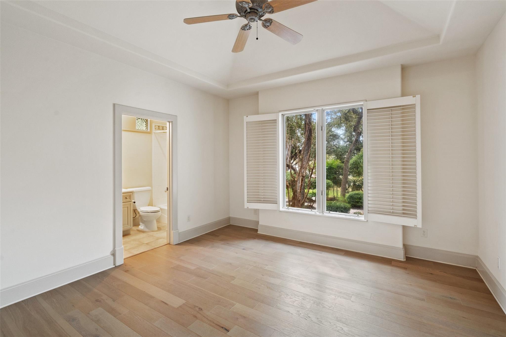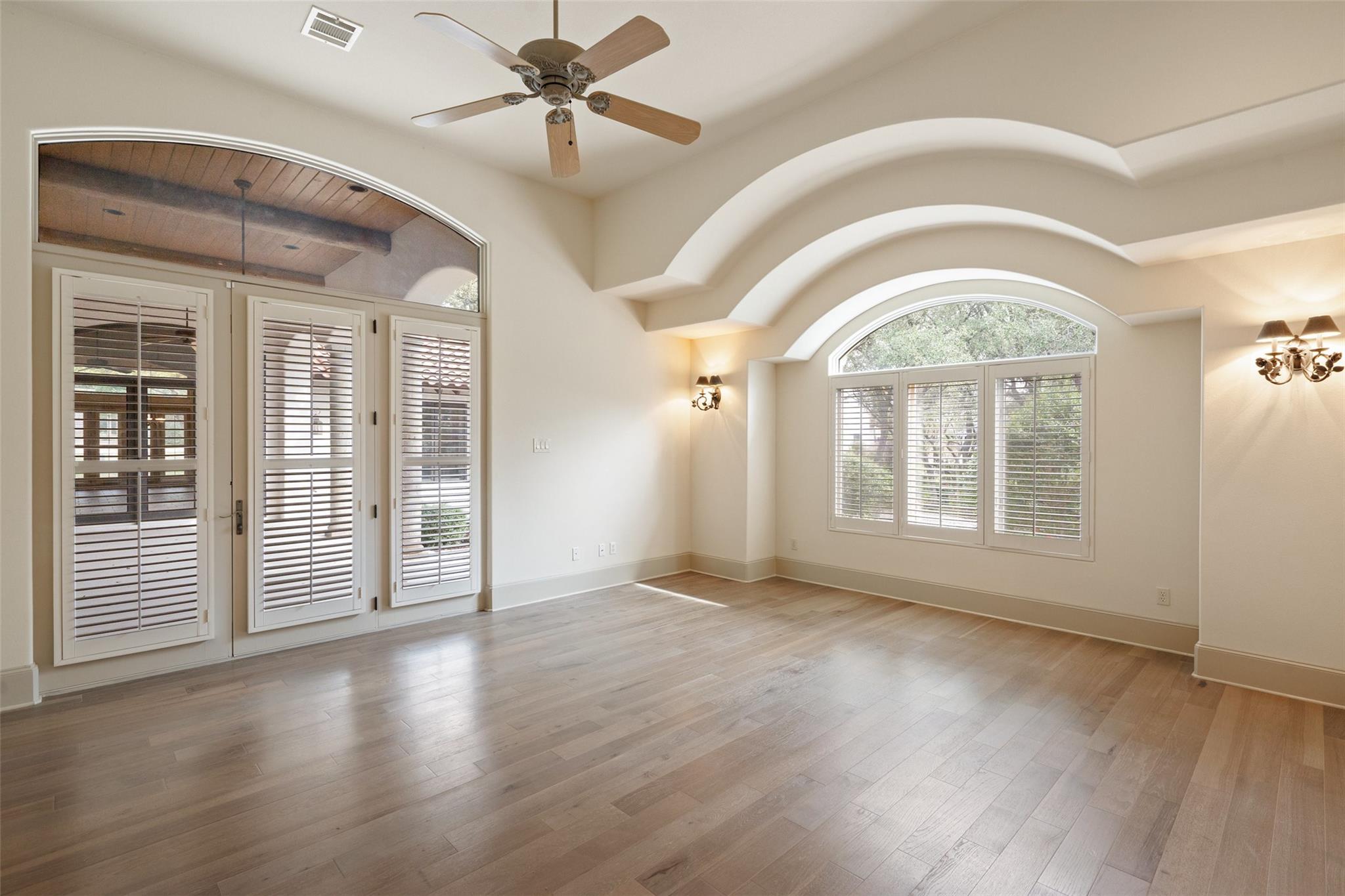 Welcome to your private oasis behind the gates in the prestigious community of Woods I in Barton Creek. Nestled among the towering oak trees, this stunning single-story home boasts an open floor plan flooded with natural light, creating an inviting and serene atmosphere. As you step inside, you'll be greeted by a 25-foot entry tower with native limestone walls and wood beamed ceiling. Thirteen-foot ceilings with gorgeous architectural details are found throughout all living areas, accentuating the spaciousness and grandeur of the home. The formal living and dining areas provide an elegant backdrop for entertaining, while the breakfast room offers access to a private patio, perfect for creating an outdoor kitchen. The generously sized primary suite features two walk-in closets, a separate shower, a luxurious whirlpool tub, bidet, and separate sinks, offering a peaceful retreat. Additionally, there are 3 bedrooms, each with private baths and walk-in closets, providing comfort and privacy. The exterior of the home is adorned with a beautiful stone and stucco facade, complemented by a concrete tile roof, exuding timeless elegance and durability. The .77-acre lot is adorned with an abundance of oak trees and Japanese-style gardens, creating a tranquil and picturesque setting. For the culinary enthusiast, the spacious kitchen is equipped with a Sub-Zero refrigerator, ice maker, 5-burner gas stove, single oven, granite counters, and an abundance of custom cabinetry. The sit-up bar and island provide the perfect space for meal preparation and casual entertaining. Additional features include beamed ceilings, a cantera stone fireplace, built-in entertainment center and speakers in the informal living area. Built in 1998 by award-winning Thomas L. Luth, this home exudes quality and craftsmanship at every turn. With a 3-car garage, and a large covered verandah, this home offers the perfect blend of luxury, comfort, and functionality.