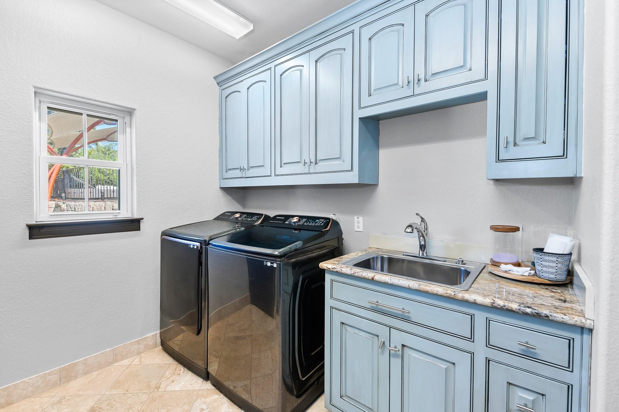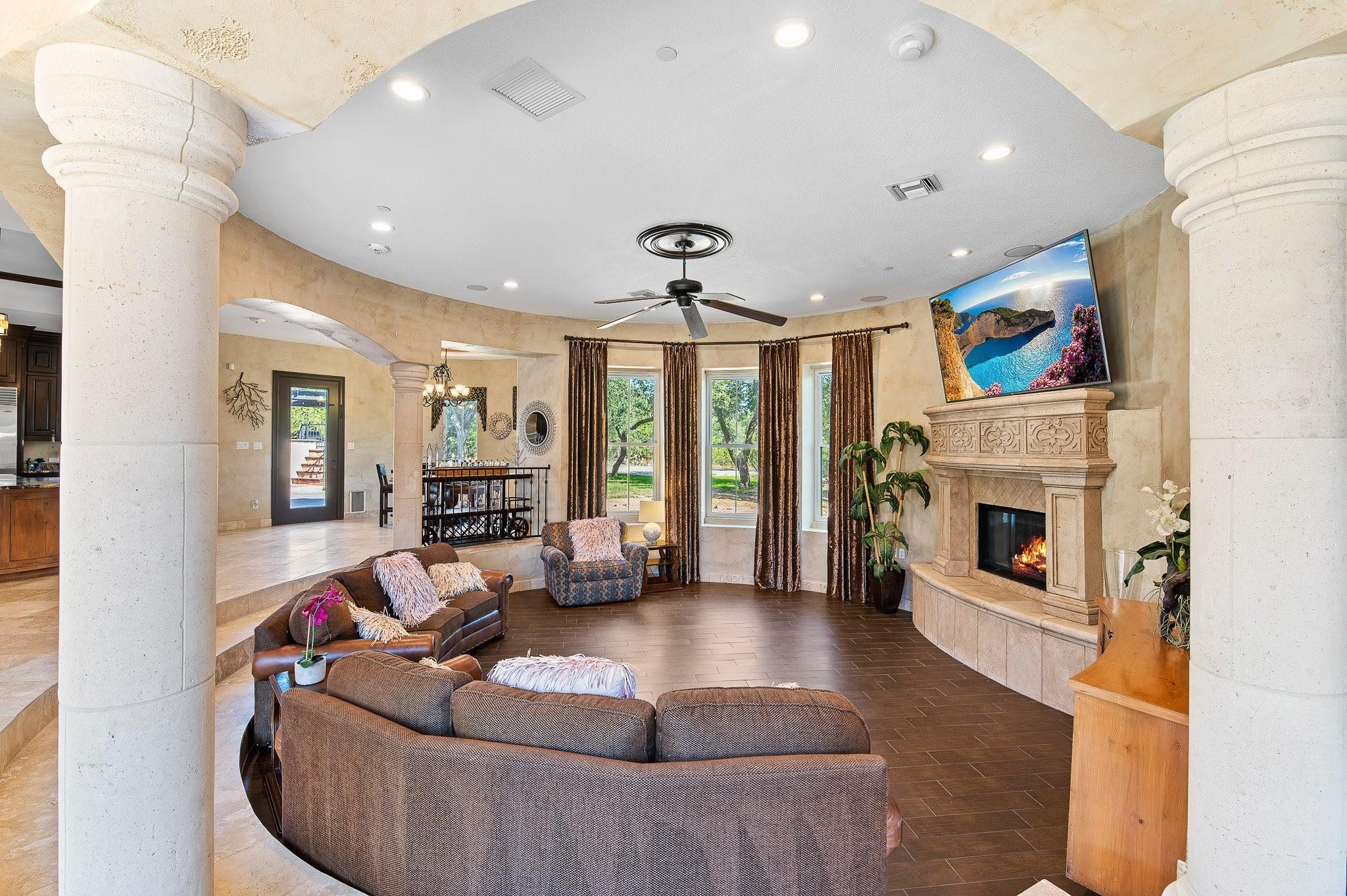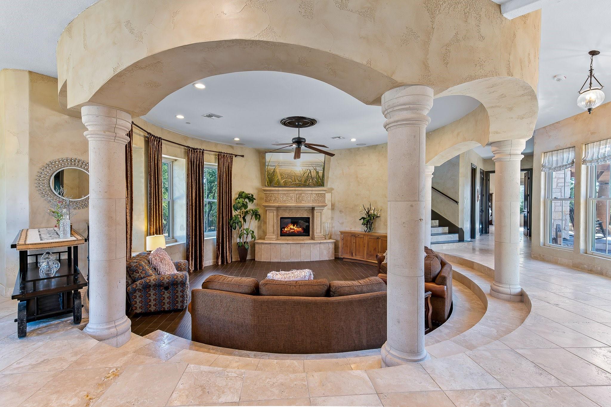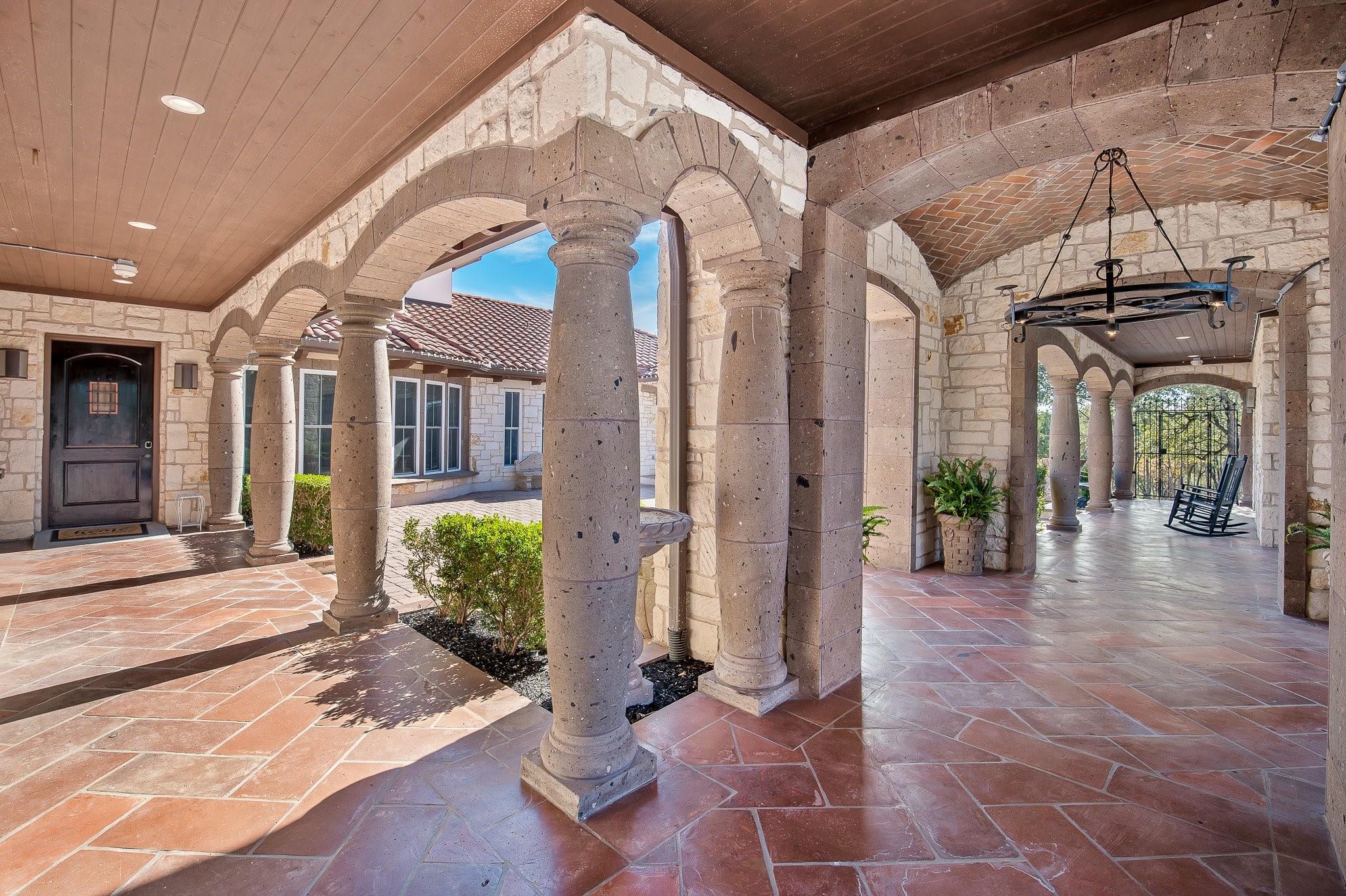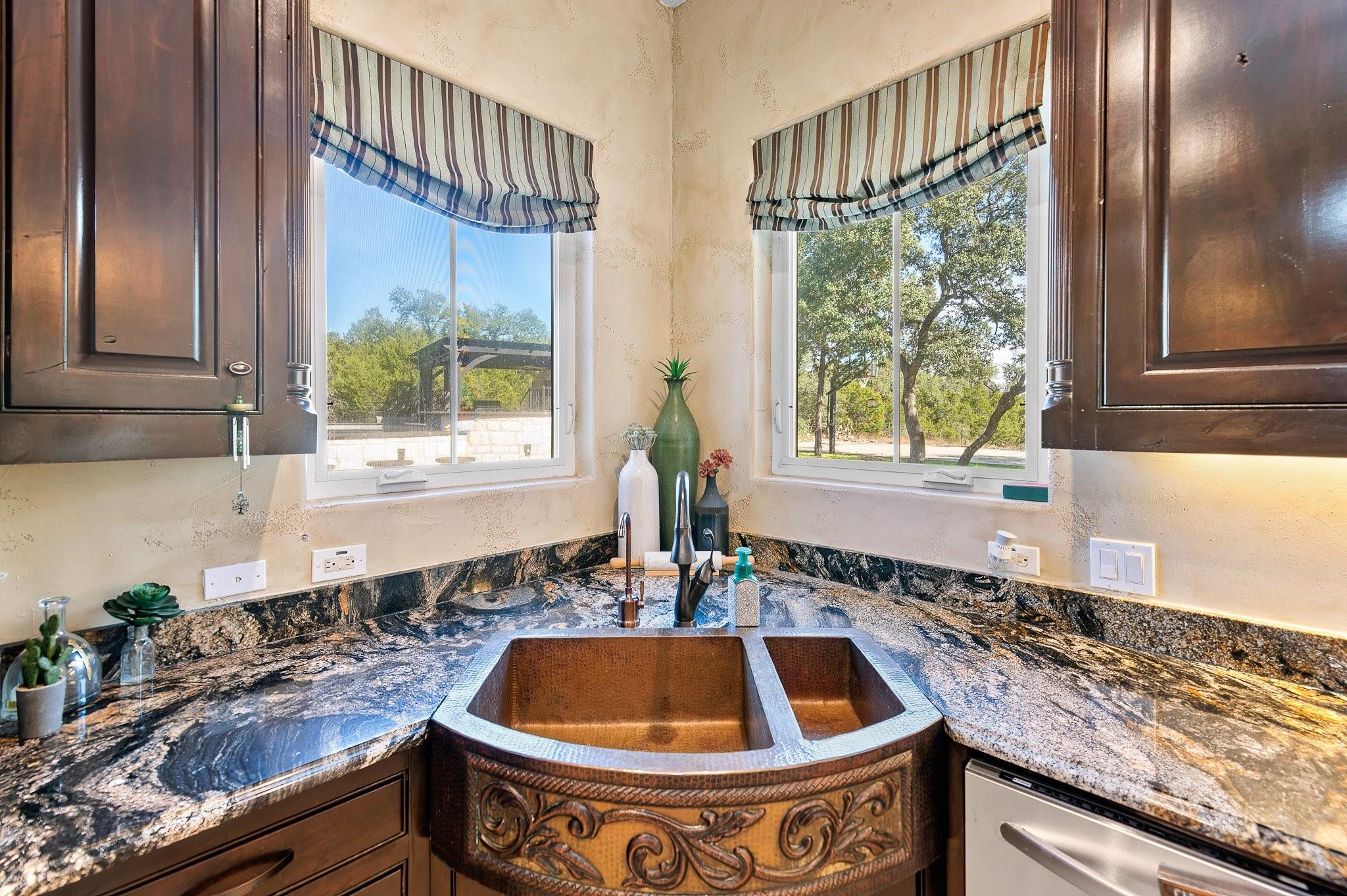 Stunning home on over 2.5 acres of gently rolling elevations with amazing hill-country views. Part of undeveloped land is zoned commercial for Retail. See Agent/Owner for details. From the courtyard to the massive kitchen and sunken family room, you'll want to stay. The master is beautifully nestled on it own wing of the house and is accompanied by a fabulous master bath complete with domed ceilings, walk in shower and closets as well as an oversized jetted/heated tub...you will LOVE IT! If you entertain, this is the place. Theatre room upstairs can double as a game room and the kids will love the pool and BB court. Families will love either of the 2 outdoor firepits and the covered patio has its own propane stone fireplace perfect for after you've finished cooking and want a fire. The other wing of the house has 4 bedrooms and 2 full baths, one being a Jack-n-Jill style. The laundry room is also on this side of the home and has lots of natural light and space for a full size refrigerator as well as has a full size sink. You'll have plenty of attic space for storage that is accessible in the main house 2 car garage. YES your Texas truck will fit in this garage! The courtyard is a wonderful place to entertain and has a fantastic water fountain that also has a propane fire feature that allows the fire to dance on the water. The breeze ways and most of the inside of the house has a home speaker system that is controlled in the living room (see agent for details)...it makes it easy to have music for parties! Make sure to check out the guest house with a mini bar/kitchen area and its own full bathroom and one car garage. Last make your way down to the octagon treehouse. It is truly unique. Additional acreage available. See agent/owner for details.