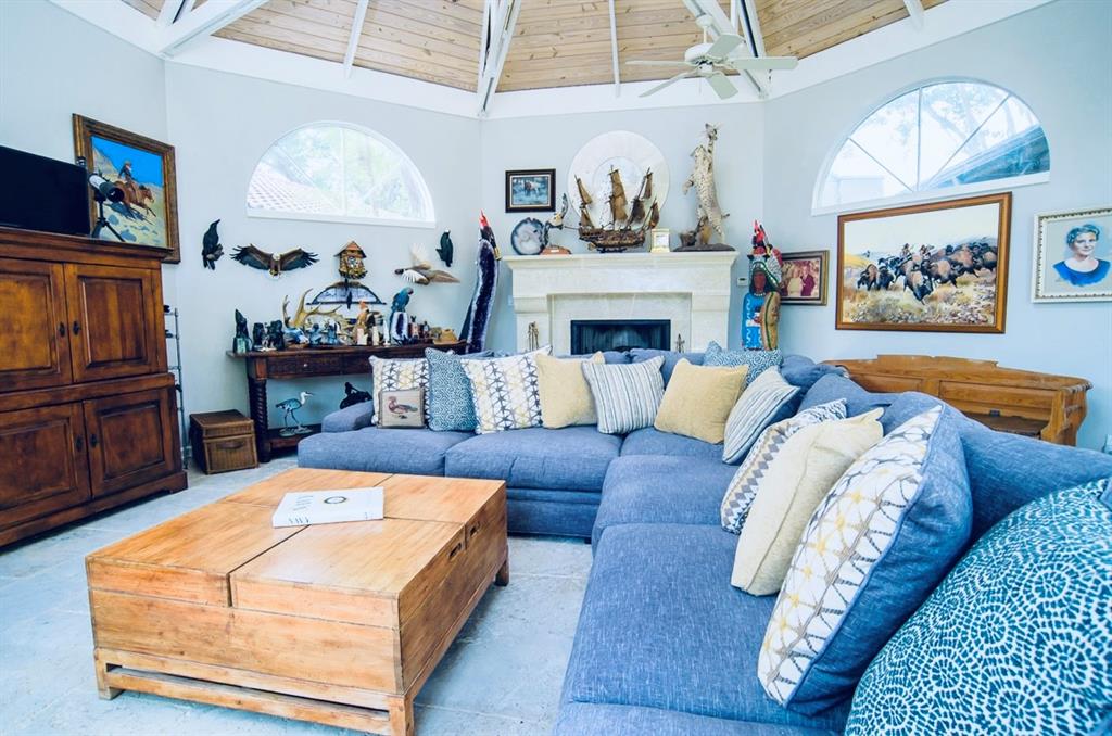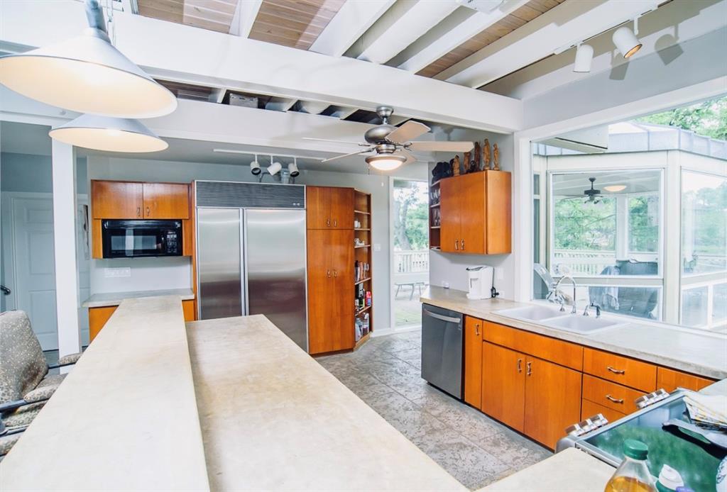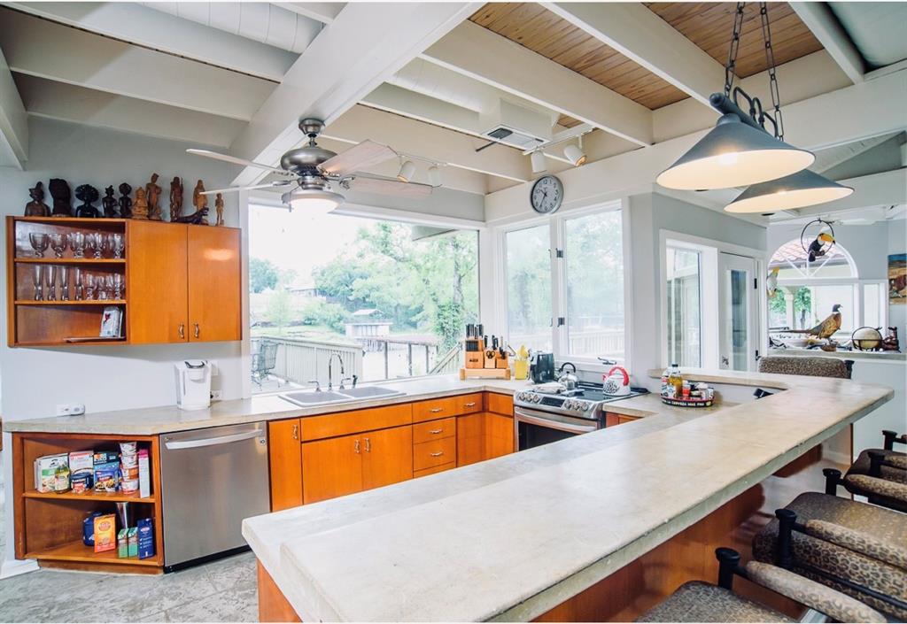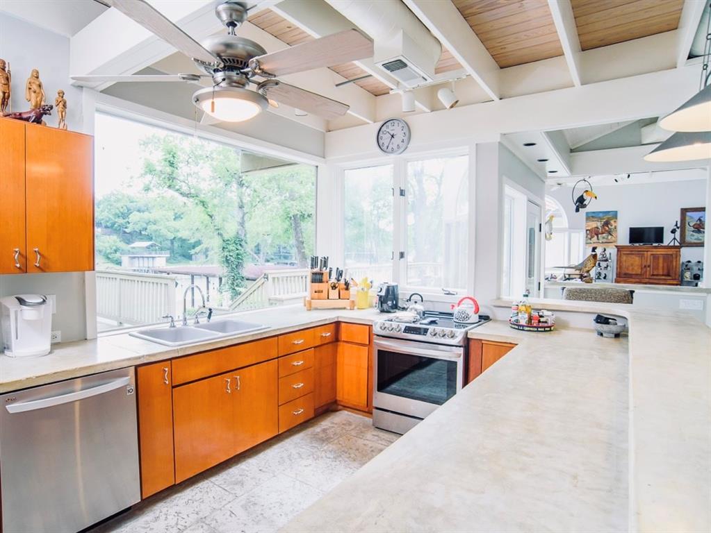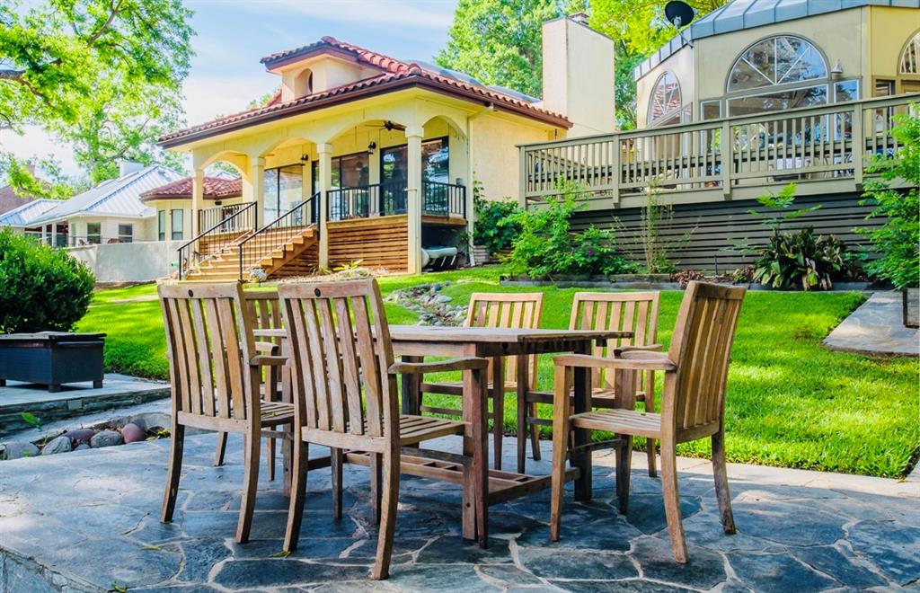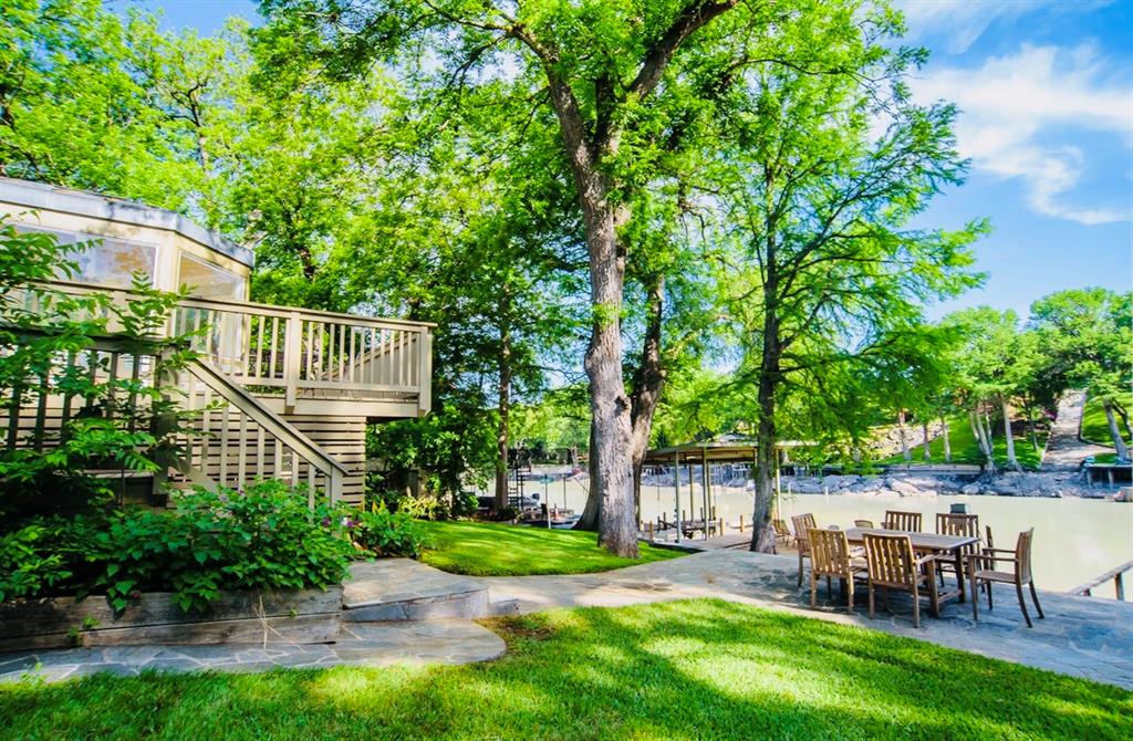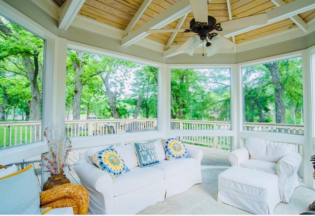 This is a rare find! Extraordinary custom waterfront home on Lake McQueeney. The Guadalupe River flows behind with outstanding views from a myriad of outdoor spaces. Architectural digest worthy from the stunning design to the appointments throughout, it's one of a kind. Admire the wood ceiling treatments, swoon at the exposed trusses and enjoy the circular rooms time and time again! Tree lined drive highlights the two detached garages making guests welcome. The half acre lot affords this beauty the ability to shine from every angle.