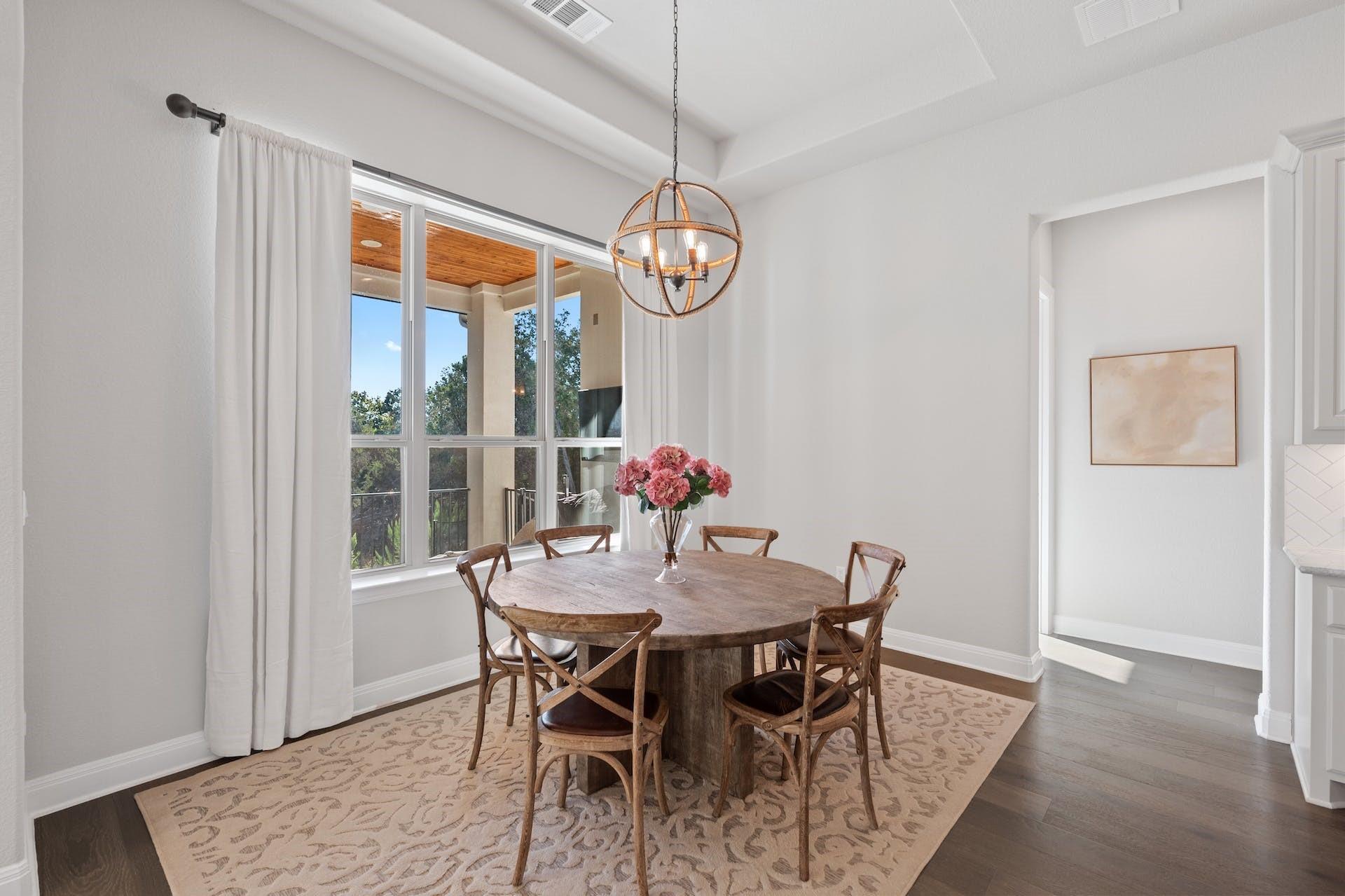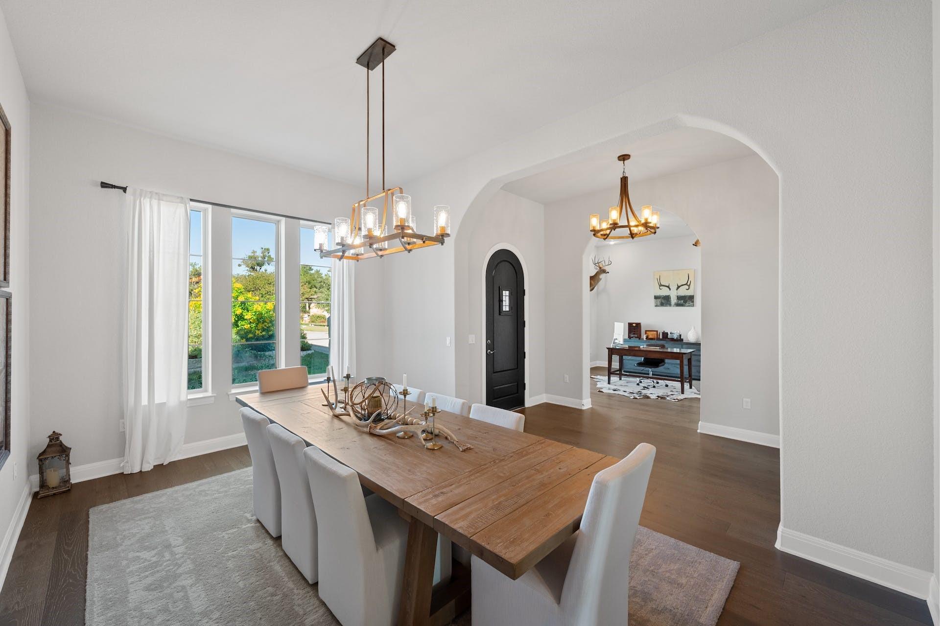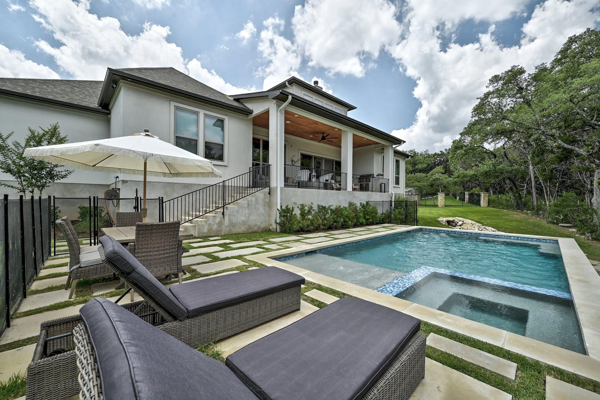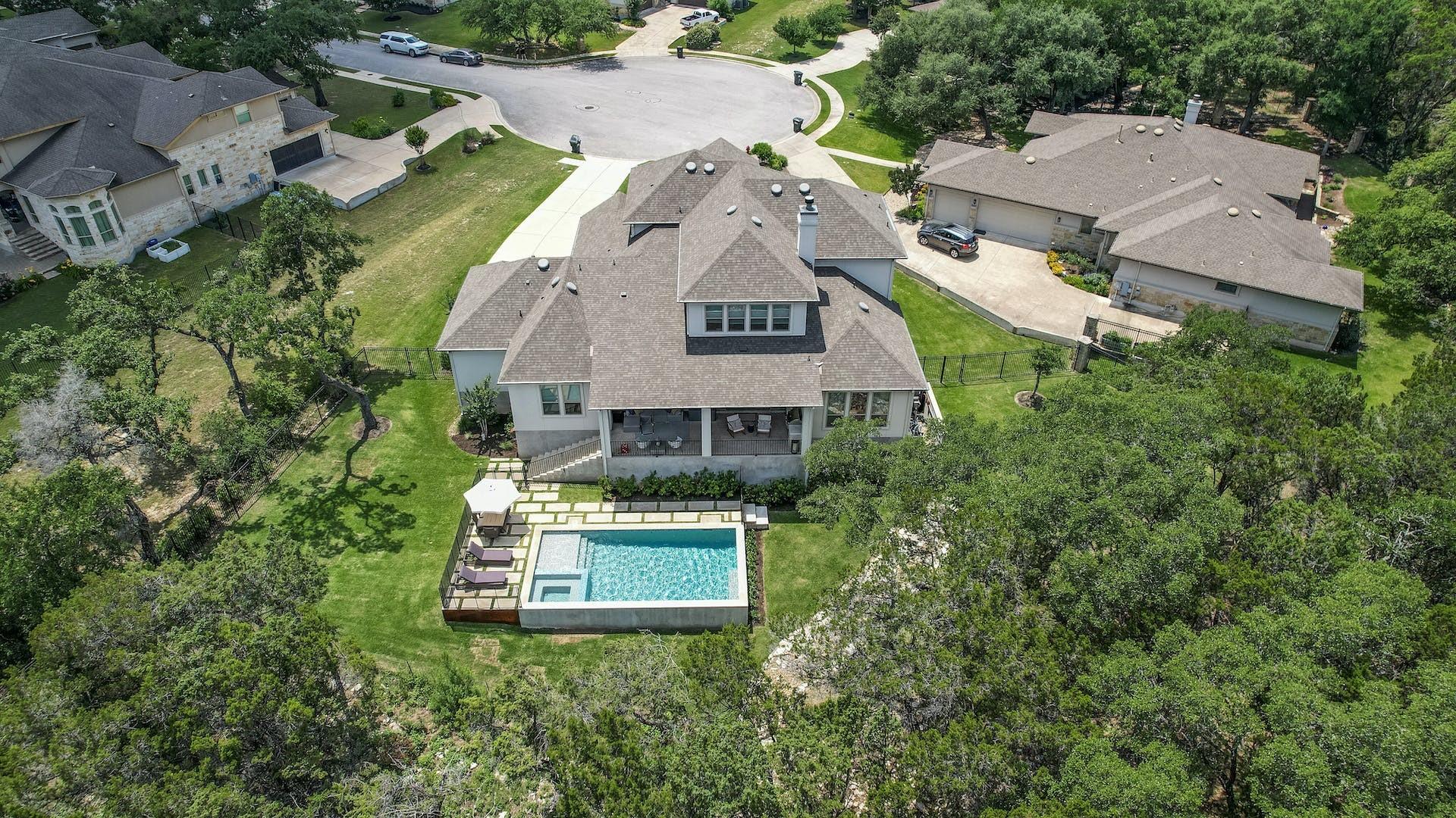 The immersion of Austin’s natural beauty and tranquility await the new owners of this luxuriously modern Mediterranean style estate. The welcoming arched entrance sets the mood when stepping into the home and onto the custom wide oak flooring. Soft light streams in from the windows and crisp, white walls combine with natural woods for a warm, inviting atmosphere. Gorgeous architectural features include high ceilings with arches connecting the generous downstairs living spaces, wood beams, and iron fixture detailing. The floor plan has been exceptionally designed and includes a large owners suite, a second bedroom, a study, and a vast open space combining the living room and kitchen on the first floor. A stunning central fireplace and the enchanting outdoor views through the picture windows complete this delightful living space. Moving upstairs, the area has been expertly divided into three spacious bedrooms, two bathrooms, and a large playroom. One of the bedrooms includes a bonus sitting nook with a sweet Juliet balcony. Added modern amenities have been well-planned including a water filtration system throughout, reverse osmosis water system, an oversized utility room, a butler pantry with wine fridge and extra storage, and a three-car garage. The property has been pre-wired for security cameras as well as Sono speakers in the kitchen and master suite. A covered back patio leads to the extensive backyard and includes a lounge area, a built in grill with storage, and a refreshing pool surrounded by stone and lush greenery creating an oasis for the Texas summertime. Backing to the greenbelt which connects to the Emma Long Park greenbelt, the property sits on approximately 0.4 acres on a cul-de-sac in the heart of a small, quiet gated community.