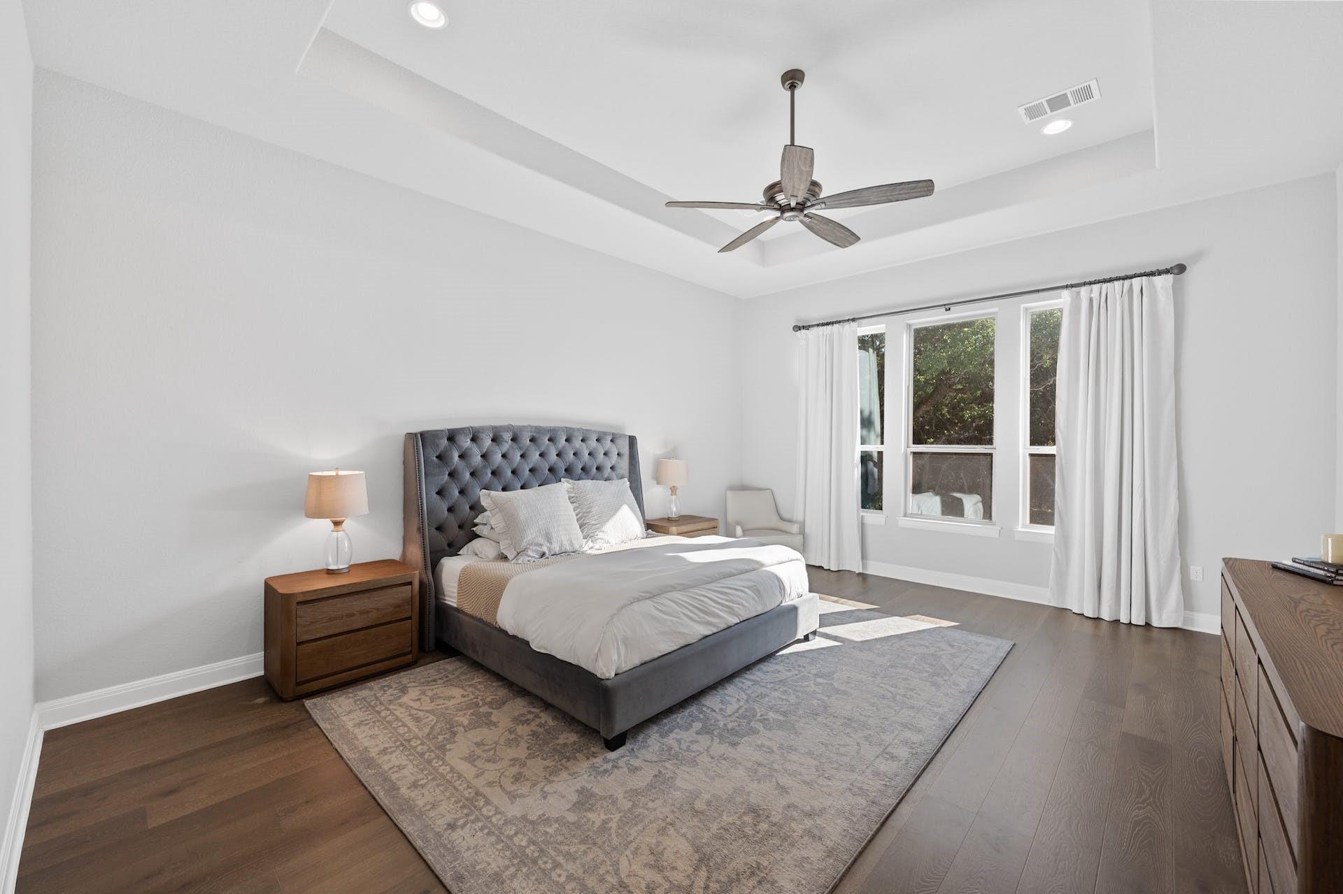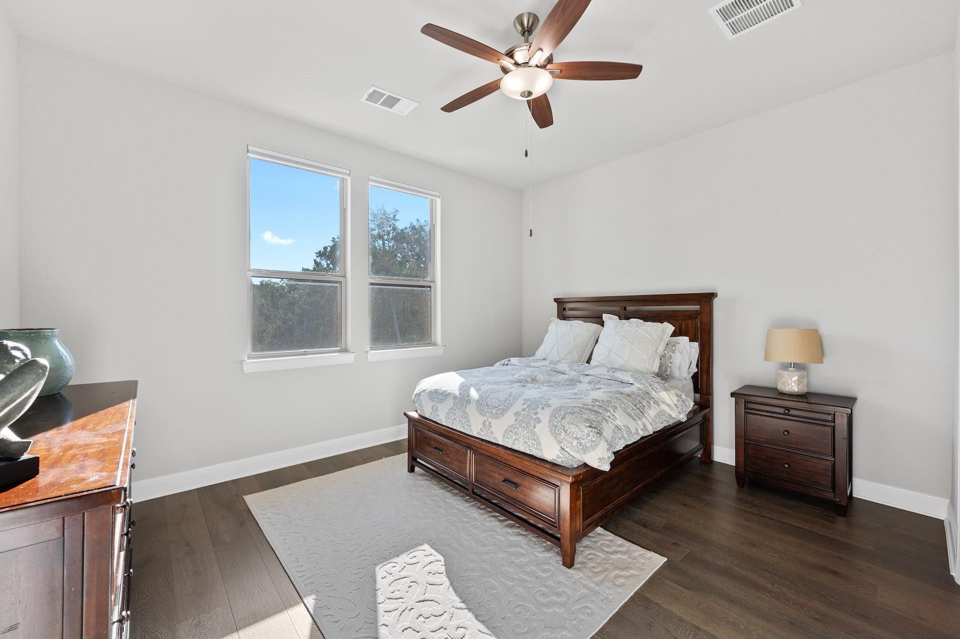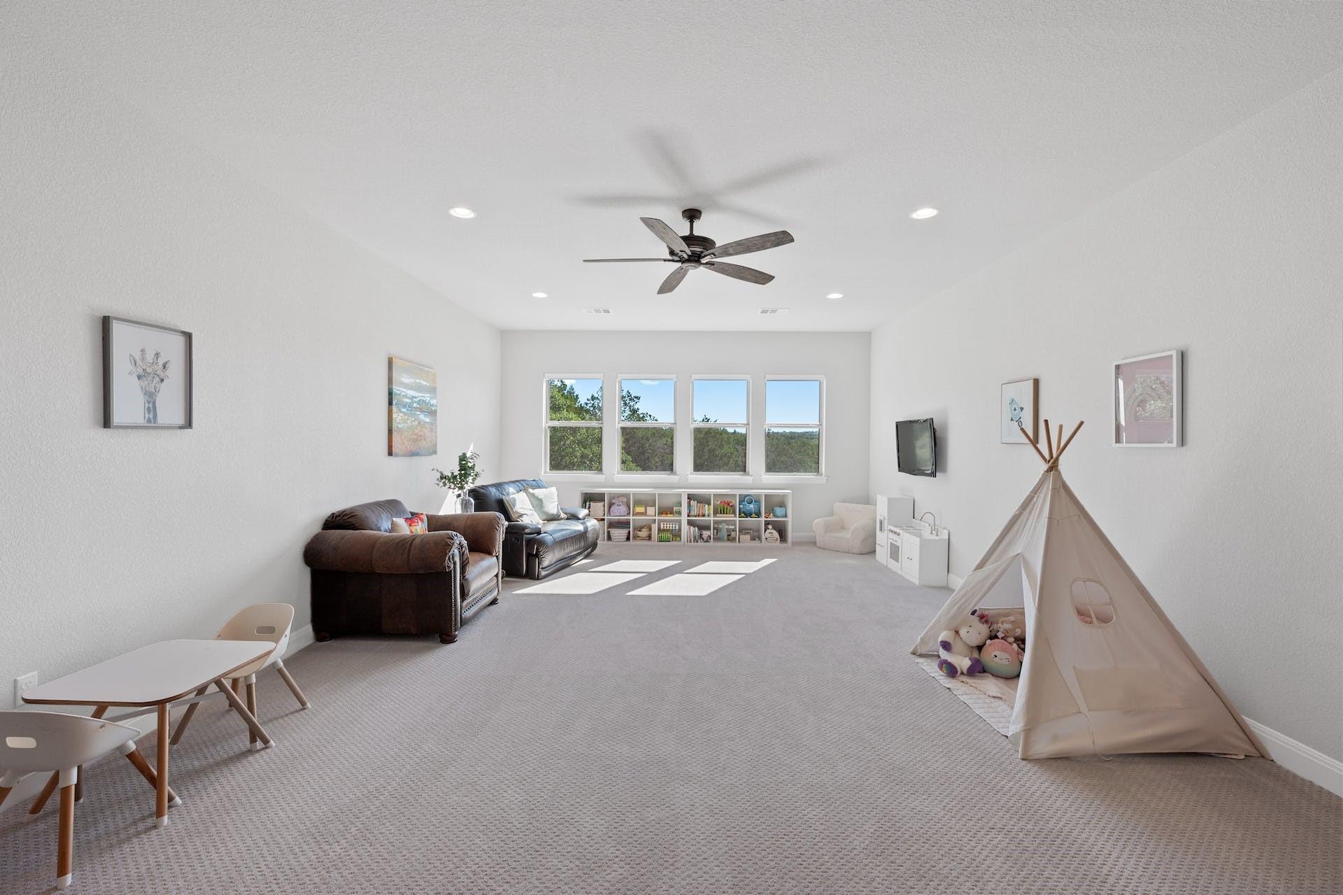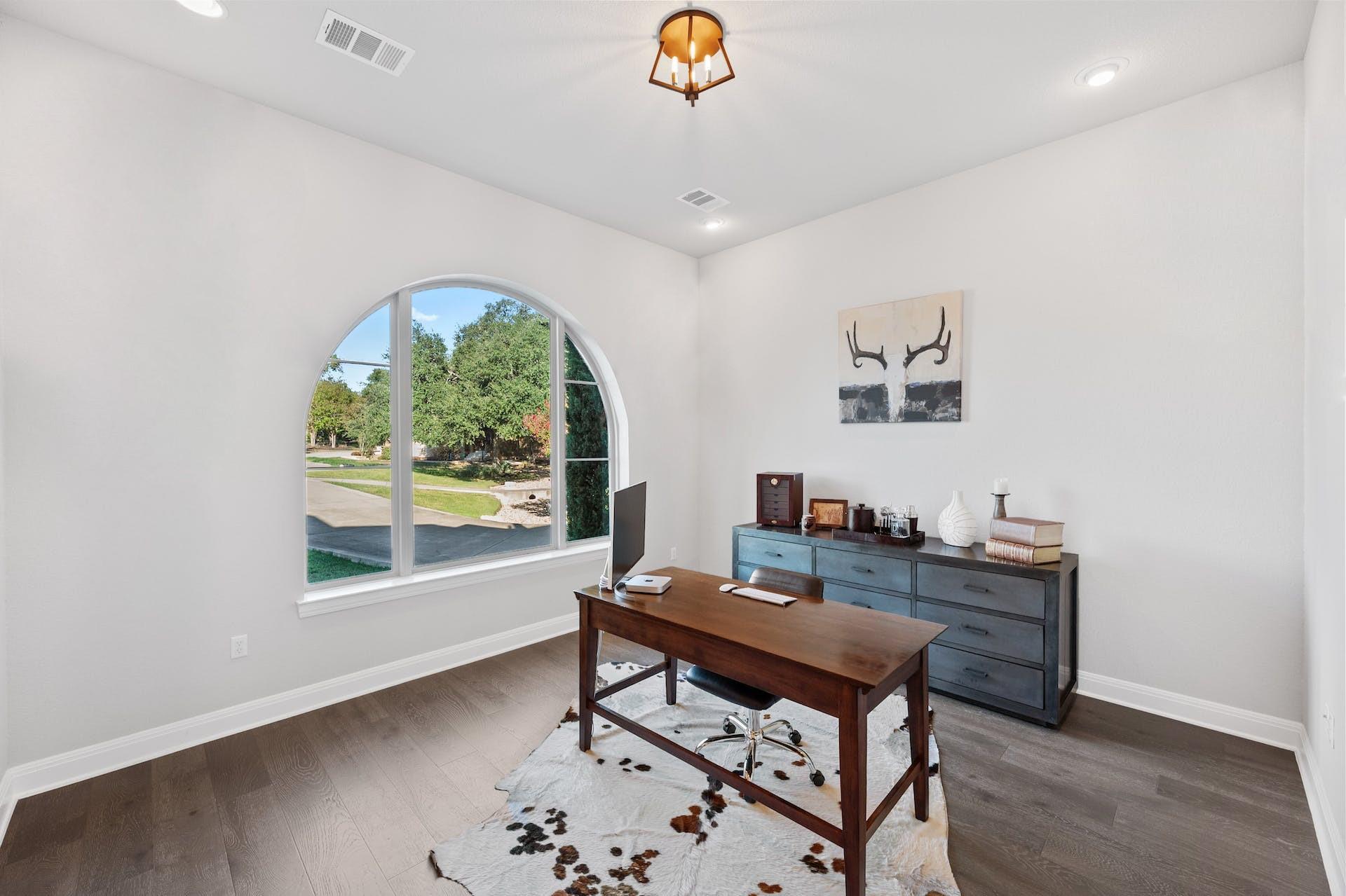 The immersion of Austin’s natural beauty and tranquility await the new owners of this luxuriously modern Mediterranean style estate. The welcoming arched entrance sets the mood when stepping into the home and onto the custom wide oak flooring. Soft light streams in from the windows and crisp, white walls combine with natural woods for a warm, inviting atmosphere. Gorgeous architectural features include high ceilings with arches connecting the generous downstairs living spaces, wood beams, and iron fixture detailing. The floor plan has been exceptionally designed and includes a large owners suite, a second bedroom, a study, and a vast open space combining the living room and kitchen on the first floor. A stunning central fireplace and the enchanting outdoor views through the picture windows complete this delightful living space. Moving upstairs, the area has been expertly divided into three spacious bedrooms, two bathrooms, and a large playroom. One of the bedrooms includes a bonus sitting nook with a sweet Juliet balcony. Added modern amenities have been well-planned including a water filtration system throughout, reverse osmosis water system, an oversized utility room, a butler pantry with wine fridge and extra storage, and a three-car garage. The property has been pre-wired for security cameras as well as Sono speakers in the kitchen and master suite. A covered back patio leads to the extensive backyard and includes a lounge area, a built in grill with storage, and a refreshing pool surrounded by stone and lush greenery creating an oasis for the Texas summertime. Backing to the greenbelt which connects to the Emma Long Park greenbelt, the property sits on approximately 0.4 acres on a cul-de-sac in the heart of a small, quiet gated community.