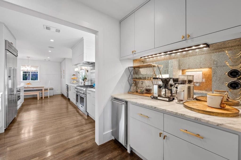 The white and bright kitchen seamlessly flows with marble counters and backsplash, Viking built-in refrigerator, Viking 6 burner & griddle gas range, Double ovens, Stainless Steel appliances, undermount sink, separate beverage bar with icemaker, built-in writing desk, gold hardware and custom lighting.