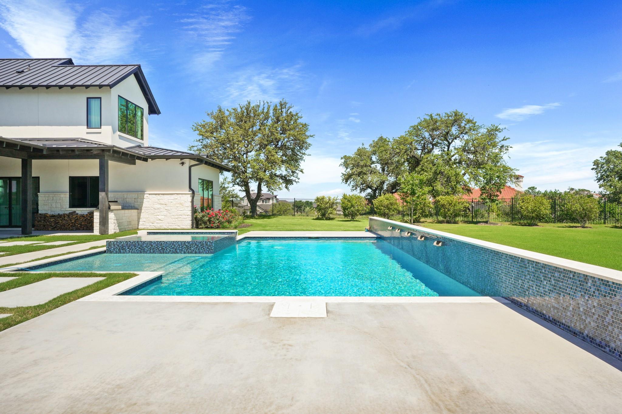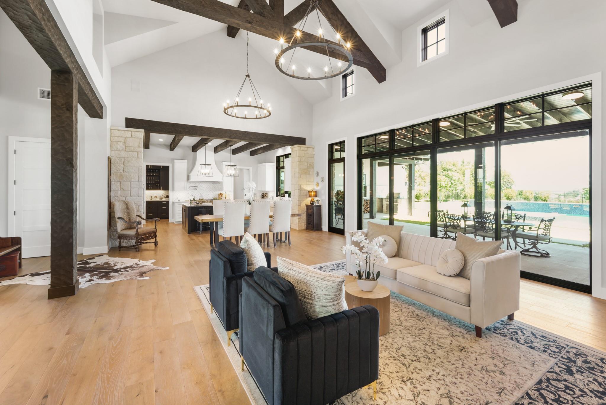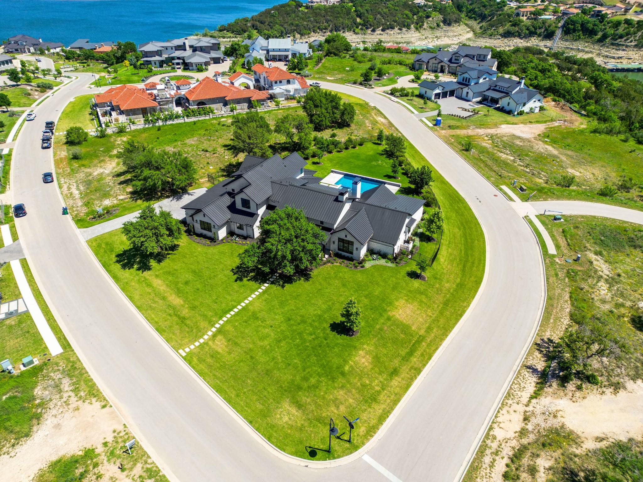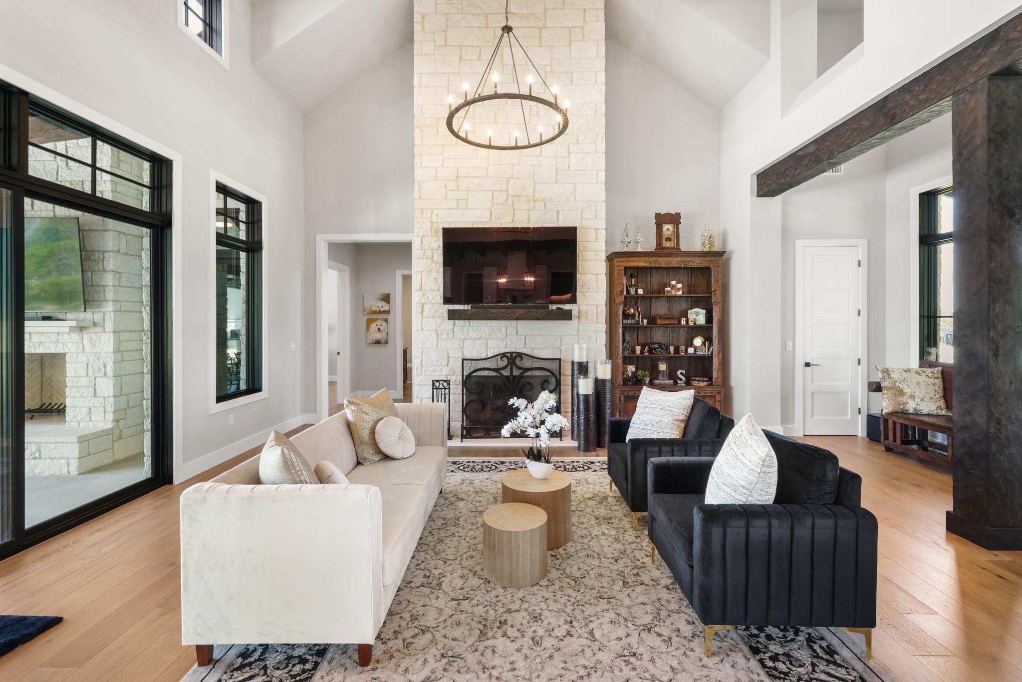 Welcome to your Oasis in the Peninsula of Desirable Rough Hollow at Lake Travis! This stunning custom-built home, completed in 2021, boasts unparalleled craftsmanship and an array of upscale features designed to elevate your lifestyle. Nestled on meticulously landscaped grounds with manicured trees and a wrought iron fence, this exquisite residence offers a blend of elegance and modern convenience. Step inside to discover an inviting ambiance highlighted by French Oak Wood/Custom Tile/Matisse Carpet Flooring throughout. Entertain with ease in the expansive living areas, including a massive living room adorned with vaulted wood truss ceilings and a floor-to-ceiling stone fireplace, perfect for cozy gatherings. Walls of windows flood the space with natural sunlight and provide breathtaking views of the surrounding landscape. The gourmet kitchen is a chef's dream, featuring high-end Thermador stainless steel appliances, double ovens, granite and quartz countertops, and high wood beam ceilings. A butler's pantry and a custom utility room with quartz counters add both style and functionality. Unwind in the spacious master suite on the main level, complete with a double quartz vanity/deep soaker tub/twin-head oversized shower. Additional highlights include a dedicated office, a second living room/media room with a custom suede leather granite wet bar and a climate-controlled wine room. Upstairs, you'll find large secondary bedrooms and a huge third living area! Step Outside to enjoy an upgraded pool by Millennium with an expansive outdoor living area with a fireplace ensuring ample space for relaxation and entertainment...perfect for al fresco dining and gatherings with loved ones. Convenient amenities abound, including Cat6 wiring in the home, surround sound, central vacuum, instant hot water heater and oversized 3-Car Garage. Enjoy Rough Hollow Resort amenities, popular schools, parks, shopping, dining, golf & major thoroughfares, for luxury living in a prime location!