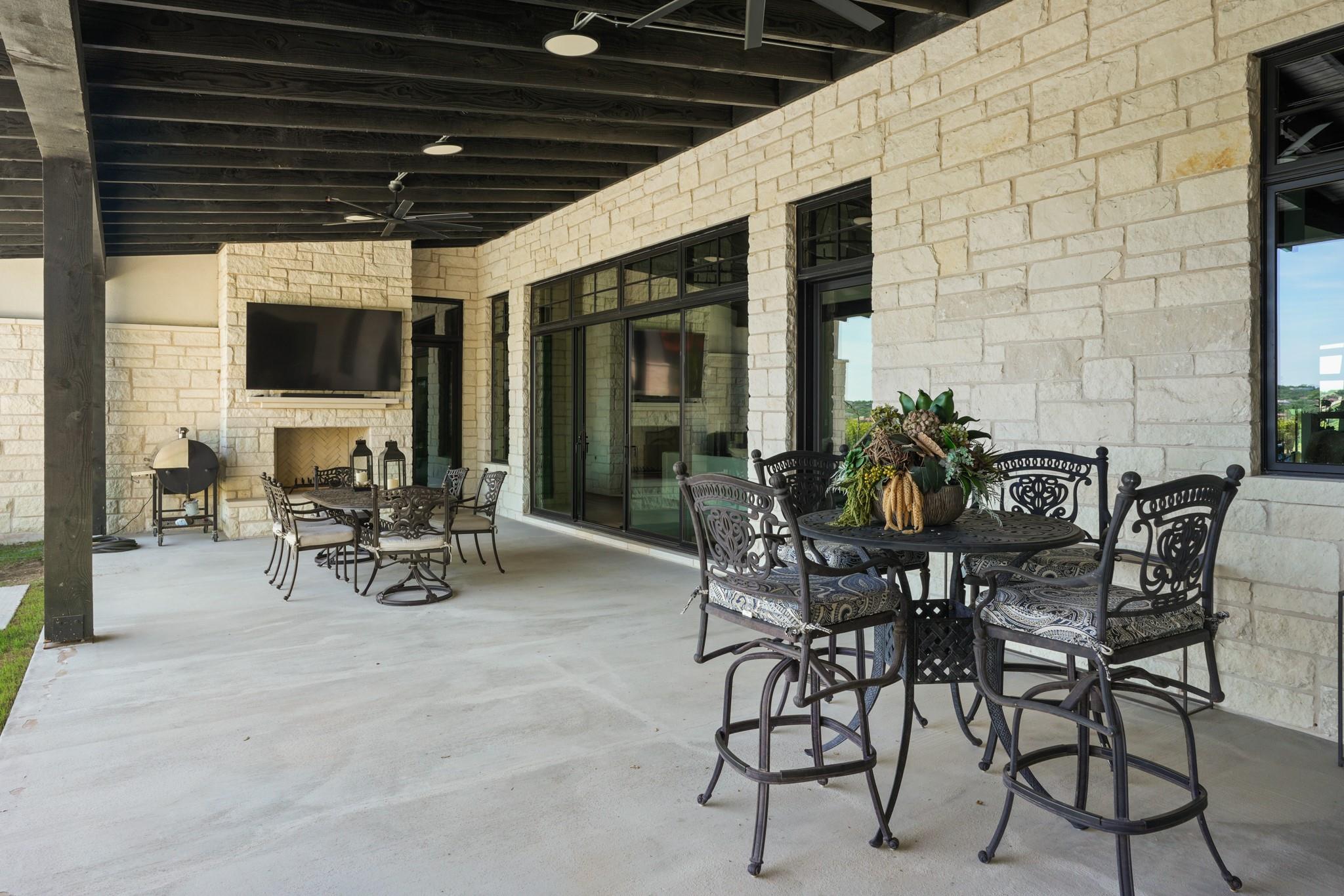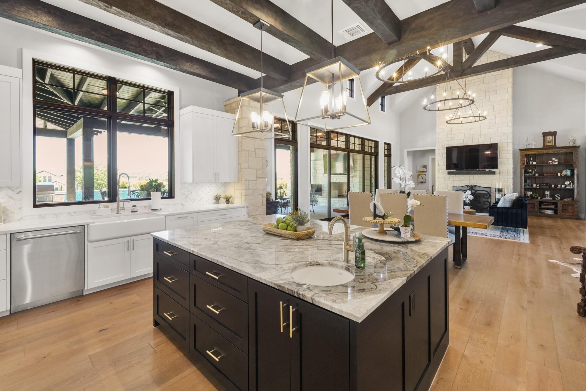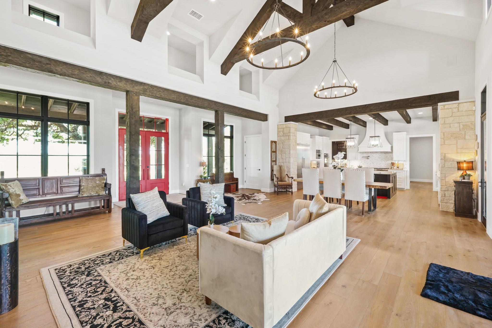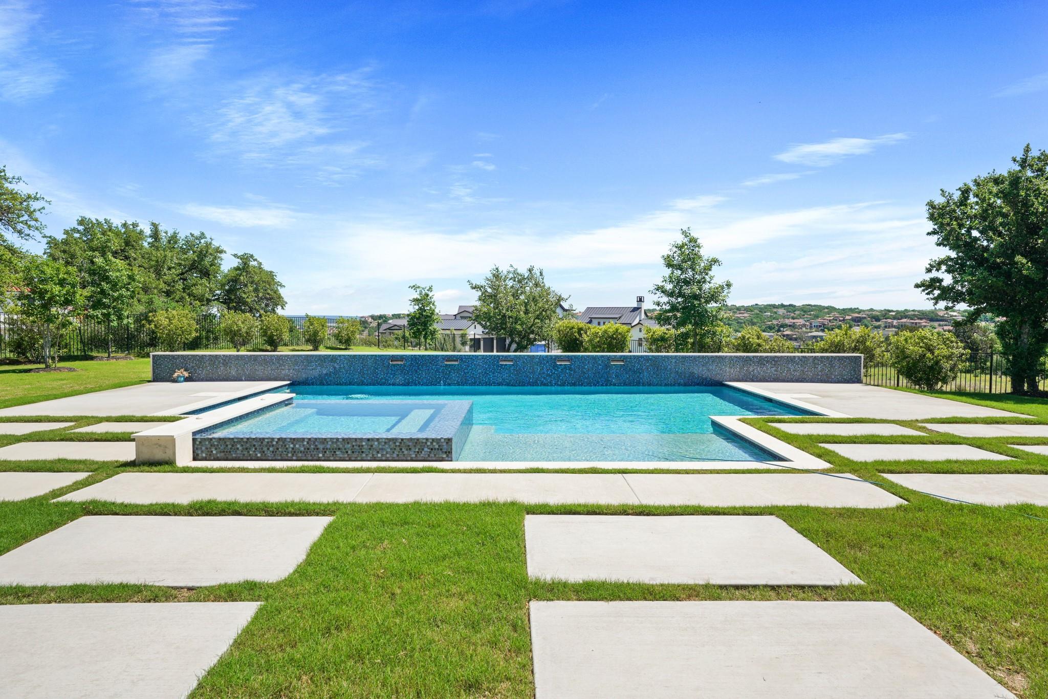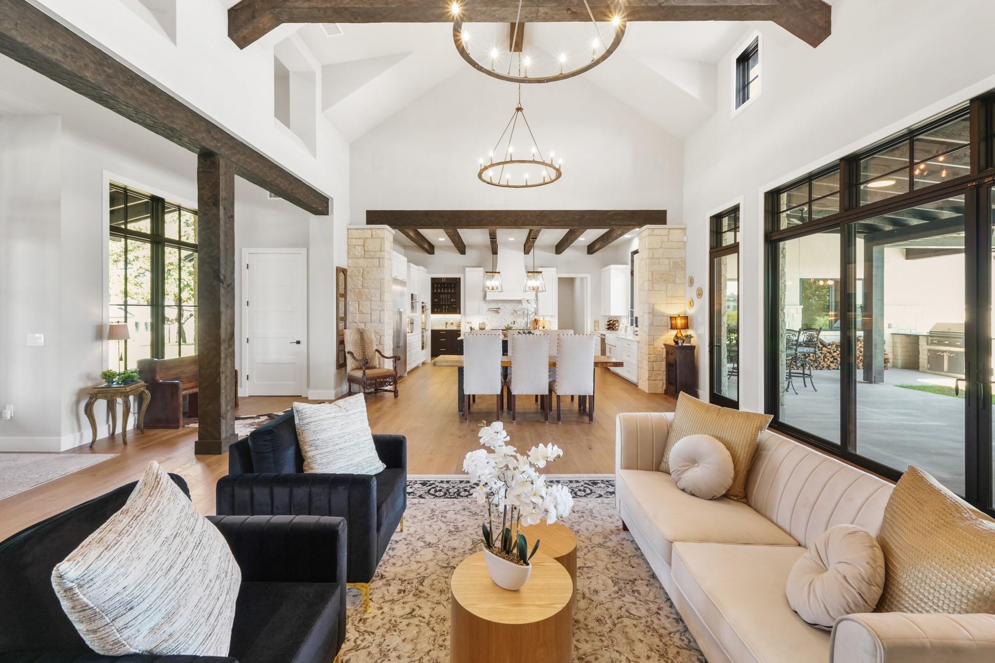 Welcome to your Oasis in the Peninsula of Desirable Rough Hollow at Lake Travis! This stunning custom-built home, completed in 2021, boasts unparalleled craftsmanship and an array of upscale features designed to elevate your lifestyle. Nestled on meticulously landscaped grounds with manicured trees and a wrought iron fence, this exquisite residence offers a blend of elegance and modern convenience. Step inside to discover an inviting ambiance highlighted by French Oak Wood/Custom Tile/Matisse Carpet Flooring throughout. Entertain with ease in the expansive living areas, including a massive living room adorned with vaulted wood truss ceilings and a floor-to-ceiling stone fireplace, perfect for cozy gatherings. Walls of windows flood the space with natural sunlight and provide breathtaking views of the surrounding landscape. The gourmet kitchen is a chef's dream, featuring high-end Thermador stainless steel appliances, double ovens, granite and quartz countertops, and high wood beam ceilings. A butler's pantry and a custom utility room with quartz counters add both style and functionality. Unwind in the spacious master suite on the main level, complete with a double quartz vanity/deep soaker tub/twin-head oversized shower. Additional highlights include a dedicated office, a second living room/media room with a custom suede leather granite wet bar and a climate-controlled wine room. Upstairs, you'll find large secondary bedrooms and a huge third living area! Step Outside to enjoy an upgraded pool by Millennium with an expansive outdoor living area with a fireplace ensuring ample space for relaxation and entertainment...perfect for al fresco dining and gatherings with loved ones. Convenient amenities abound, including Cat6 wiring in the home, surround sound, central vacuum, instant hot water heater and oversized 3-Car Garage. Enjoy Rough Hollow Resort amenities, popular schools, parks, shopping, dining, golf & major thoroughfares, for luxury living in a prime location!