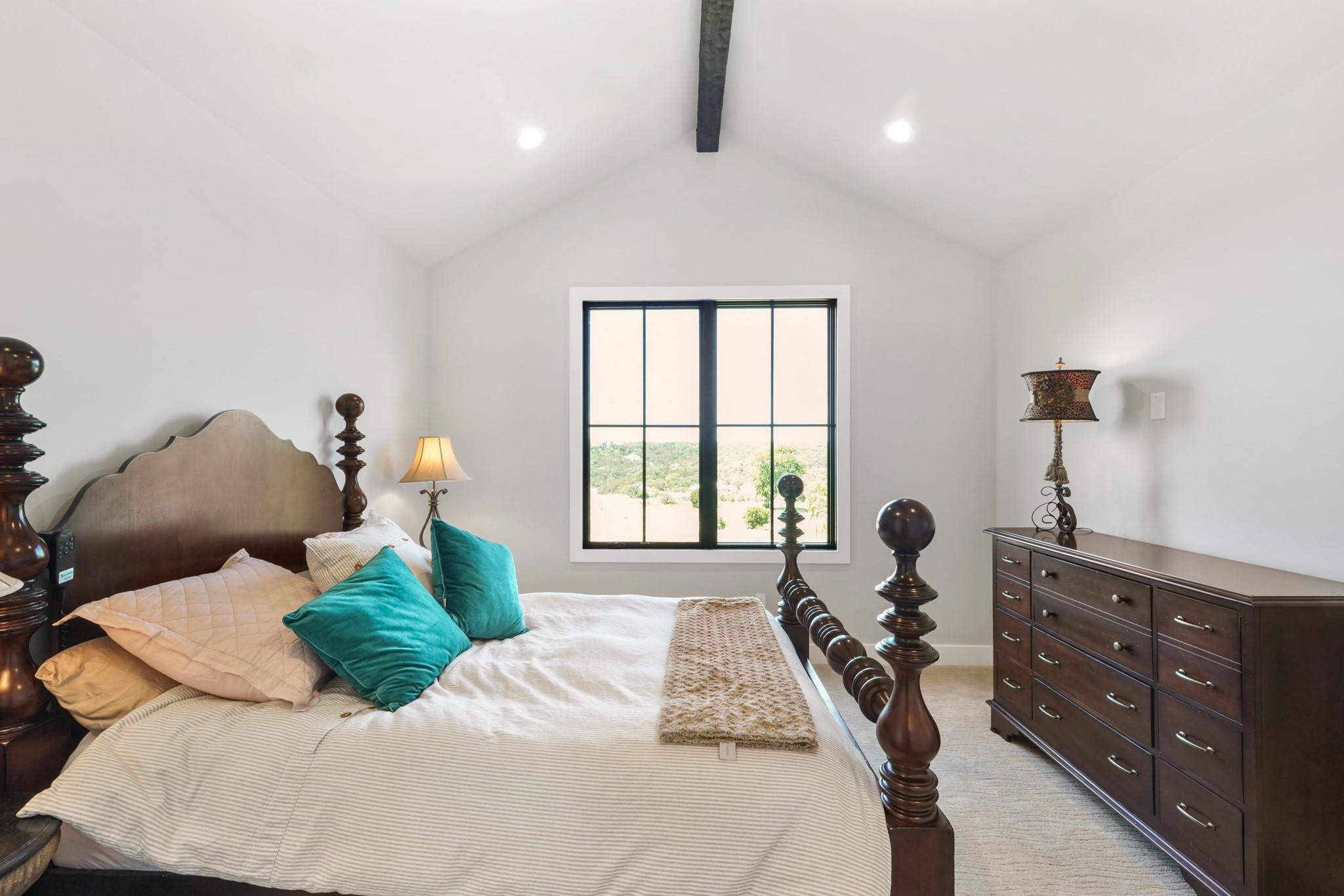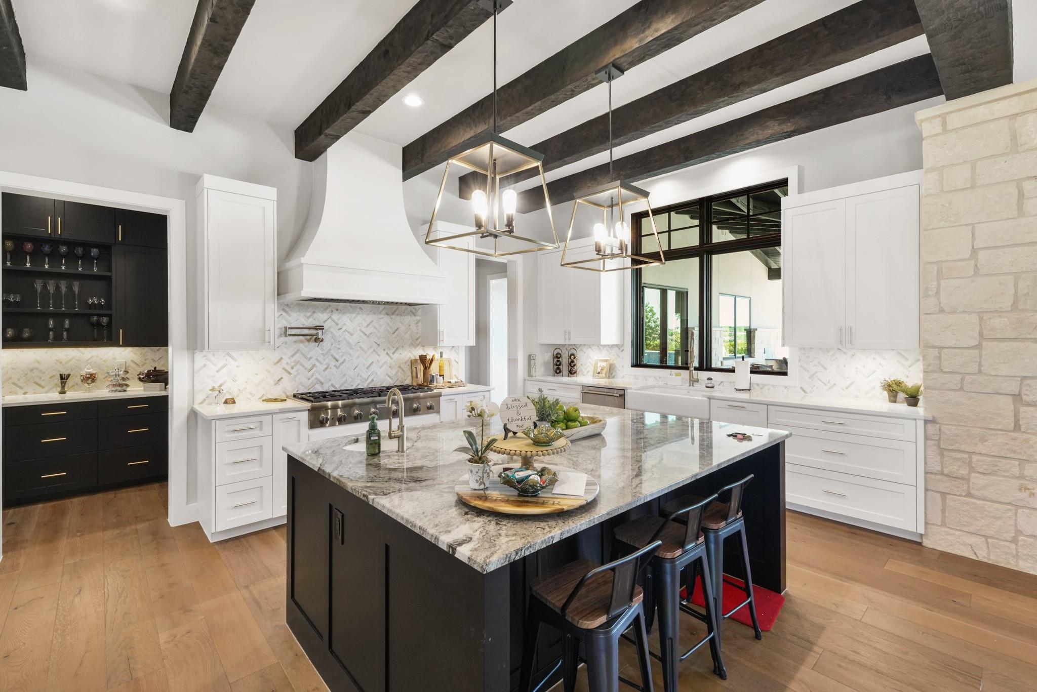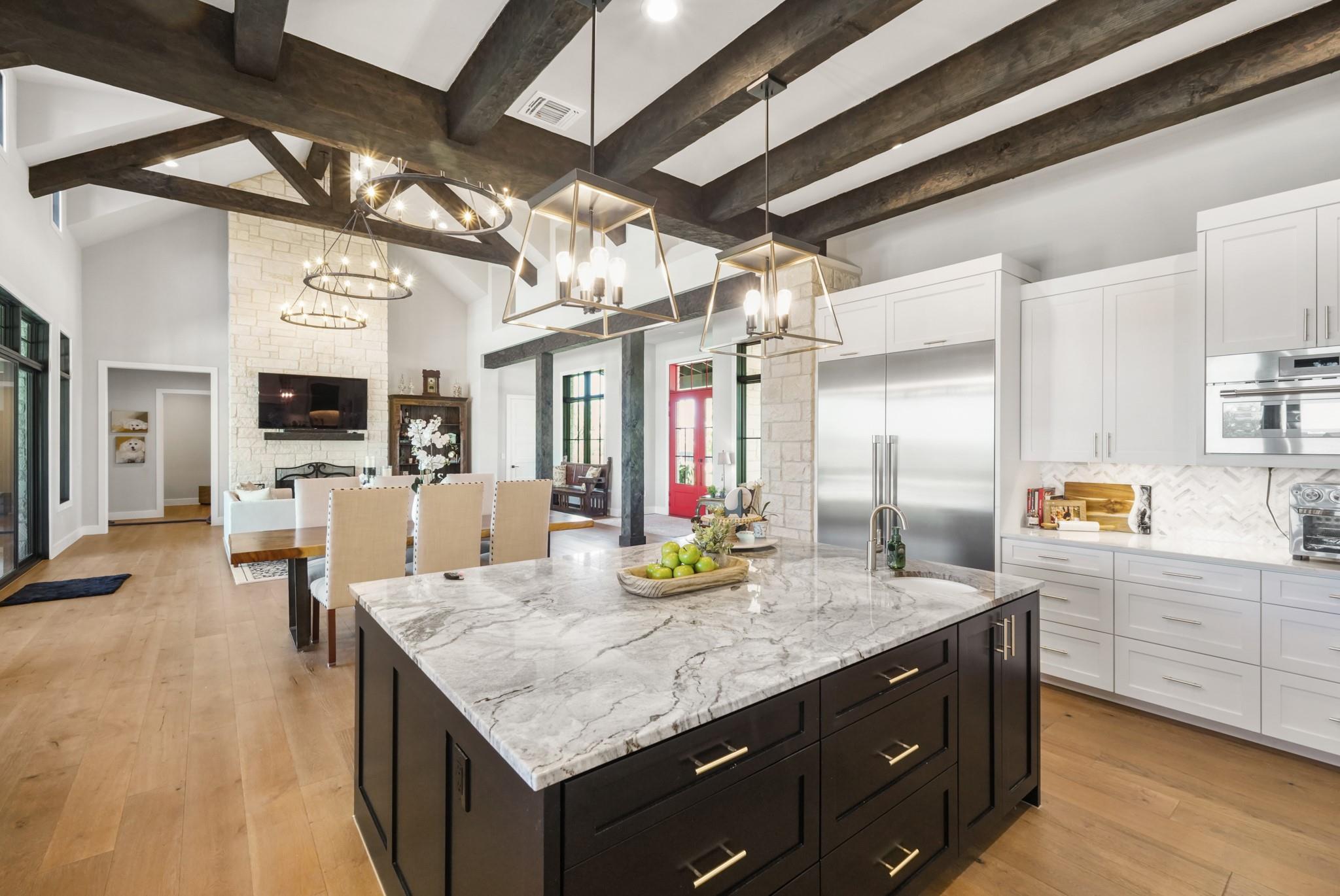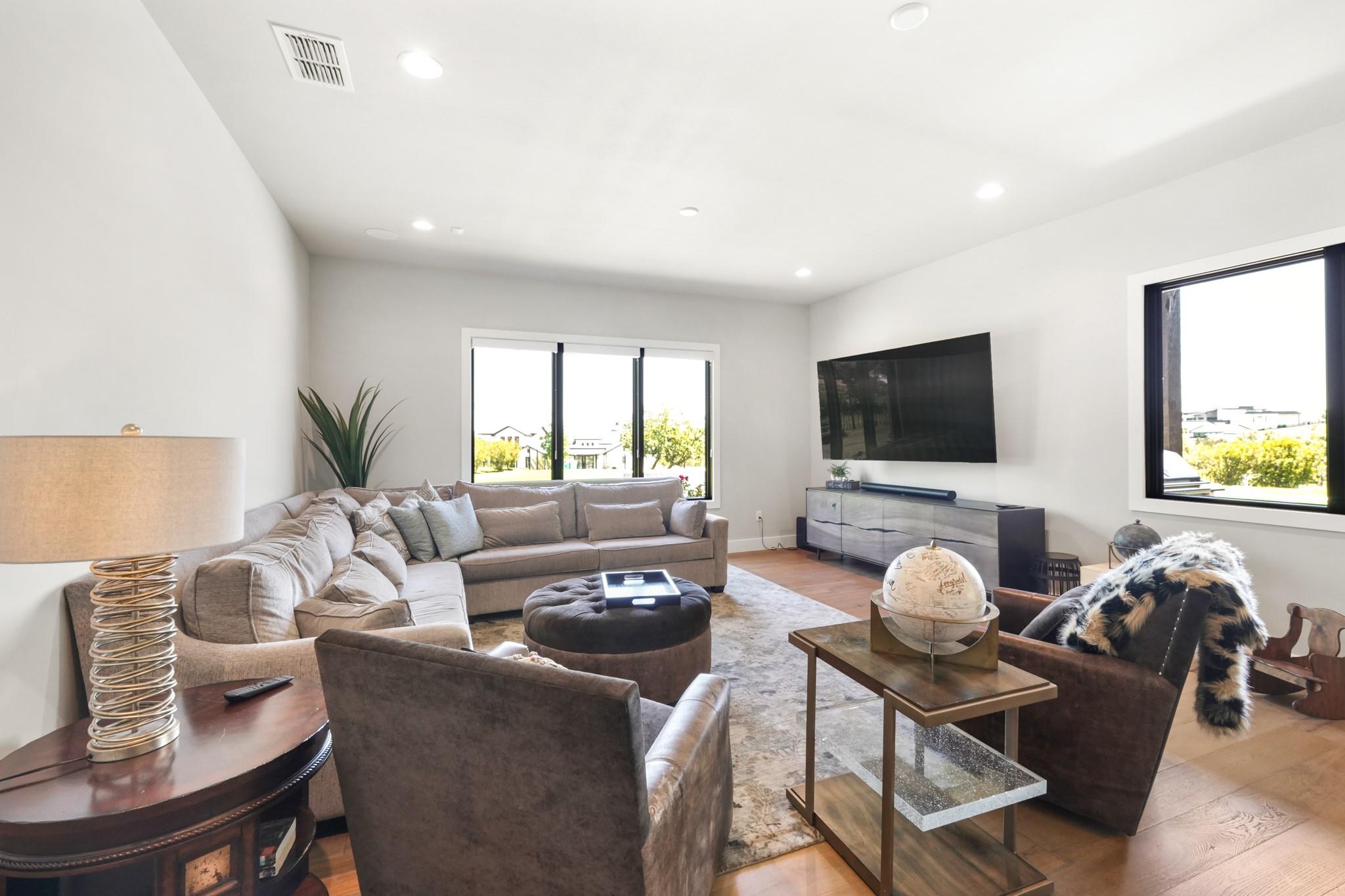 Welcome to your Oasis in the Peninsula of Desirable Rough Hollow at Lake Travis! This stunning custom-built home, completed in 2021, boasts unparalleled craftsmanship and an array of upscale features designed to elevate your lifestyle. Nestled on meticulously landscaped grounds with manicured trees and a wrought iron fence, this exquisite residence offers a blend of elegance and modern convenience. Step inside to discover an inviting ambiance highlighted by French Oak Wood/Custom Tile/Matisse Carpet Flooring throughout. Entertain with ease in the expansive living areas, including a massive living room adorned with vaulted wood truss ceilings and a floor-to-ceiling stone fireplace, perfect for cozy gatherings. Walls of windows flood the space with natural sunlight and provide breathtaking views of the surrounding landscape. The gourmet kitchen is a chef's dream, featuring high-end Thermador stainless steel appliances, double ovens, granite and quartz countertops, and high wood beam ceilings. A butler's pantry and a custom utility room with quartz counters add both style and functionality. Unwind in the spacious master suite on the main level, complete with a double quartz vanity/deep soaker tub/twin-head oversized shower. Additional highlights include a dedicated office, a second living room/media room with a custom suede leather granite wet bar and a climate-controlled wine room. Upstairs, you'll find large secondary bedrooms and a huge third living area! Step Outside to enjoy an upgraded pool by Millennium with an expansive outdoor living area with a fireplace ensuring ample space for relaxation and entertainment...perfect for al fresco dining and gatherings with loved ones. Convenient amenities abound, including Cat6 wiring in the home, surround sound, central vacuum, instant hot water heater and oversized 3-Car Garage. Enjoy Rough Hollow Resort amenities, popular schools, parks, shopping, dining, golf & major thoroughfares, for luxury living in a prime location!