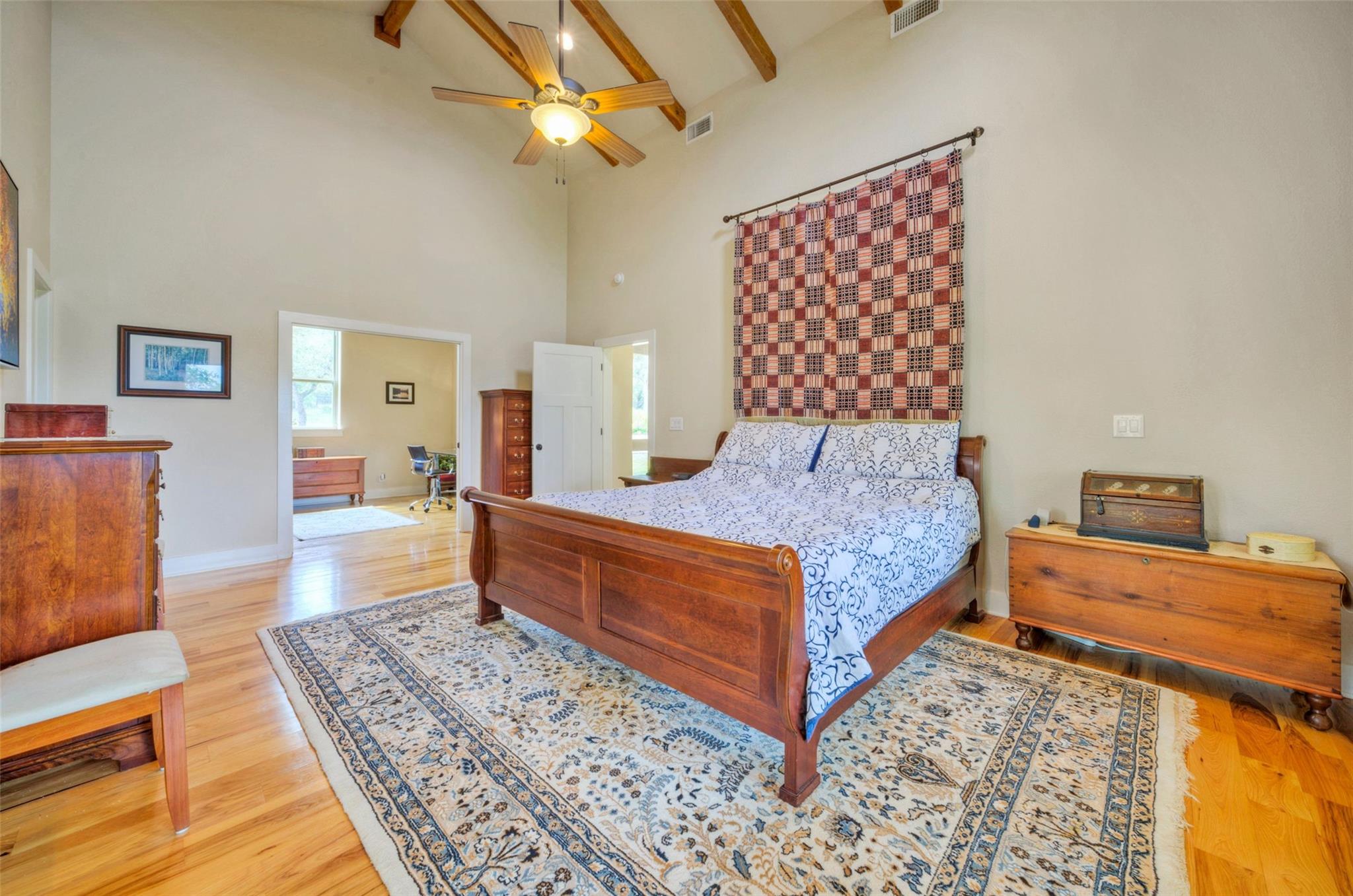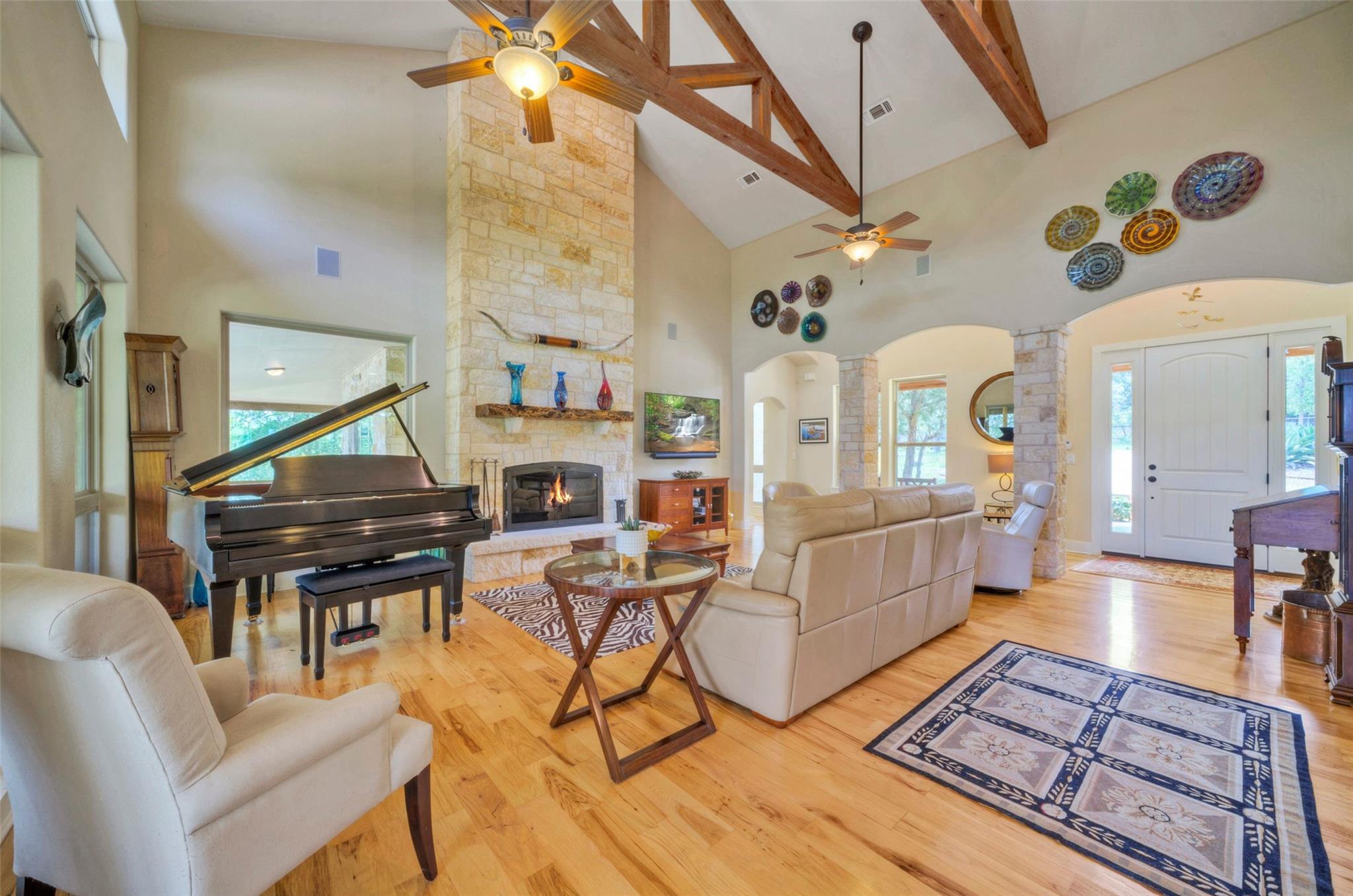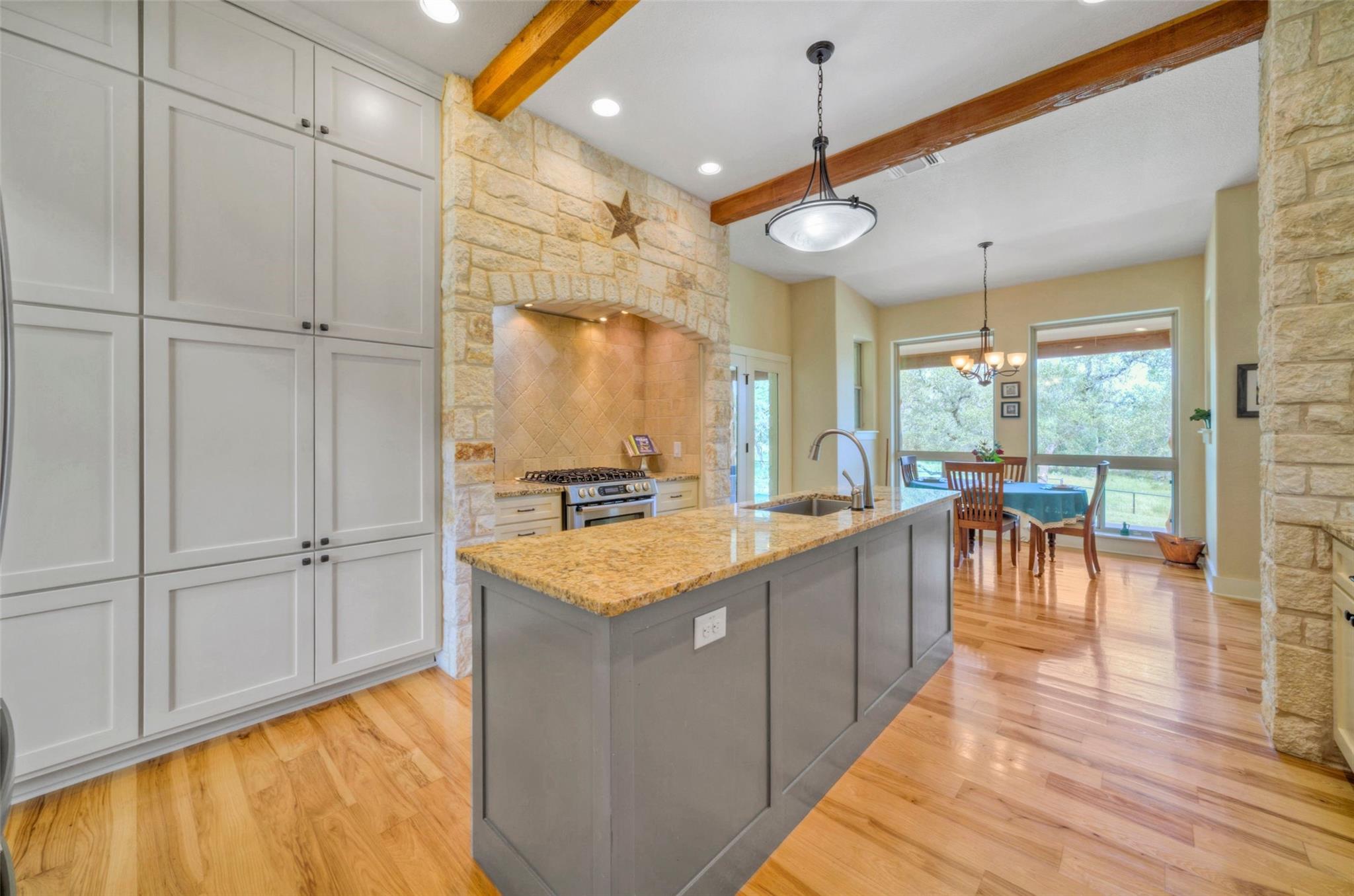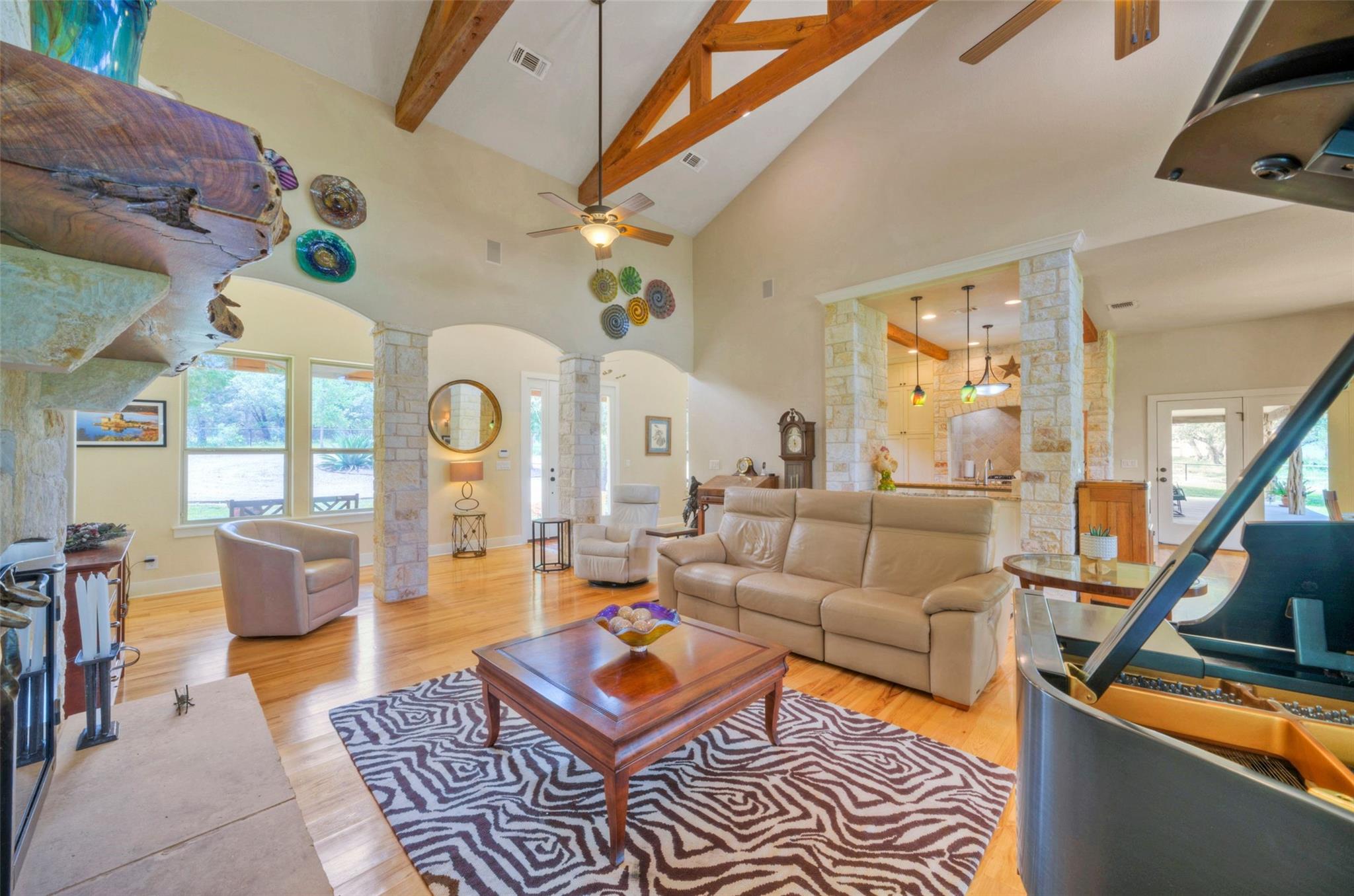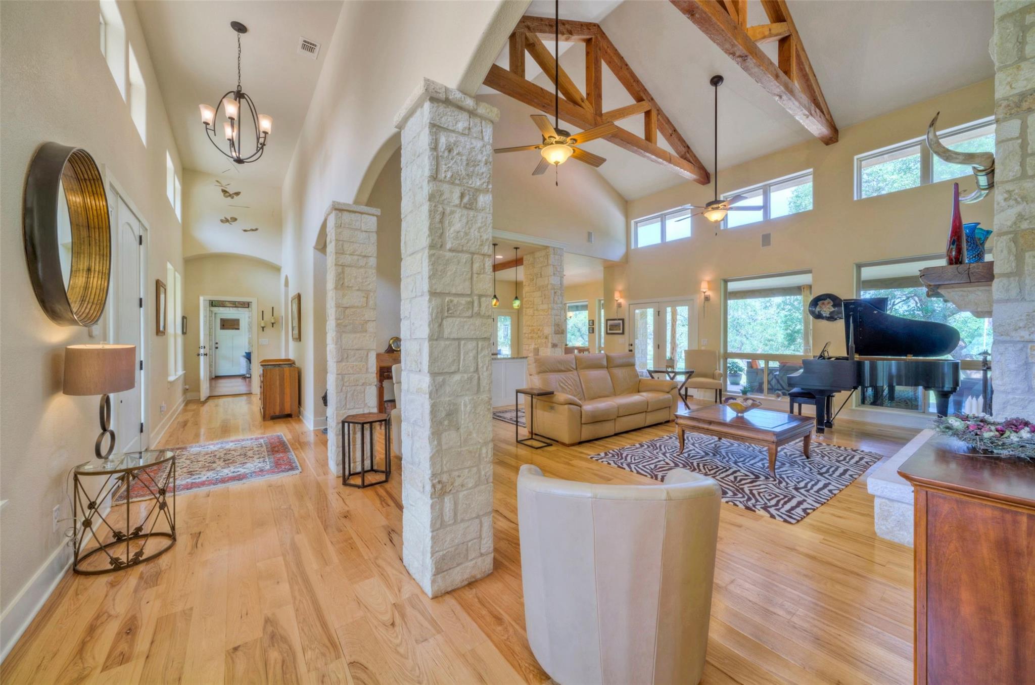 | Interior Features | Breakfast Bar, Built-in Features, Ceiling Fan(s), Beamed Ceilings, High Ceilings, Double Vanity, Gas Dryer Hookup, Entrance Foyer, Kitchen Island, Multiple Dining Areas, Multiple Living Areas, Open Floorplan, Pantry, Primary Bedroom on Main, Recessed Lighting, Soaking Tub, Storage, Two Primary Closets, Walk-In Closet(s), Washer Hookup, Wired for Sound, See Remarks | |
