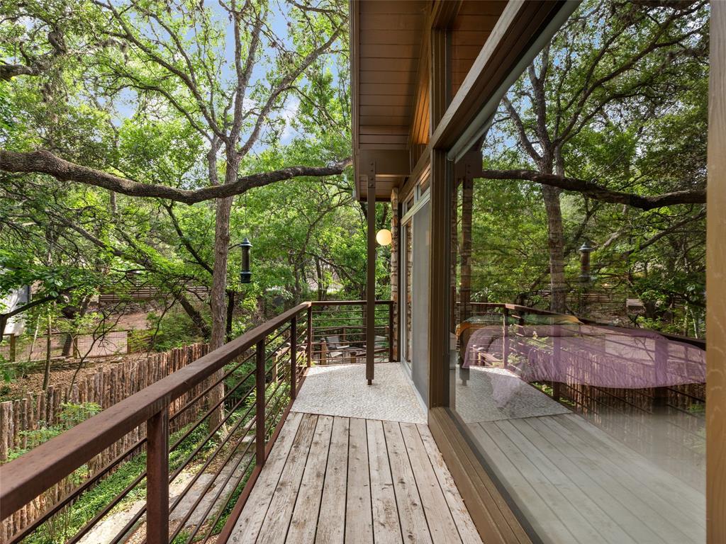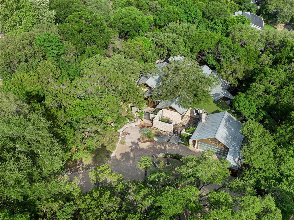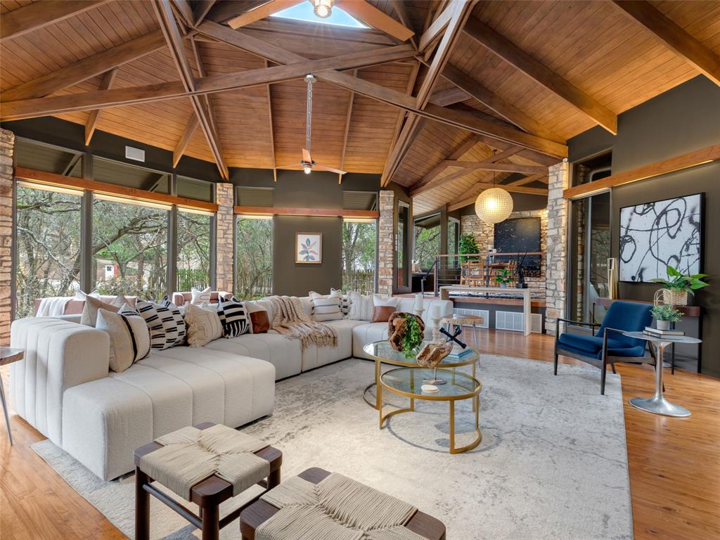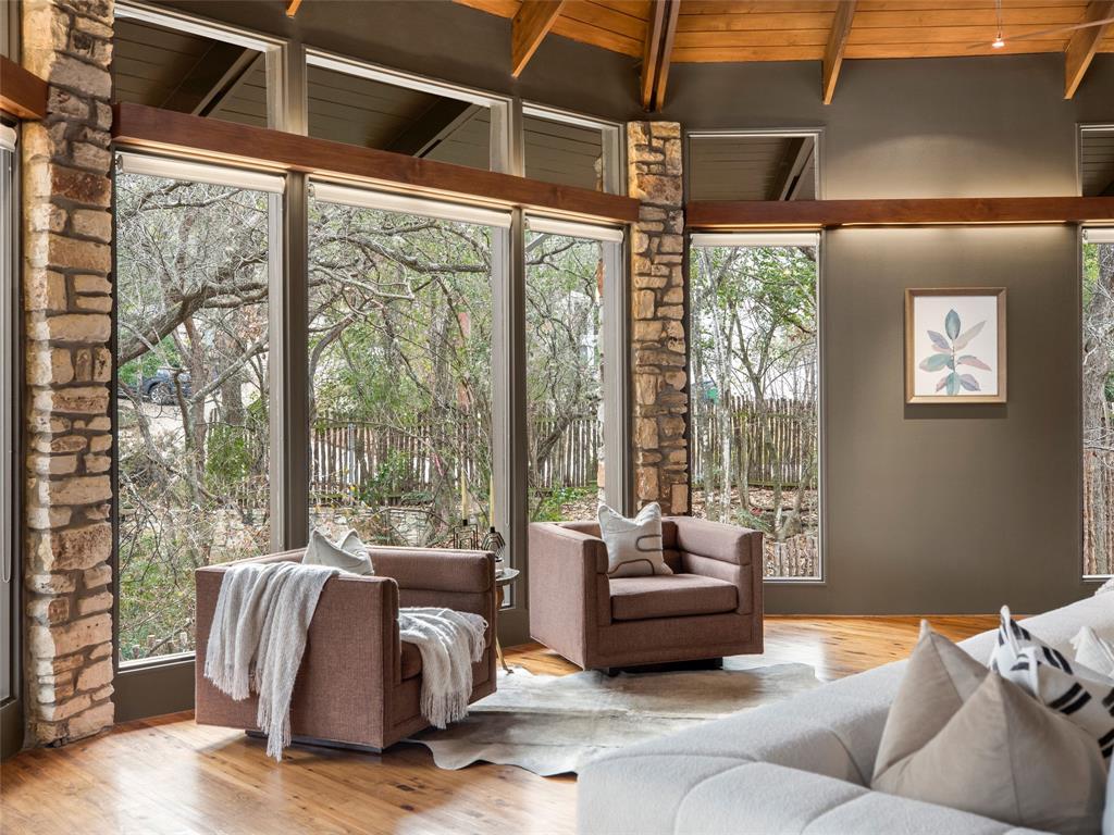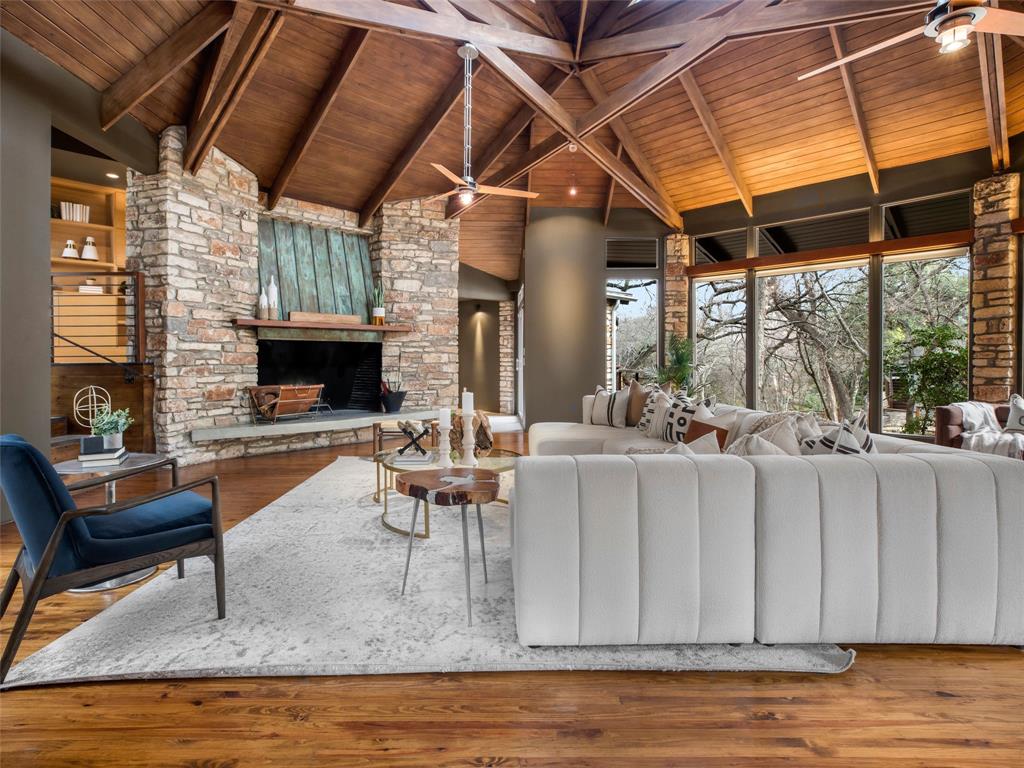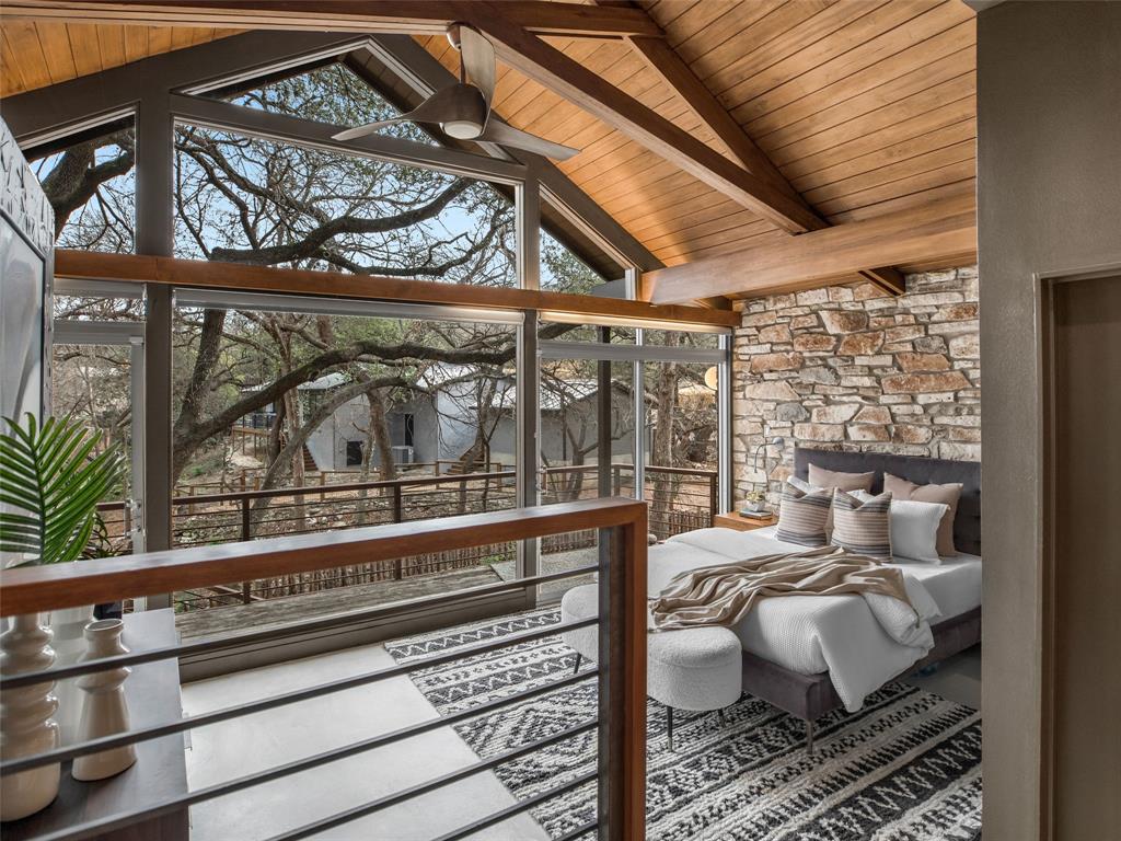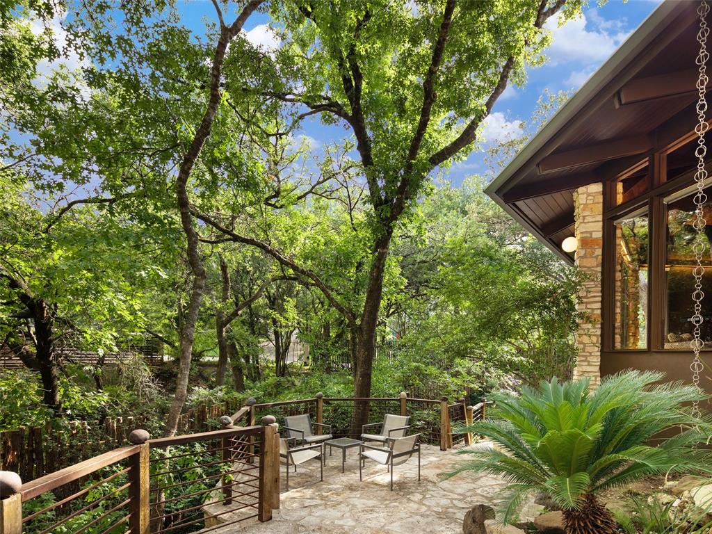 Stratford Hills Tree House: Inspired by its surroundings, this architectural gem was designed to blend seamlessly into nature in one of Austin's most beloved neighborhoods, on a lush .65 acres. The gorgeous living area is the heart of the home, with an amazing stone fireplace at the focal point reaching the soaring wood-beamed ceilings with peek-a-boo skylights - all surrounded by walls of glass overlooking the surrounding beauty of nature. Wood, stone, and glass are a thoughtful theme throughout the property, maximizing the views, and providing rich texture and detailing. Among the various outdoor spaces, an interior courtyard makes for a lovely place to meditate, and adds a nice focal point from the interior of the home. The primary suite is privately situated and offers stunning floor-to-ceiling windows with an unforgettable primary bath and direct patio access - the perfect getaway. This home features four bedrooms, three full bathrooms, and two half bathrooms, including a guest suite on the lower level of the home with a private entrance, full bath and separate laundry. Located in a centrally located part of town with incredible access to Downtown Austin (less than 3 miles away), and within a few blocks to Zilker Park.