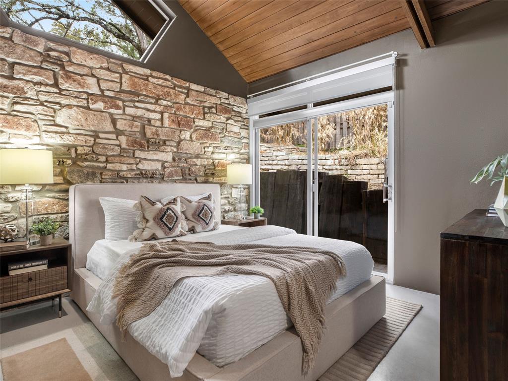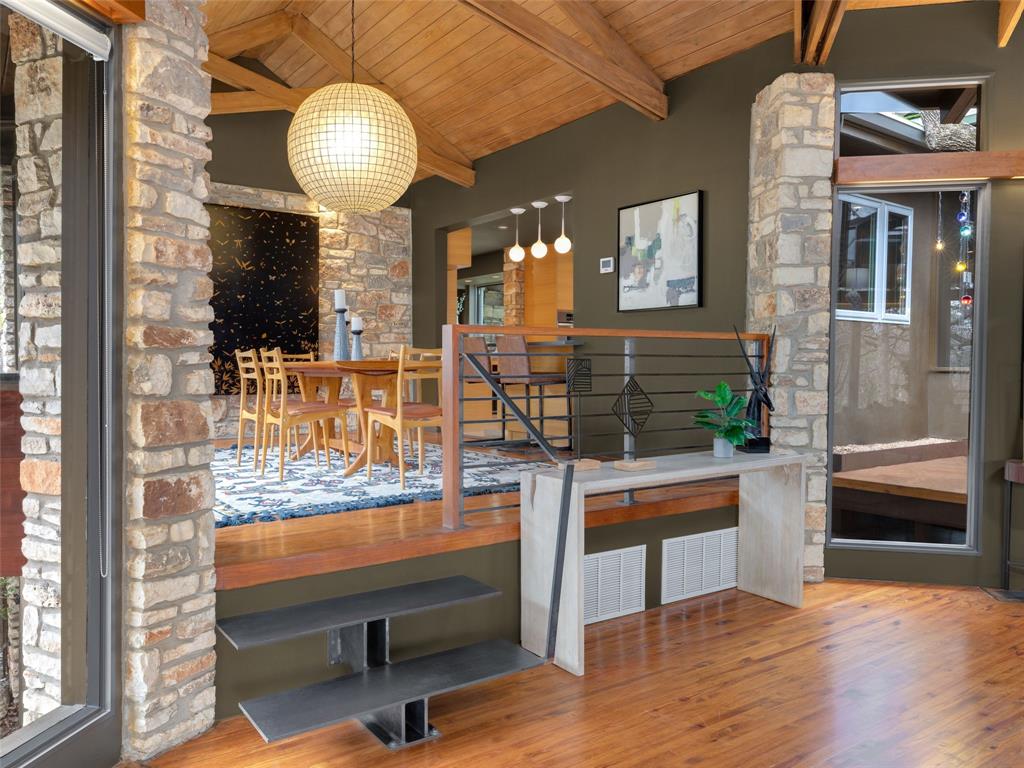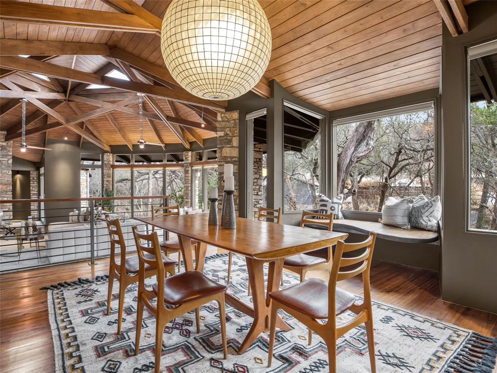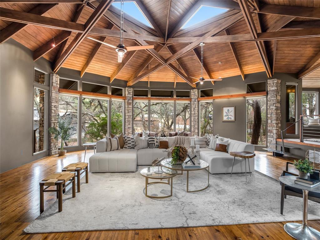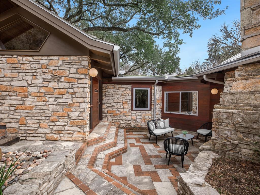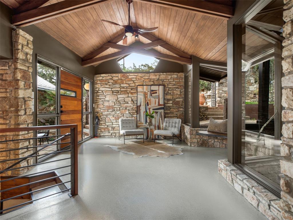 Stratford Hills Tree House: Inspired by its surroundings, this architectural gem was designed to blend seamlessly into nature in one of Austin's most beloved neighborhoods, on a lush .65 acres. The gorgeous living area is the heart of the home, with an amazing stone fireplace at the focal point reaching the soaring wood-beamed ceilings with peek-a-boo skylights - all surrounded by walls of glass overlooking the surrounding beauty of nature. Wood, stone, and glass are a thoughtful theme throughout the property, maximizing the views, and providing rich texture and detailing. Among the various outdoor spaces, an interior courtyard makes for a lovely place to meditate, and adds a nice focal point from the interior of the home. The primary suite is privately situated and offers stunning floor-to-ceiling windows with an unforgettable primary bath and direct patio access - the perfect getaway. This home features four bedrooms, three full bathrooms, and two half bathrooms, including a guest suite on the lower level of the home with a private entrance, full bath and separate laundry. Located in a centrally located part of town with incredible access to Downtown Austin (less than 3 miles away), and within a few blocks to Zilker Park.