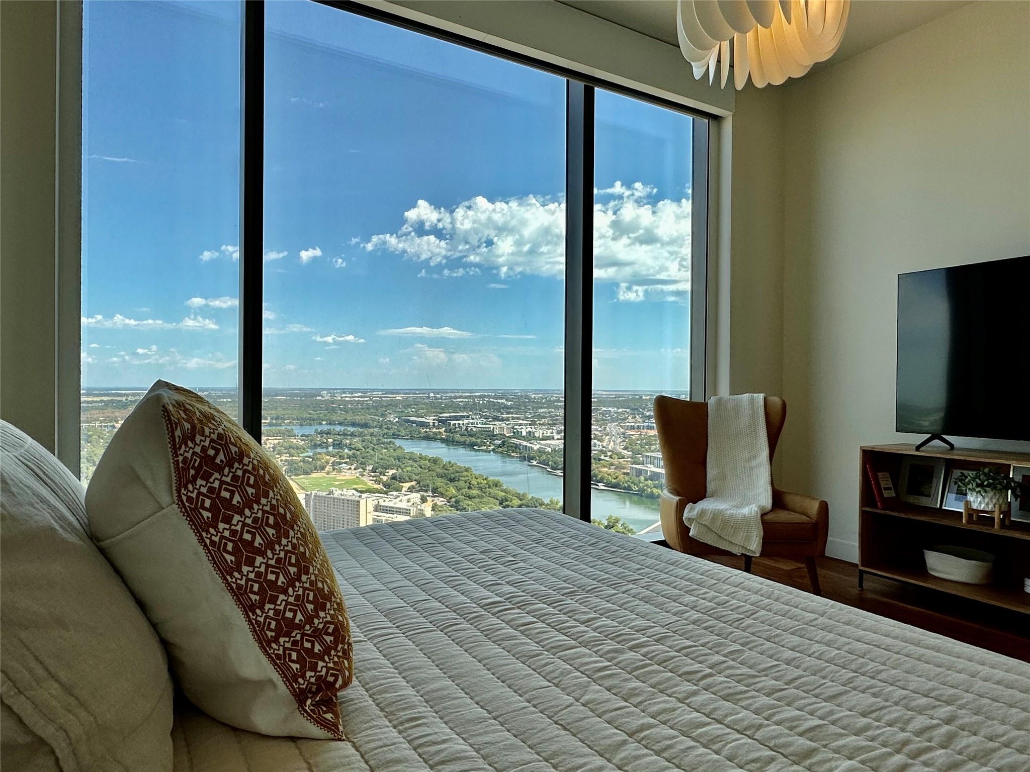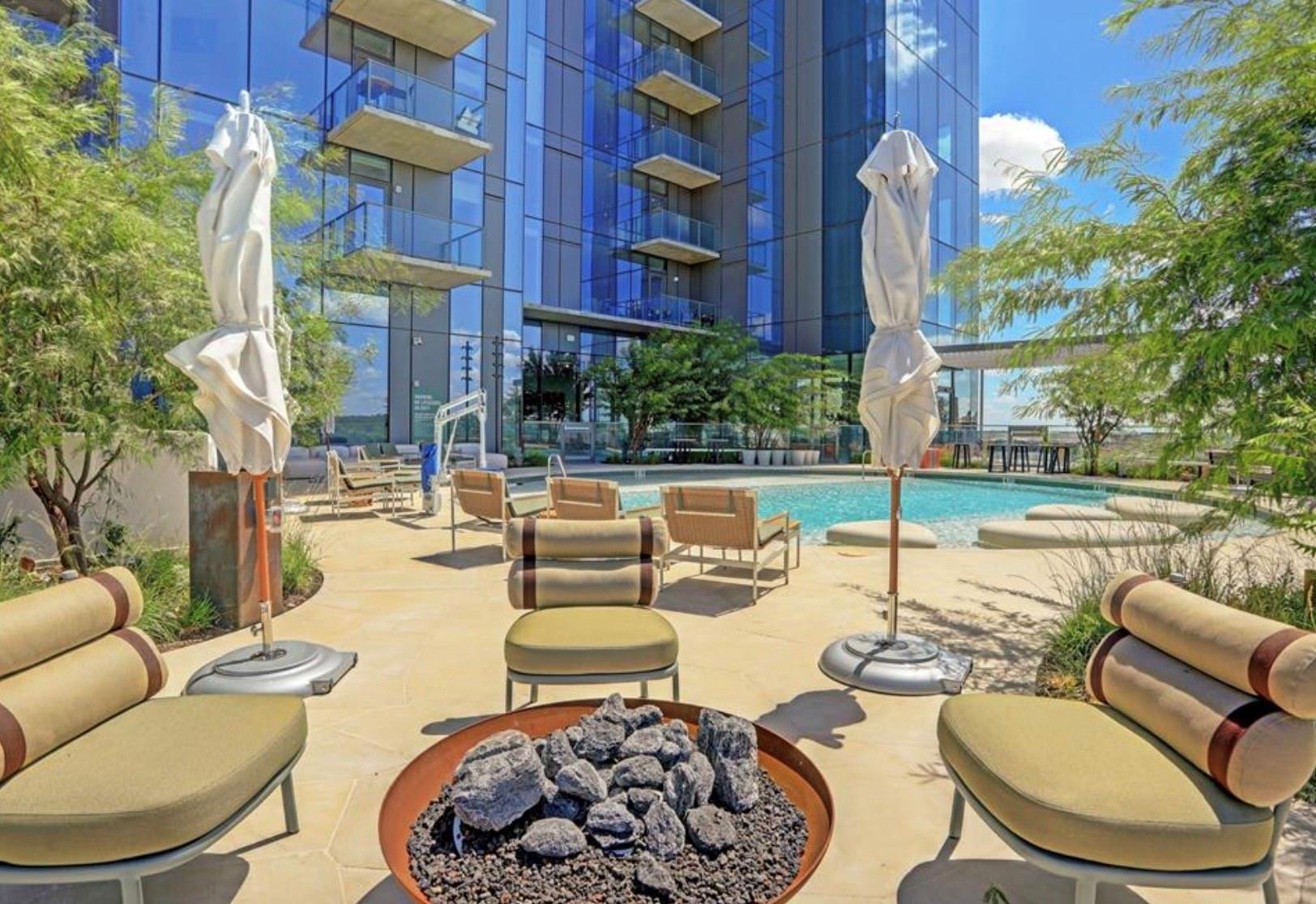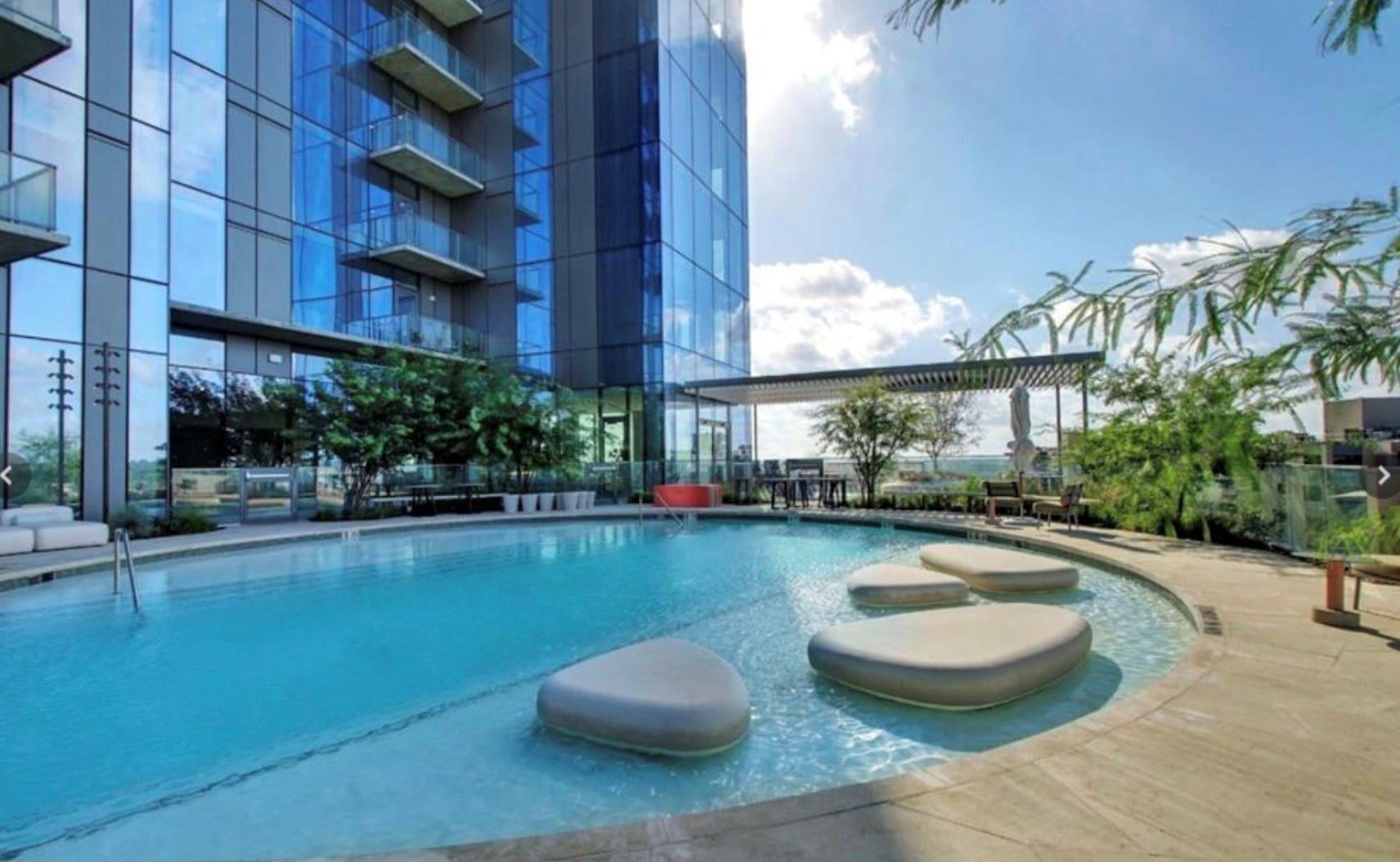 Luxurious lakeside living in this east-facing 3-bedroom, 3-bath residence with floor-to-ceiling windows showcasing stunning lake views. The open-concept living area boasts a high-end kitchen with quartz countertops and a central island. Modern comforts include blackout and electric blinds, a laundry room, and two parking spaces. Conveniently situated near Lady Bird Lake's Hike and Bike trail, along with lively dining options on Rainy Street, it perfectly combines nature and urban life. Impressive amenities encompass a resort-style pool deck, a fully-equipped fitness center, and a dedicated dog park, providing residents with a lavish and active lifestyle.