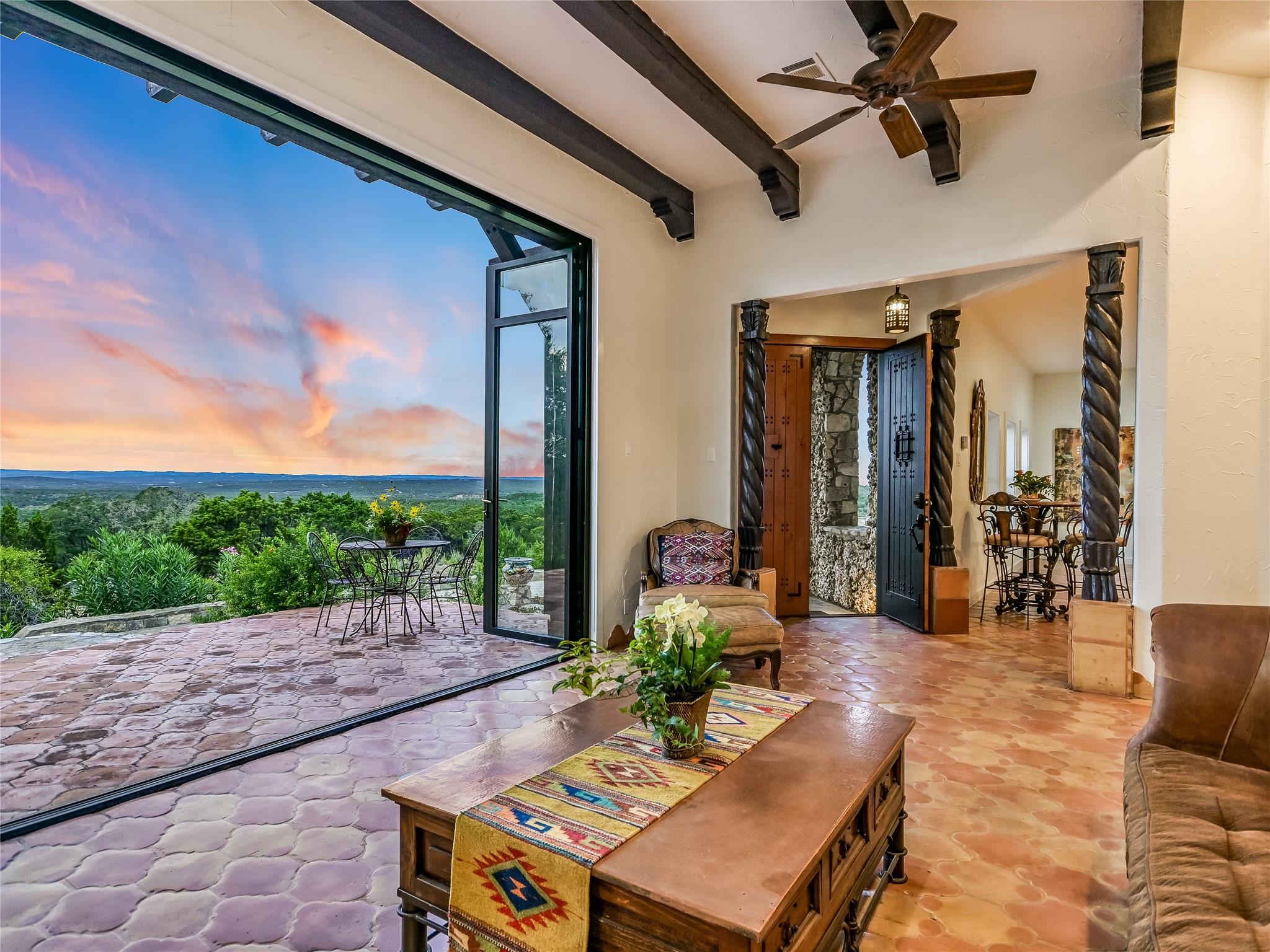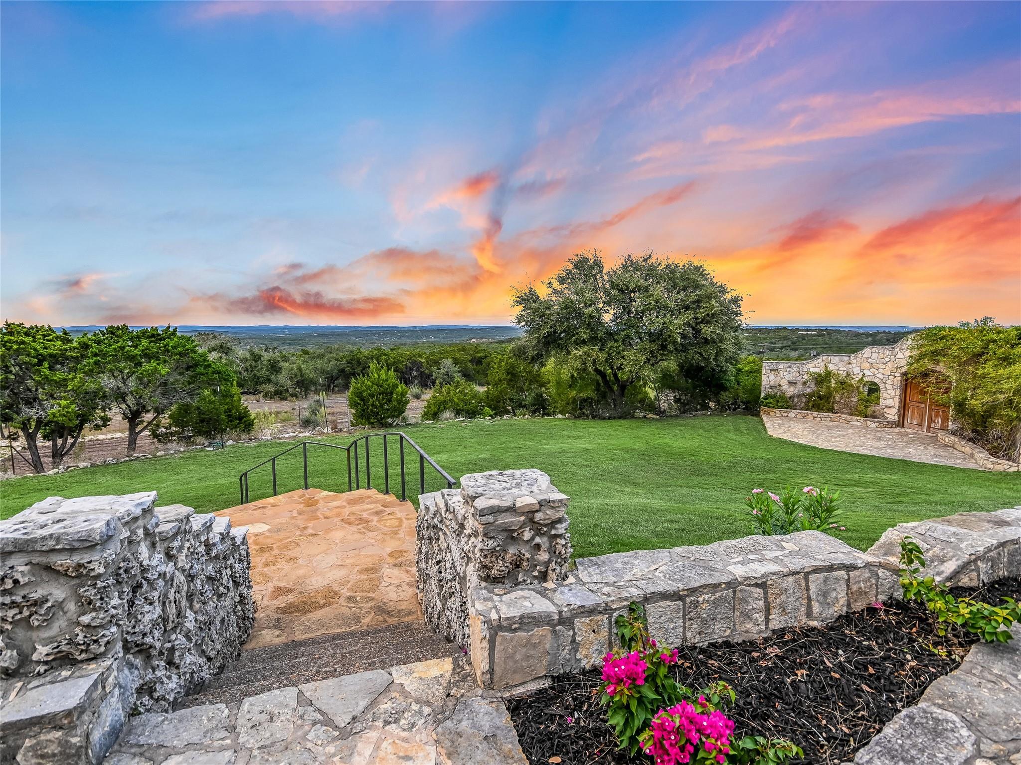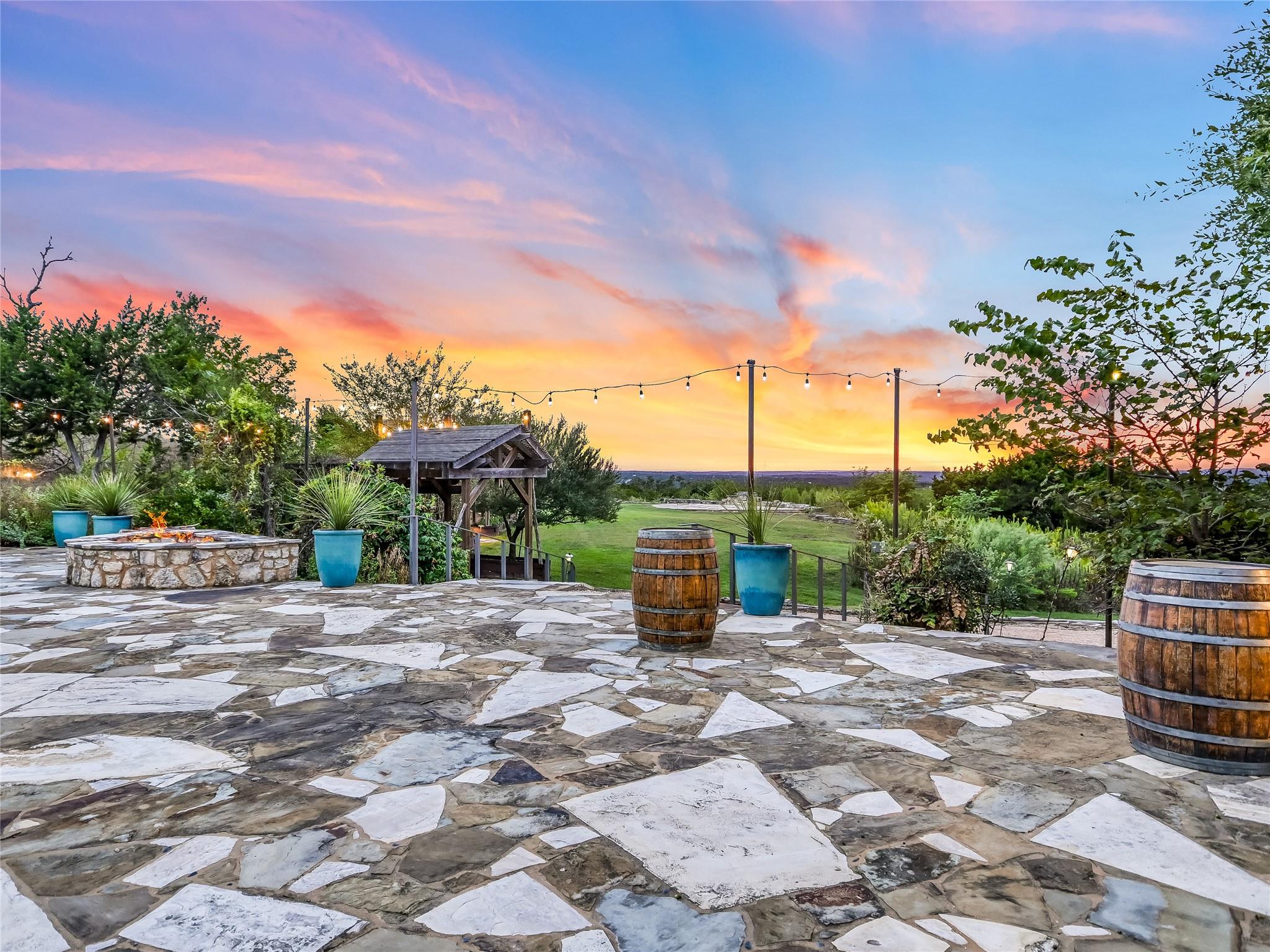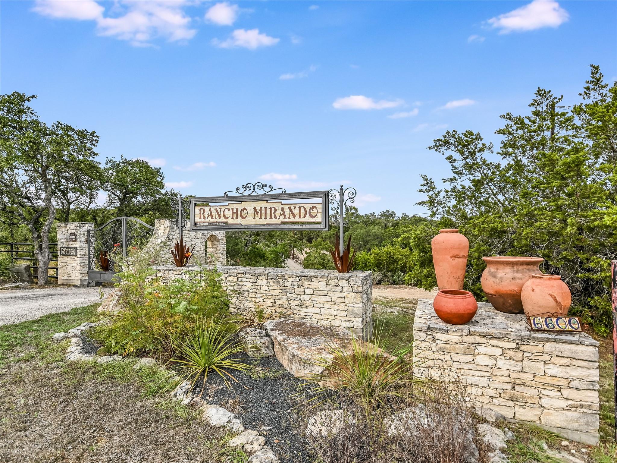 Tucked away within 30 unrestricted landscaped acres, between San Marcos & Wimberley, Rancho Mirando stands as a breathtaking Hill Country Event Venue and Luxury Guest Ranch, with panoramic views of the Devil's Backbone spanning over 2 counties. The land has undergone fifteen years of restoration to native grasses and wildflowers & the removal of cedar trees allowing the installation of a 60 tree Olive Grove.This estate boasts a castle-like Hacienda, built in 2001, offering 3834 sqft of living space. With 4 generously appointed bedrooms, 3 1/2 baths, 3 expansive living areas, a fully equipped kitchen, utility room, double garage, two patios, & 192+/- sqft storage area, it effortlessly accommodates up to 16 guests in true Texas comfort.Step outsideto an oasis that includes a covered BBQ terrace, a pool & cascading waterfall plus an adjacent 500 +/- sq ft tented area - all capturing the spectaculare views.Across the way, is a view oriented building constructed in 2011, the Pavilion. It is a contemporary Texas Hill Country style designed by AIA Architect Mark W Canada with approx. 3500 sqft of versatile space. Complete with multiple terraces, a fully equipped commercial kitchen, and spellbinding vistas, it's the perfect canvas for your grandest gatherings.Descend the steps, and you'll come upon the Bella Vista Bar & Patio, complete with a welcoming serving bar and a limestone patio. Nearby, the exquisite Bella Vista area stands as a picturesque park amid natural beauty. The potential of this remarkable property is as boundless as your imagination. Ideal for weddings, rehearsal dinners, joyous celebrations, corporate and family retreats, inspiring cooking classes, memorable awards ceremonies, cinematic filming locations, and heartwarming family or class reunions. On sprawling 30 acres, envision creating additional cottages or living spaces to expand your dreams. NOTE: Tax & Tax Information are estimates.