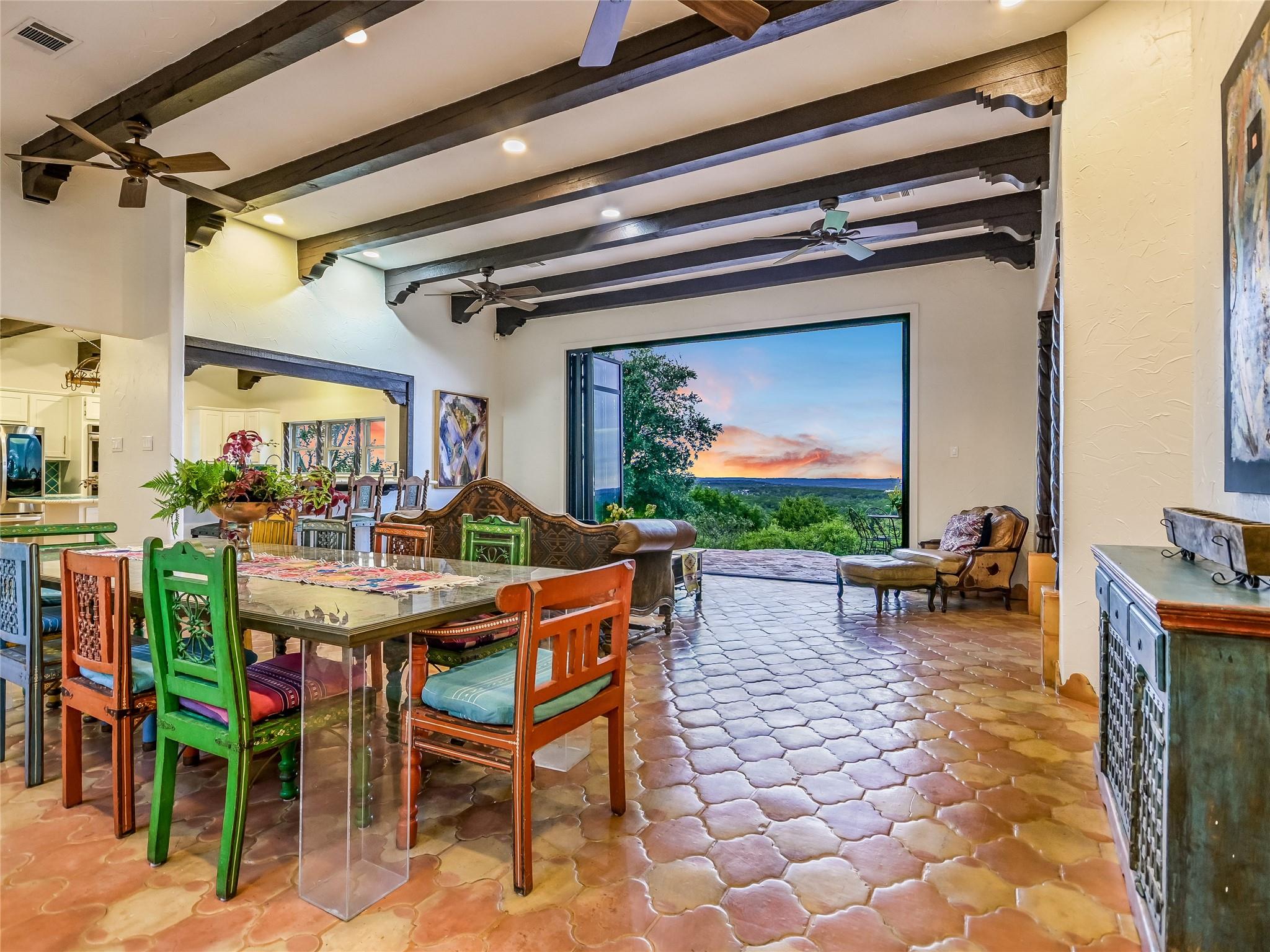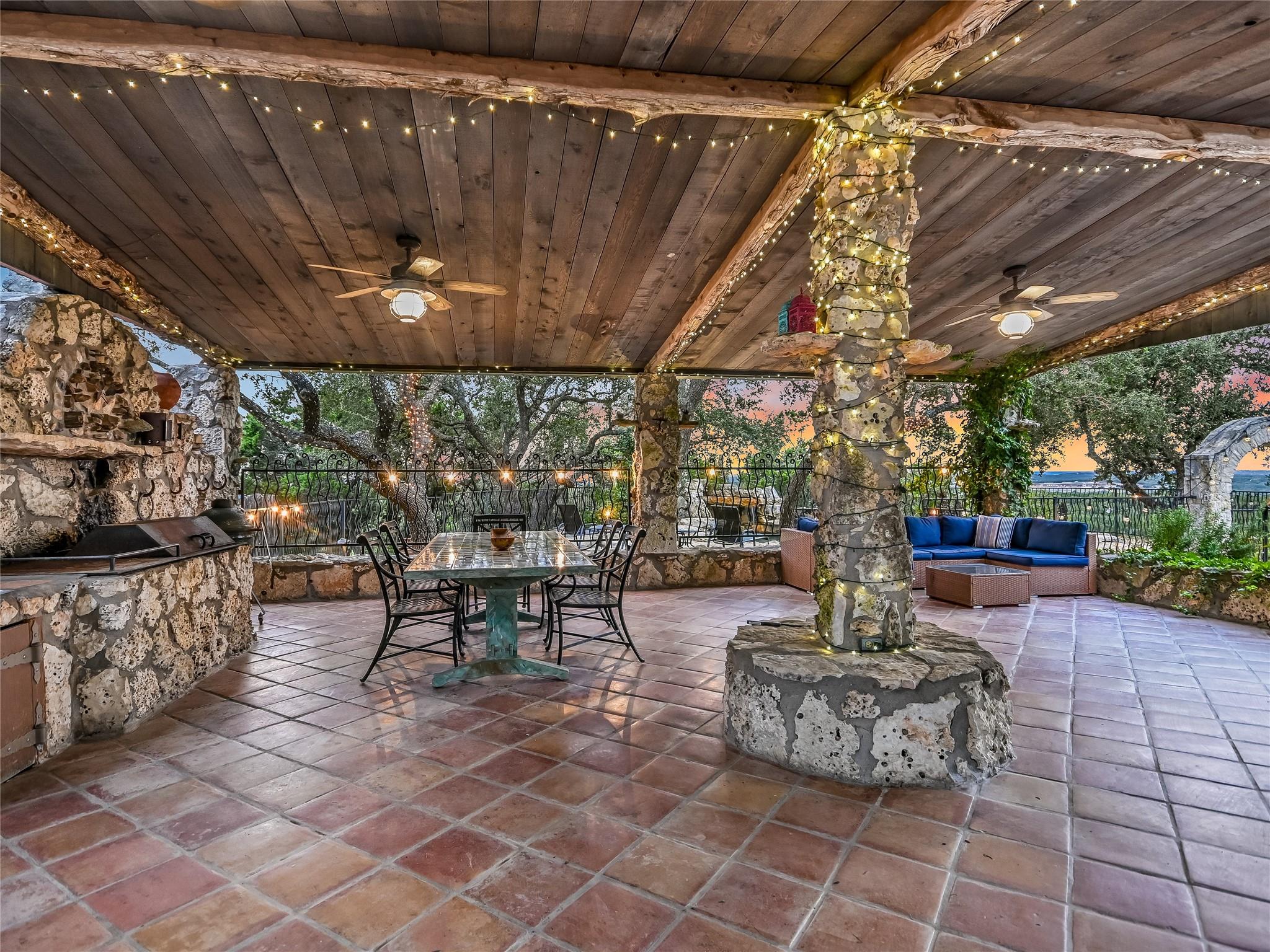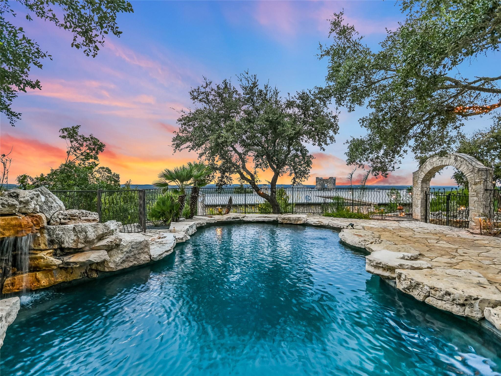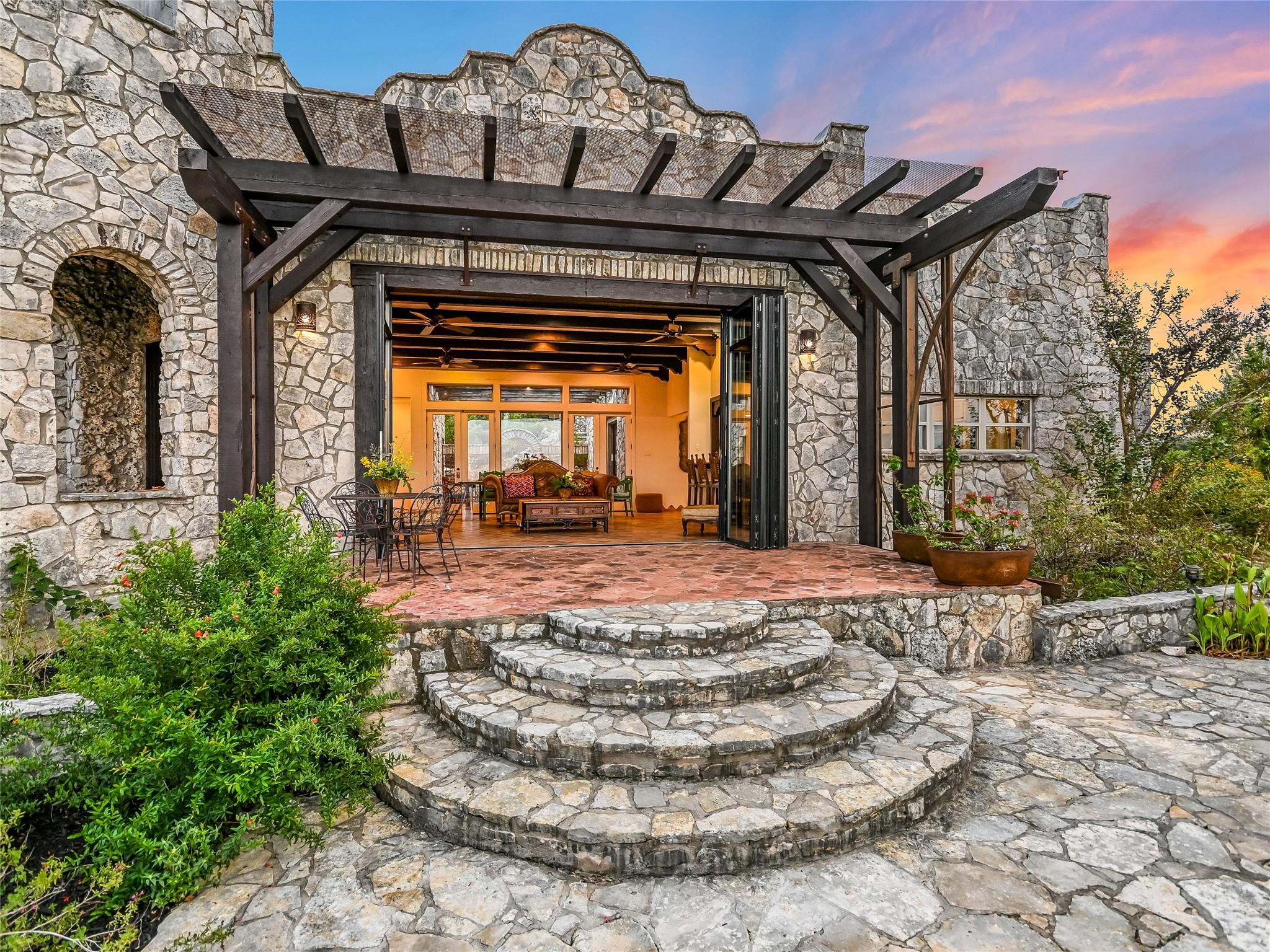 Tucked away within 30 unrestricted landscaped acres, between San Marcos & Wimberley, Rancho Mirando stands as a breathtaking Hill Country Event Venue and Luxury Guest Ranch, with panoramic views of the Devil's Backbone spanning over 2 counties. The land has undergone fifteen years of restoration to native grasses and wildflowers & the removal of cedar trees allowing the installation of a 60 tree Olive Grove.This estate boasts a castle-like Hacienda, built in 2001, offering 3834 sqft of living space. With 4 generously appointed bedrooms, 3 1/2 baths, 3 expansive living areas, a fully equipped kitchen, utility room, double garage, two patios, & 192+/- sqft storage area, it effortlessly accommodates up to 16 guests in true Texas comfort.Step outsideto an oasis that includes a covered BBQ terrace, a pool & cascading waterfall plus an adjacent 500 +/- sq ft tented area - all capturing the spectaculare views.Across the way, is a view oriented building constructed in 2011, the Pavilion. It is a contemporary Texas Hill Country style designed by AIA Architect Mark W Canada with approx. 3500 sqft of versatile space. Complete with multiple terraces, a fully equipped commercial kitchen, and spellbinding vistas, it's the perfect canvas for your grandest gatherings.Descend the steps, and you'll come upon the Bella Vista Bar & Patio, complete with a welcoming serving bar and a limestone patio. Nearby, the exquisite Bella Vista area stands as a picturesque park amid natural beauty. The potential of this remarkable property is as boundless as your imagination. Ideal for weddings, rehearsal dinners, joyous celebrations, corporate and family retreats, inspiring cooking classes, memorable awards ceremonies, cinematic filming locations, and heartwarming family or class reunions. On sprawling 30 acres, envision creating additional cottages or living spaces to expand your dreams. NOTE: Tax & Tax Information are estimates.