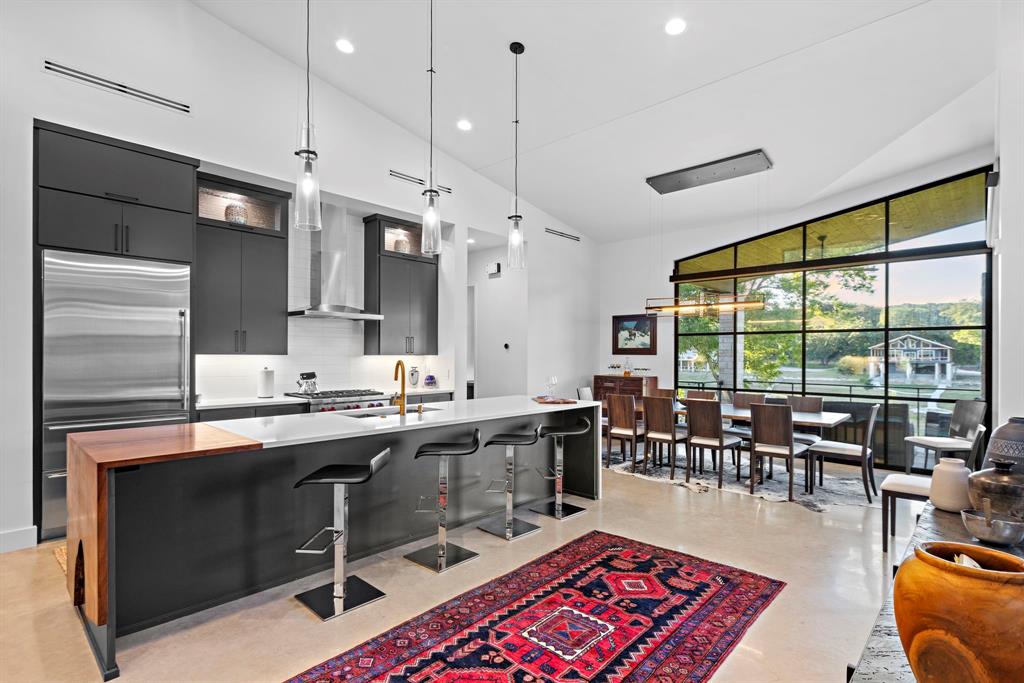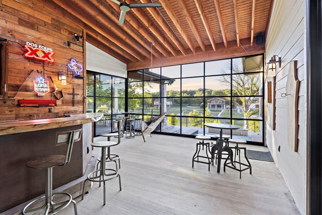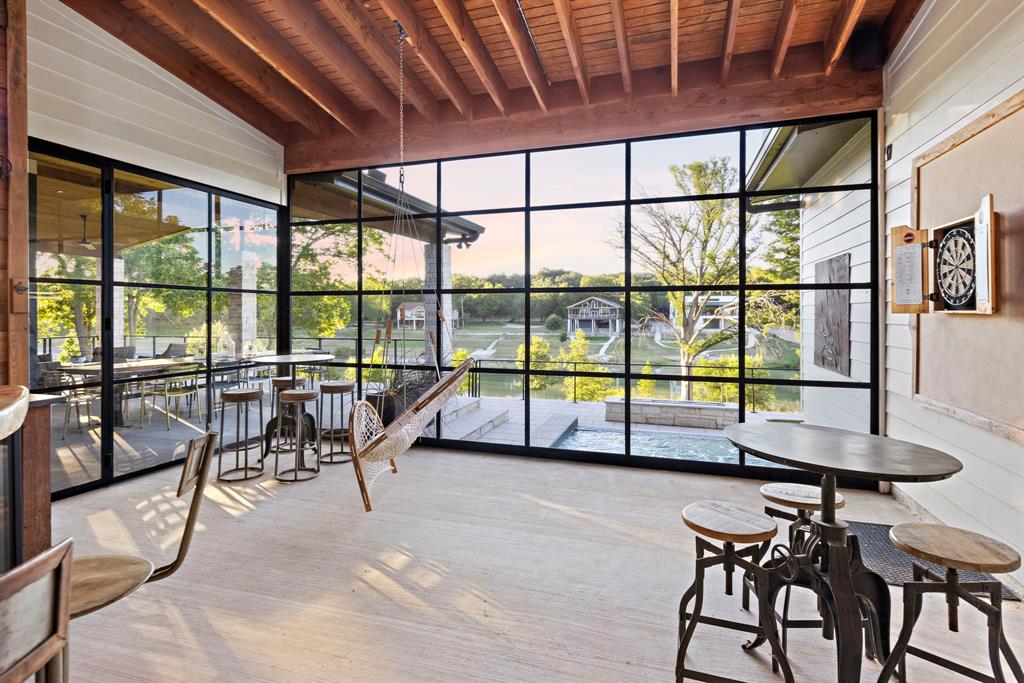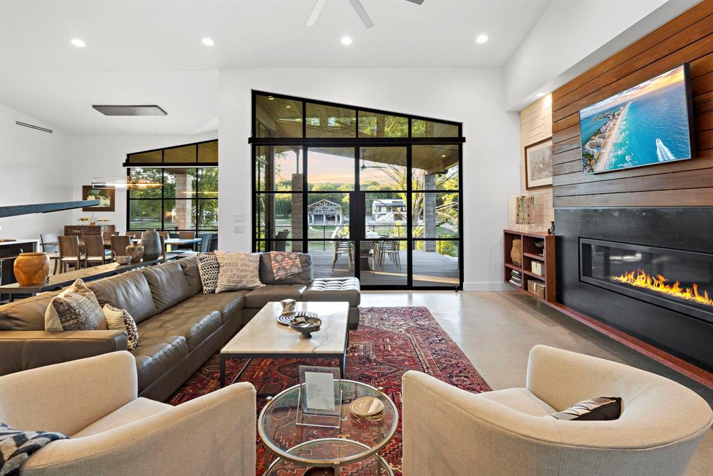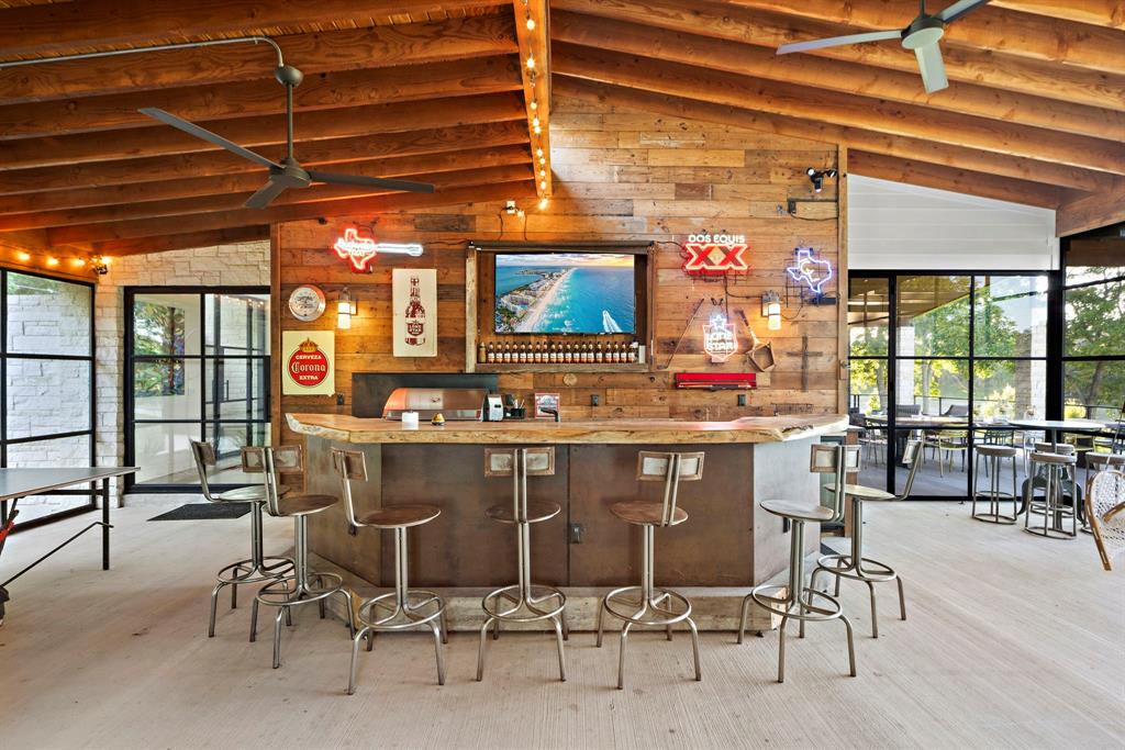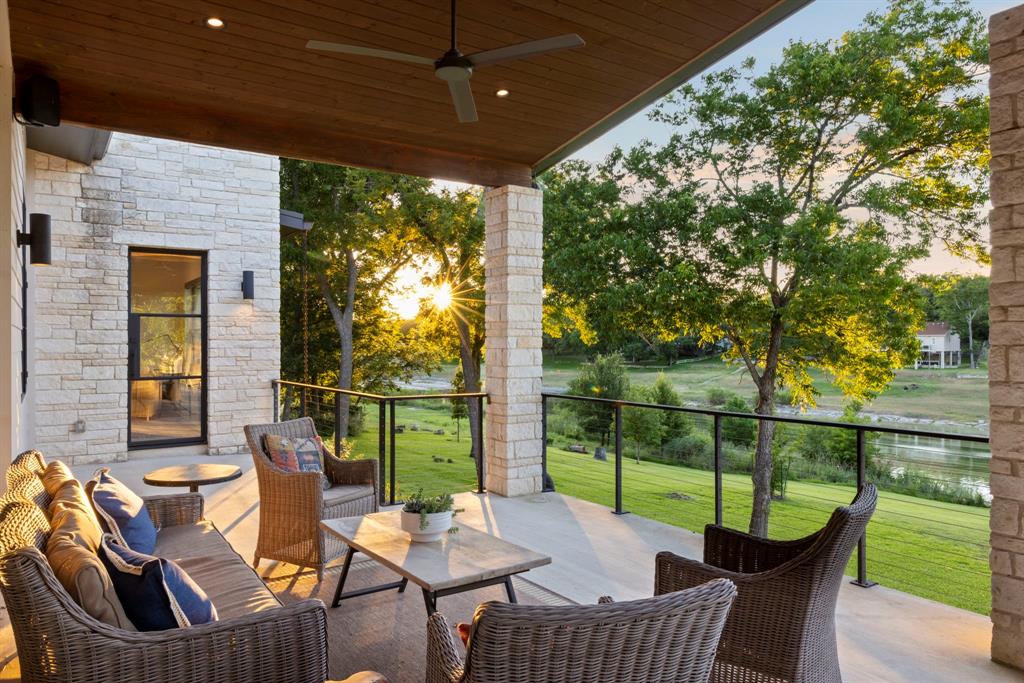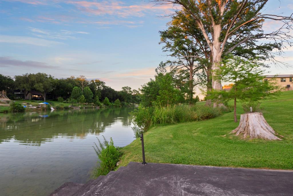 Stunning hill country modern dog trot home. The clean lines of the house and the presence of majestic oaks and pecan trees create an inviting atmosphere. As you enter through the steel and glass front door, you're immediately greeted by a breathtaking view of the Blanco River through a glass wall. The interior of the home features an open floor plan, starting with the island kitchen adorned with quartz countertops, Wolf appliances, a butlers pantry, custom cabinets and a custom island with a quartz and wood waterfall countertop. The living room includes a fireplace and built-in floating Bubinga wood cabinets, which were designed by local artisan Phillip Sell. The dining area is beautifully illuminated by a Hubbardton Forge chandelier, creating a perfect setting for dinners with friends and family. Moving down the hallway, you'll find an office nook with views of the river before reaching the primary suite. The primary suite offers stunning views and a spa-like bathroom complete with a soaking tub, walk-in shower, and his and her closets. Connected to the kitchen is a sitting/bedroom, providing a cozy space for relaxation and a guest bathroom featuring a pecan countertop, adding a touch of natural beauty. From the living room, you can step through a pivoting steel door into the screened-in dog trot entertaining area. This space is equipped with an outdoor kitchen and bar featuring a pecan countertop with seating for 6. Sliding glass doors lead from the dog trot area into the guest quarters, which consist of two ensuite bedrooms with separate sitting rooms, divided by a media room. At the back of the house, you'll find a spacious covered patio with a hot tub, offering a perfect spot for relaxation. From the patio, there's convenient access to the Blanco River, framed by beautiful Cypress trees. Whether you prefer floating, paddle boarding, or kayaking, you can enjoy the cool water & serene surroundings. Home offers a 3 car garage with built-in storage unit.