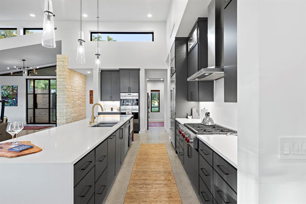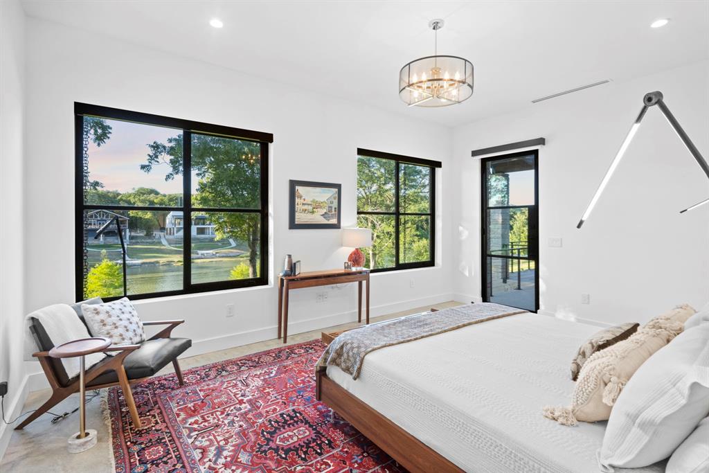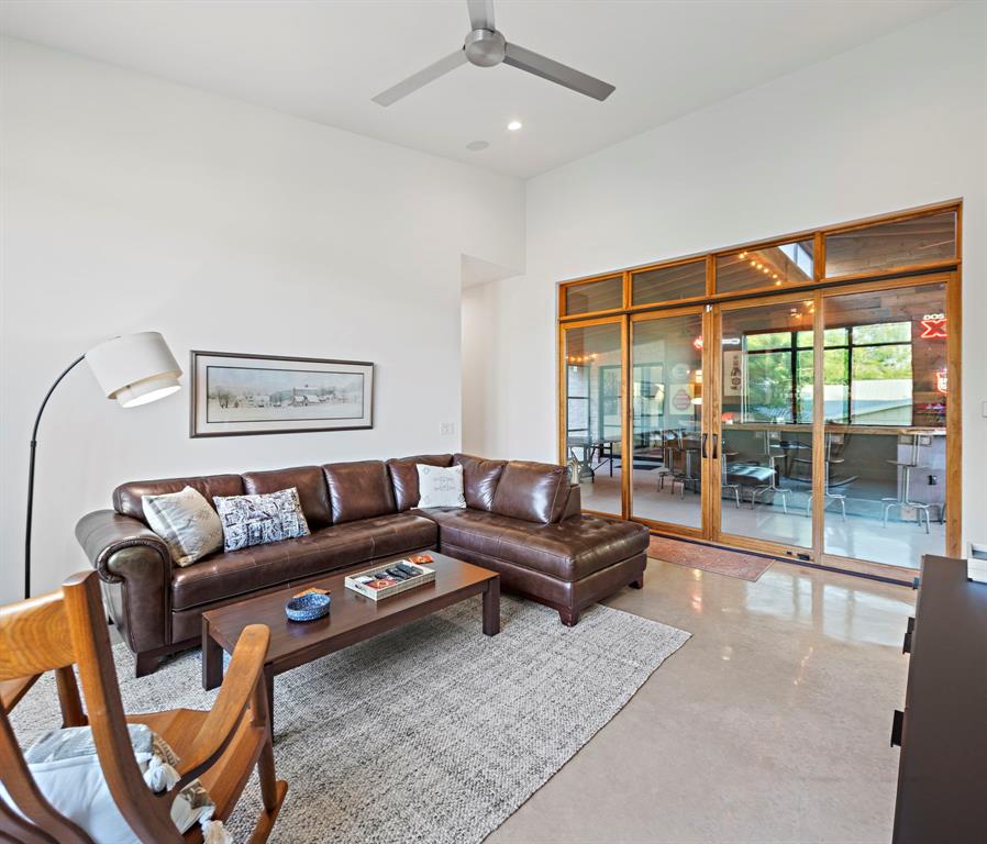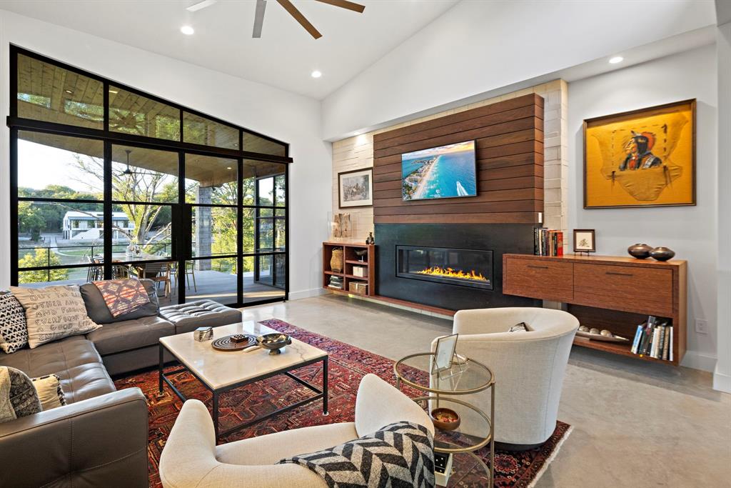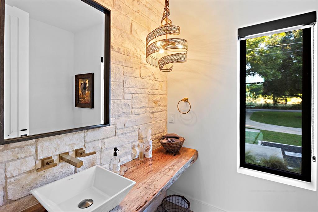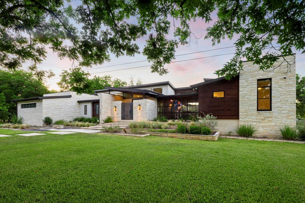 Stunning hill country modern dog trot home. The clean lines of the house and the presence of majestic oaks and pecan trees create an inviting atmosphere. As you enter through the steel and glass front door, you're immediately greeted by a breathtaking view of the Blanco River through a glass wall. The interior of the home features an open floor plan, starting with the island kitchen adorned with quartz countertops, Wolf appliances, a butlers pantry, custom cabinets and a custom island with a quartz and wood waterfall countertop. The living room includes a fireplace and built-in floating Bubinga wood cabinets, which were designed by local artisan Phillip Sell. The dining area is beautifully illuminated by a Hubbardton Forge chandelier, creating a perfect setting for dinners with friends and family. Moving down the hallway, you'll find an office nook with views of the river before reaching the primary suite. The primary suite offers stunning views and a spa-like bathroom complete with a soaking tub, walk-in shower, and his and her closets. Connected to the kitchen is a sitting/bedroom, providing a cozy space for relaxation and a guest bathroom featuring a pecan countertop, adding a touch of natural beauty. From the living room, you can step through a pivoting steel door into the screened-in dog trot entertaining area. This space is equipped with an outdoor kitchen and bar featuring a pecan countertop with seating for 6. Sliding glass doors lead from the dog trot area into the guest quarters, which consist of two ensuite bedrooms with separate sitting rooms, divided by a media room. At the back of the house, you'll find a spacious covered patio with a hot tub, offering a perfect spot for relaxation. From the patio, there's convenient access to the Blanco River, framed by beautiful Cypress trees. Whether you prefer floating, paddle boarding, or kayaking, you can enjoy the cool water & serene surroundings. Home offers a 3 car garage with built-in storage unit.