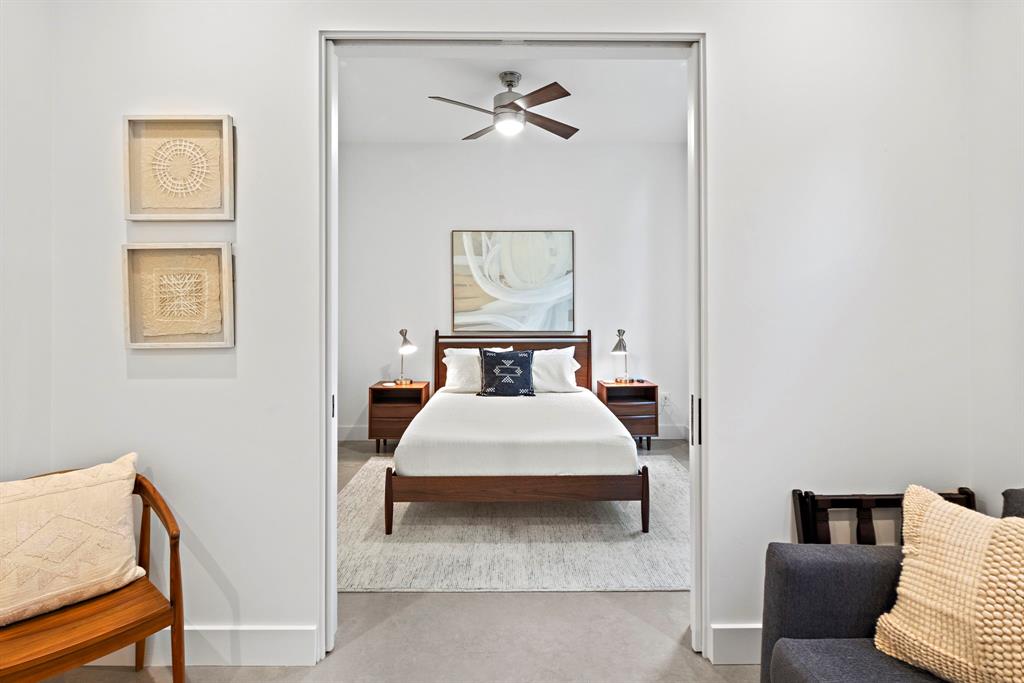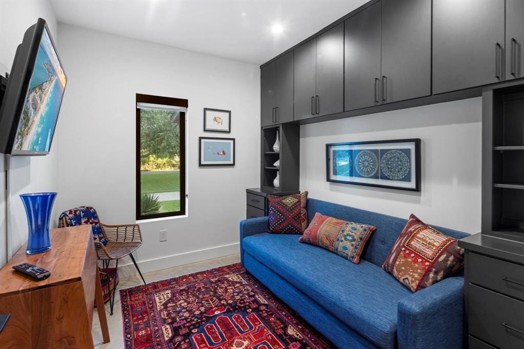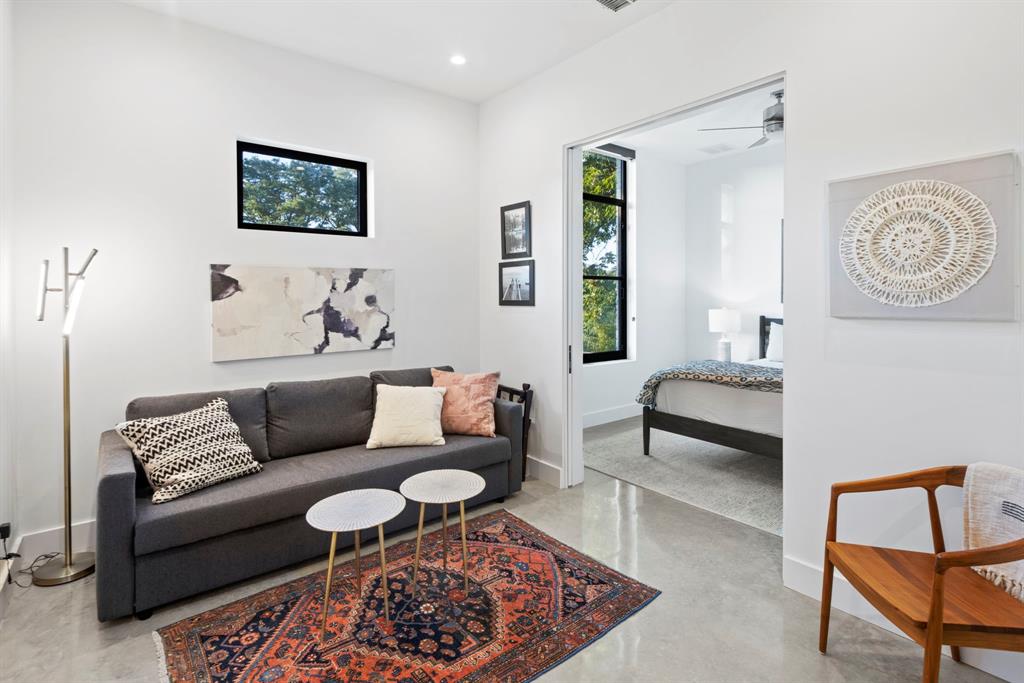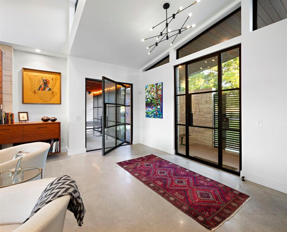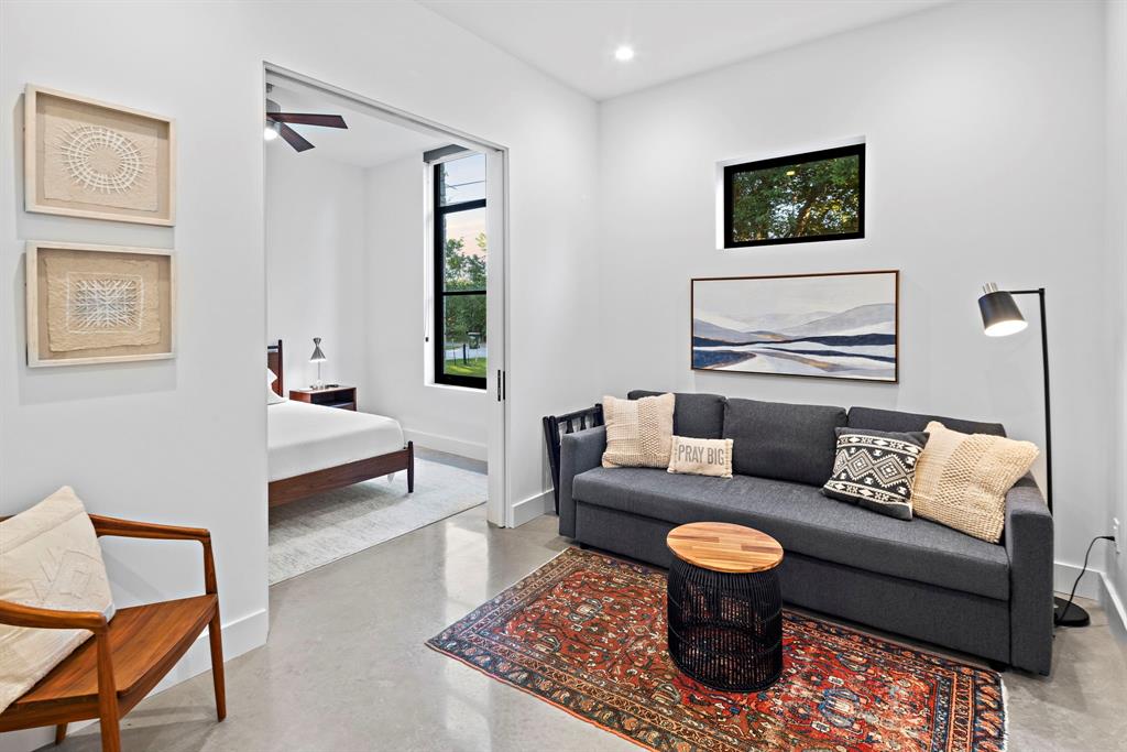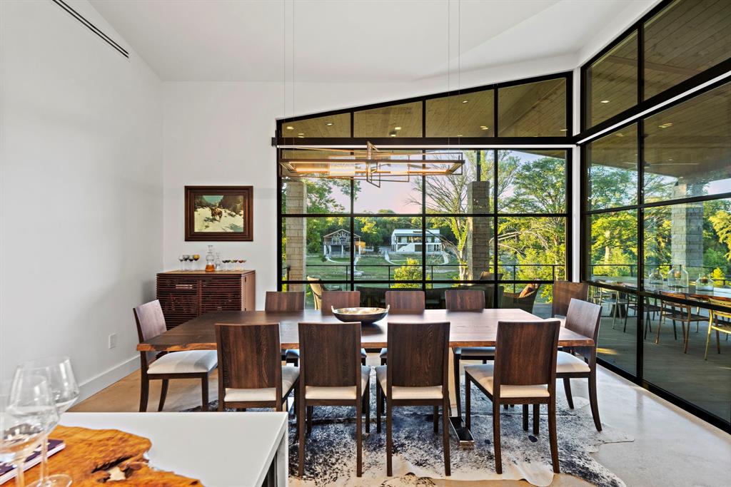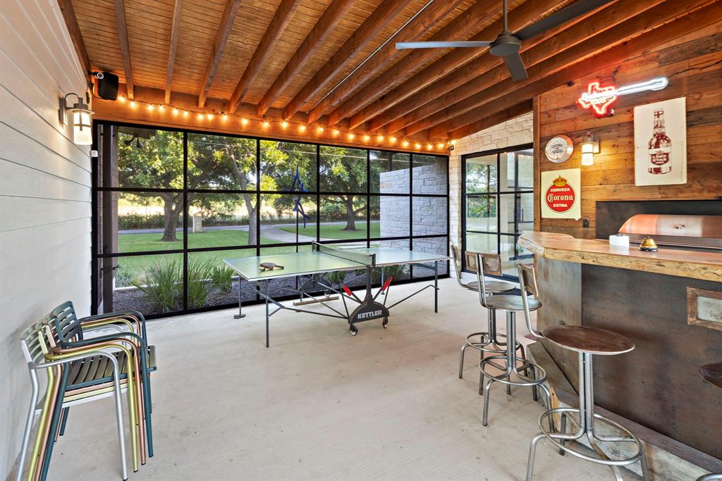Stunning hill country modern dog trot home. The clean lines of the house and the presence of majestic oaks and pecan trees create an inviting atmosphere. As you enter through the steel and glass front door, you're immediately greeted by a breathtaking view of the Blanco River through a glass wall. The interior of the home features an open floor plan, starting with the island kitchen adorned with quartz countertops, Wolf appliances, a butlers pantry, custom cabinets and a custom island with a quartz and wood waterfall countertop. The living room includes a fireplace and built-in floating Bubinga wood cabinets, which were designed by local artisan Phillip Sell. The dining area is beautifully illuminated by a Hubbardton Forge chandelier, creating a perfect setting for dinners with friends and family. Moving down the hallway, you'll find an office nook with views of the river before reaching the primary suite. The primary suite offers stunning views and a spa-like bathroom complete with a soaking tub, walk-in shower, and his and her closets. Connected to the kitchen is a sitting/bedroom, providing a cozy space for relaxation and a guest bathroom featuring a pecan countertop, adding a touch of natural beauty. From the living room, you can step through a pivoting steel door into the screened-in dog trot entertaining area. This space is equipped with an outdoor kitchen and bar featuring a pecan countertop with seating for 6. Sliding glass doors lead from the dog trot area into the guest quarters, which consist of two ensuite bedrooms with separate sitting rooms, divided by a media room. At the back of the house, you'll find a spacious covered patio with a hot tub, offering a perfect spot for relaxation. From the patio, there's convenient access to the Blanco River, framed by beautiful Cypress trees. Whether you prefer floating, paddle boarding, or kayaking, you can enjoy the cool water & serene surroundings. Home offers a 3 car garage with built-in storage unit.
