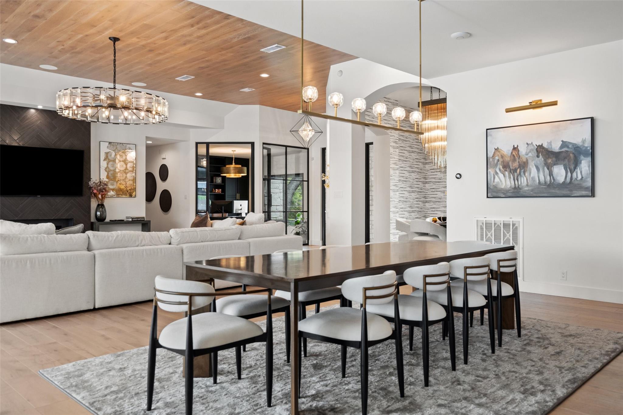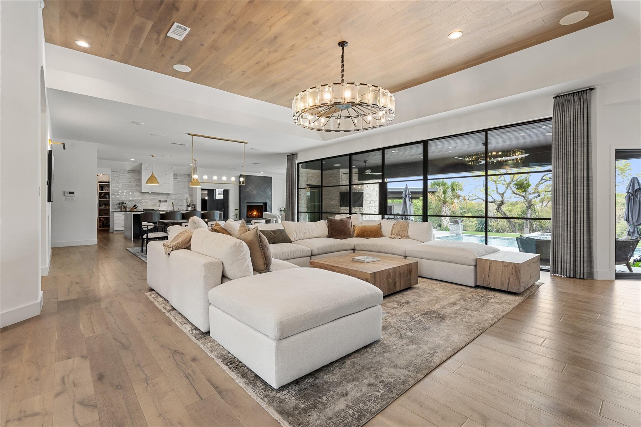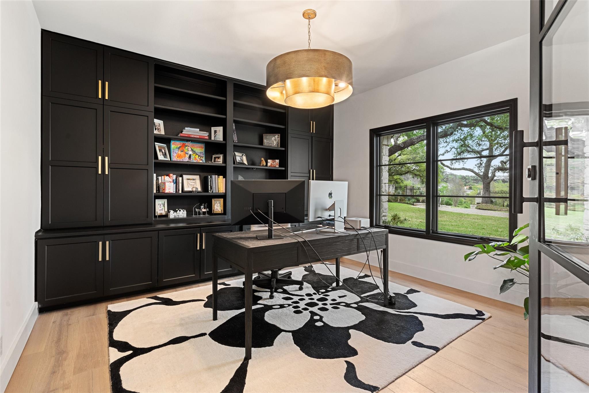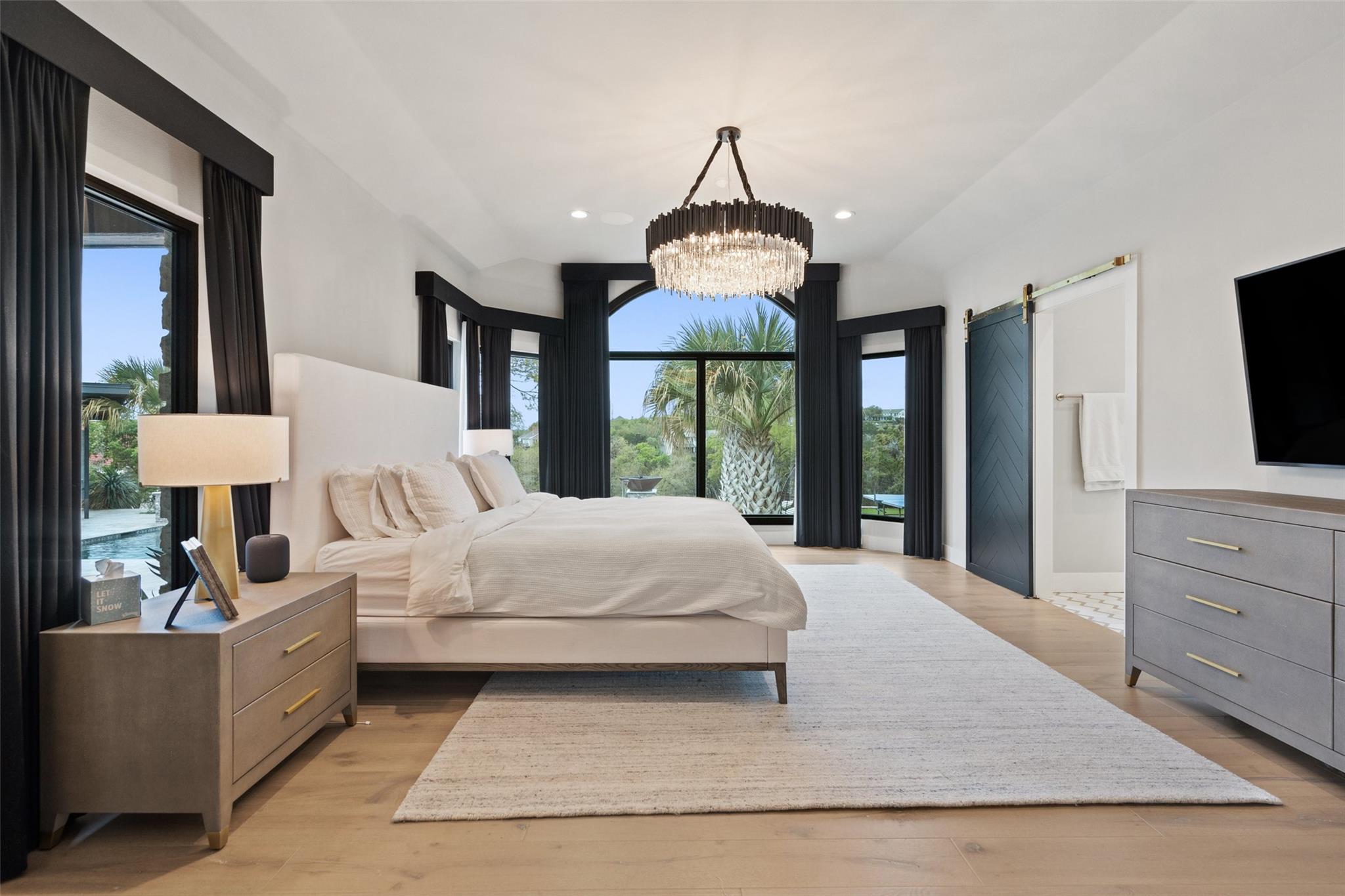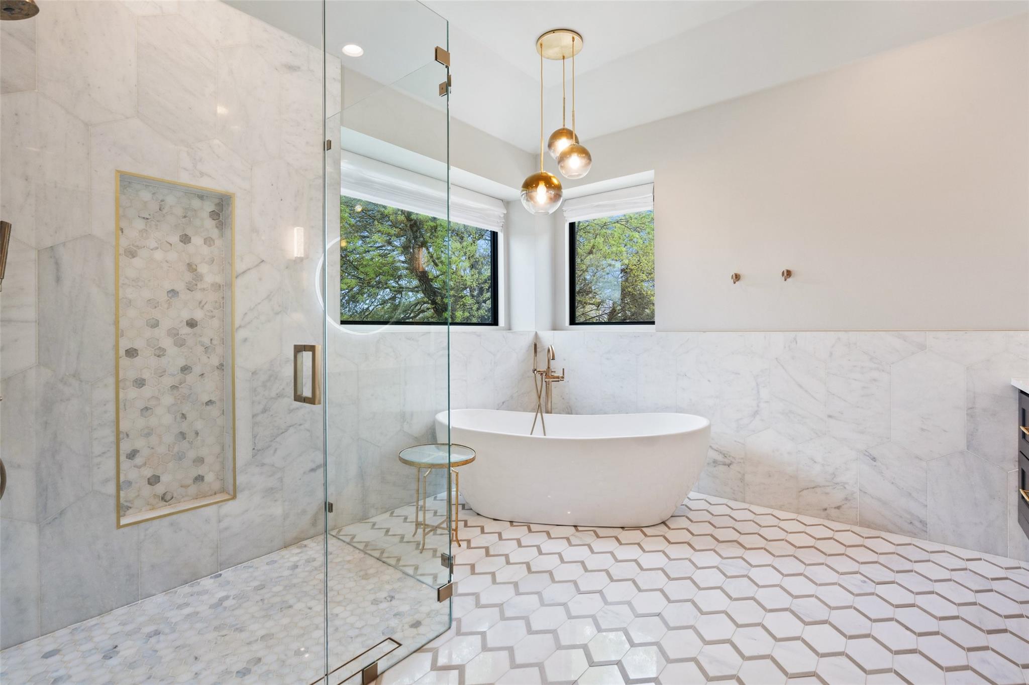 Sophisticated resort-style property on 2.29 gated, private acres in Rob Roy on the Creek. This rare one-story estate homes overlooks hill country views of Barton Creek through a landscape dotted with mature oak trees, tropical bananas and stately palms. Revel in your surroundings as you bask in the resort like pool, covered bar and outdoor kitchen overlooking a lush green lawn and the wilderness below; light the evenings with fire bowls flanking the pool. Extensively remodeled in 2020, the interior is a sleek, glamorous counterpart to the stunning views framed by blackened steel windows and doors. Throughout, you will find exquisite materials and striking accents combining to convey style and quality. Bookended by striking herringbone tile fireplaces on each end and the gorgeous gourmet kitchen, the expansive main living area opens directly out to the terrace, exponentially expanding living and entertaining space. Host a wine-tasting event with bottles pulled from the glass-enclosed wine cellar or movie night in the game room which enjoys its own mirror-and-brass bar. The refined primary suite enjoys a wall of windows looking out over the backyard greenery and a sleek, marble bath in which to prepare for the day. Architectural plans for a secondary 5th bedroom, 1100 square-foot primary suite with striking views offer tremendous value and room to expand the transitional floorplan.