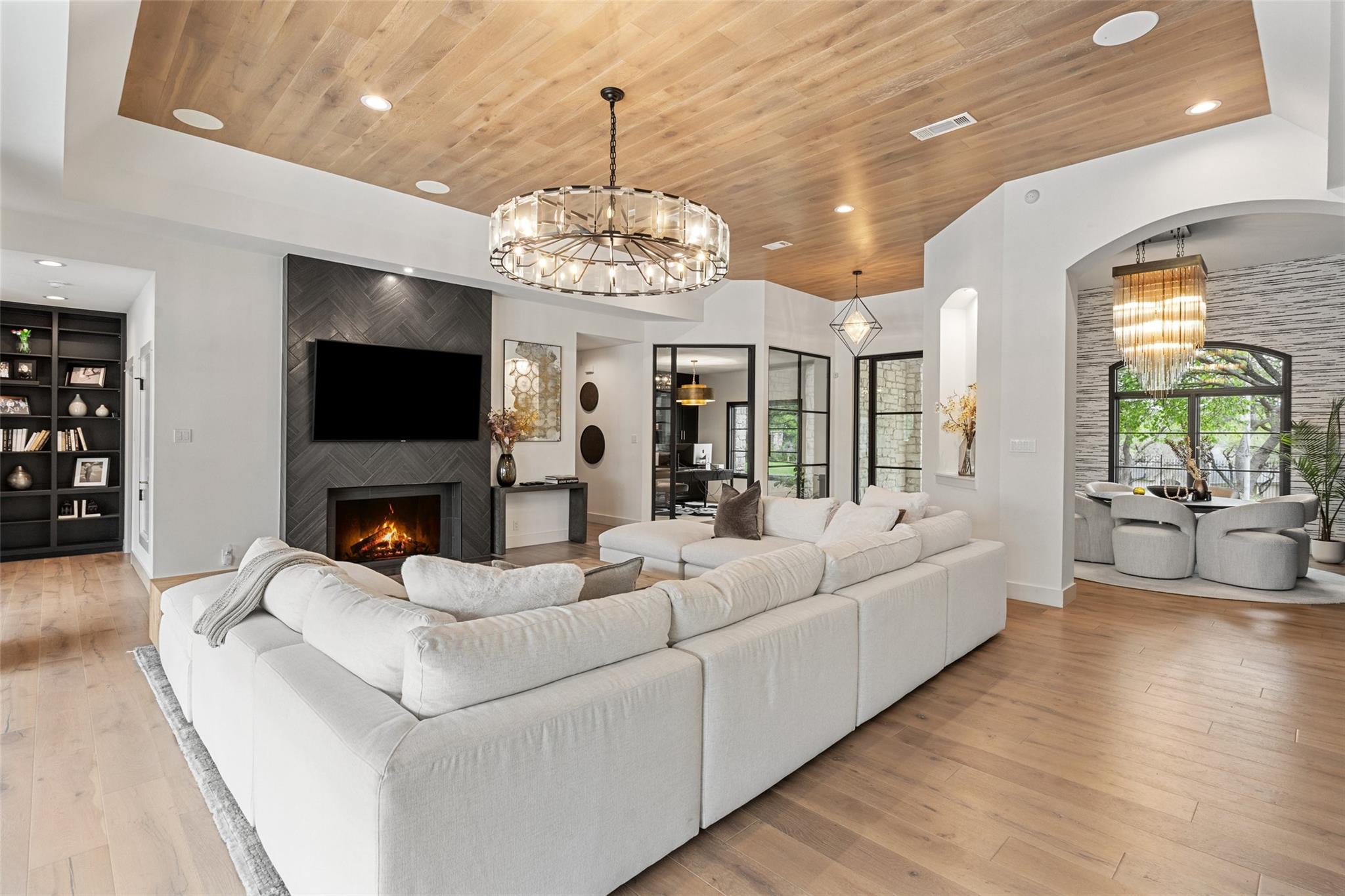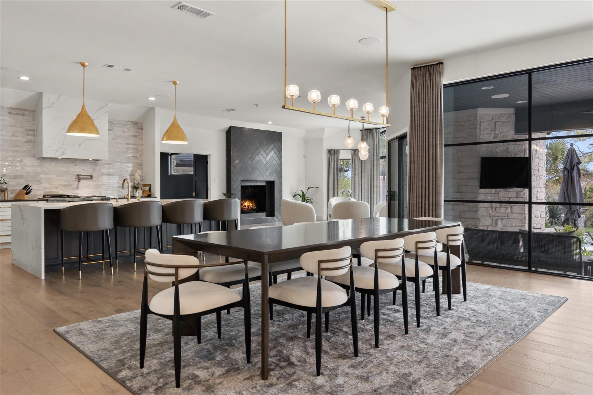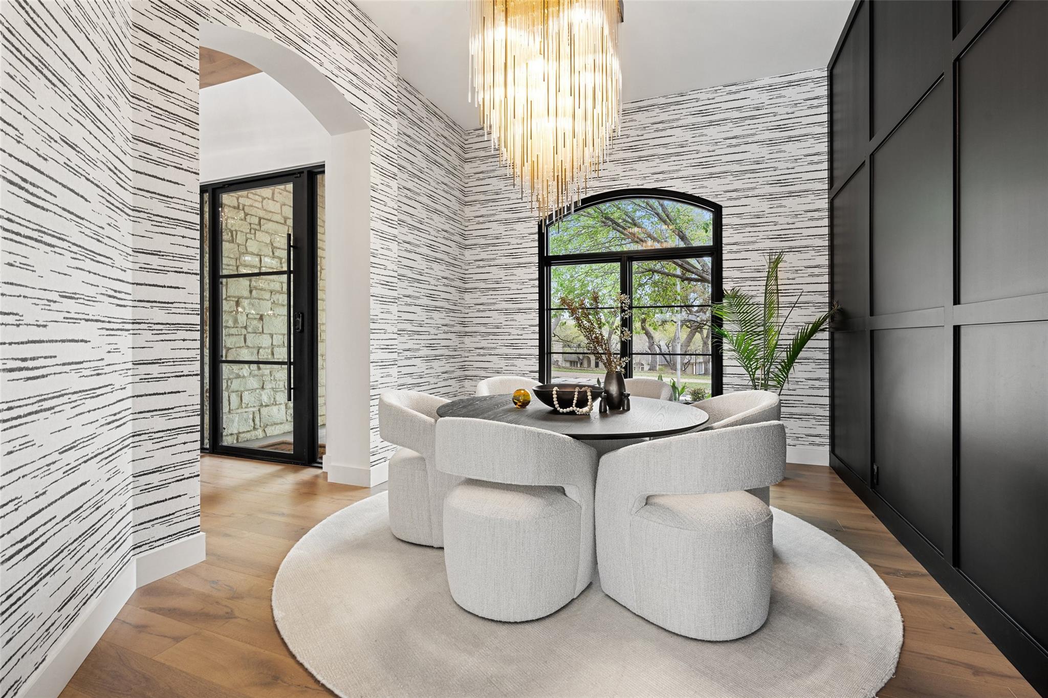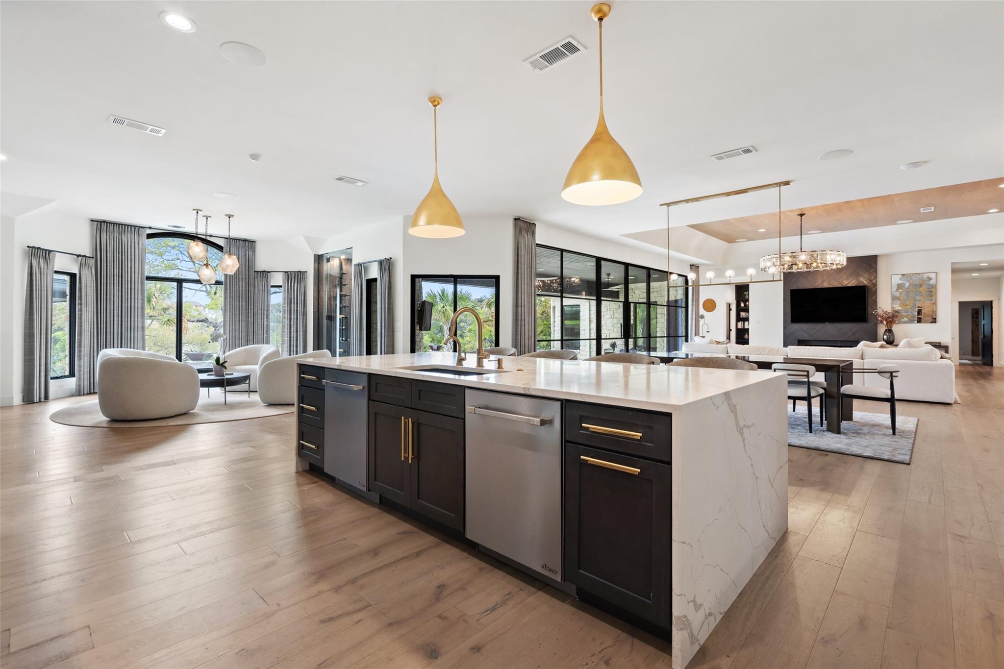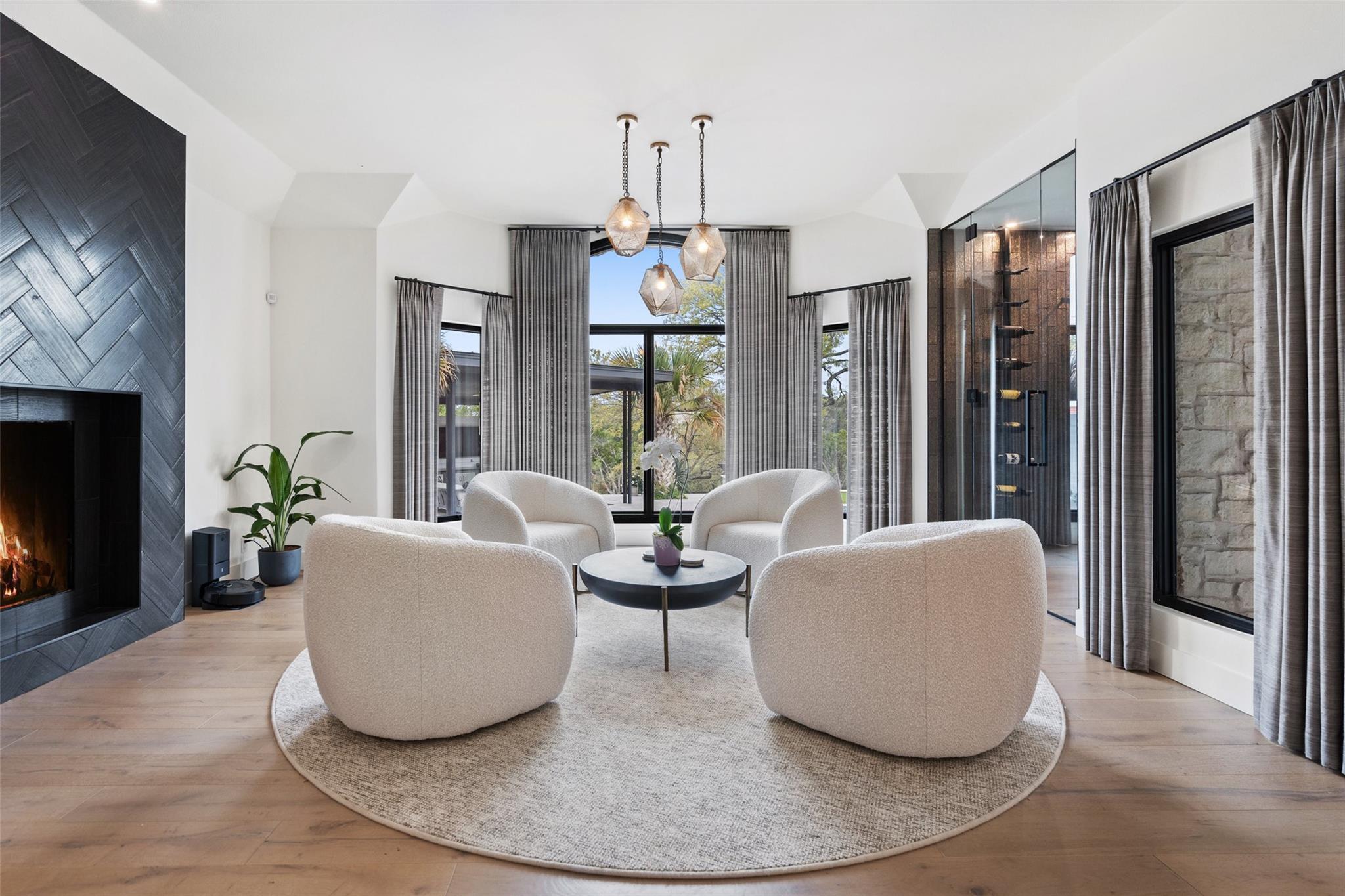 Sophisticated resort-style property on 2.29 gated, private acres in Rob Roy on the Creek. This rare one-story estate homes overlooks hill country views of Barton Creek through a landscape dotted with mature oak trees, tropical bananas and stately palms. Revel in your surroundings as you bask in the resort like pool, covered bar and outdoor kitchen overlooking a lush green lawn and the wilderness below; light the evenings with fire bowls flanking the pool. Extensively remodeled in 2020, the interior is a sleek, glamorous counterpart to the stunning views framed by blackened steel windows and doors. Throughout, you will find exquisite materials and striking accents combining to convey style and quality. Bookended by striking herringbone tile fireplaces on each end and the gorgeous gourmet kitchen, the expansive main living area opens directly out to the terrace, exponentially expanding living and entertaining space. Host a wine-tasting event with bottles pulled from the glass-enclosed wine cellar or movie night in the game room which enjoys its own mirror-and-brass bar. The refined primary suite enjoys a wall of windows looking out over the backyard greenery and a sleek, marble bath in which to prepare for the day. Architectural plans for a secondary 5th bedroom, 1100 square-foot primary suite with striking views offer tremendous value and room to expand the transitional floorplan.
