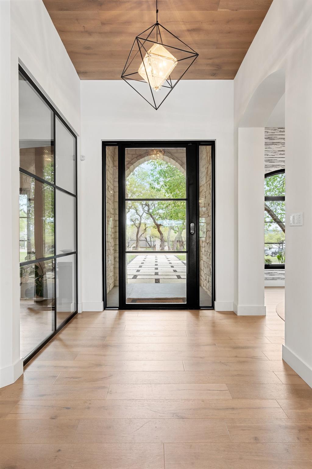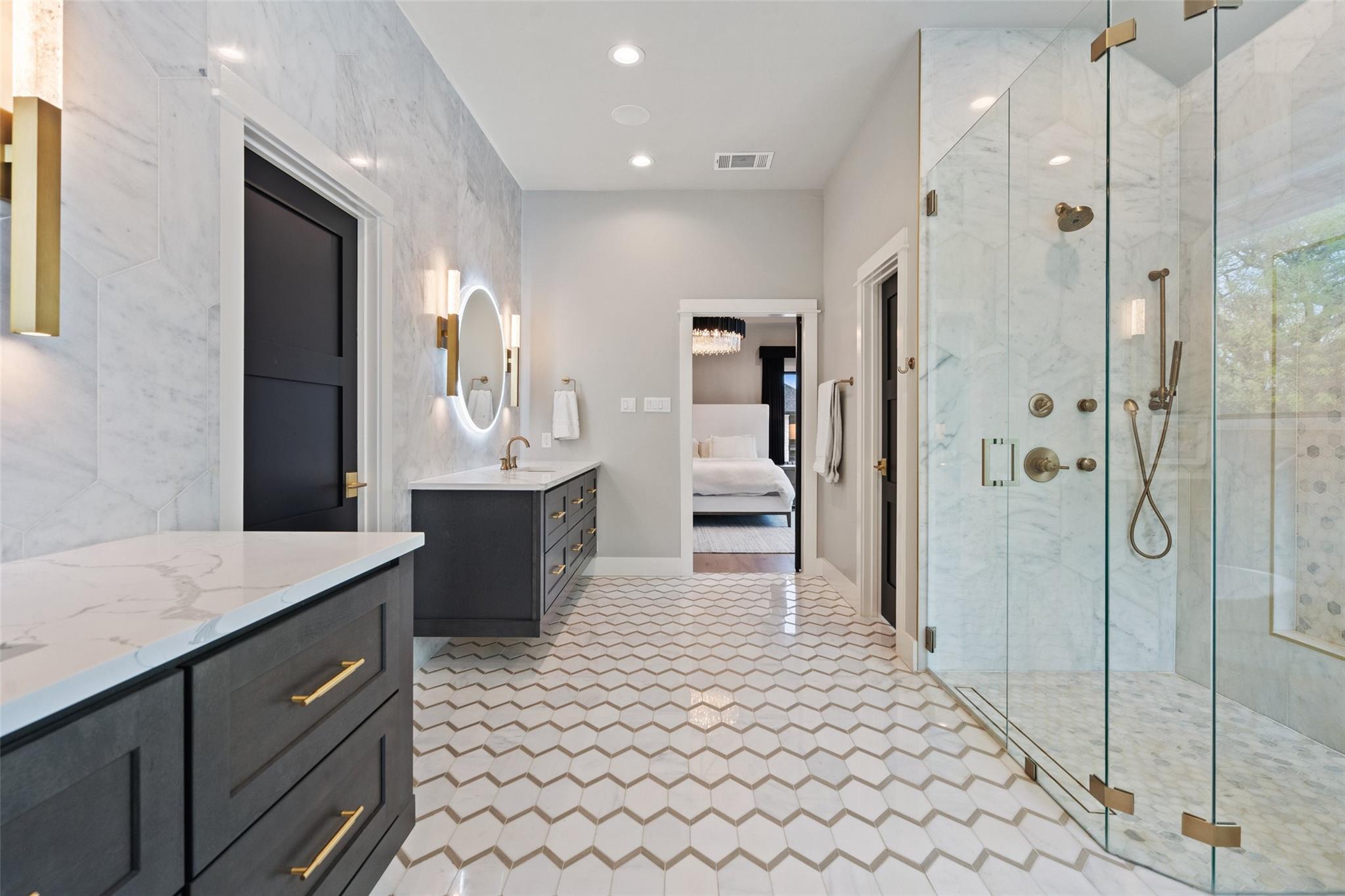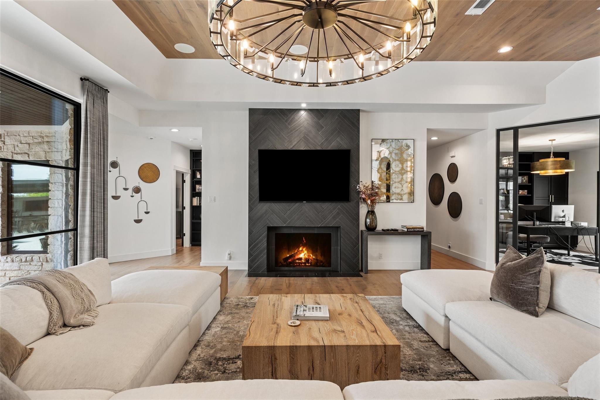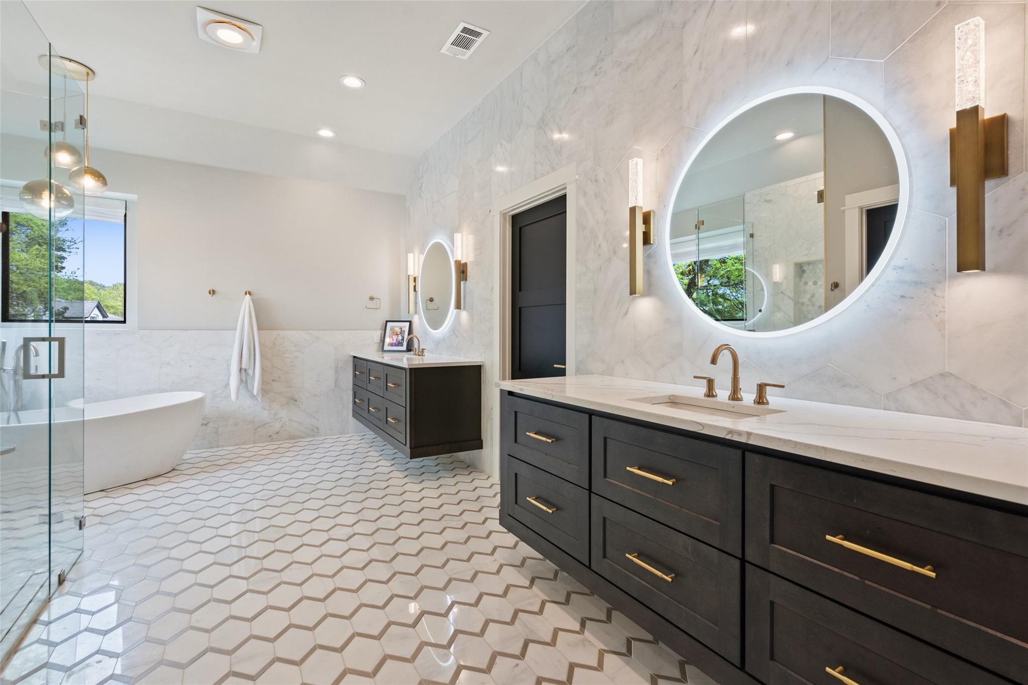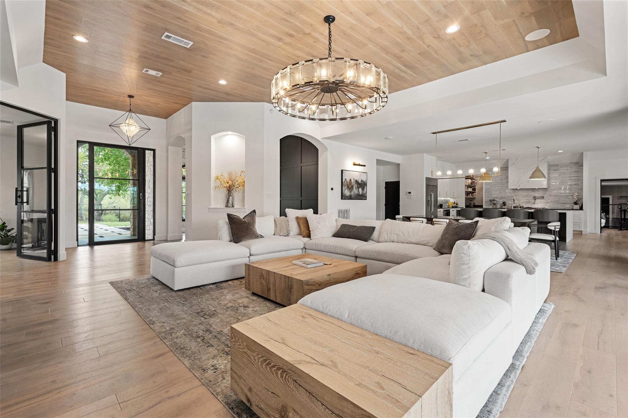 Sophisticated resort-style property on 2.29 gated, private acres in Rob Roy on the Creek. This rare one-story estate homes overlooks hill country views of Barton Creek through a landscape dotted with mature oak trees, tropical bananas and stately palms. Revel in your surroundings as you bask in the resort like pool, covered bar and outdoor kitchen overlooking a lush green lawn and the wilderness below; light the evenings with fire bowls flanking the pool. Extensively remodeled in 2020, the interior is a sleek, glamorous counterpart to the stunning views framed by blackened steel windows and doors. Throughout, you will find exquisite materials and striking accents combining to convey style and quality. Bookended by striking herringbone tile fireplaces on each end and the gorgeous gourmet kitchen, the expansive main living area opens directly out to the terrace, exponentially expanding living and entertaining space. Host a wine-tasting event with bottles pulled from the glass-enclosed wine cellar or movie night in the game room which enjoys its own mirror-and-brass bar. The refined primary suite enjoys a wall of windows looking out over the backyard greenery and a sleek, marble bath in which to prepare for the day. Architectural plans for a secondary 5th bedroom, 1100 square-foot primary suite with striking views offer tremendous value and room to expand the transitional floorplan.