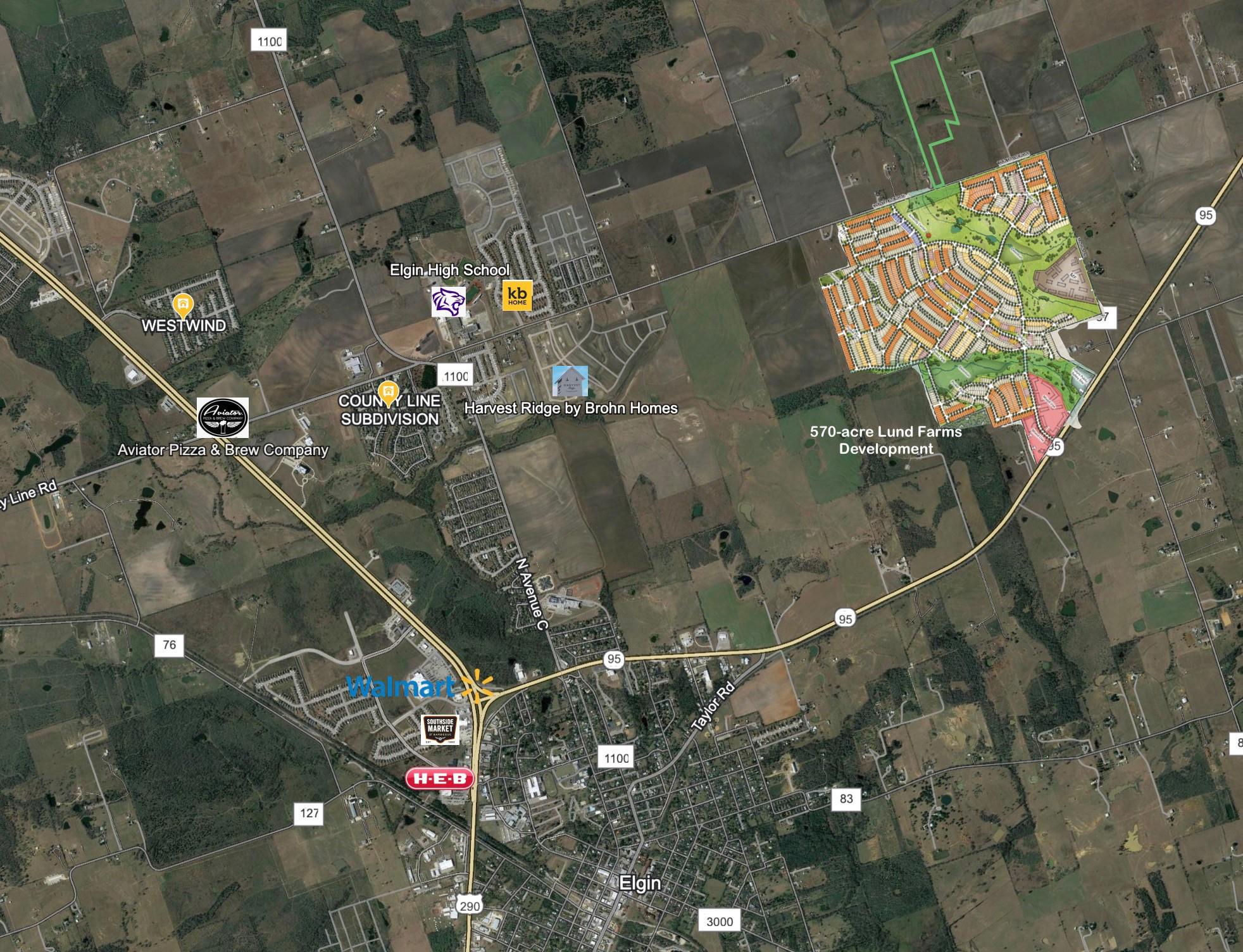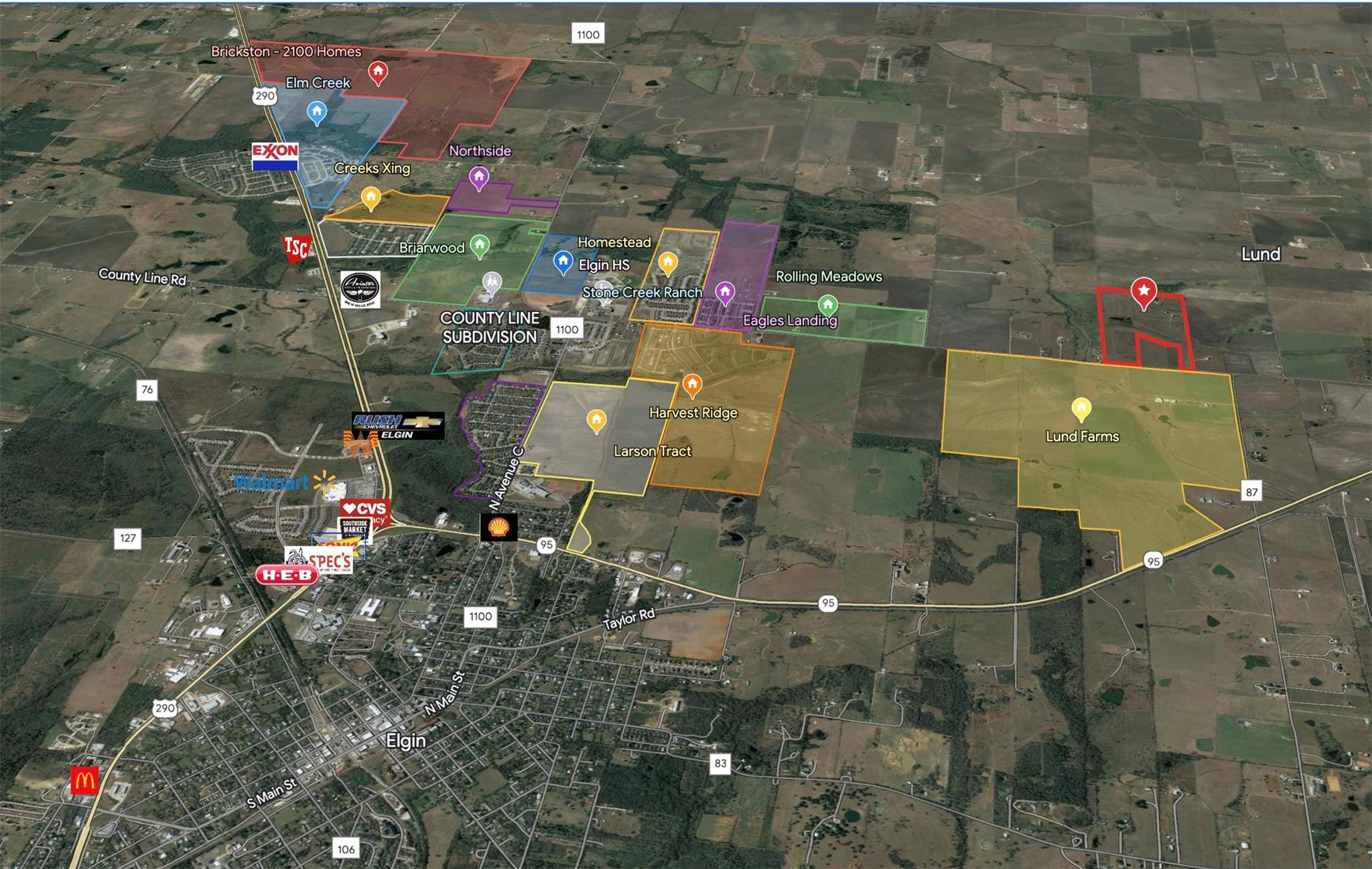 UNRESTRICTED 80+ Acres of farmland in the thriving growth corridor of Hwy 95 outside of Elgin, perfect for a BFR community or even a high-end RV Park Ideally located in the Unincorporated Travis County ETJ, the property is 1/2 a mile off 95, only 28 miles from Downtown Austin, 24 miles to Tesla, 20 miles to Pflugerville/Round Rock, and a mere 14 miles to Taylor's Samsung plant. Also, In the immediate area of Elgin HS, adjacent to 7 NEW SFR subdivisions going in, and a few approved Mixed-Use Developments. Boasting 30 Mile views from the back half and a natural landscape, it presents a nice 1031 play, land bank opportunity, a farm in a flourishing area, or develop into more ambitious projects previously mentioned that would kill it!! Certain infrastructure is in place for development, including power throughout, and more importantly, a 6" Aqua Water line only 700' away at Lund Rd. Given a few of the larger developments are doing their own MUD's, capacity shouldn't be an issue to accommodate the crazy fast-growing population. There is a partial floodplain along the seasonal creek and the front SE part of the property that can be either mitigated fairly easily or bypassed altogether....depending on site plans. The house is essentially a teardown. Regardless, this will prove to be an incredible investment into the future depending on your ideas, ambition, and creativity that awaits – at a minimum...