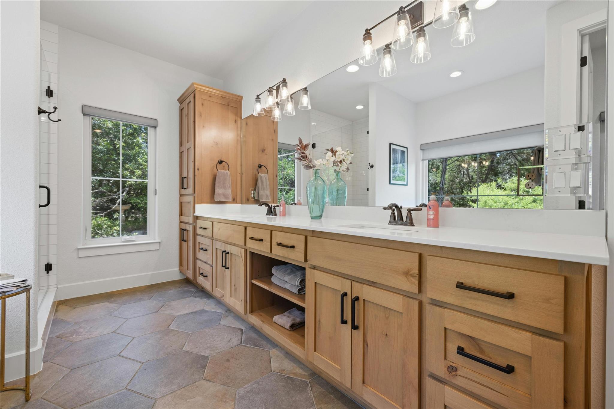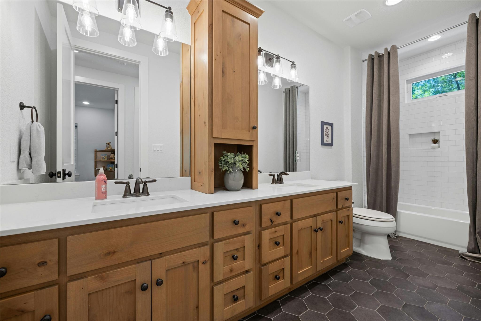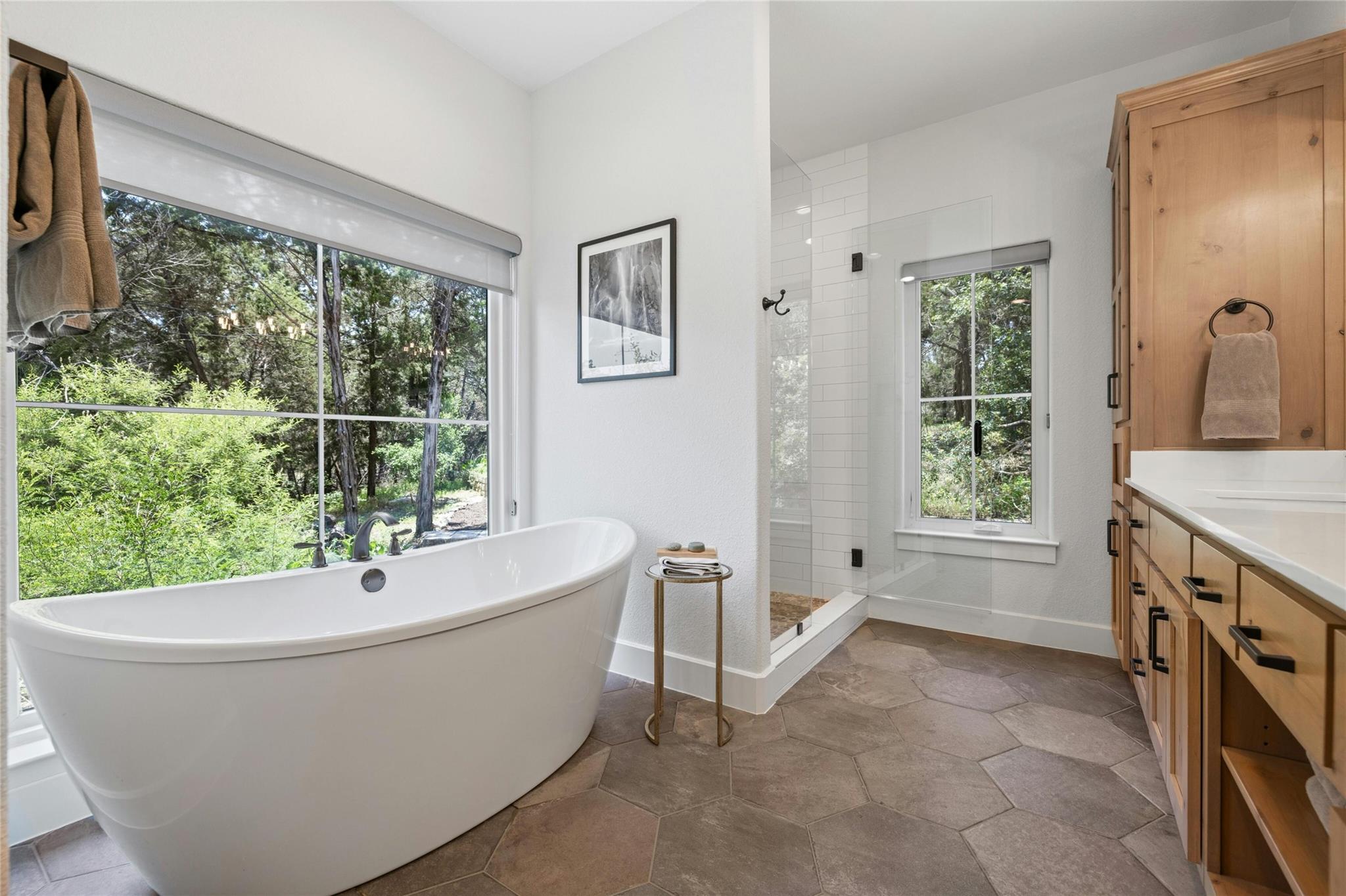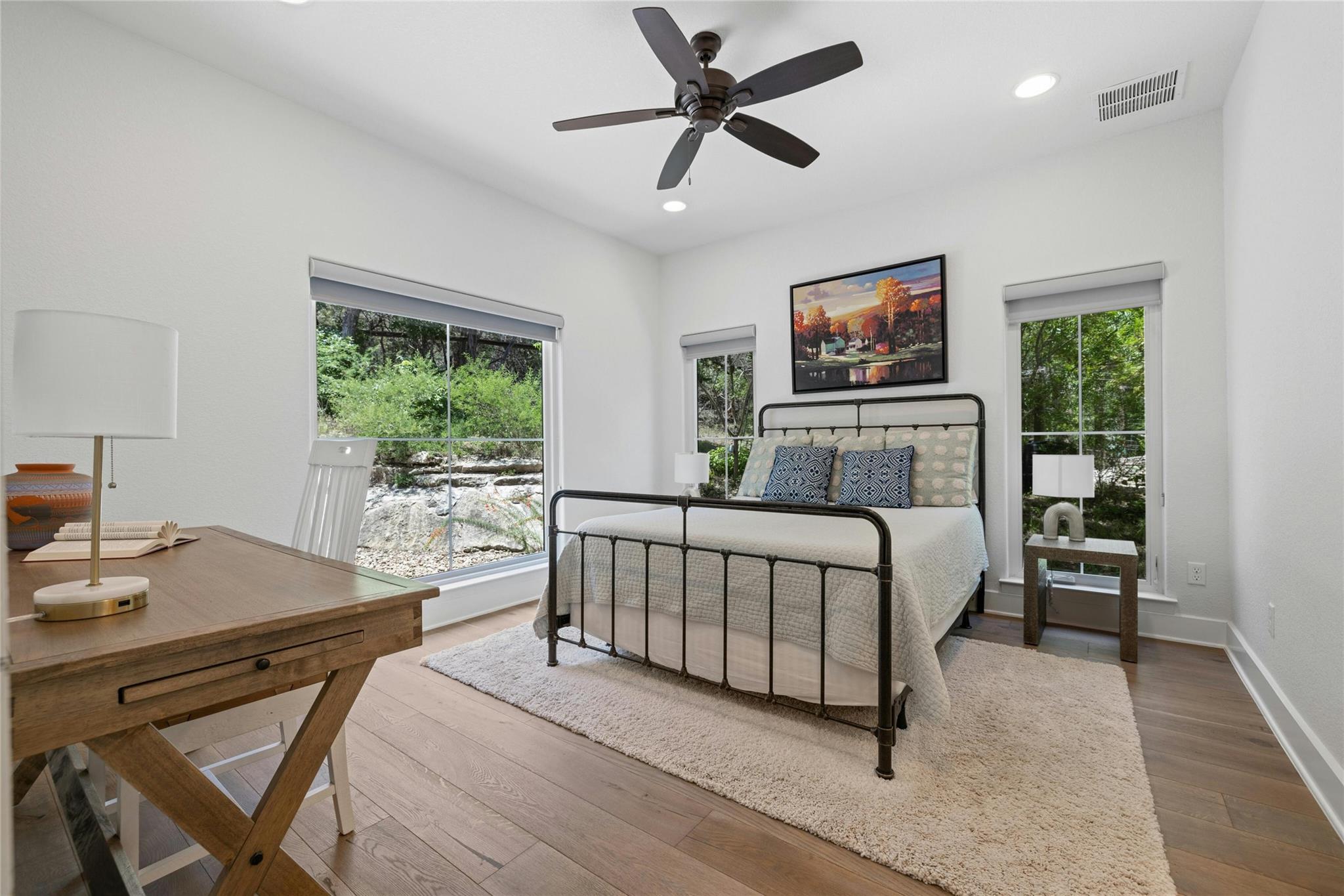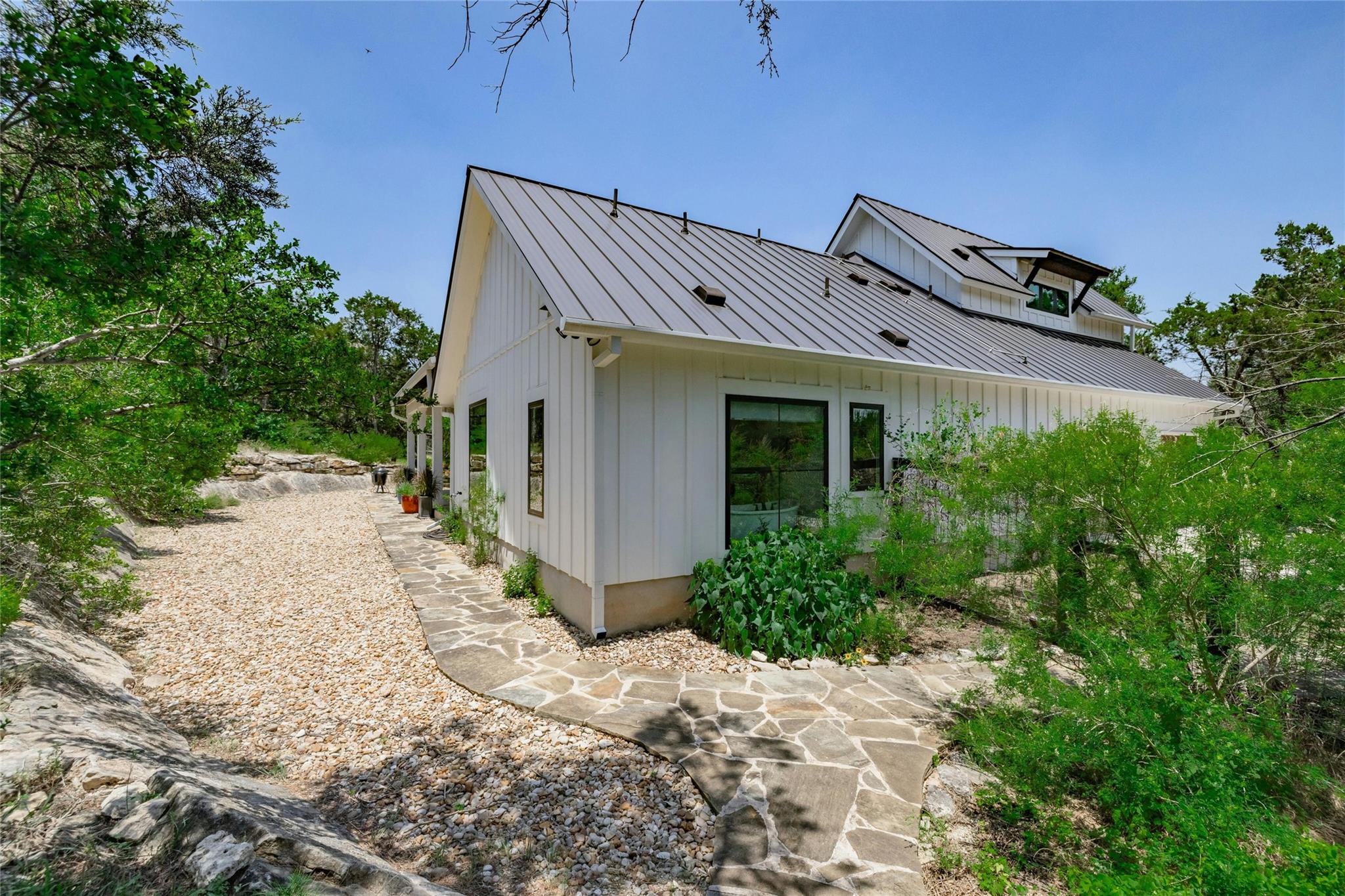 Embrace idyllic Hill Country living just south of Austin in this exceptional and rare Bear Creek home. Only minutes from downtown Austin, this property combines the desirable Dripping Springs school district with a low tax rate. Situated on a 2.32-acre plot with an adjacent 2.01-acre tract, this custom-built home with an open floor plan is an entertainer's dream. The home features a wonderful layout with high ceilings, an open kitchen, 5 bedrooms, 4 full bathrooms, 1 half bathroom, a foyer, a dining room, and more. Enjoy views of the Hill Country and a peaceful wet-weather creek from your front porch, or spend time in the backyard or under the covered patio. The two spacious gardens are perfect for growing vegetables, herbs, or beautiful flowers. The home is also outfitted with a solar panel system, keeping electric bills low. Additionally, this property is one of the few homes in Bear Creek with city water on the West Travis County PUA. The separate and adjacent lot provides extra privacy or potential for investment in the future. Immerse yourself in the tranquility of luxurious Hill Country living, just minutes from Austin.