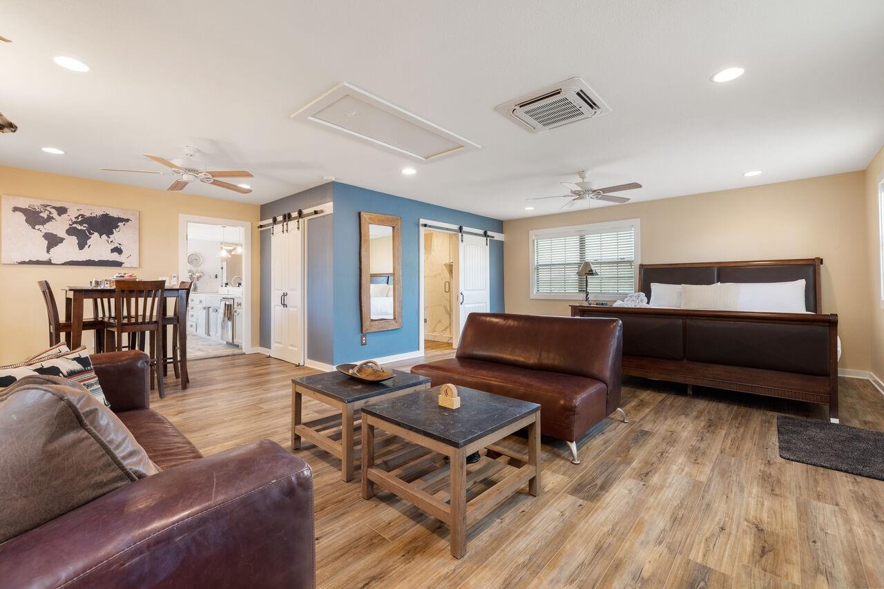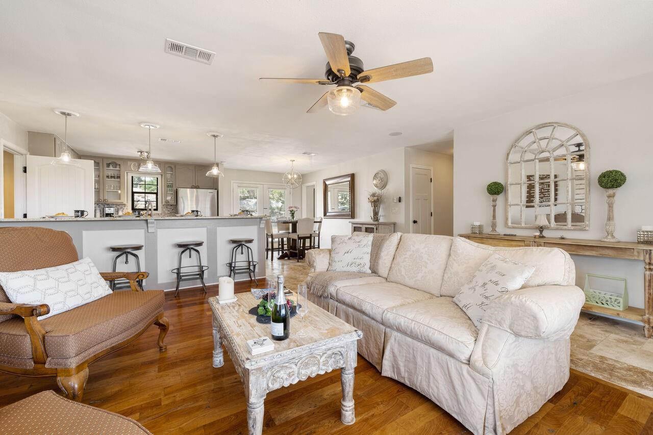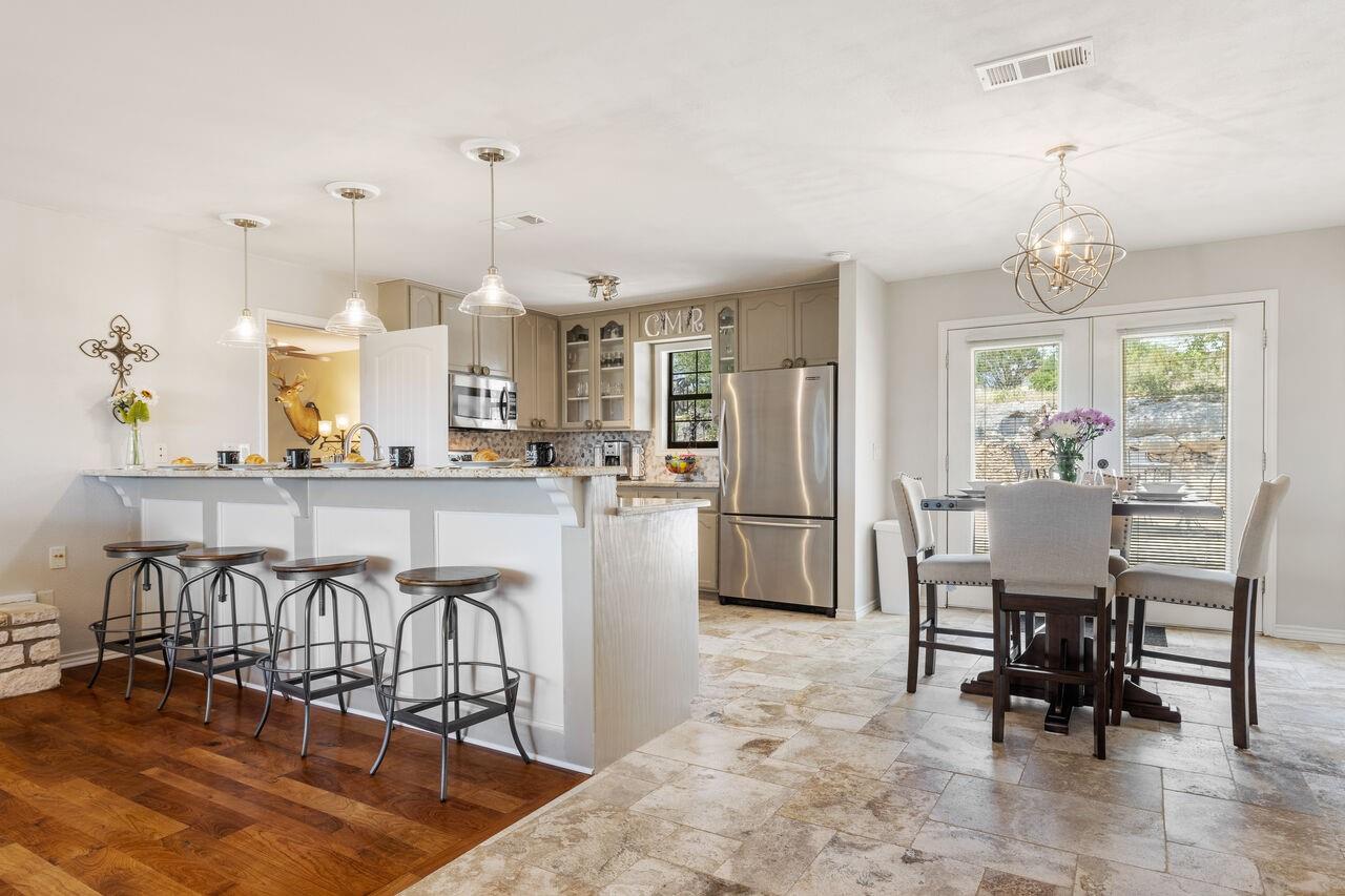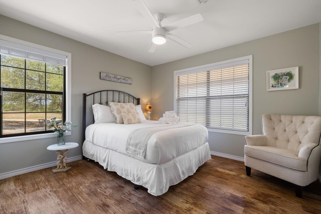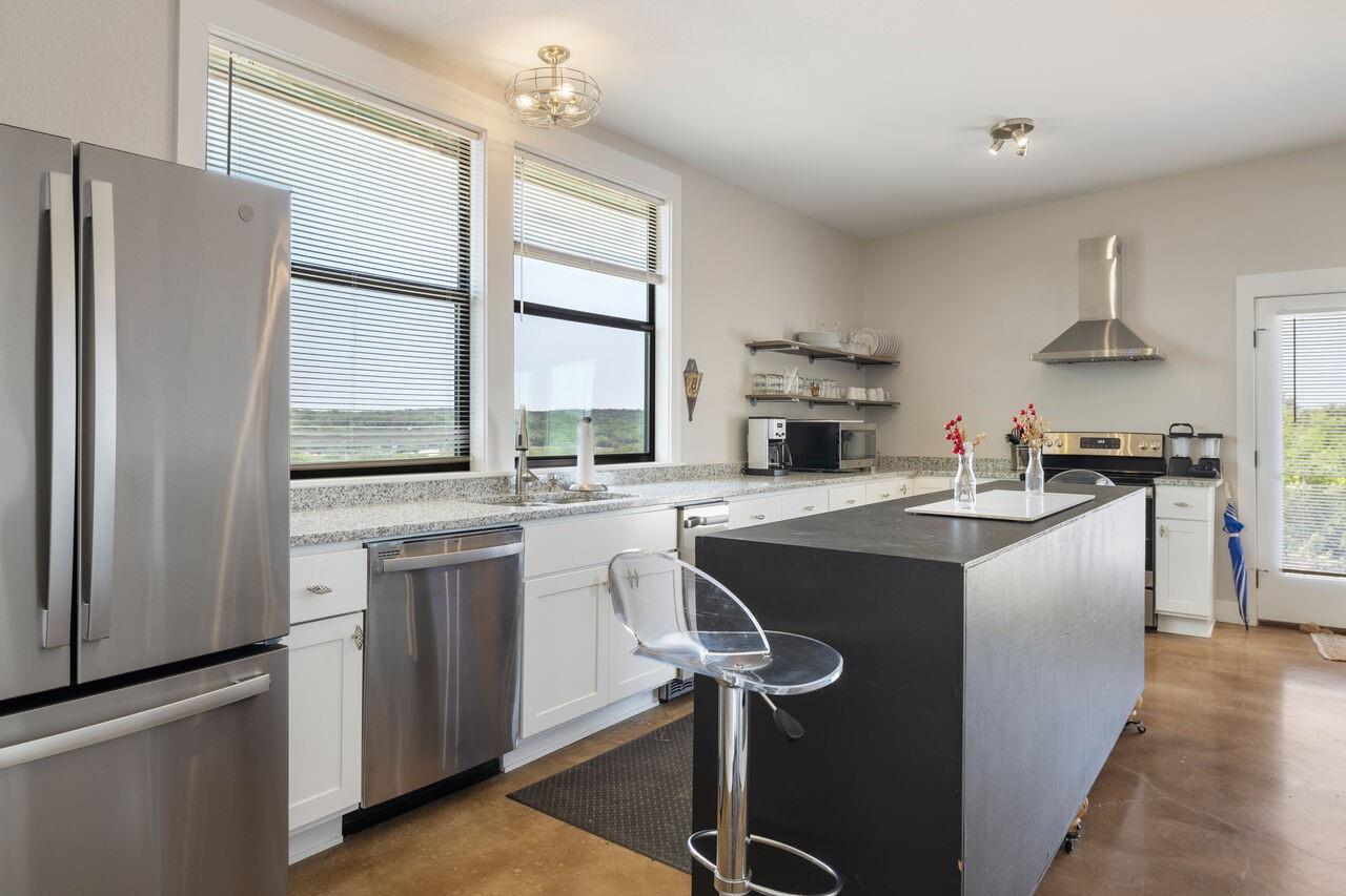 Welcome to your Hill Country oasis, a stunning 14+/- acre private property nestled atop a sprawling hilltop in the heart of the Hill Country Wine region. The Ranch House is a remodeled 2,000 sqft home, with 4 bedrooms and 3 full baths. With an expansive front porch and private side and back patios, it provides the perfect setting for peaceful moments or lively gatherings. Inside, discover modern amenities such as a kitchen breakfast bar, all-new stainless steel appliances, and a wood-burning stone fireplace in the spacious living room. For larger groups, The Lodge offers a newly constructed 2,500 sqft home. Featuring 6 large bedrooms and 4 bathrooms, this residence is designed to provide individual privacy within a communal atmosphere. Enjoy the open kitchen/dining/living room area, complete with new stainless steel appliances. Expansive front and back porches offer direct access from each bedroom, while a Fire Suppression system ensures safety and peace of mind. Entertain in style at the Amenity Barn, a versatile space perfect for both indoor and outdoor gatherings. With 3,000 sqft of fully heated and air-conditioned interior space, this amenity barn features custom iron double French Doors that frame the stunning views. Elegant chandeliers, windmill ceiling fans, gabin walls, and polished stained concrete floors create an atmosphere of rustic charm. The amenity barn features a large space for gatherings, two flex rooms, a kitchen with a commercial ice maker, and a laundry room. Two full baths with walk-in showers add convenience, while the expansive covered front porch provides a breathtaking backdrop for sunset gatherings and social events. The property is equipped with a 63,000-gallon Rainwater Collection Tank, ensuring ample water for all buildings, alongside 3 Septic Systems and a large storage barn for added convenience and future growth potential. Hamilton Ridge offers a truly exceptional Hill Country experience perfect for a family compound or retreat!