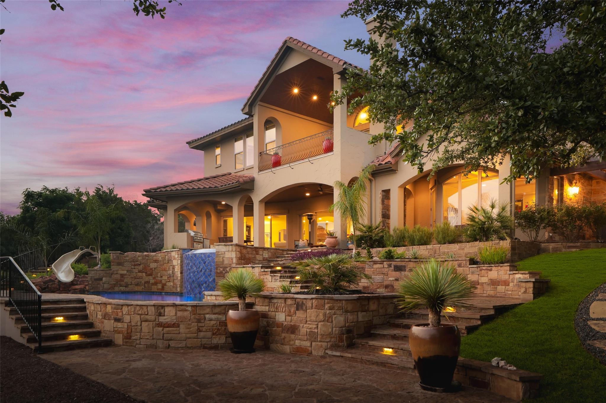 This unique Texas Hill Country home is situated on a breathtaking 2.075-acre property and offers stunning panoramic views of Lake Travis! The picturesque setting is perfect for those who appreciate the beauty of nature - all while being less than 30 minutes from Austin. The home features multiple outdoor living patios, allowing residents to enjoy the expansive views and relax while taking in the surrounding scenery. The sunset views from these outdoor spaces are particularly breathtaking, providing a serene and captivating experience. Inside the house, there are five spacious bedrooms and nine gorgeous bathrooms, offering ample space for comfortable living. The primary en-suite is designed with extravagance in mind, providing a luxurious retreat within the home. Featuring a garden tub overlooking a private courtyard, steam shower, and two large primary closets and mirrored dressing room. The attention to detail in the design and finishes enhances the overall experience - as if you’re in your very own spa! For entertainment purposes, the home includes a huge media room and bar, complete with Nuvo audio system and control panels throughout the house and outdoor living spaces - perfect for movie nights or hosting gatherings. Additionally, the custom-built three-car detached garage has been converted into a spacious entertaining area, complete with a kitchenette and a half bath. This versatile space can be used for various purposes, accommodating the needs of the homeowners and their guests. One of the highlights of the property is the outdoor pool and spa - offering multiple sunbathing areas, fire pit, outdoor kitchen and seating - allowing residents to relax and enjoy the beauty of their surroundings. Close proximity to large acreage preserve that limits future building in the immediate area, as well as Volente Beach and the longest zipline in Texas and Riviera Marina right across the street - you won’t want to miss this remarkable property!