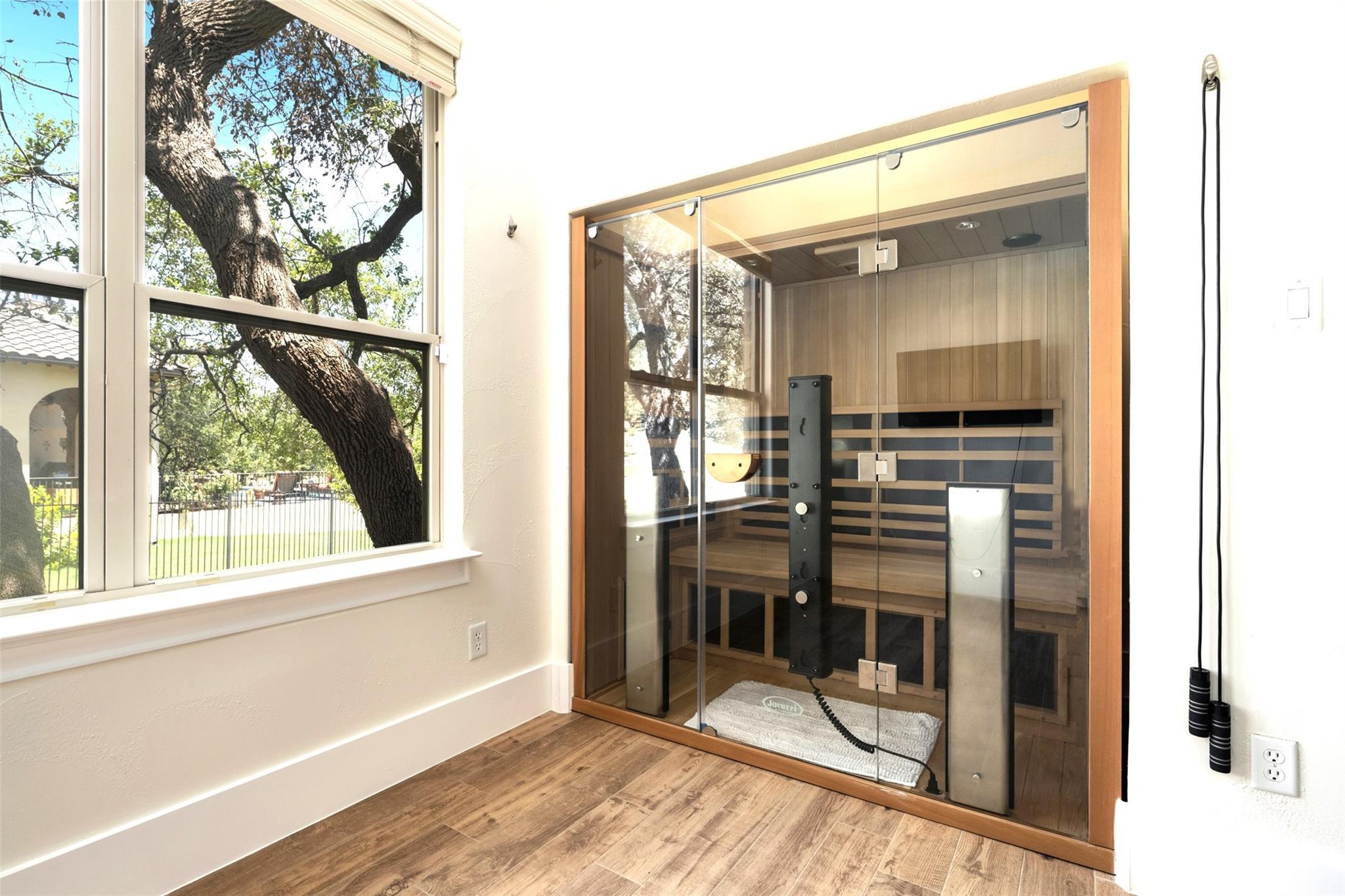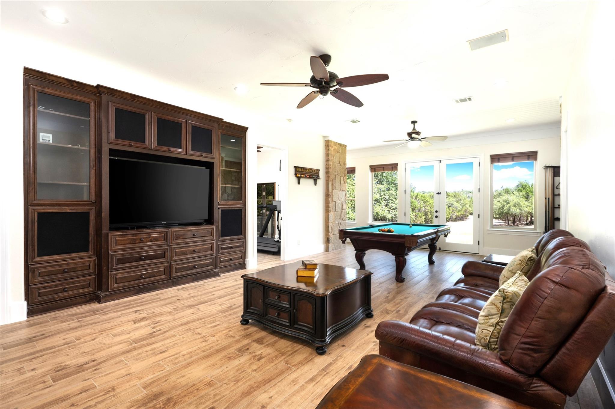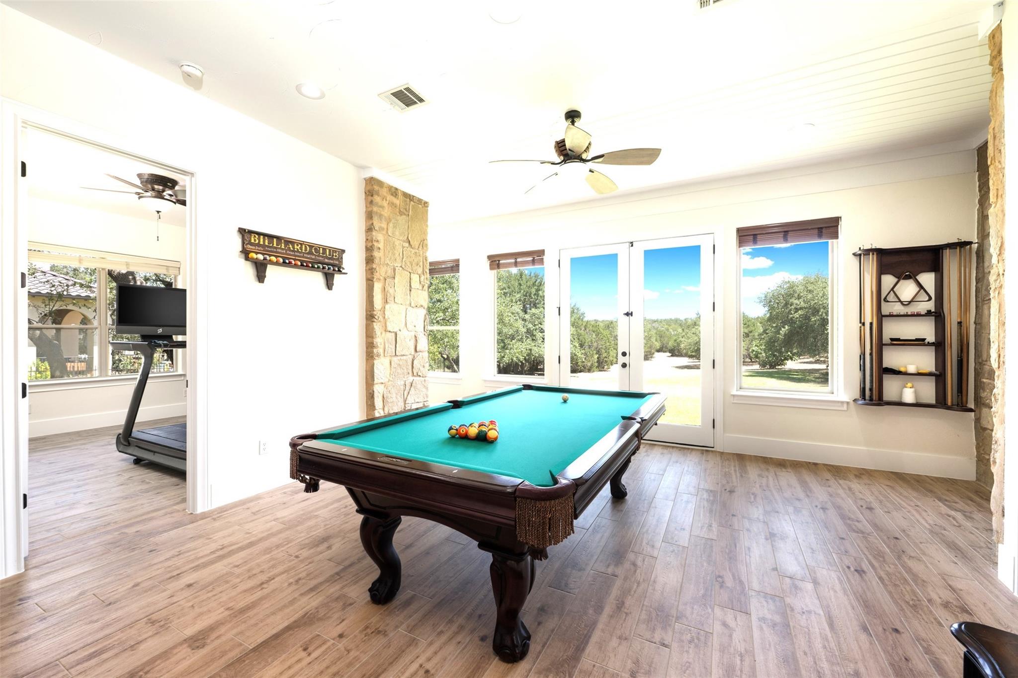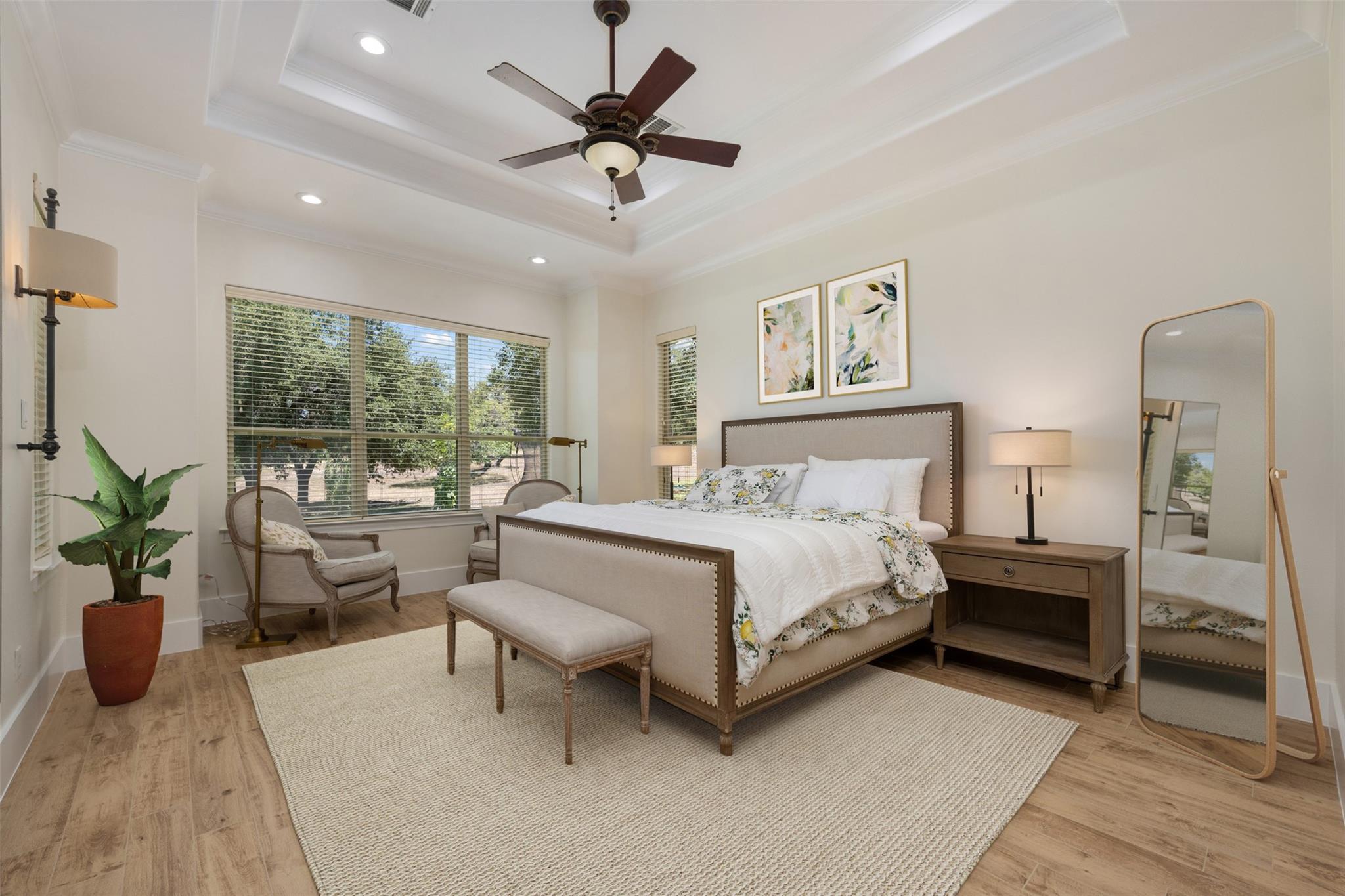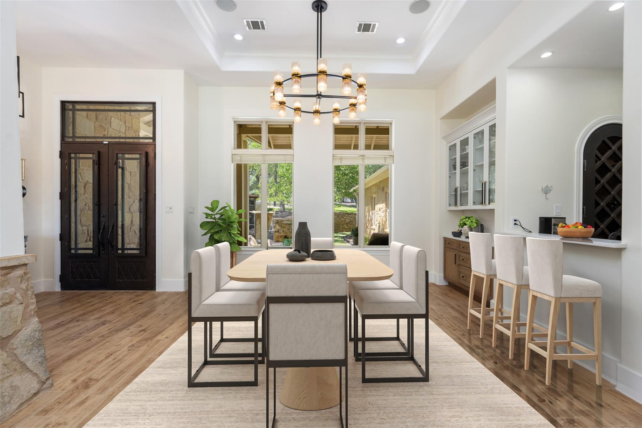 Single Story Stunner in Bee Creek Estates! Impeccable, updated Craftsman-like 4/3.5/3 (& study) home is a Texas Hill Country family and entertainer’s dream. No expense was spared on its update including 8†solid wood baseboards, wood-grain tile floors throughout, fabulous lighting, and designer cabinetry everywhere. The home flows seamlessly from dining, to living, to kitchen and breakfast area, all overlooking the huge and very private 1.6-acre lot. Enjoy warm conversations in front of the stunning stone fireplace & under lovely, coffered ceilings in the living area. Host a dinner for many or simply cook a small meal for a few while guests sip a drink prepared at the bar with its amazing wine room. The impressive kitchen touts quartzite counters, updated cabinets, fixtures, and hardware, plus a luxury appliance package. The inviting study can be the office of your dreams – light, airy, and private at the front of the home away from the flow of family living. Escape to the superb comfort of the owner’s retreat, featuring high tray ceilings, and relax in a pamper-ready bathroom with a walk-in shower, and oversized walk-in closet. Across the home are three more bedrooms, all centered around a huge game/media room. One bedroom with en suite bath could meet multigenerational needs. One bedroom has an installed sauna with a jack and jill bath. The giant game room has a pool table with the other half of the room being the media area with its oversized TV for movie nights, sports events, or video gaming. Garage has a commercial-grade vinyl floor. The home has its own well drilled 600 ft to an aquifer. A covered patio graces the rear of the home. A pool, spa, cabana, or even a casita could be added. Bee Creek Estates is a highly sought after upscale subdivision, gated and extremely private. It is in the renowned Lake Travis School District with easy access to major roads, shopping, dining, health care, Lake Travis, marinas, greater Austin, and the Texas Hill Country.