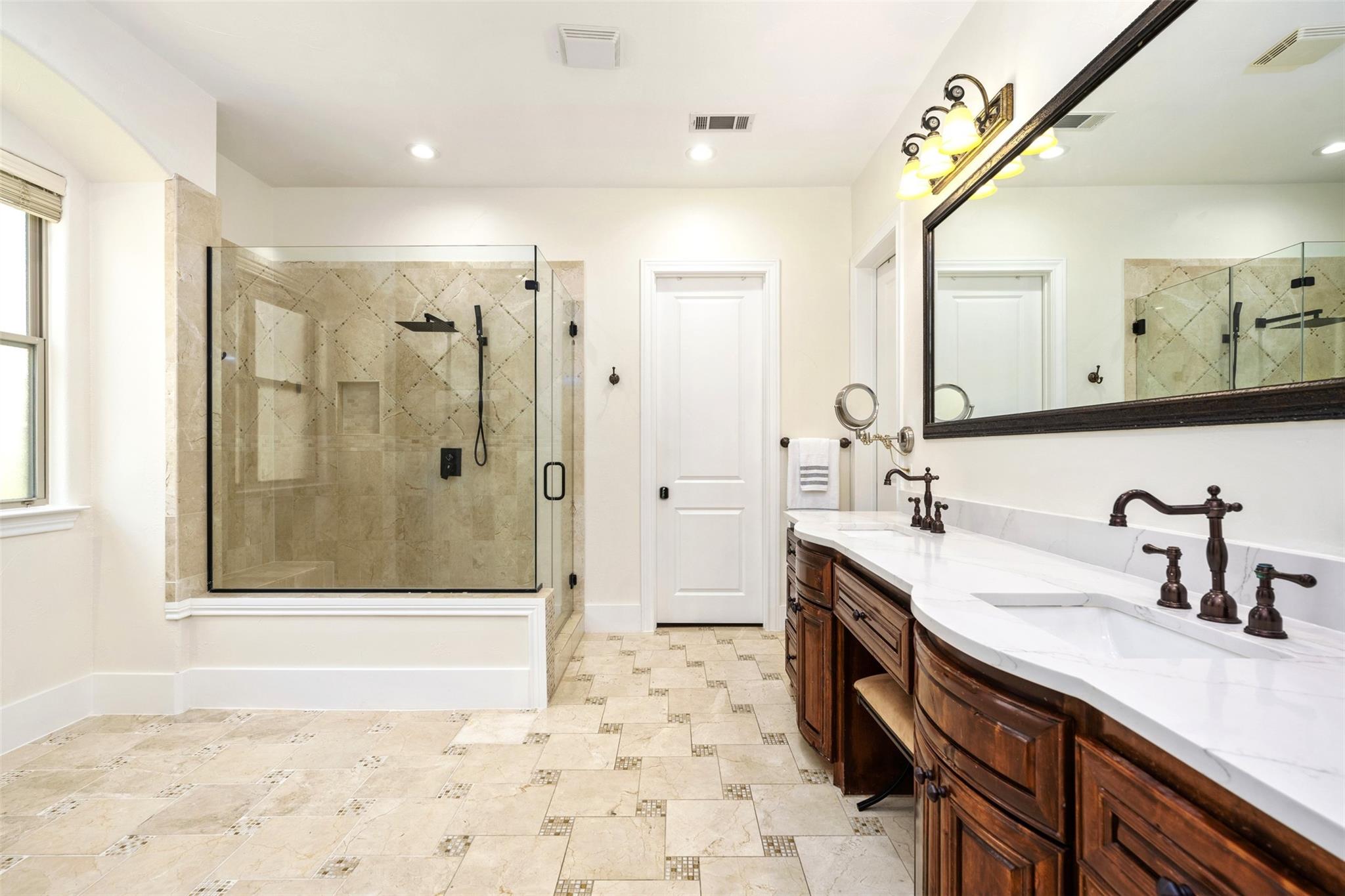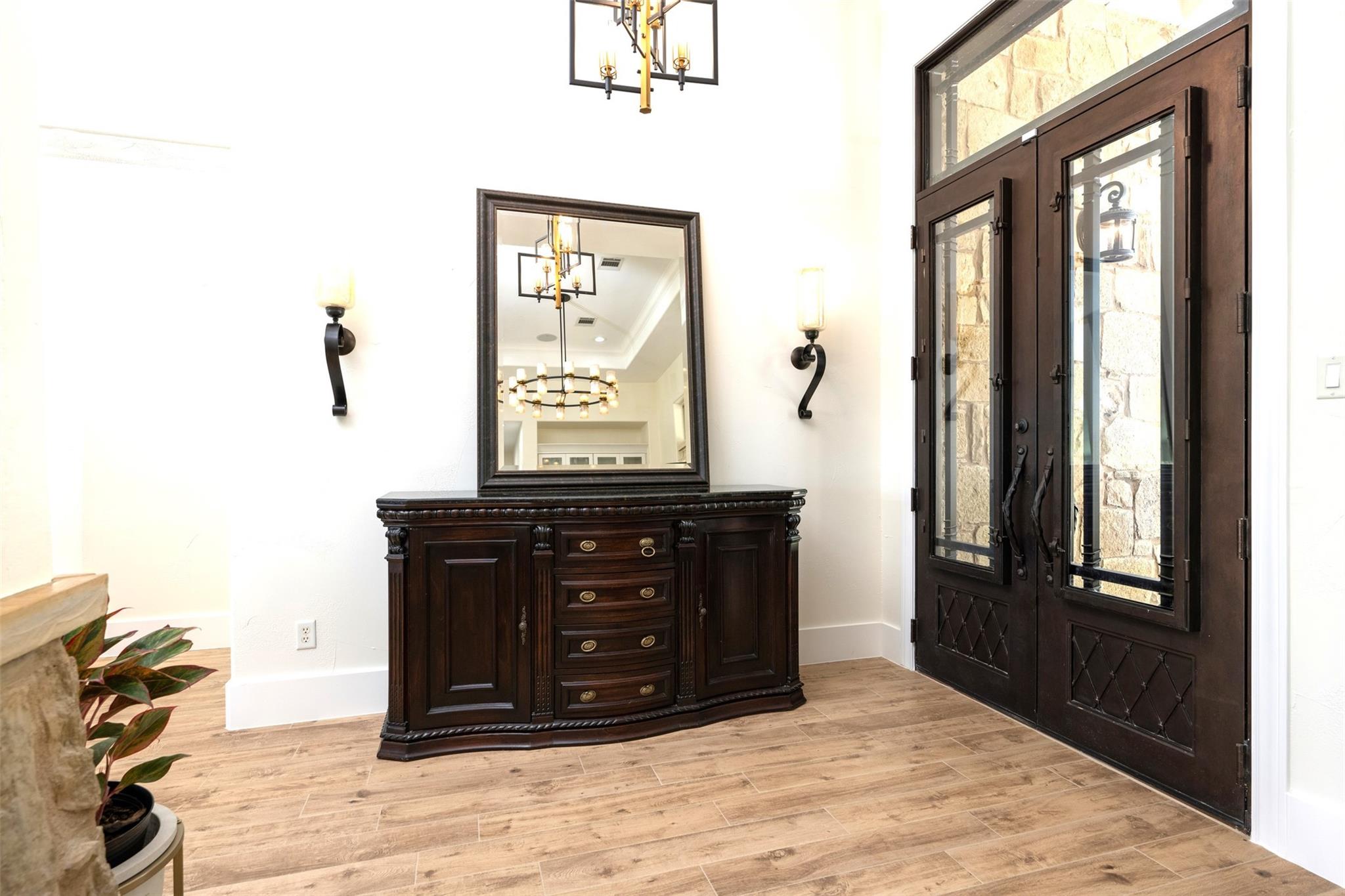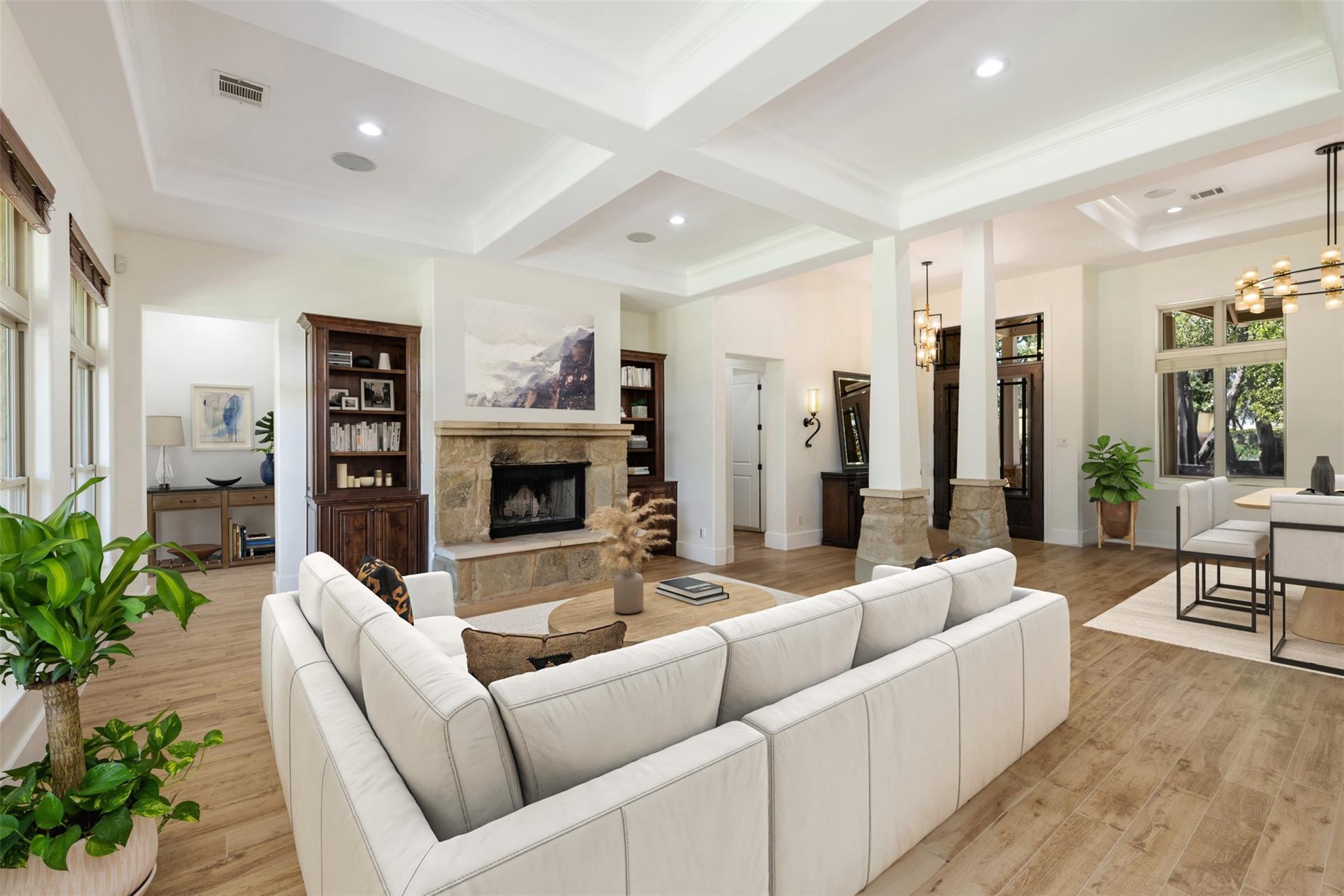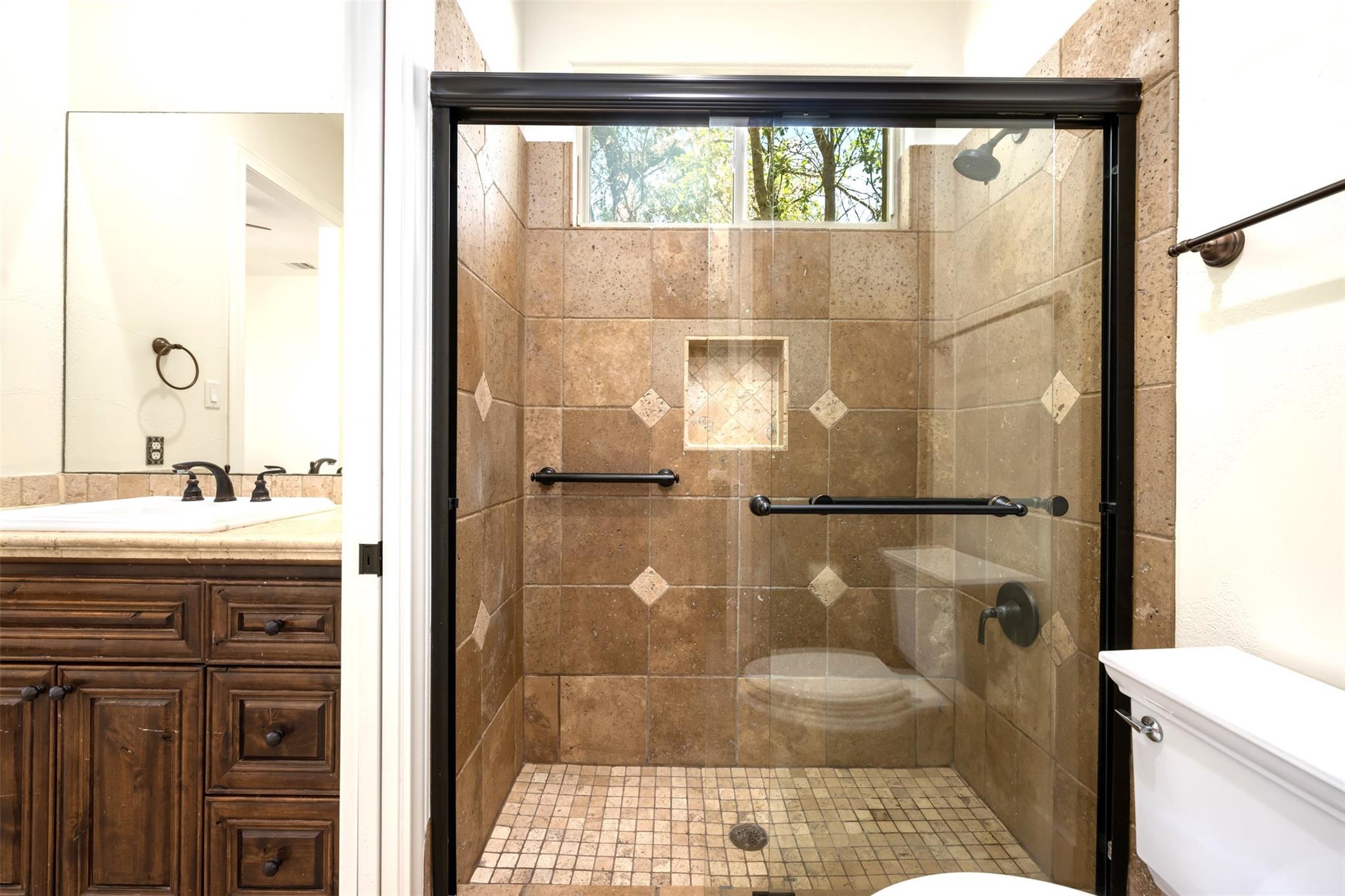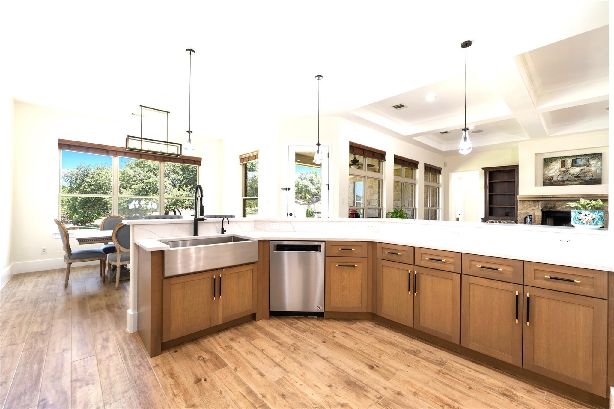Single Story Stunner in Bee Creek Estates! Impeccable, updated Craftsman-like 4/3.5/3 (& study) home is a Texas Hill Country family and entertainer’s dream. No expense was spared on its update including 8†solid wood baseboards, wood-grain tile floors throughout, fabulous lighting, and designer cabinetry everywhere. The home flows seamlessly from dining, to living, to kitchen and breakfast area, all overlooking the huge and very private 1.6-acre lot. Enjoy warm conversations in front of the stunning stone fireplace & under lovely, coffered ceilings in the living area. Host a dinner for many or simply cook a small meal for a few while guests sip a drink prepared at the bar with its amazing wine room. The impressive kitchen touts quartzite counters, updated cabinets, fixtures, and hardware, plus a luxury appliance package. The inviting study can be the office of your dreams – light, airy, and private at the front of the home away from the flow of family living. Escape to the superb comfort of the owner’s retreat, featuring high tray ceilings, and relax in a pamper-ready bathroom with a walk-in shower, and oversized walk-in closet. Across the home are three more bedrooms, all centered around a huge game/media room. One bedroom with en suite bath could meet multigenerational needs. One bedroom has an installed sauna with a jack and jill bath. The giant game room has a pool table with the other half of the room being the media area with its oversized TV for movie nights, sports events, or video gaming. Garage has a commercial-grade vinyl floor. The home has its own well drilled 600 ft to an aquifer. A covered patio graces the rear of the home. A pool, spa, cabana, or even a casita could be added. Bee Creek Estates is a highly sought after upscale subdivision, gated and extremely private. It is in the renowned Lake Travis School District with easy access to major roads, shopping, dining, health care, Lake Travis, marinas, greater Austin, and the Texas Hill Country.