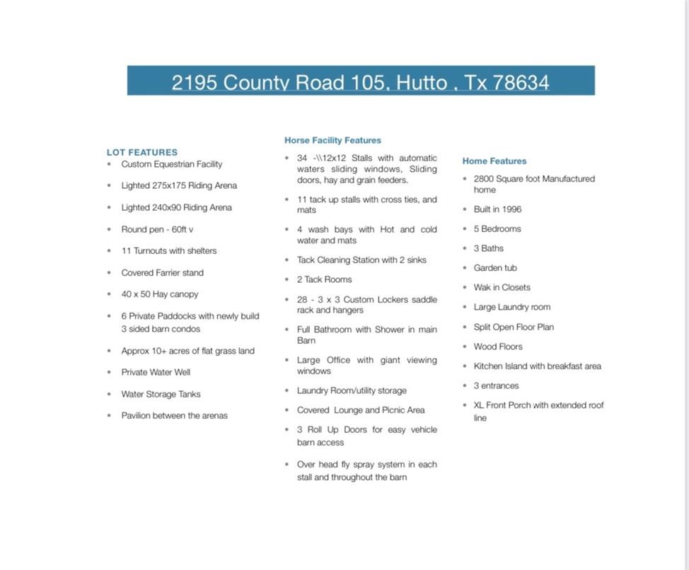 Booming development location! Available for Commercial use! This Incredible 25 acre Equestrian property has everything a horse enthusiast could dream of and more. Lots of thought was put into the lay out and the functionality of this facility and the comfort of its equine residents. Featuring a magnificent 17,000+ sq ft barn, 34 stalls with automatic watering system, 11 turn outs, 6 private paddocks, 2 lighted arenas, Round Pen, a giant air conditioned office, and so much more. Spoil your horse on 4 acres of trails with large mature shade trees, along a seasonal creek. The 5 bedroom, 3 bath manufactured home offers a spilt floor plan. Enjoy the stunning sunsets from its giant front porch. This property is a great investment or homestead. There is plenty of un utilized acreage to make this place your own. Including multiple home sight to build your forever dream home. If you are looking for country living at its best, look no further. This amazing income producing property has endless possibilities. Conveniently located just 25 minutes north east of Austin. With easy access from the 130 toll, where you’ll find dining, shopping, and entertainment. Currently the owner is running a successful full care hunter Jumper/ Dressage boarding and training facility and a turn key option is available. Light deed restrictions. Agriculture exception available. Schedule your showing of this exceptional property today.