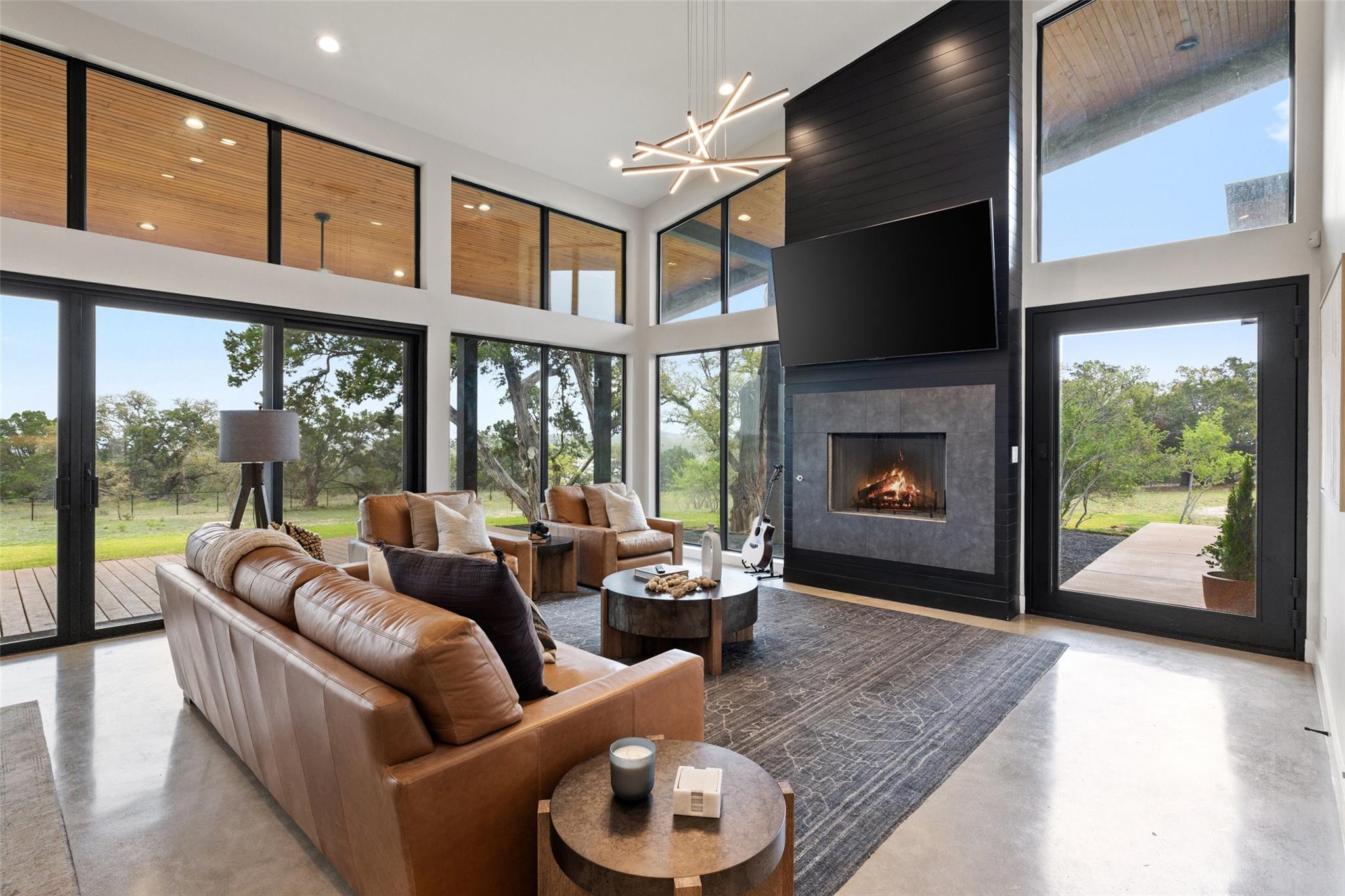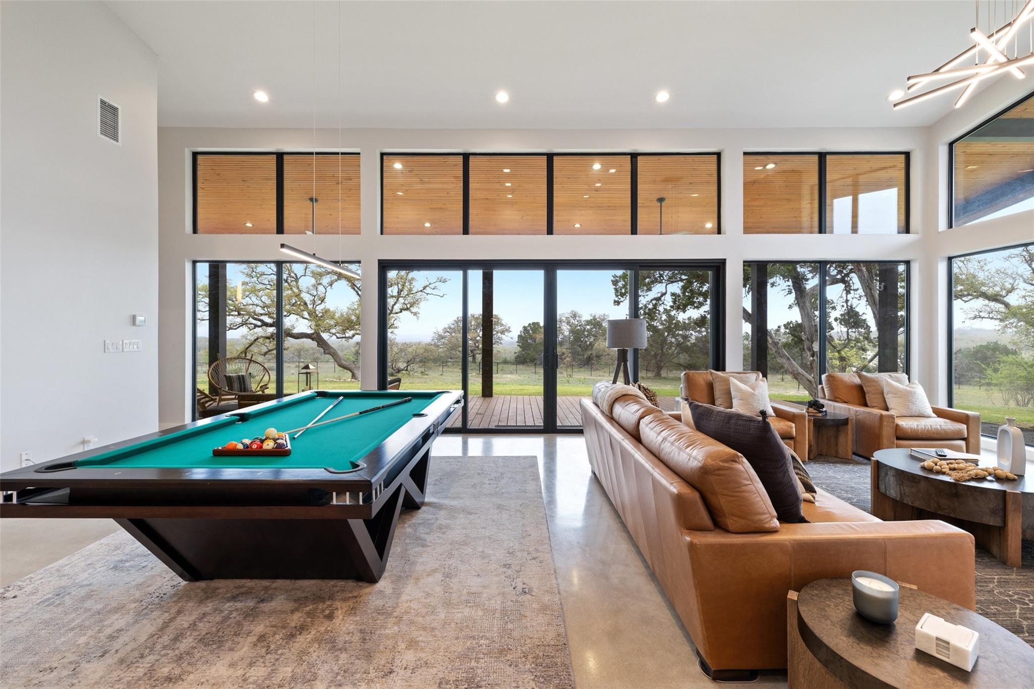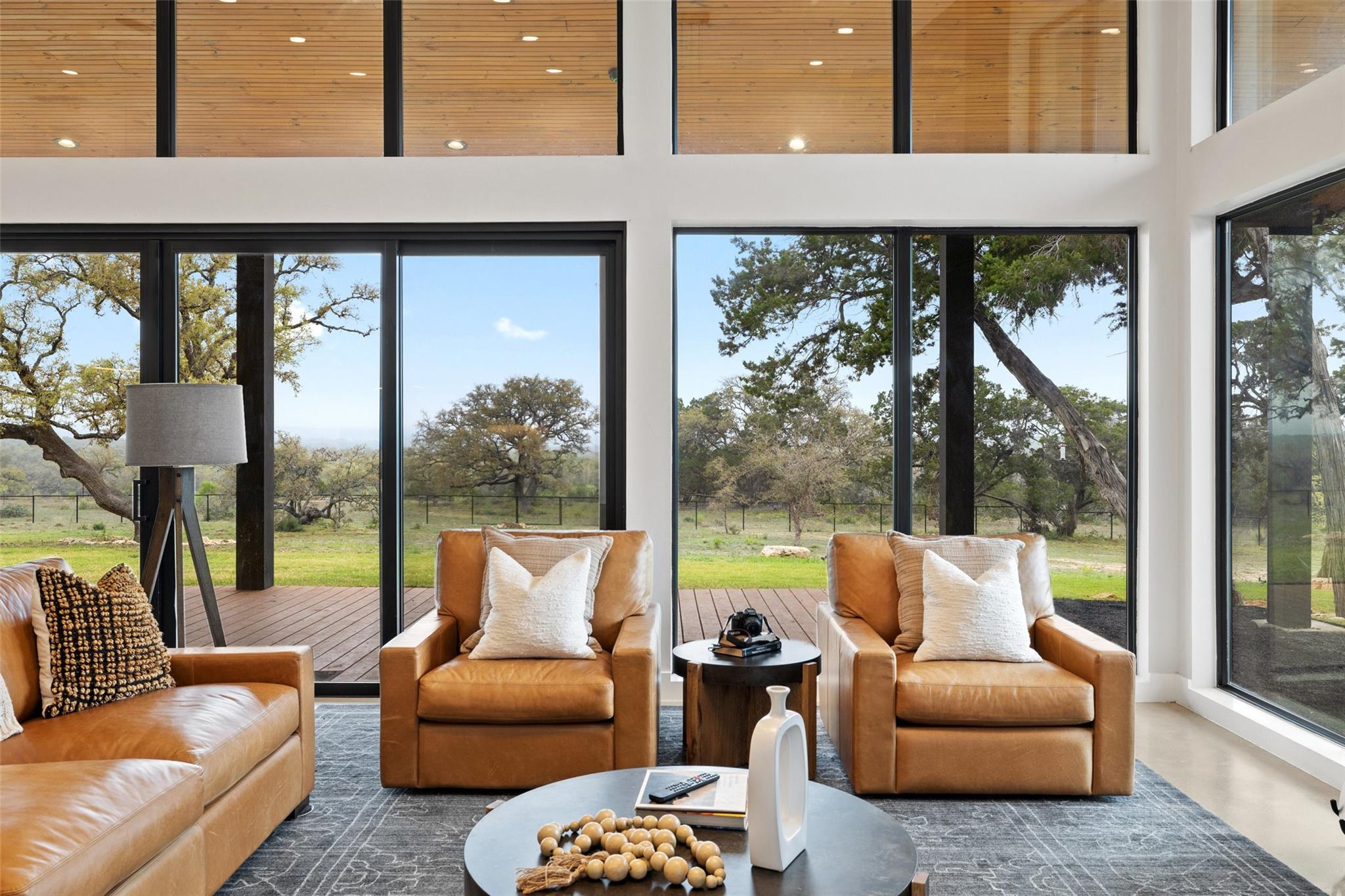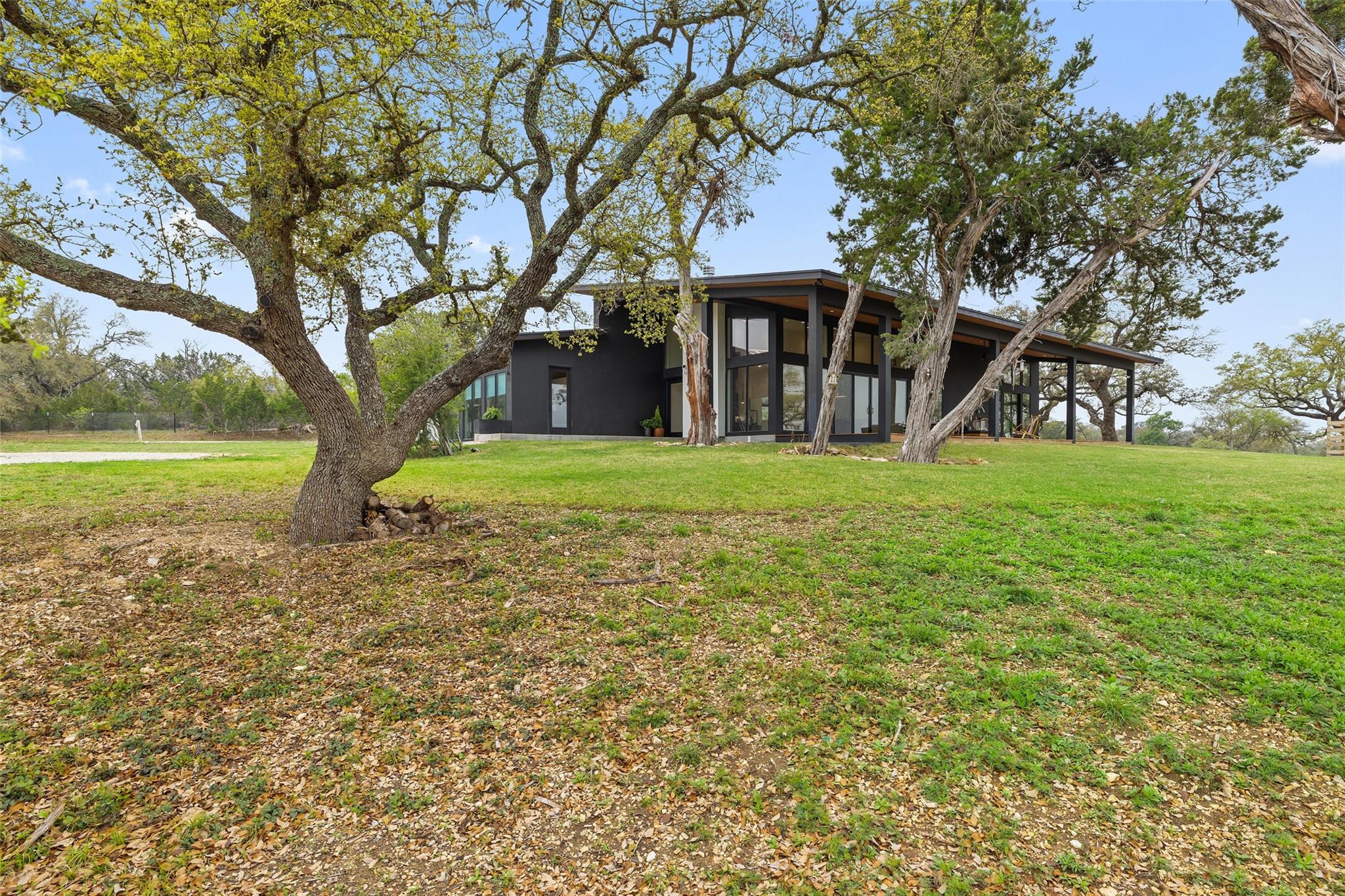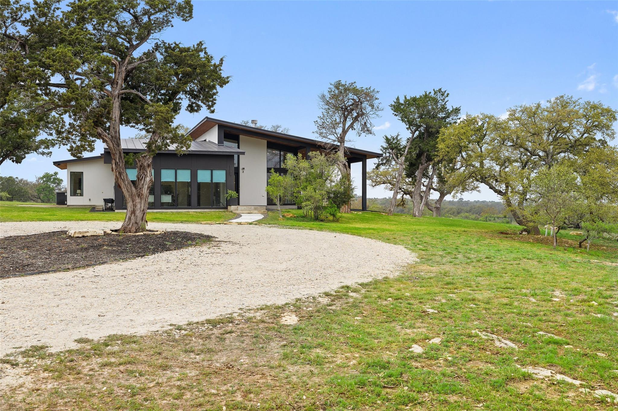 Come walk through this luxurious contemporary home in the fantastic Texas Hill Country. This beautiful home sits on 10.25 acres with extravagant hill country panoramic views. Built by the exceptional Dynamic Custom homes and featuring Oscar Flores Design, this home boasts fantastic craftsmanship with bright, natural light, clean lines, and abundant open floor space. The timeless and elegant detail and flawlessly designed bring joy and excitement from any perspective. This dream kitchen features an oversized kitchen island, ample countertop space, and exceptional gas stove that opens to both the dining and living rooms for both culinary enthusiasts and those who appreciate entertaining. Throughout the house, custom light fixtures add a touch of elegance and uniqueness bringing a sophistication to the residence, creating a captivating ambiance that complements the modern aesthetic. The primary suite is a sanctuary of comfort featuring a large walking shower and access to the exterior patio. Just outside is a huge, covered patio overlooking the Hill Country. Additionally, the home has a two-car detached garage. There is no better place within the Texas Hill Country to call home. Schedule your private tour of this home today! 9 Acres Ag Exempt!