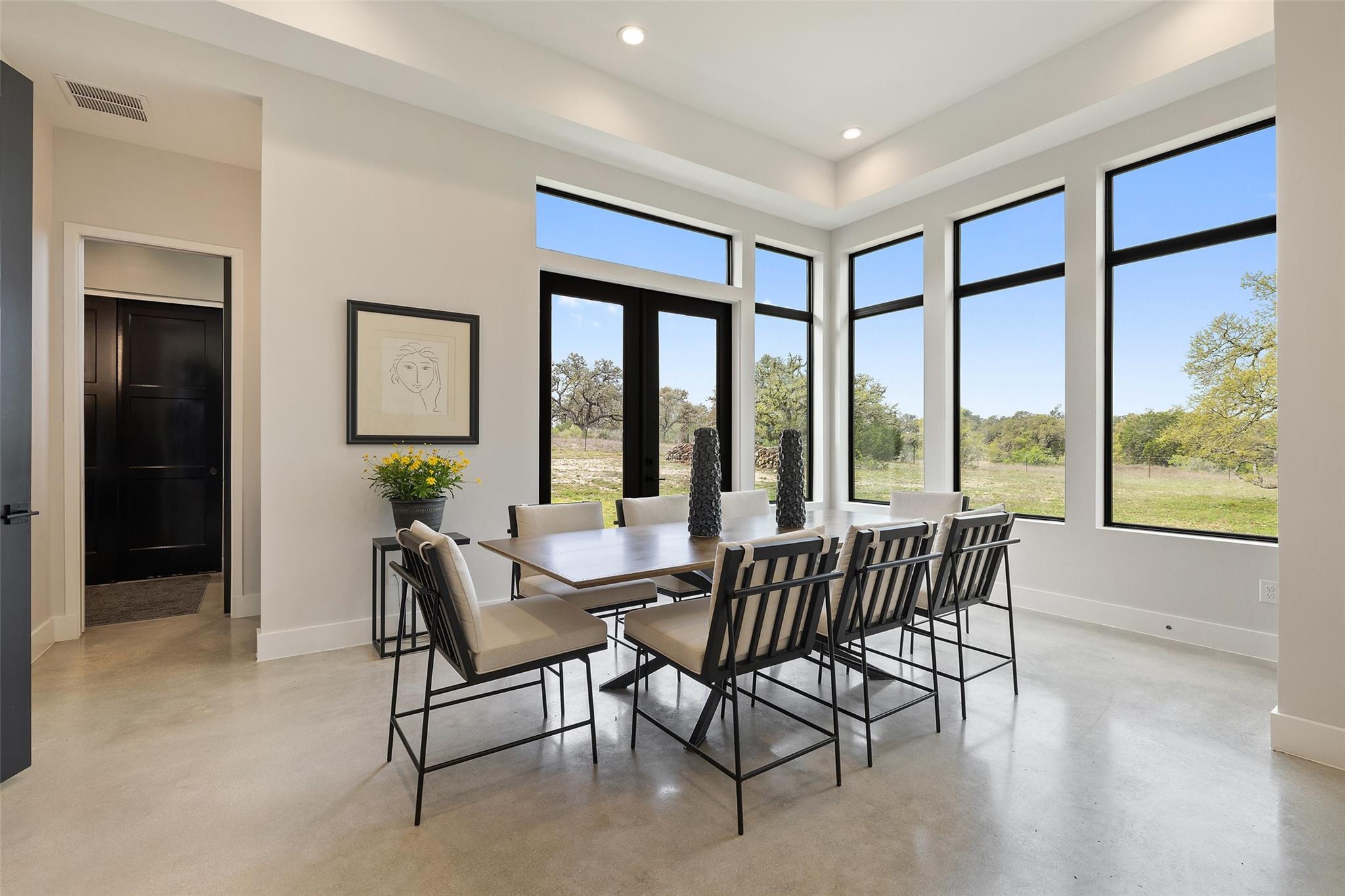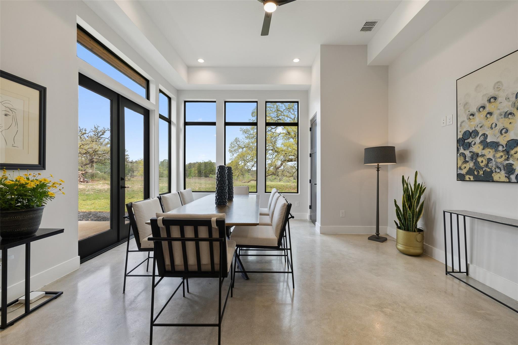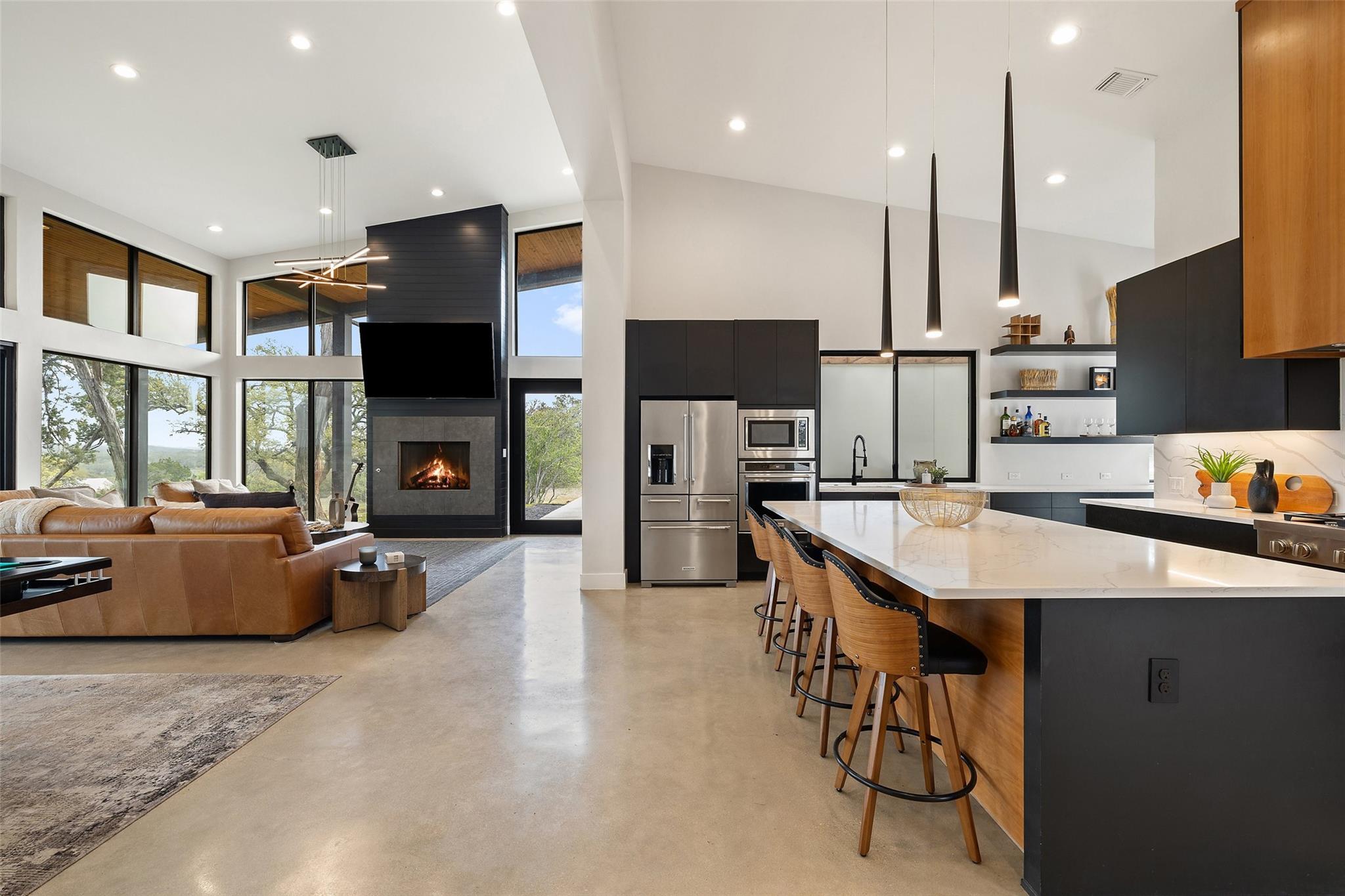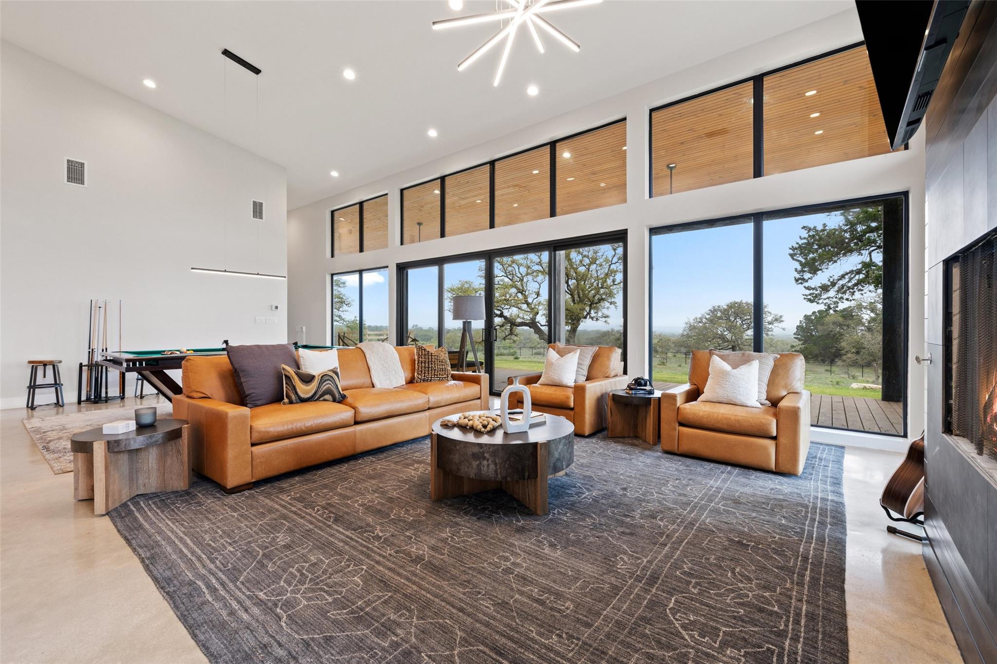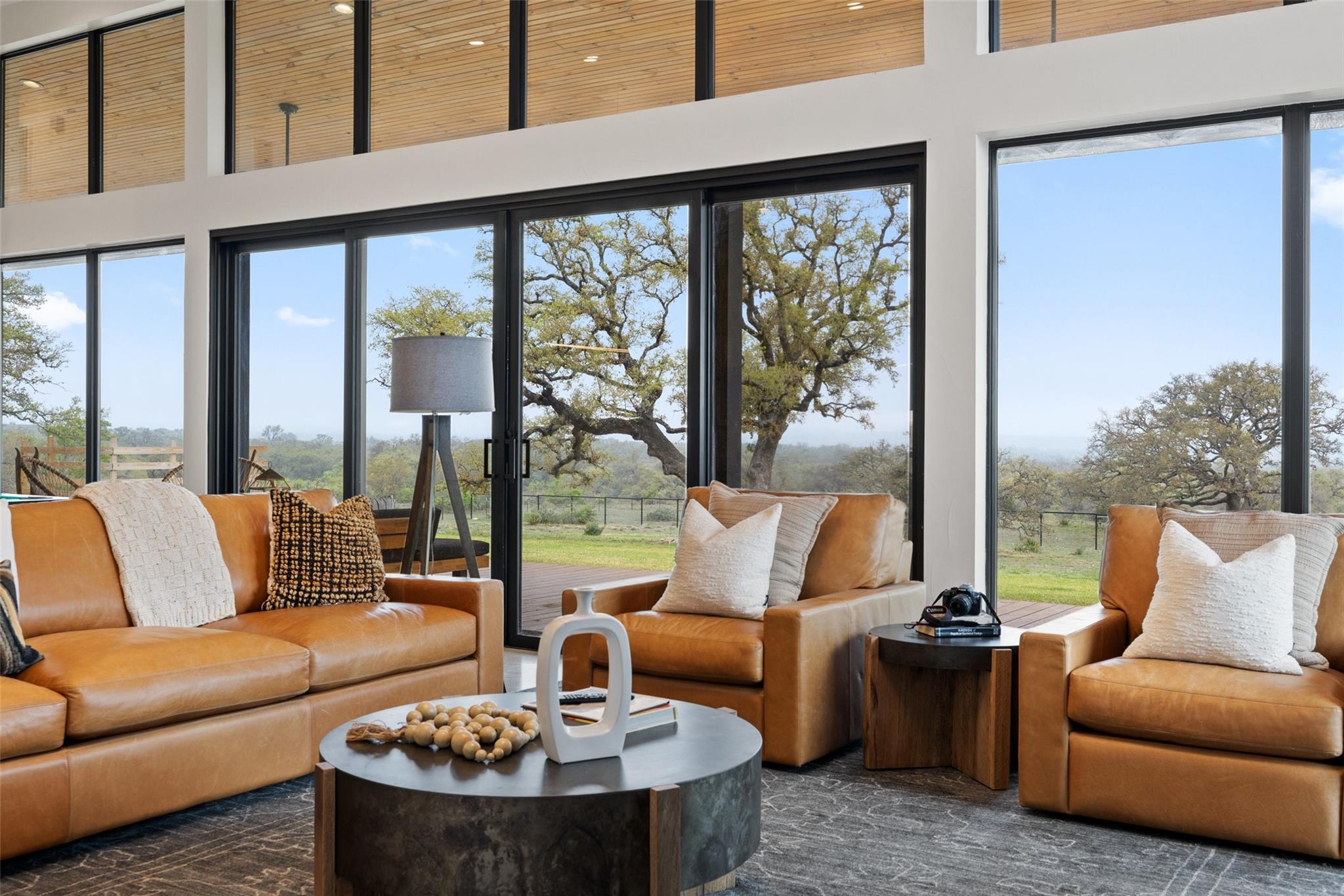Come walk through this luxurious contemporary home in the fantastic Texas Hill Country. This beautiful home sits on 10.25 acres with extravagant hill country panoramic views. Built by the exceptional Dynamic Custom homes and featuring Oscar Flores Design, this home boasts fantastic craftsmanship with bright, natural light, clean lines, and abundant open floor space. The timeless and elegant detail and flawlessly designed bring joy and excitement from any perspective. This dream kitchen features an oversized kitchen island, ample countertop space, and exceptional gas stove that opens to both the dining and living rooms for both culinary enthusiasts and those who appreciate entertaining. Throughout the house, custom light fixtures add a touch of elegance and uniqueness bringing a sophistication to the residence, creating a captivating ambiance that complements the modern aesthetic. The primary suite is a sanctuary of comfort featuring a large walking shower and access to the exterior patio. Just outside is a huge, covered patio overlooking the Hill Country. Additionally, the home has a two-car detached garage. There is no better place within the Texas Hill Country to call home. Schedule your private tour of this home today! 9 Acres Ag Exempt!