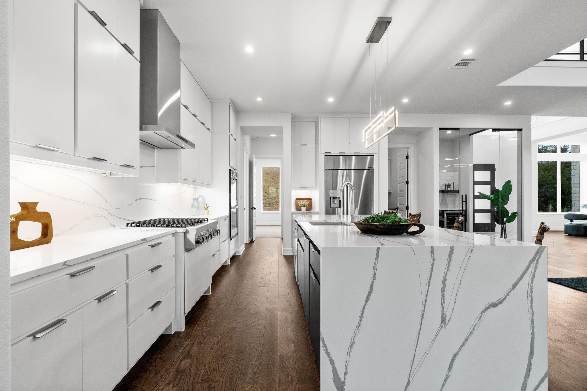 Take advantage of the benefits of a custom home, without the headache of building it yourself, and get it at a lower cost than it would take to build the home today! Nestled in the prestigious gated community of Creek's Edge, 6304 Caudill Ln, Austin, TX, unveils an unparalleled lifestyle on a private 1.7-acre lot with direct access to the serene Little Barton Creek. Boasting 5710 sqft of luxury, this brand-new custom home is a testament to meticulous craftsmanship and thoughtful design. A grand entrance sets the tone for the 5 bedrooms, 6 bathrooms, and a host of designer upgrades throughout. The chef's kitchen is a masterpiece, adorned with top-tier appliances and a walk-in pantry, ensuring culinary excellence. A dedicated office space provides a quiet retreat for work or study. Indulge in the luxury of a wine room, mudroom, and laundry room, all contributing to the seamless functionality of the home. The primary bedroom, located on the first floor, features a spa-like en-suite bath, complete with a large closet for added convenience. An additional guest suite downstairs offers privacy and comfort. Experience the epitome of indoor/outdoor living with an entertainer's dream patio, complete with a fire pit, outdoor kitchen, and a pool bath for convenience. The hill country views provide a picturesque backdrop for gatherings, and a second-floor balcony adds an extra layer of charm. Entertainment reaches new heights with a dedicated media room, perfect for movie nights or streaming marathons. The attached climate-controlled garage ensures comfort year-round, while a detached 3-car garage provides ample storage and flexibility. The expansive lot allows for future additions, with the potential to create your oasis, including a pool and guest casita. Located just minutes from the Hill Country Galleria and offering quick access to local schools, this property seamlessly blends luxury, privacy, and convenience. Be the first to call this masterpiece home.