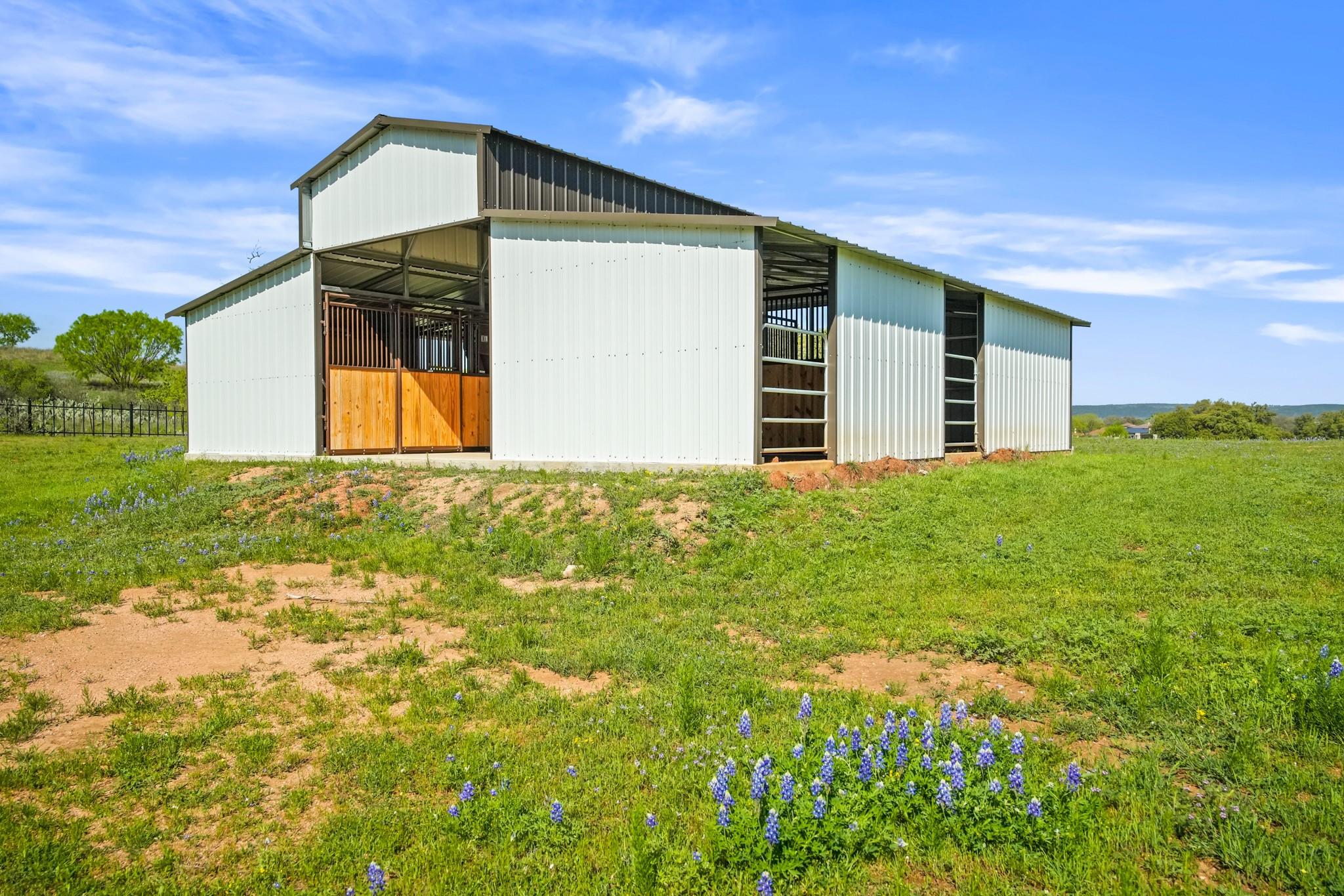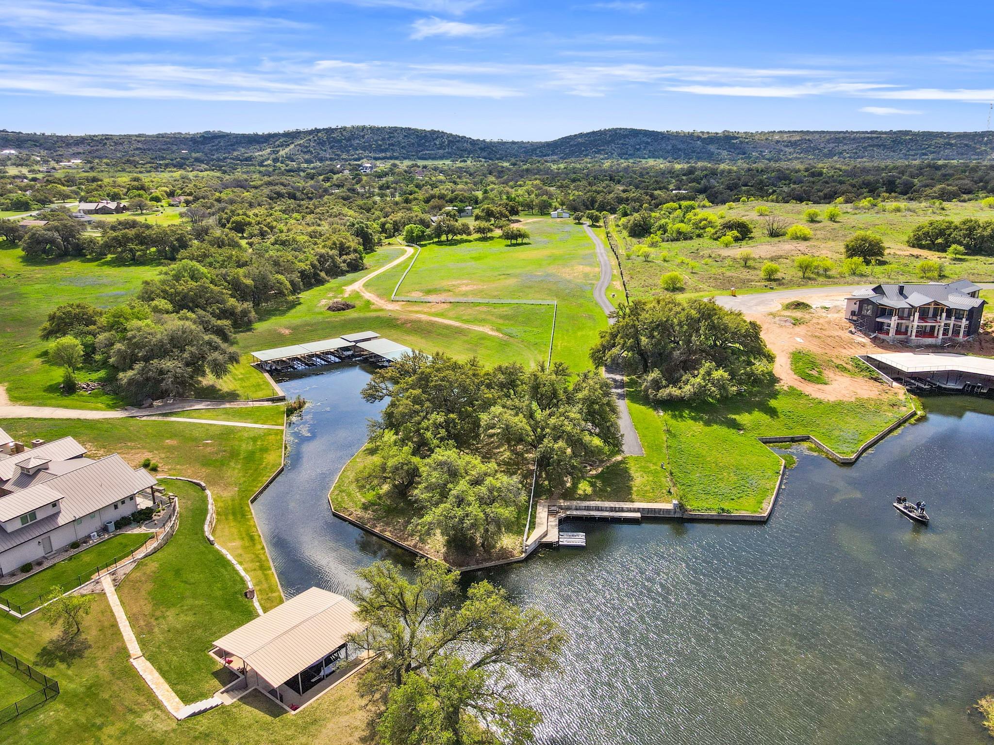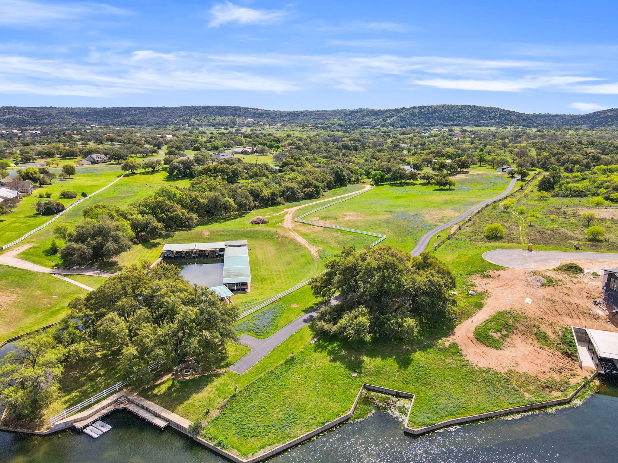 Luxurious Lakefront Horse Ranch Retreat! Nestled on the tranquil shores of Lake LBJ, this breathtaking Gated 20-acre +/- estate offers an unparalleled blend of luxury living and equestrian paradise. Boasting stunning Lake and Hill Country views, this meticulously crafted property is a haven for those seeking ultimate serenity and sophistication. Key Features: Custom-built 2 Bedroom/1-Bath Stone/Brick/Hardiplank Home with High Ceilings, Stained Concrete Flooring, Leathered Granite Countertops, Stainless Steel Appliances and Custom Wrap-Around Patio with Fireplace! Newer 4 Stall Horse Barn with Tack Rooms and Electric! Perfect for Equestrian Enthusiasts and Horse Lovers! Newer Insulated Workshop with Electric, Ideal for Hobbyists or Those Needing Additional Workspace! 2 Ponds and Partially Cleared/Partially Wooded Land! Tranquil Natural Beauty Surrounds the Propert!y! Two Slips in Community Marina...One for a Boat/One for Two Jetskis...comes with this Home! Easy Access to Enjoy Lake Activities and Waterfront Living! Mature Trees, Manicured Grounds with Bluebonnets and partial Sprinkler System. Enchanting Landscape Perfect for Outdoor Entertaining and Relaxation. Propane Tank and Security System Ensuring Safety and Convenience for Your Peace of Mind! With approximately 95 feet of Lakefront and a private dock with electric, every day is a lakeside retreat! Whether you're unwinding on the patio, exploring the vast grounds, or indulging in water sports, this property offers the ultimate in lakeside luxury. Don't miss the opportunity to experience this slice of paradise! Schedule your private showing today and discover the endless possibilities awaiting you at this remarkable Lake LBJ waterfront estate.