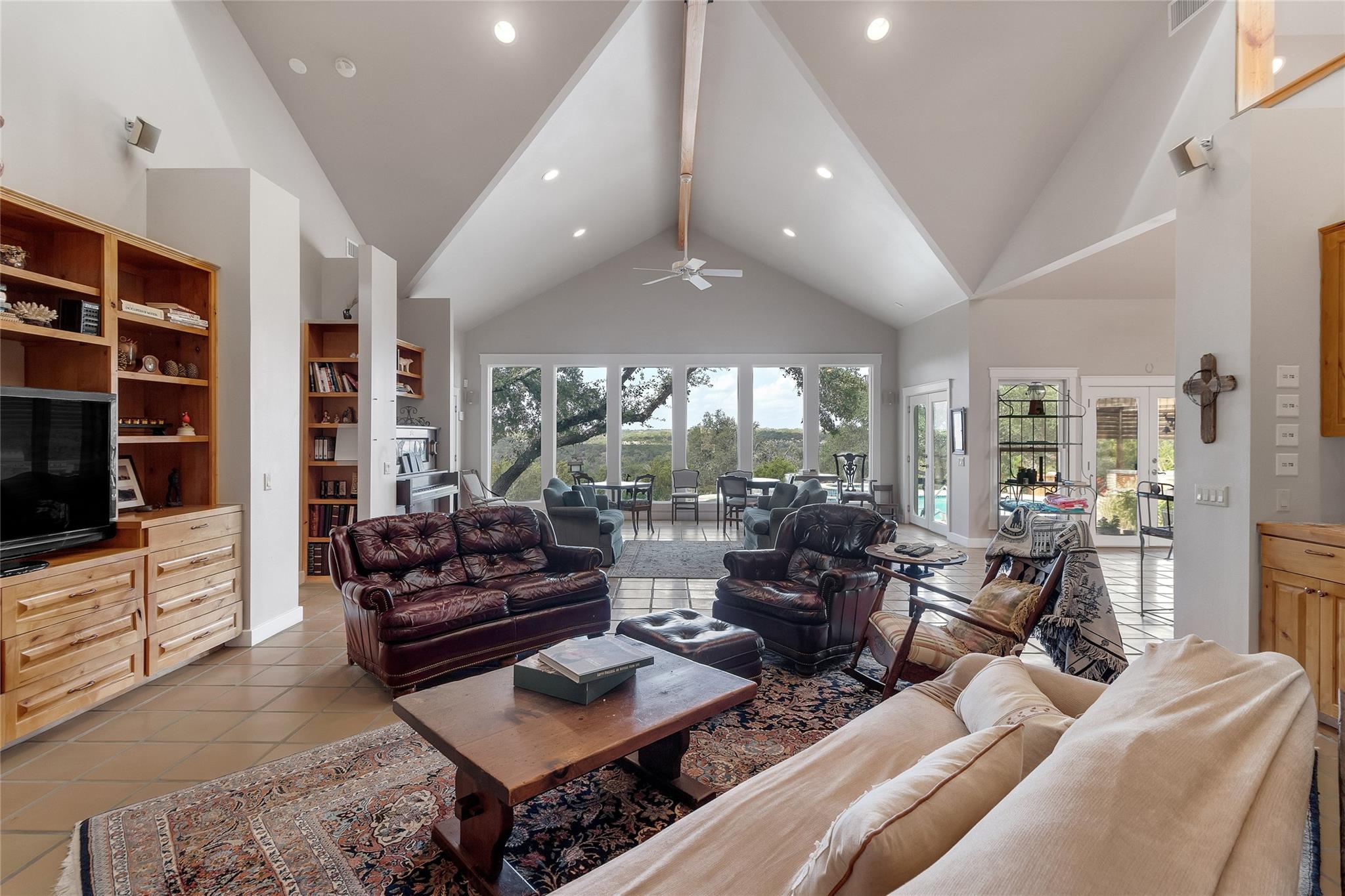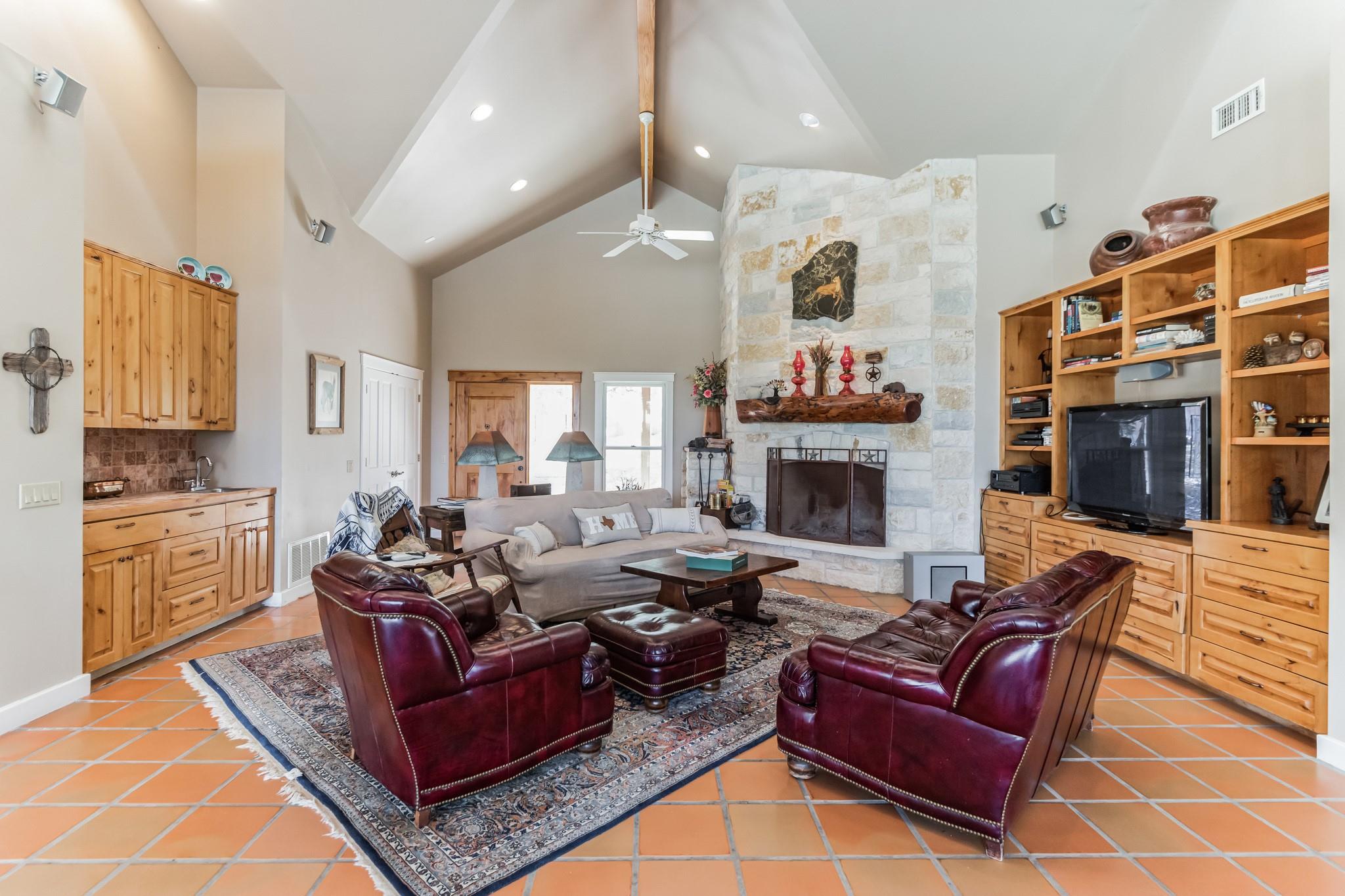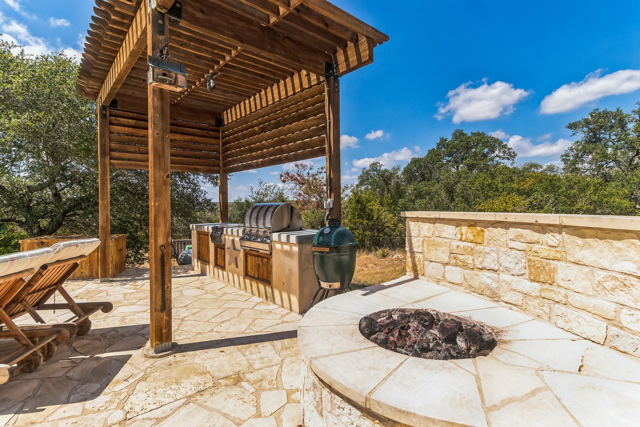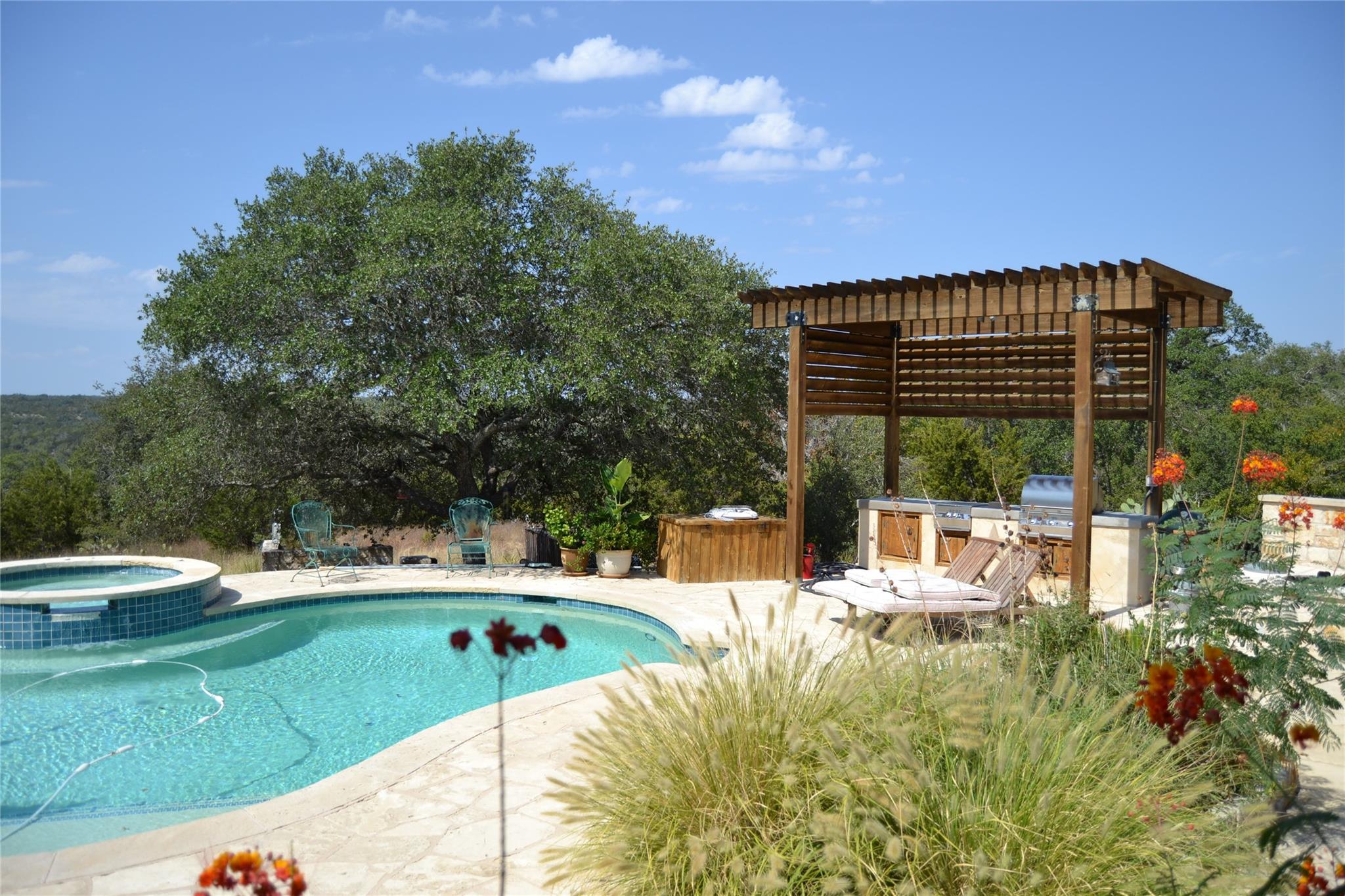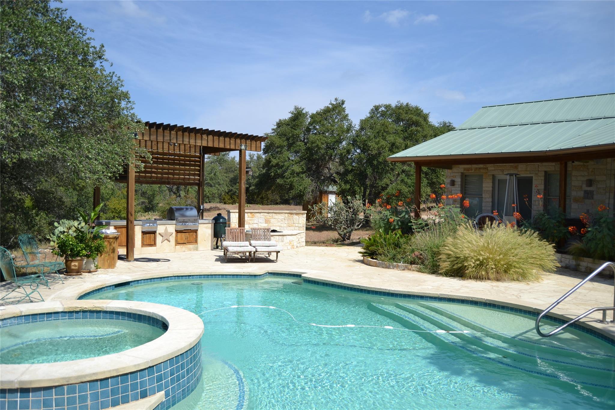 GREAT PRICE IMPROVEMENT! Incredible Hill Country Retreat w/ Picturesque Panoramic Views… gorgeous home w/ extensive upgrades. All on 27.41 acres with a wildlife/ag exemption in place inside the gated subdivision of Hidden Creek. There are 13.08 acres in Hays County and 14.33 acres in Blanco County. Includes a 40' X 80' Barndominium of which 1600 sf is heated and cooled per seller. The Barndo has 2BR/1BA/ plus large office along w/ a full kitchen & living area. The other area has 1600sf of workshop with 220V, lots of workspace, storage and a large commercial duty exhaust fan on the back outside wall to suck the heat out. The Main Home is stone veneer with 3BR/2.5BA/2GA, 2 Dining Areas, a wonderful over the top Gourmet Kitchen w/ stainless steel appliances. All open to a large great room w fireplace. Approximately 3400 sf per seller. Very private & relaxing country living environment. Great recharging get-away and excellent recreation property w sparkling inground resort style pool & waterfall w stone walkways, firepit, grilling area & large covered patios. Wildlife abundant. Comes with a high fenced-deer proof garden w irrigation too. All of this is in the highly sought after gated community of Hidden Creek and just 15 minutes from Dripping Springs. This also makes for a great STR with a good return.