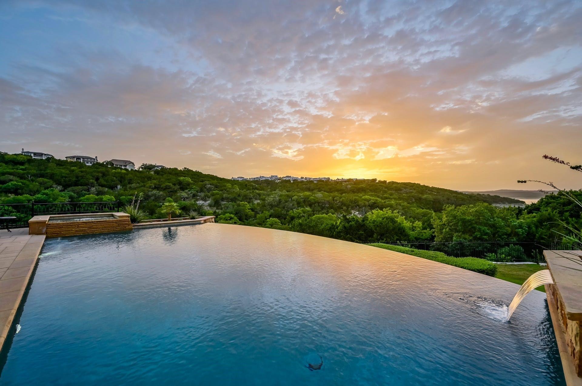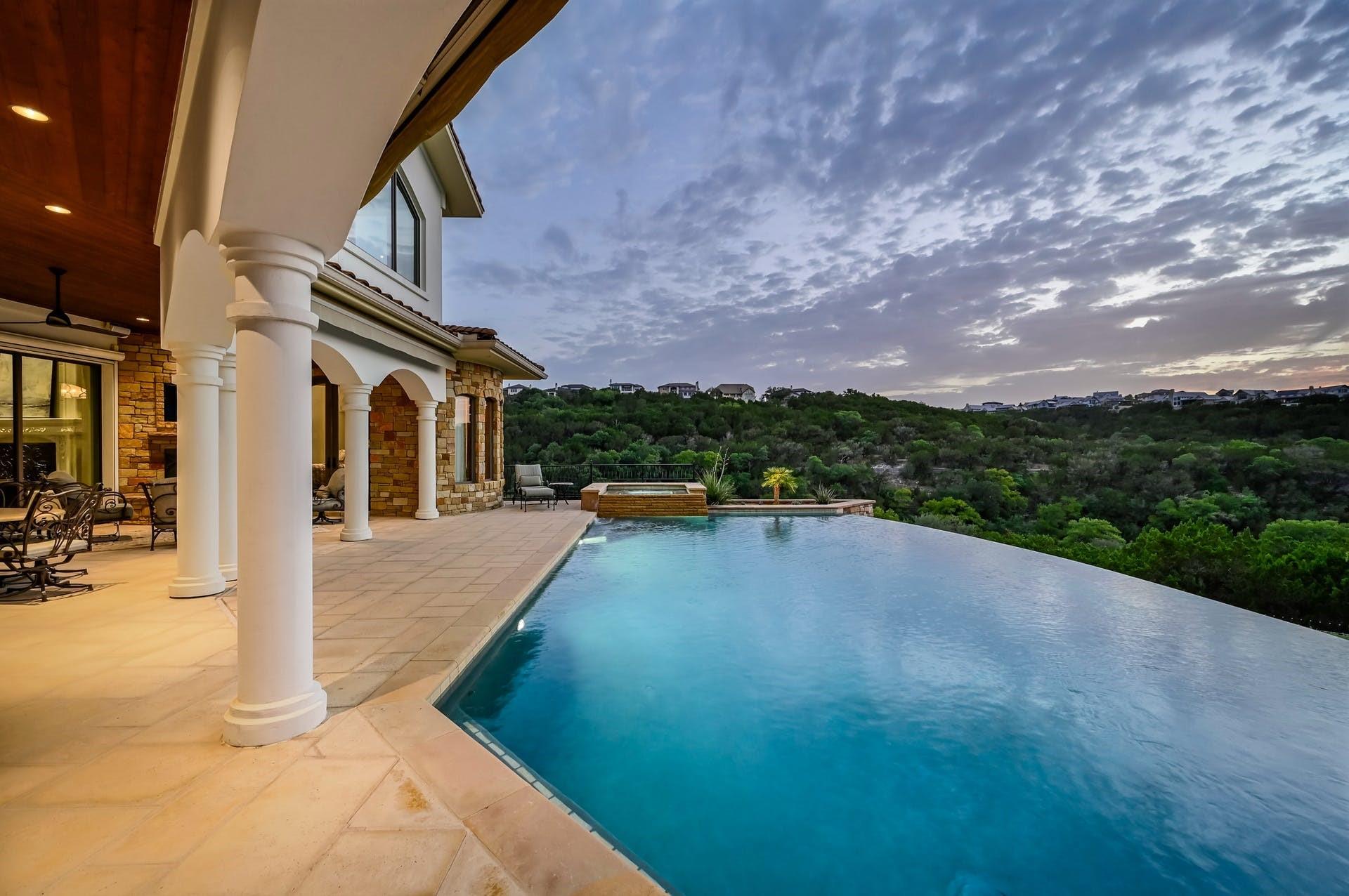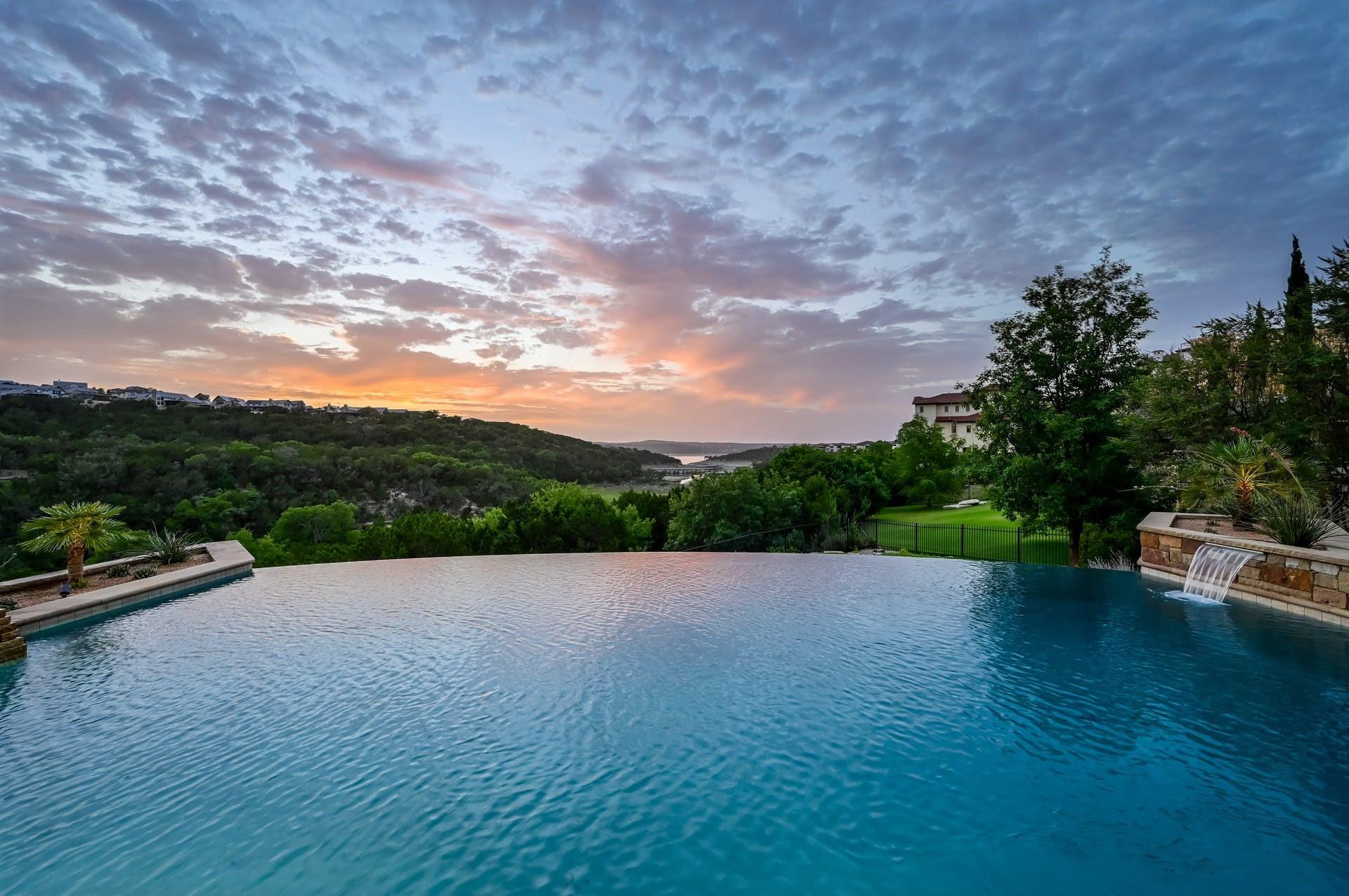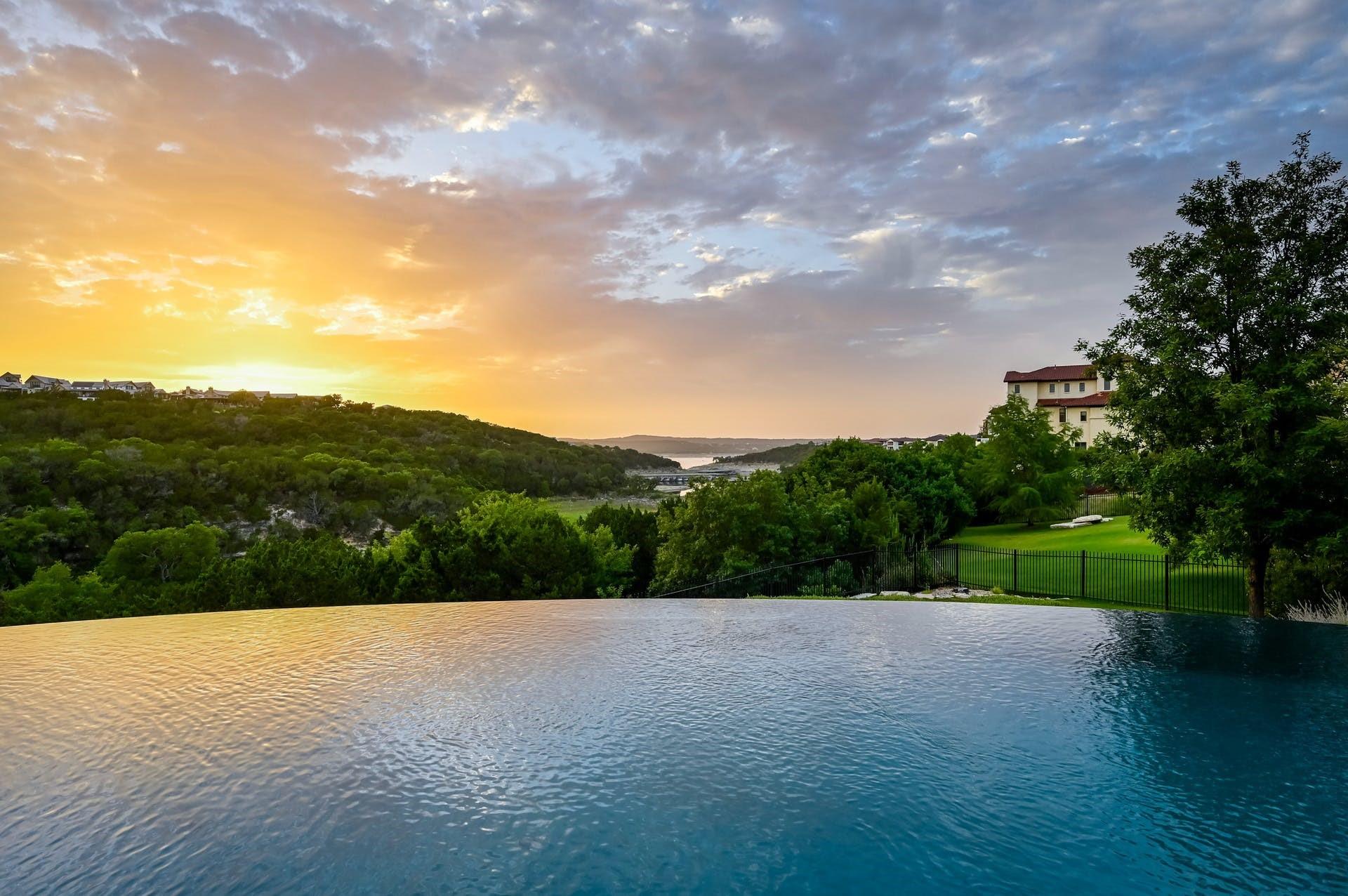 Welcome to Waters Edge, an exclusive enclave of Rough Hollow. Tucked away on a peaceful cul-de-sac, close to the yacht club, this extraordinary estate epitomizes Lakeway luxury. With an impressive architectural statement, this property offers canyonside sunset views of Lake Travis w/ an unparalleled connection to resort living. Sprawling across a lush .47 ac that is surrounded by over 100 acres of scenic canyon trails. The outdoor retreat is a masterpiece in itself, featuring a resort-style infinity edge pool/spa that opens to wooded landscape and sunsets which adds an element of serenity to the surroundings. Don't miss the sports court where you can perfect your free throws! You will always have special accommodations for your favorite guests in the separate guest casita which features a full bath and kitchenette. Executive office on the main floor with separate study space. Take the grand staircase or elevator to the upper level where you will find a living area with a bar, a second laundry area, and a game room with panoramic views. Sterling Custom Homes was retained to construct this impressive 6300+ square foot estate. The soaring ceilings adorned with magnificent wood beam ceiling treatments create a sense of expansiveness, while the open kitchen design becomes a focal point for gatherings and hosting special occasions. The island kitchen is equipped with SubZero and Wolf appliances. The residence offers three distinct living areas - an open living room, large game room with wood trimmed ceiling, and a comfortable family room - each contributing to the tapestry of luxury living and featuring lake views. Security is paramount, and this estate features security gates and the entry breezeway and motor court that leads to the 3 car garage. In summary, this Rough Hollow estate combines timeless elegance with modern conveniences. It's a symphony of luxury, privacy, and natural beauty, offering an unparalleled lakeside lifestyle for those who demand the very best.