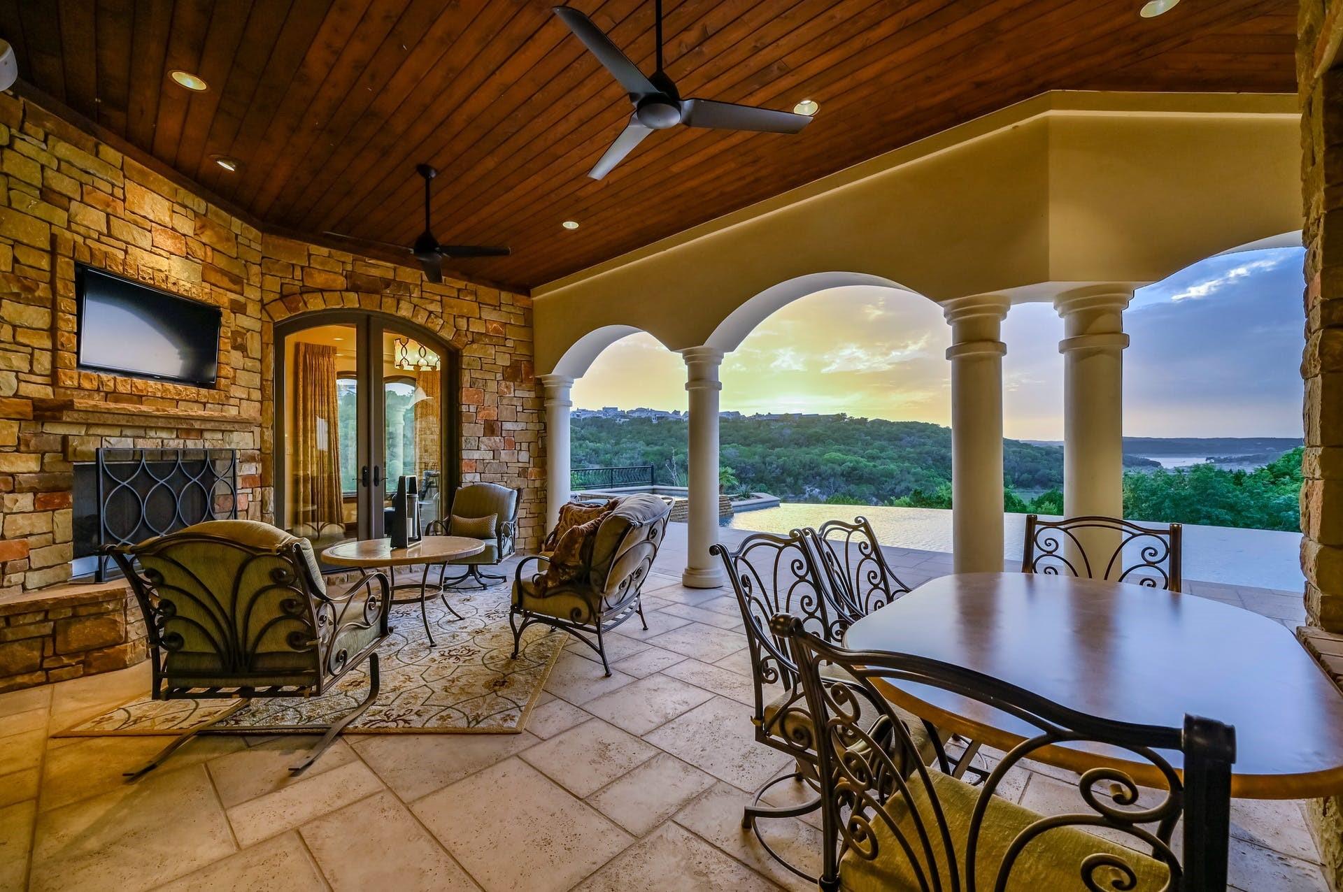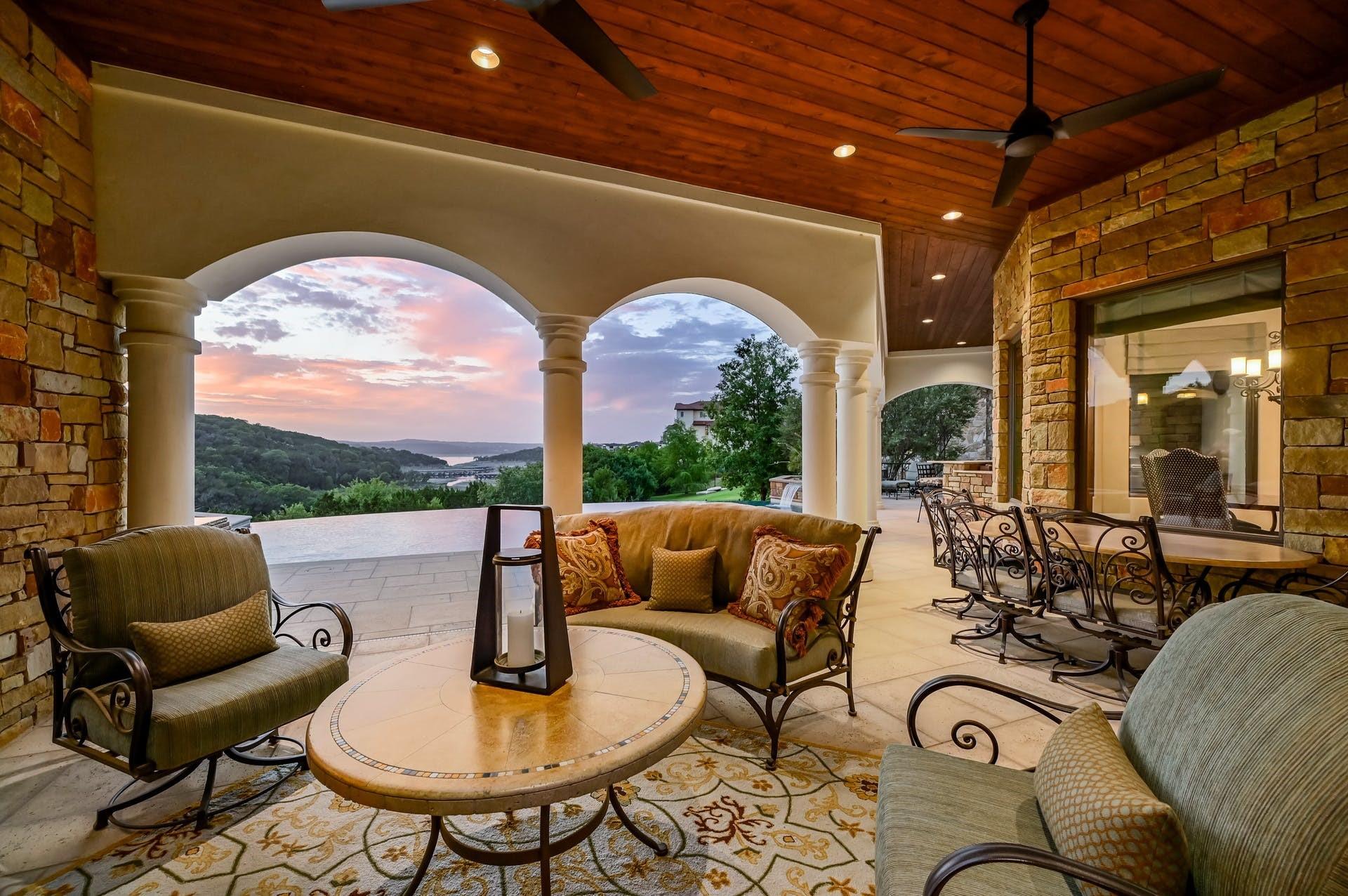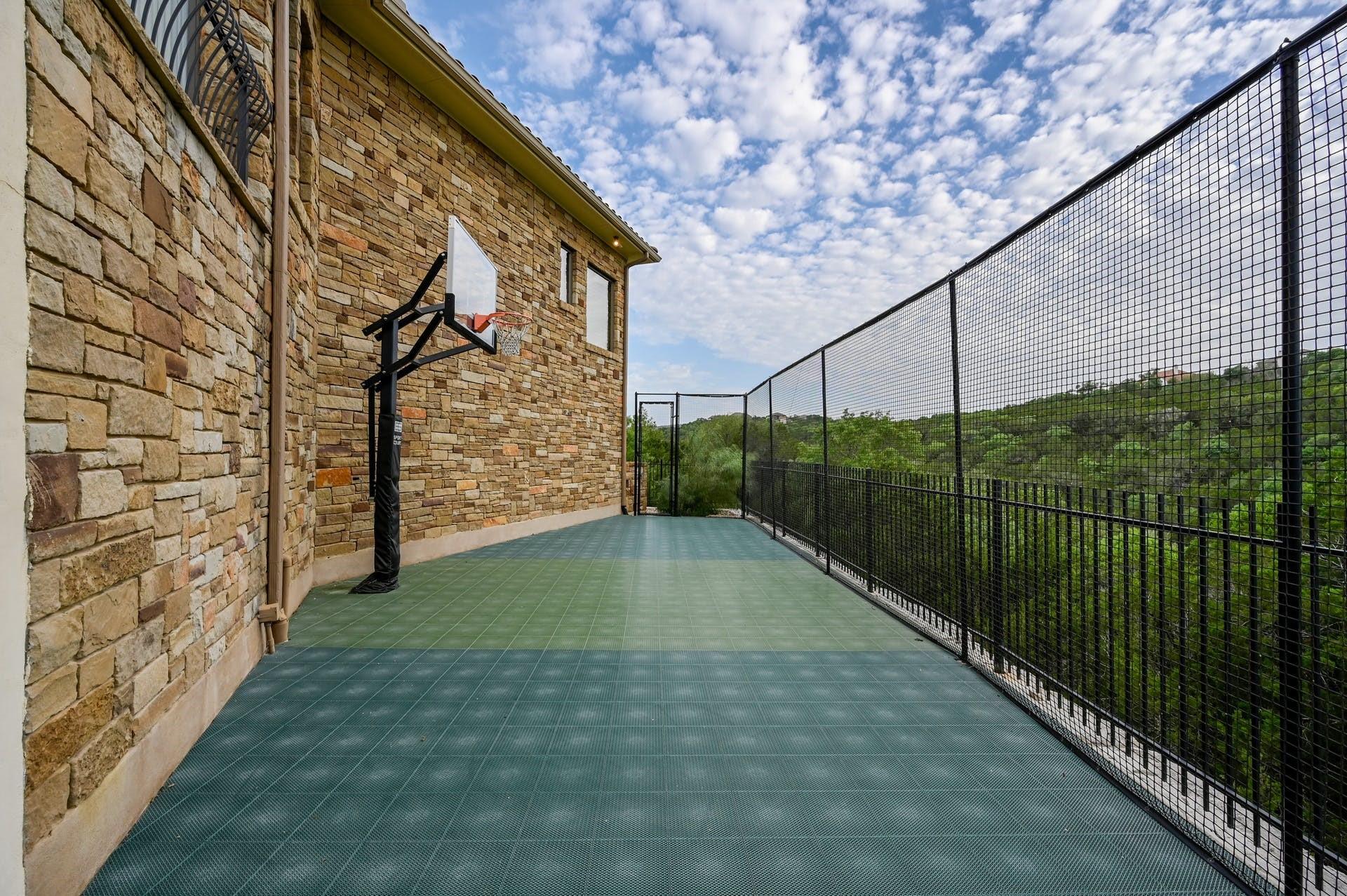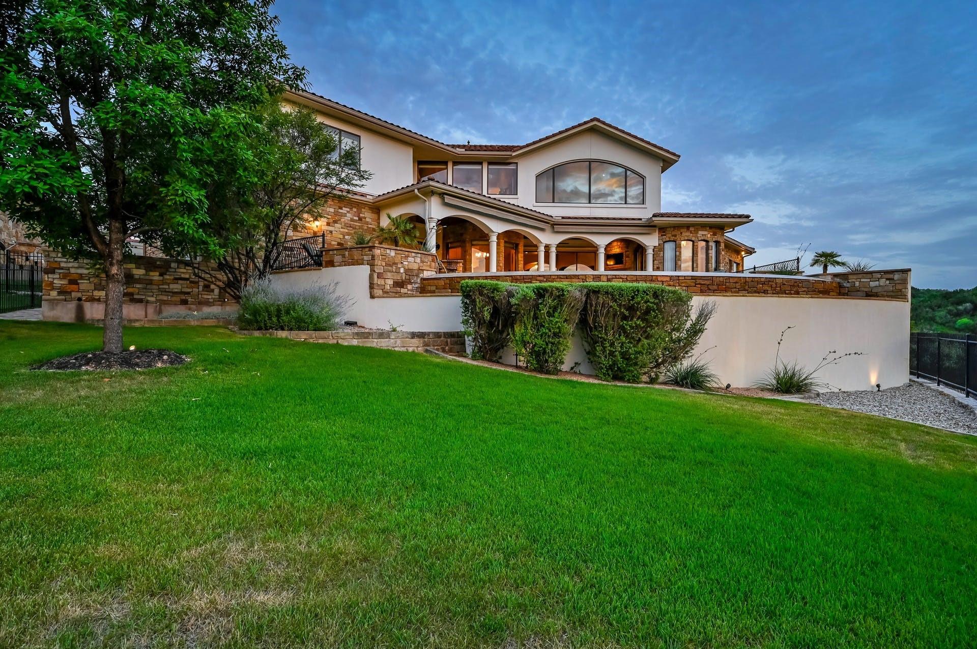 Welcome to Waters Edge, an exclusive enclave of Rough Hollow. Tucked away on a peaceful cul-de-sac, close to the yacht club, this extraordinary estate epitomizes Lakeway luxury. With an impressive architectural statement, this property offers canyonside sunset views of Lake Travis w/ an unparalleled connection to resort living. Sprawling across a lush .47 ac that is surrounded by over 100 acres of scenic canyon trails. The outdoor retreat is a masterpiece in itself, featuring a resort-style infinity edge pool/spa that opens to wooded landscape and sunsets which adds an element of serenity to the surroundings. Don't miss the sports court where you can perfect your free throws! You will always have special accommodations for your favorite guests in the separate guest casita which features a full bath and kitchenette. Executive office on the main floor with separate study space. Take the grand staircase or elevator to the upper level where you will find a living area with a bar, a second laundry area, and a game room with panoramic views. Sterling Custom Homes was retained to construct this impressive 6300+ square foot estate. The soaring ceilings adorned with magnificent wood beam ceiling treatments create a sense of expansiveness, while the open kitchen design becomes a focal point for gatherings and hosting special occasions. The island kitchen is equipped with SubZero and Wolf appliances. The residence offers three distinct living areas - an open living room, large game room with wood trimmed ceiling, and a comfortable family room - each contributing to the tapestry of luxury living and featuring lake views. Security is paramount, and this estate features security gates and the entry breezeway and motor court that leads to the 3 car garage. In summary, this Rough Hollow estate combines timeless elegance with modern conveniences. It's a symphony of luxury, privacy, and natural beauty, offering an unparalleled lakeside lifestyle for those who demand the very best.