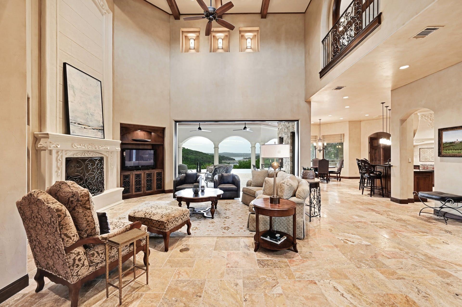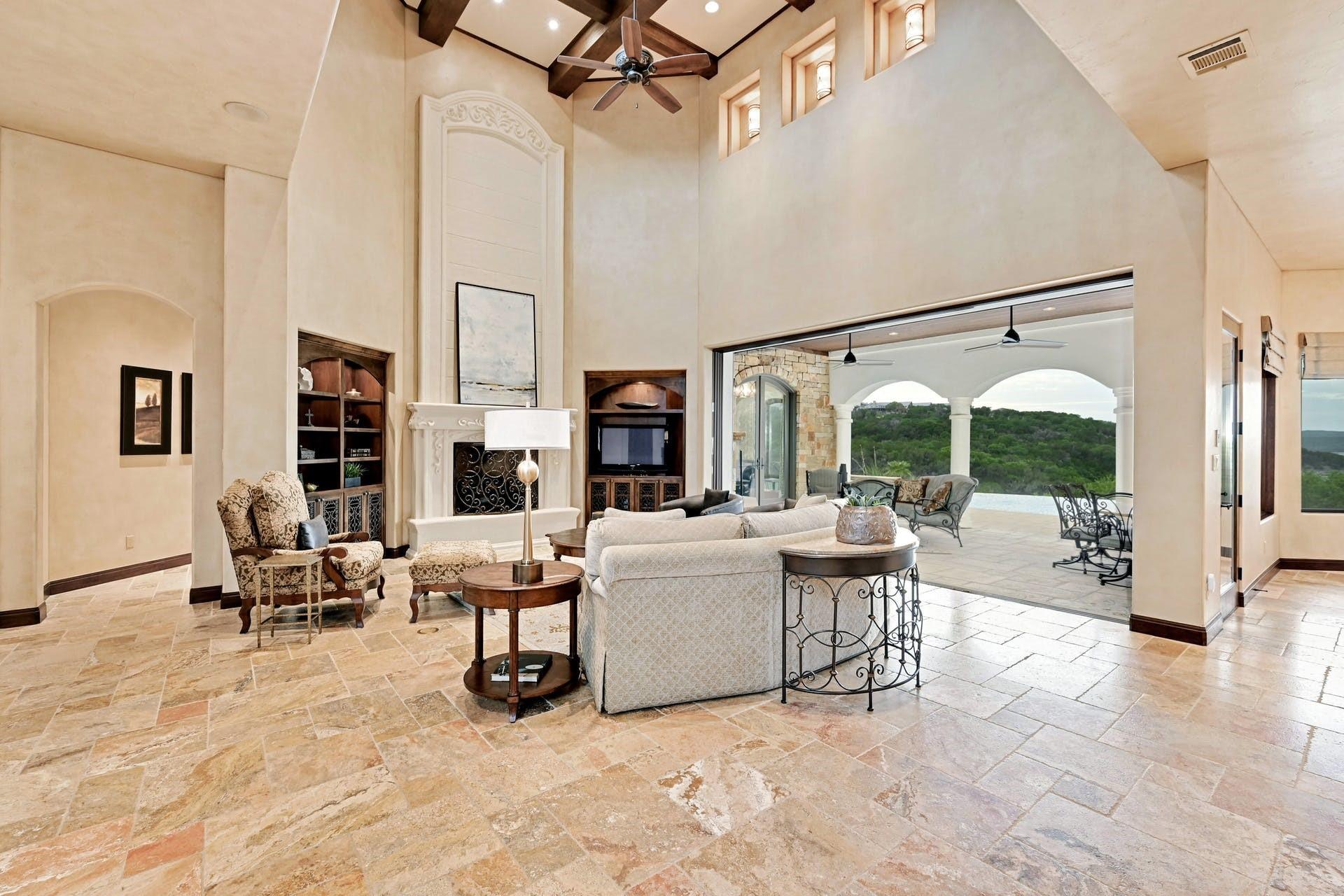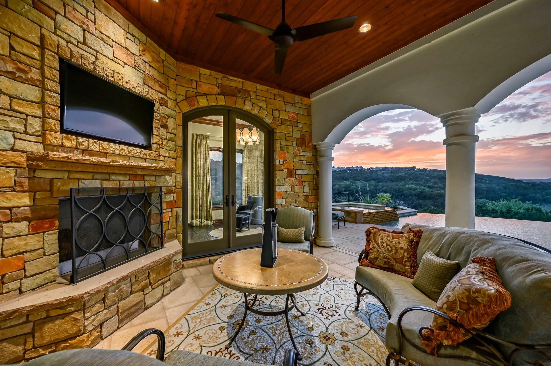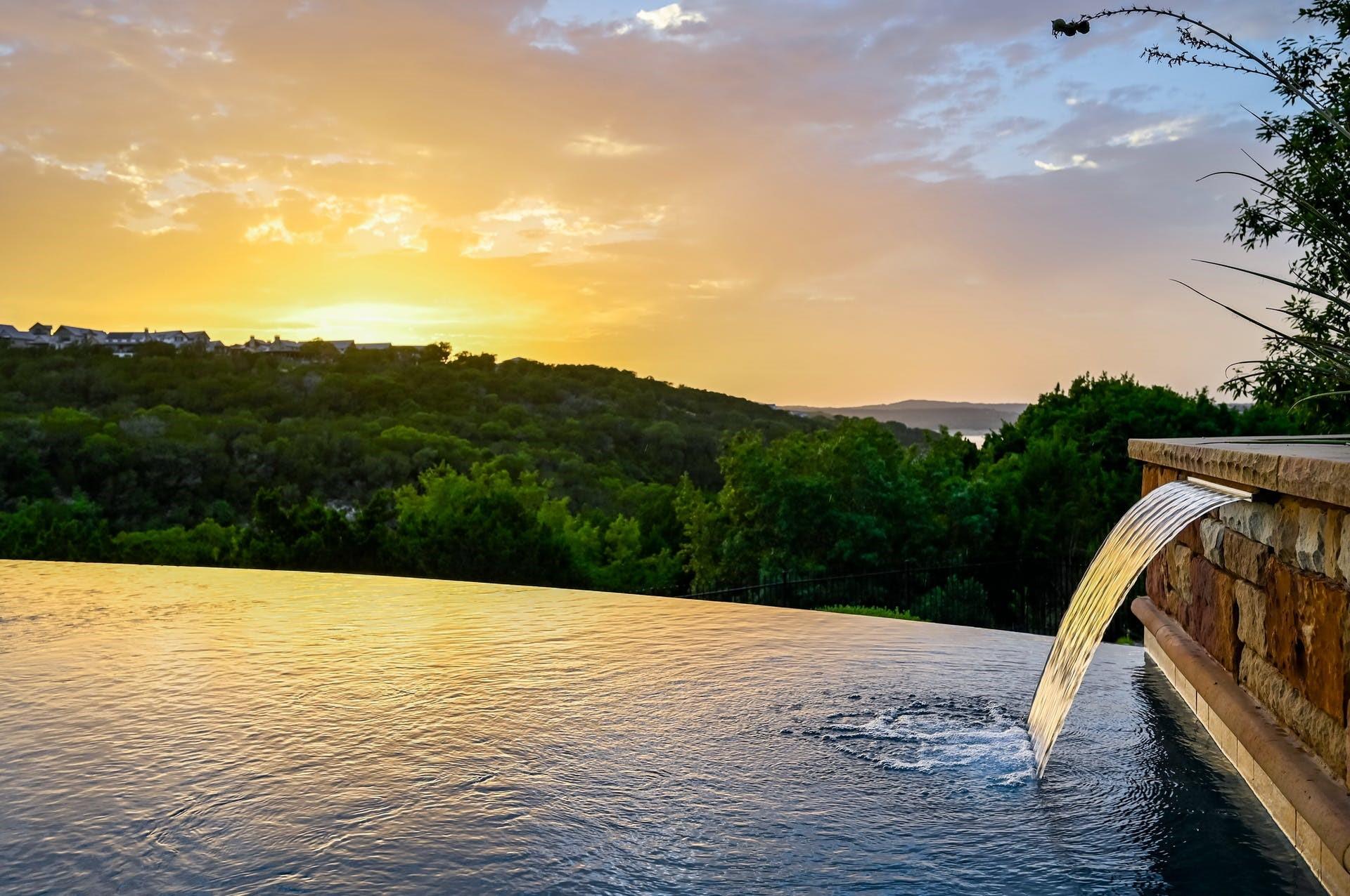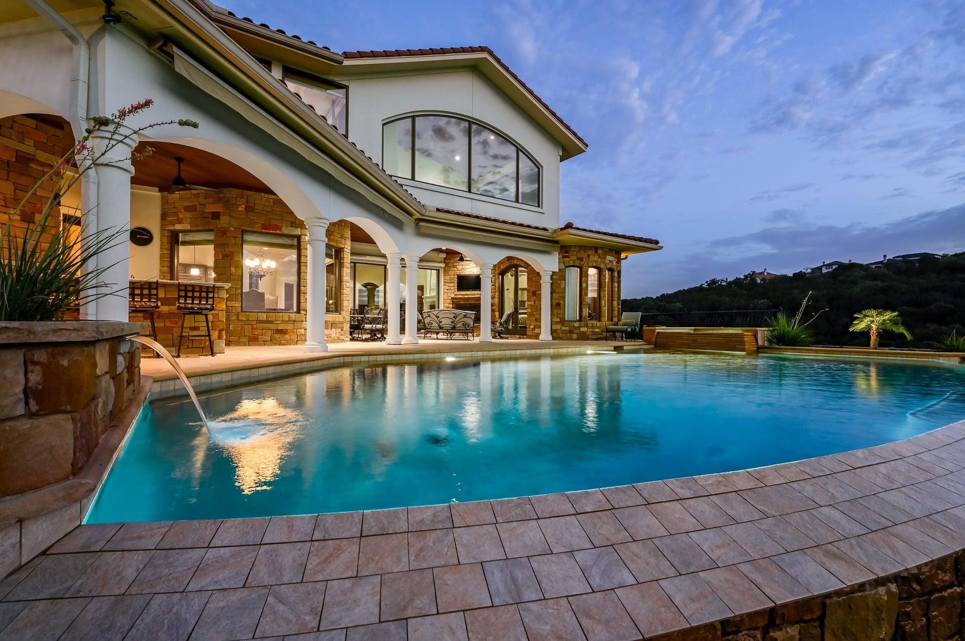 Welcome to Waters Edge, an exclusive enclave of Rough Hollow. Tucked away on a peaceful cul-de-sac, close to the yacht club, this extraordinary estate epitomizes Lakeway luxury. With an impressive architectural statement, this property offers canyonside sunset views of Lake Travis w/ an unparalleled connection to resort living. Sprawling across a lush .47 ac that is surrounded by over 100 acres of scenic canyon trails. The outdoor retreat is a masterpiece in itself, featuring a resort-style infinity edge pool/spa that opens to wooded landscape and sunsets which adds an element of serenity to the surroundings. Don't miss the sports court where you can perfect your free throws! You will always have special accommodations for your favorite guests in the separate guest casita which features a full bath and kitchenette. Executive office on the main floor with separate study space. Take the grand staircase or elevator to the upper level where you will find a living area with a bar, a second laundry area, and a game room with panoramic views. Sterling Custom Homes was retained to construct this impressive 6300+ square foot estate. The soaring ceilings adorned with magnificent wood beam ceiling treatments create a sense of expansiveness, while the open kitchen design becomes a focal point for gatherings and hosting special occasions. The island kitchen is equipped with SubZero and Wolf appliances. The residence offers three distinct living areas - an open living room, large game room with wood trimmed ceiling, and a comfortable family room - each contributing to the tapestry of luxury living and featuring lake views. Security is paramount, and this estate features security gates and the entry breezeway and motor court that leads to the 3 car garage. In summary, this Rough Hollow estate combines timeless elegance with modern conveniences. It's a symphony of luxury, privacy, and natural beauty, offering an unparalleled lakeside lifestyle for those who demand the very best.