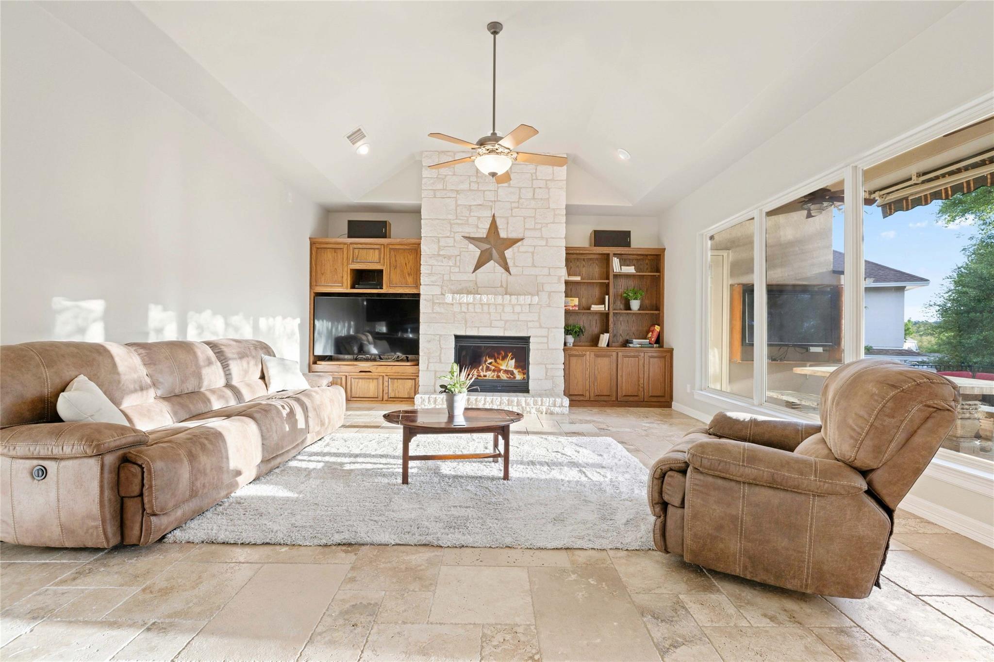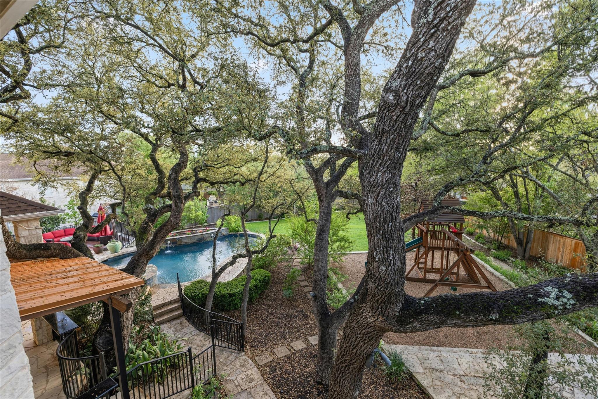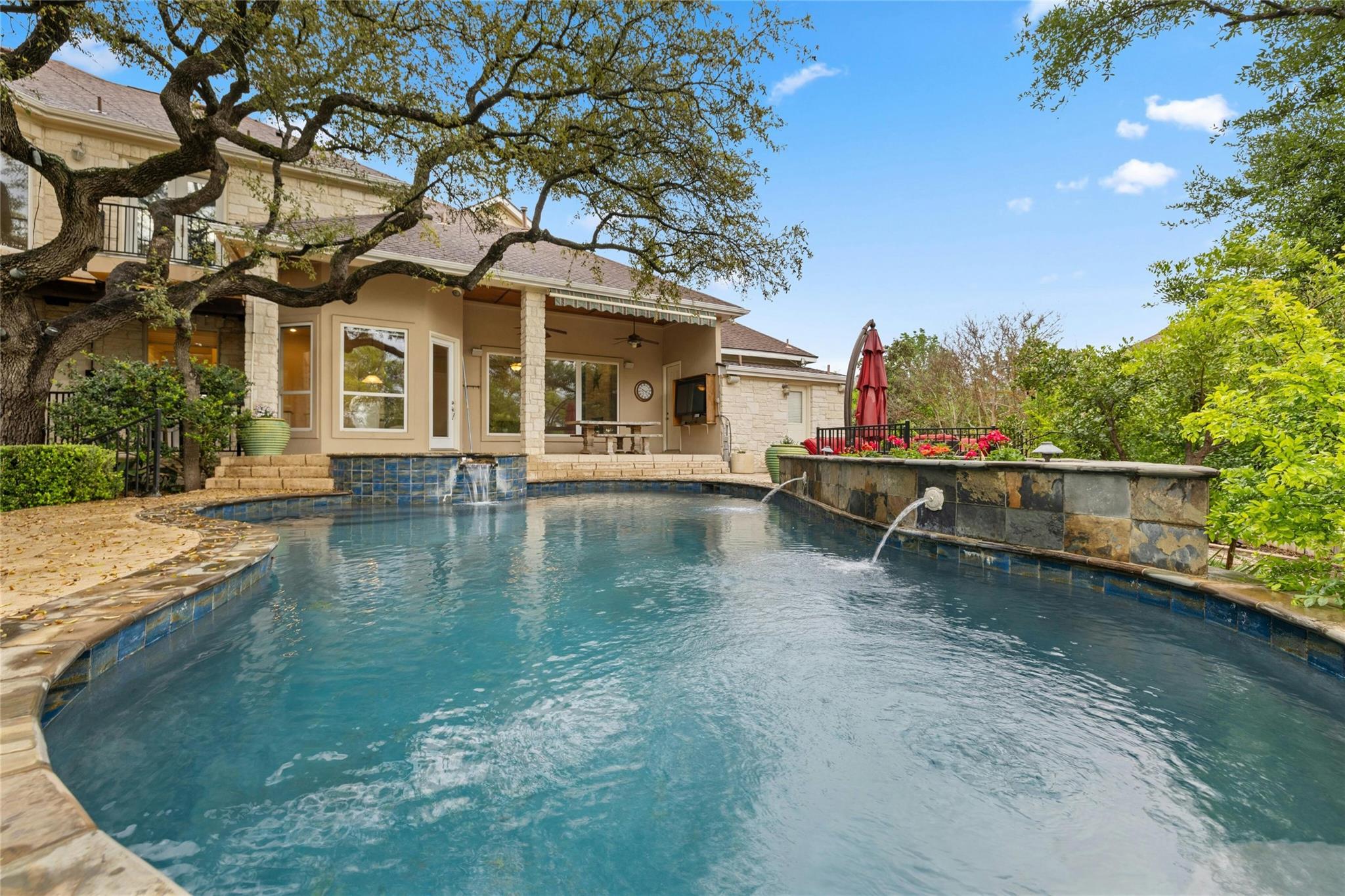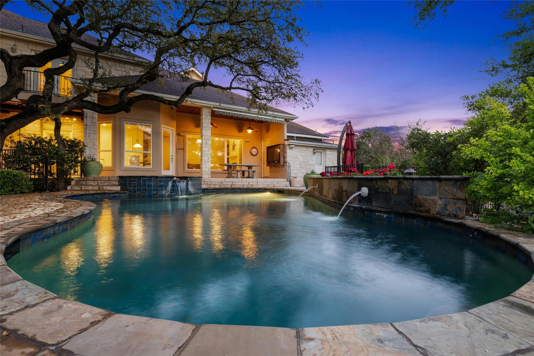 Experience the Bee Cave lifestyle! Nestled within the gated community of The Uplands, this fabulous home boasts a sparkling POOL, 4 bedrooms, 4 full baths, 2 half baths, a media room, and is on over half an acre. This is a rare gem that also offers ATTACHED guest quarters/5th bedroom, workshop, or secondary private office with PRIVATE entry and full bath. Timeless travertine marble floors with hand scraped wood accents pave the way through this cheerful and light-filled home. A double-sided fireplace adds warmth to both the private office as well as the main level secondary living space. The family room is also anchored by a gas log fireplace which is flanked by custom built-ins on either side and a wet bar for added entertainment. The oversized family room opens to the kitchen and casual dining space, all of which overlook the SPECTACULAR outdoor setting! The kitchen has recently painted white cabinetry and easy access to the outdoor summer kitchen with built-in grill. Outside, you will find a covered living area as well as an open space with enduring Ipe wood. Texas Live Oak trees and mature landscaping make the pool, spa, and water features feel like paradise in this SERENE and PRIVATE setting. The main level owner’s suite has a door leading to the outside for immediate access to the spa as well as a huge bathroom and closet. TWO sets of stairs lead to the second level with one set accessing the media room and music/craft room while the other set accesses three generously sized bedrooms and 2 full bathrooms. This home truly has it ALL but, most importantly, is in the most favored neighborhood in all of Lake Travis ISD. It is family friendly, gated, huge lots, LOW taxes, and incredibly convenient to local shopping, schools, and downtown.