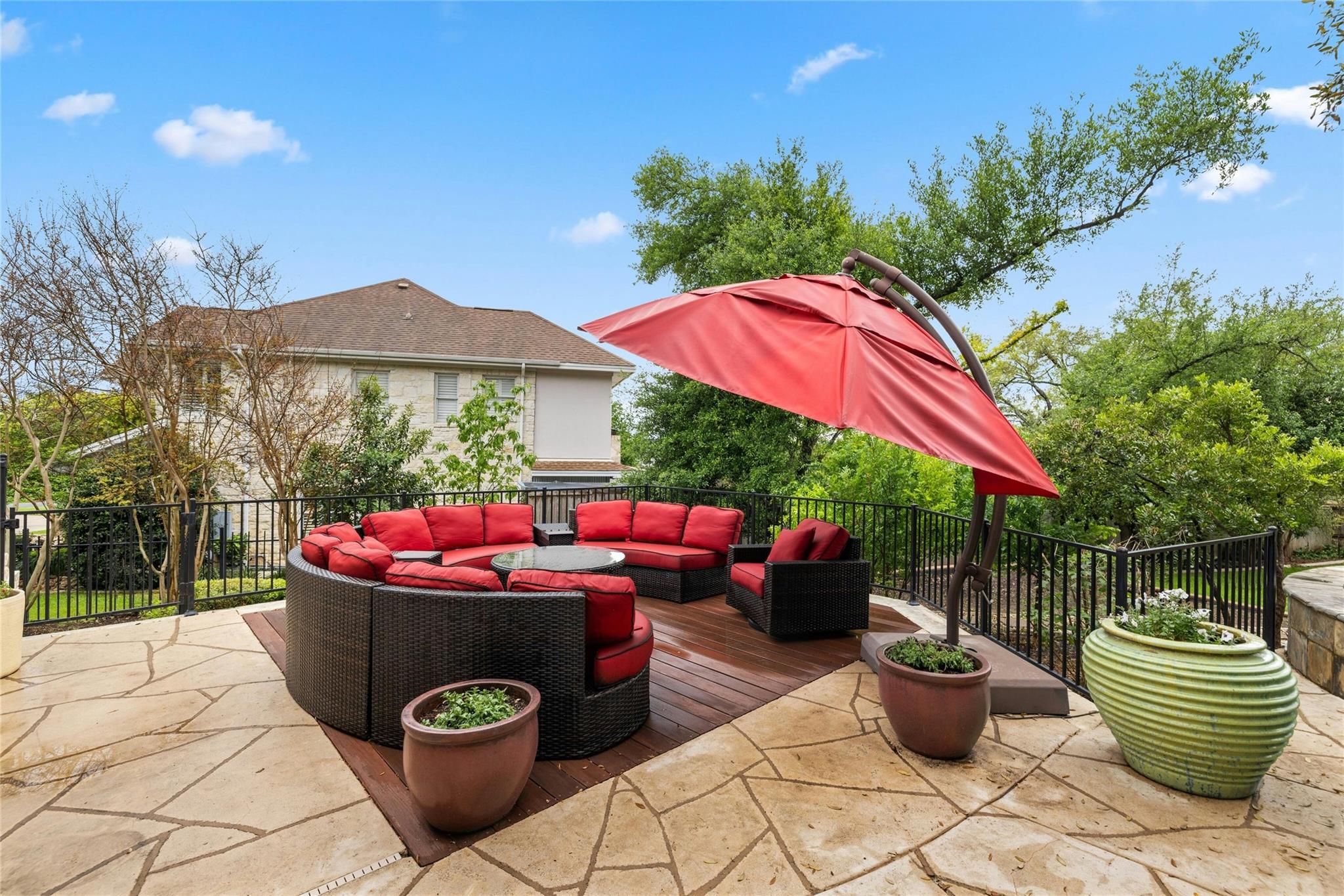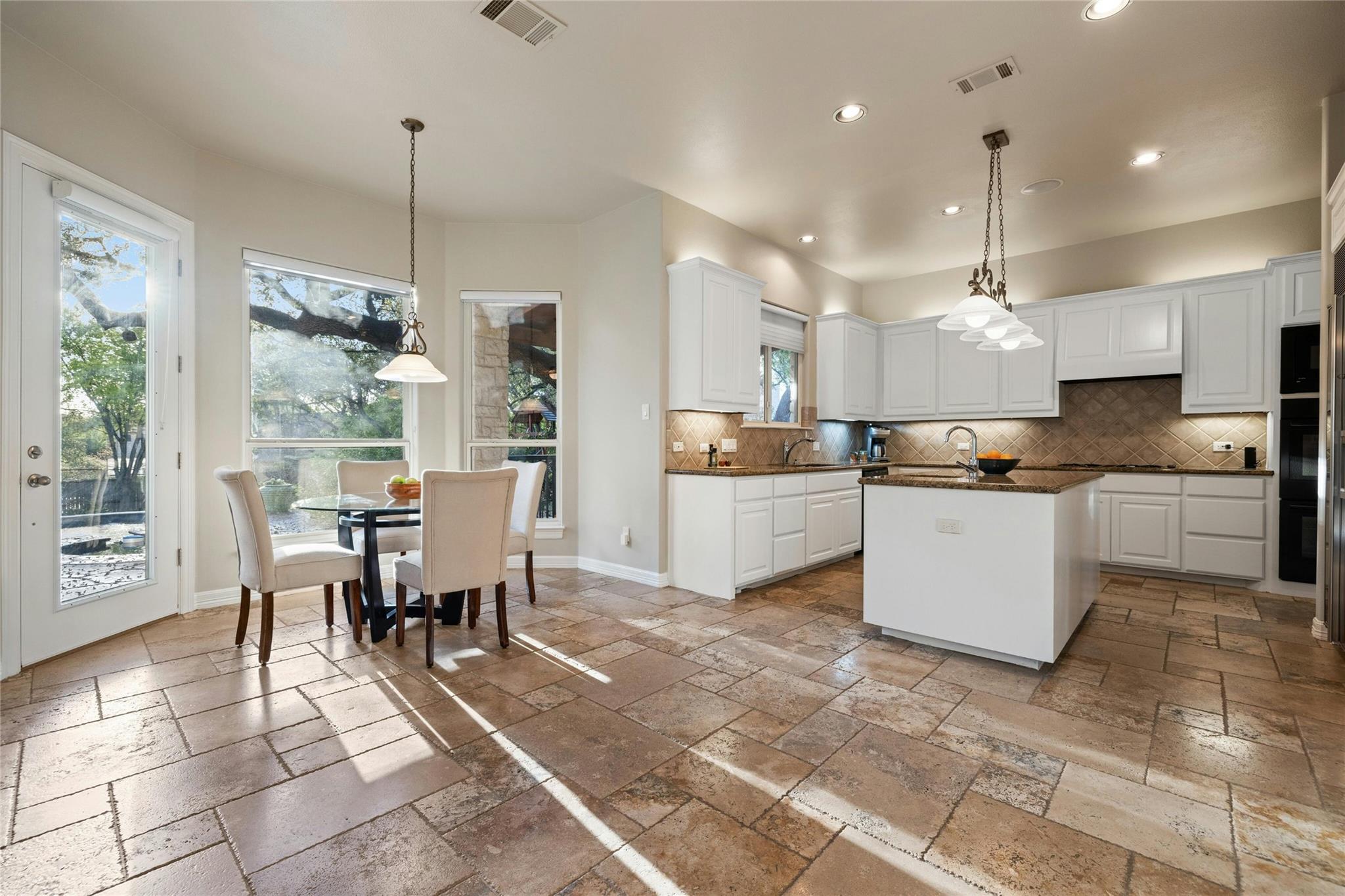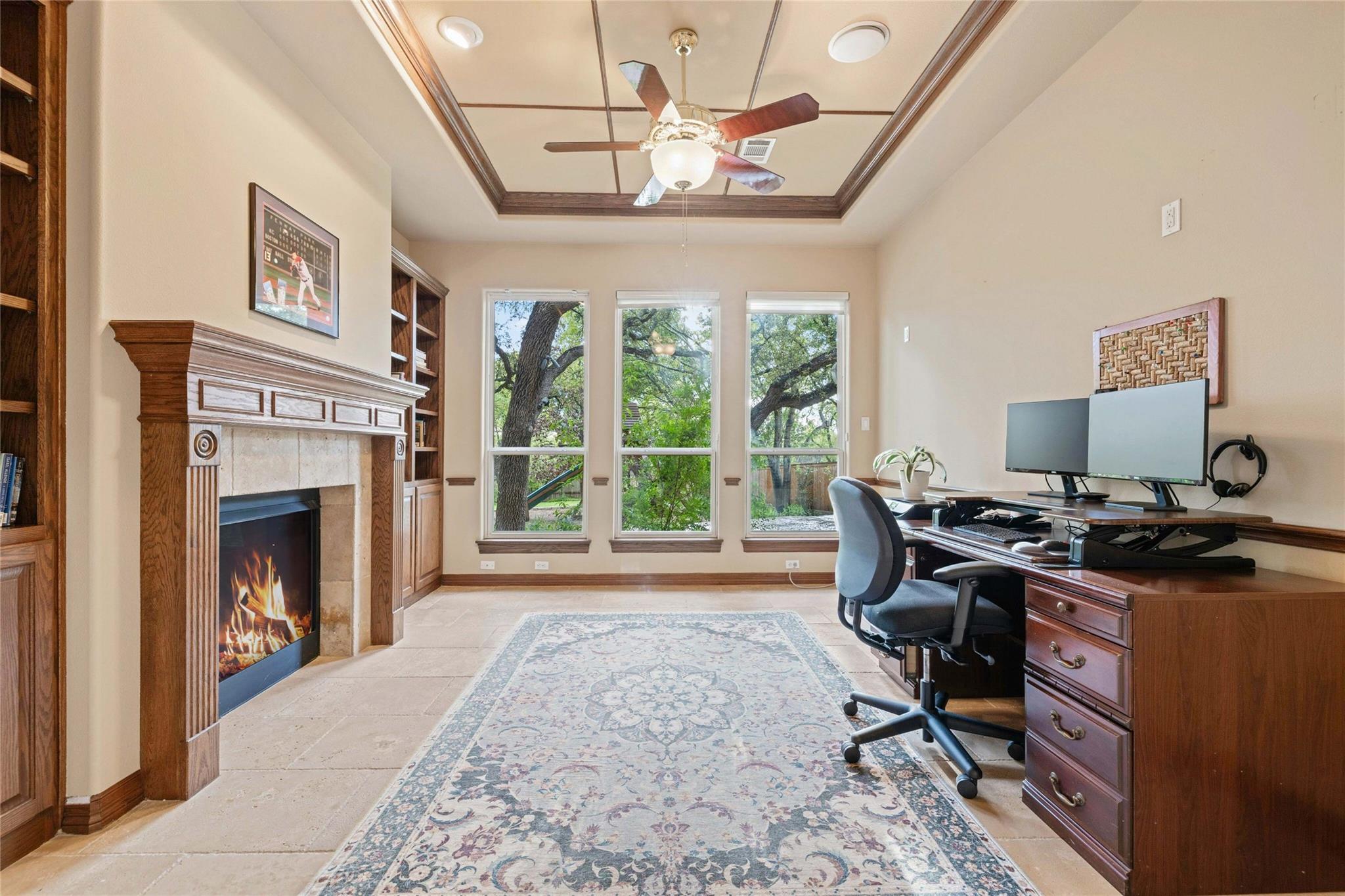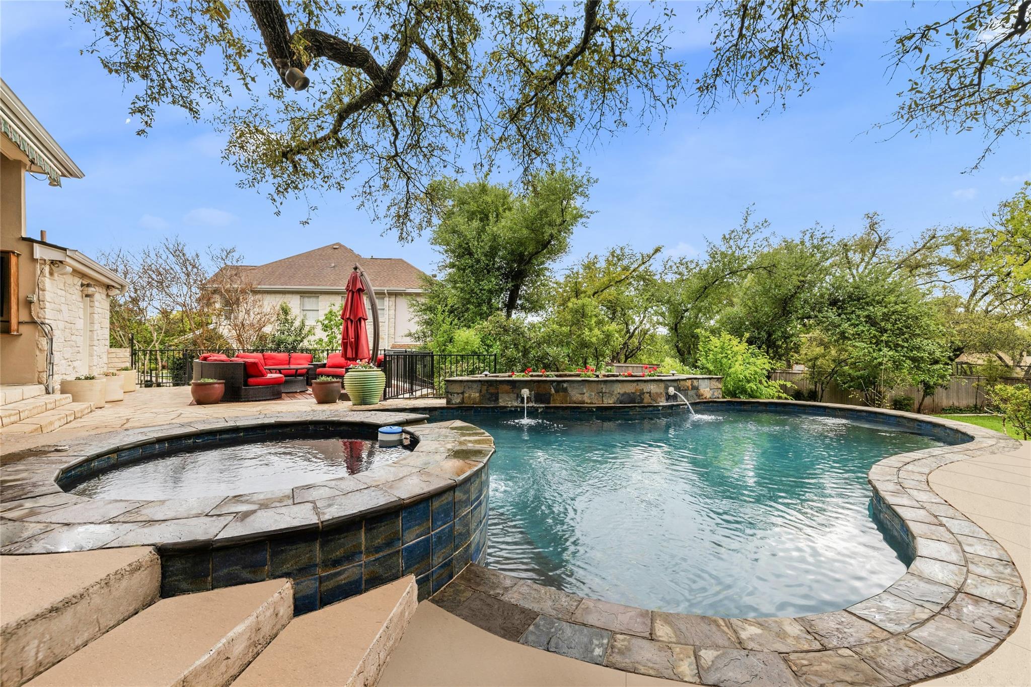 Experience the Bee Cave lifestyle! Nestled within the gated community of The Uplands, this fabulous home boasts a sparkling POOL, 4 bedrooms, 4 full baths, 2 half baths, a media room, and is on over half an acre. This is a rare gem that also offers ATTACHED guest quarters/5th bedroom, workshop, or secondary private office with PRIVATE entry and full bath. Timeless travertine marble floors with hand scraped wood accents pave the way through this cheerful and light-filled home. A double-sided fireplace adds warmth to both the private office as well as the main level secondary living space. The family room is also anchored by a gas log fireplace which is flanked by custom built-ins on either side and a wet bar for added entertainment. The oversized family room opens to the kitchen and casual dining space, all of which overlook the SPECTACULAR outdoor setting! The kitchen has recently painted white cabinetry and easy access to the outdoor summer kitchen with built-in grill. Outside, you will find a covered living area as well as an open space with enduring Ipe wood. Texas Live Oak trees and mature landscaping make the pool, spa, and water features feel like paradise in this SERENE and PRIVATE setting. The main level owner’s suite has a door leading to the outside for immediate access to the spa as well as a huge bathroom and closet. TWO sets of stairs lead to the second level with one set accessing the media room and music/craft room while the other set accesses three generously sized bedrooms and 2 full bathrooms. This home truly has it ALL but, most importantly, is in the most favored neighborhood in all of Lake Travis ISD. It is family friendly, gated, huge lots, LOW taxes, and incredibly convenient to local shopping, schools, and downtown.
