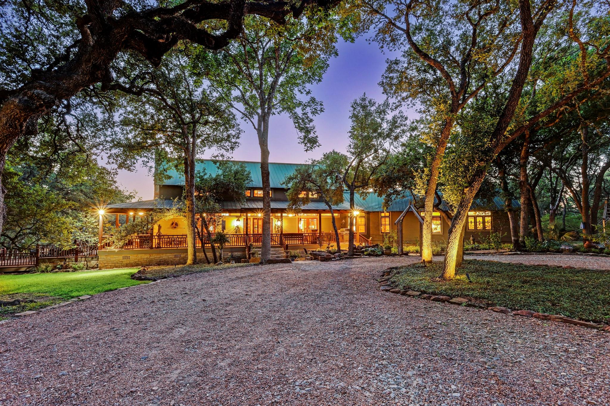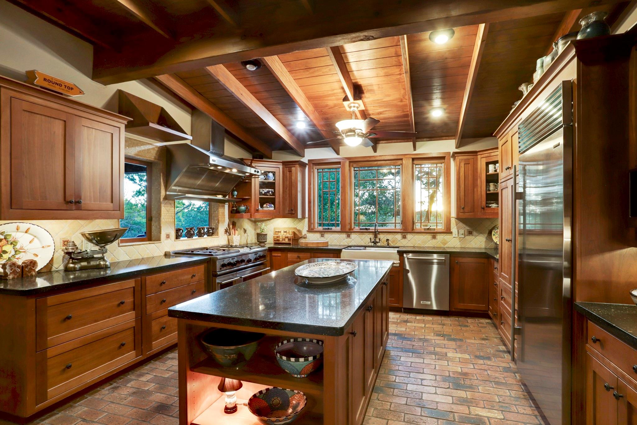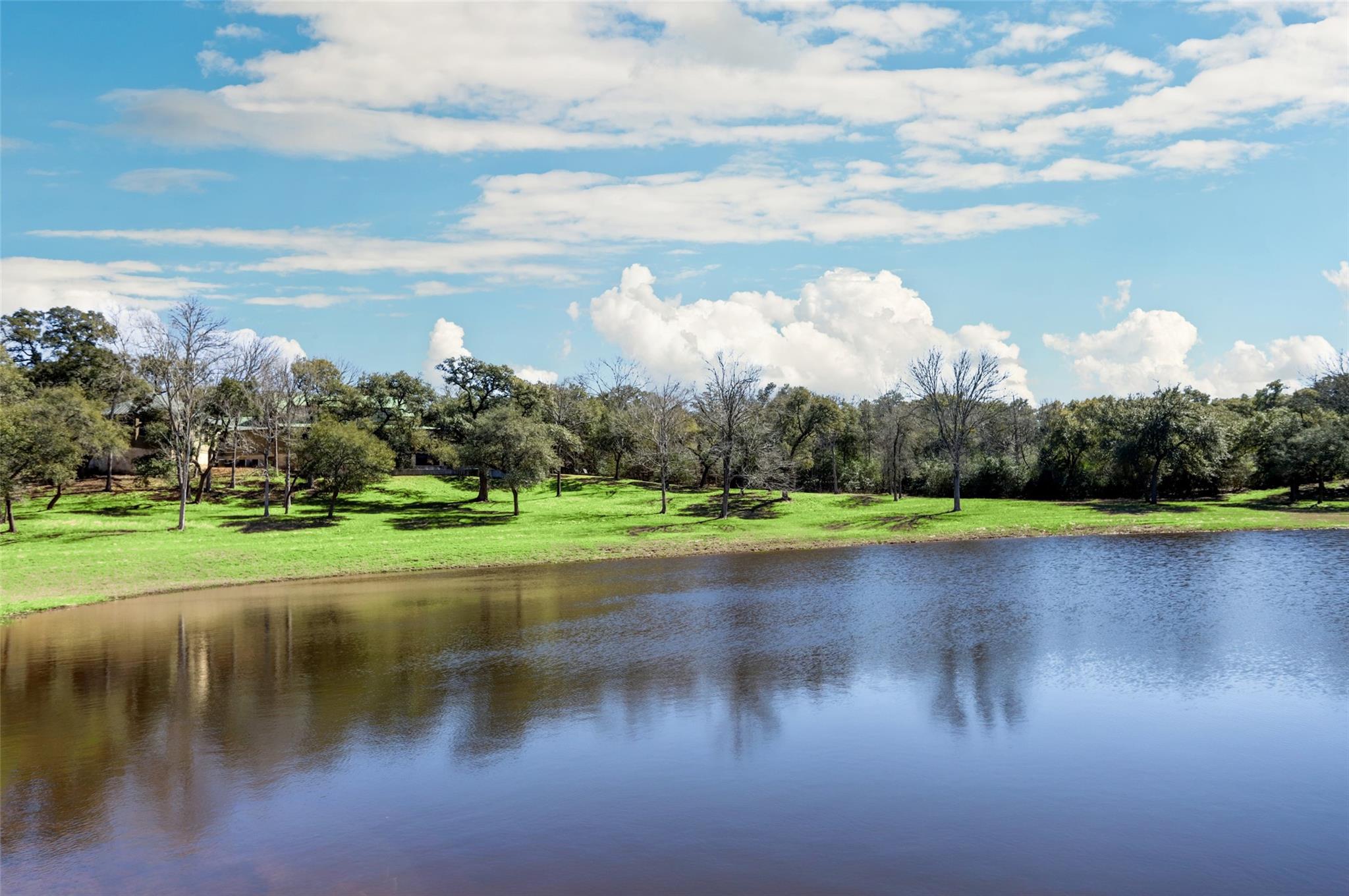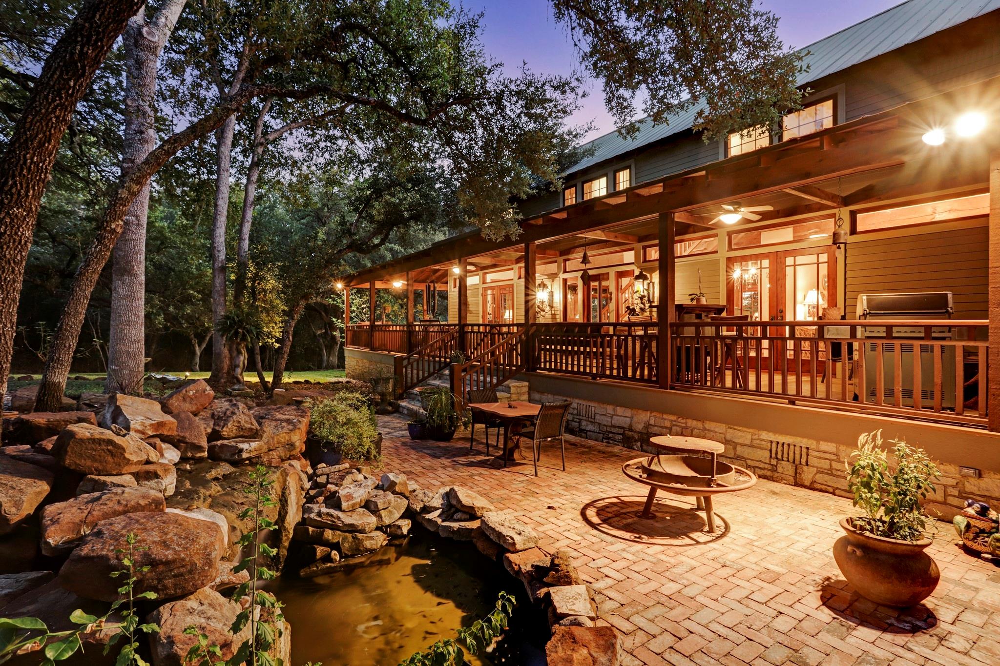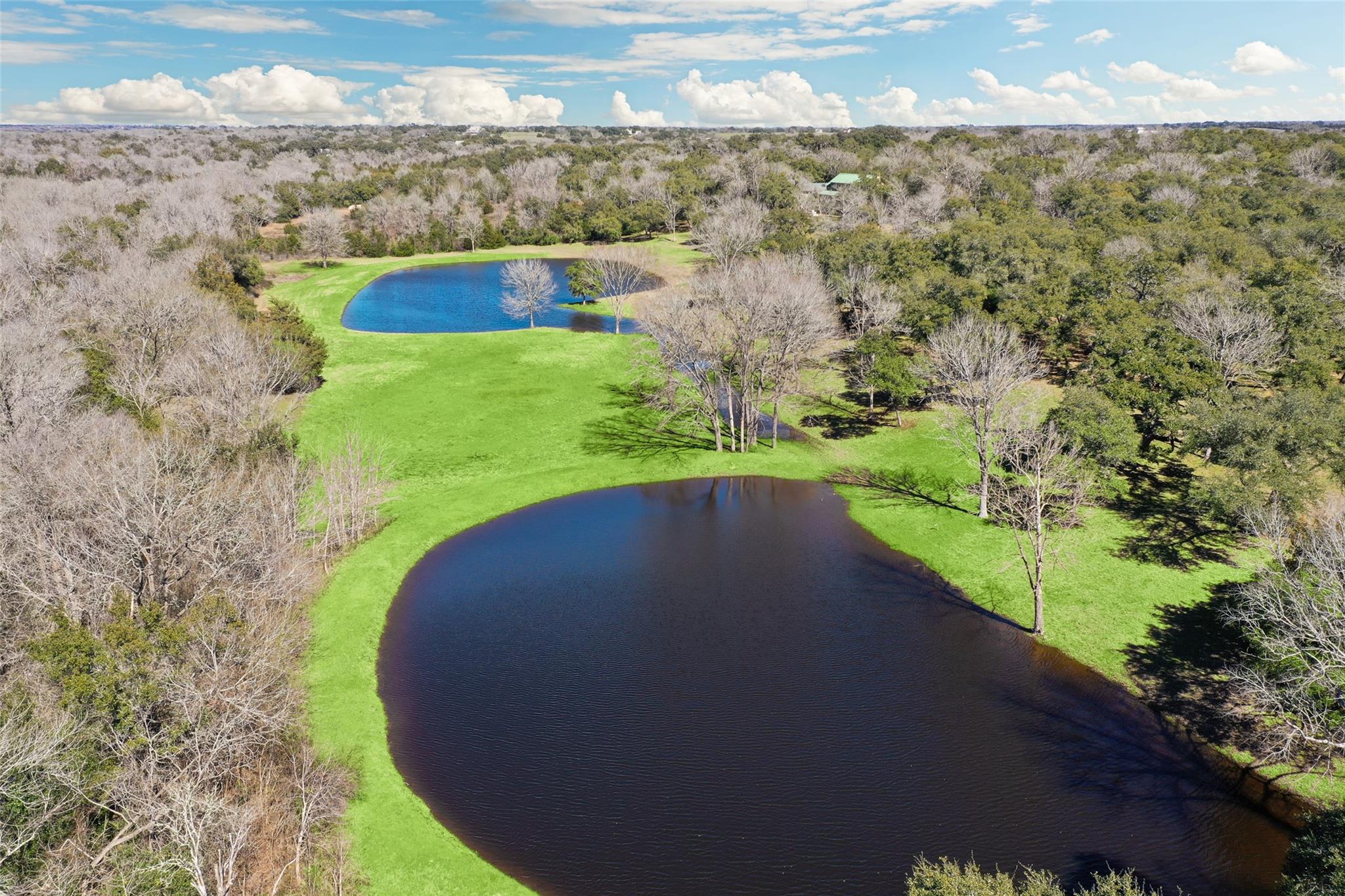 With a dramatic hilltop view at Round Top's very edge, this property offers 18 acres of groomed, rolling terrain with two ponds and Rocky Creek as one of its boundaries. Abundant Century Live Oaks appoint the landscape with the gracious custom home (4873 sf) nestled within them. Living and dining open to wrap around porches (1200 sf) and decking (500 sf) for ideal outdoor entertainment. 2 primary suites down and 2 bedrooms/1 bath up. Gourmet kitchen with 6 burner range, Sub-Zero, custom cherry cabinetry throughout, huge walk-in butler's pantry and bar. 1st floor home office for 2 with built-ins. Pecan hardwood floors in living/dining/primary suites with Old Chicago brick in kitchen, gallery and sitting areas. Pella windows throughout. Craftsman style architectural detail throughout home. Pool with waterfall. 2.5 detached garage with artist studio. So private, yet so close to all that Round Top offers. 90 miles from Houston, 80 miles from Austin and 57 miles from College Station.