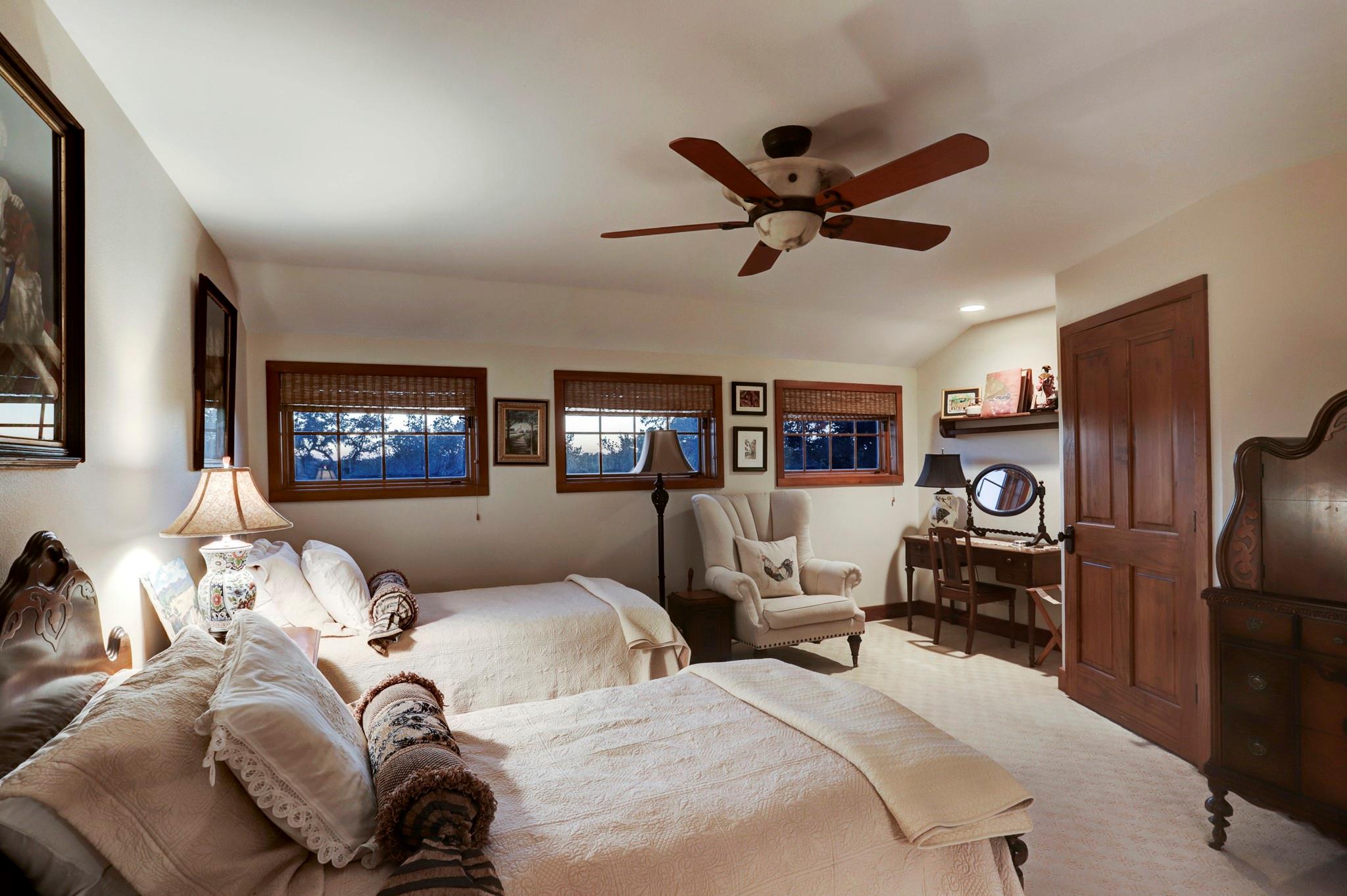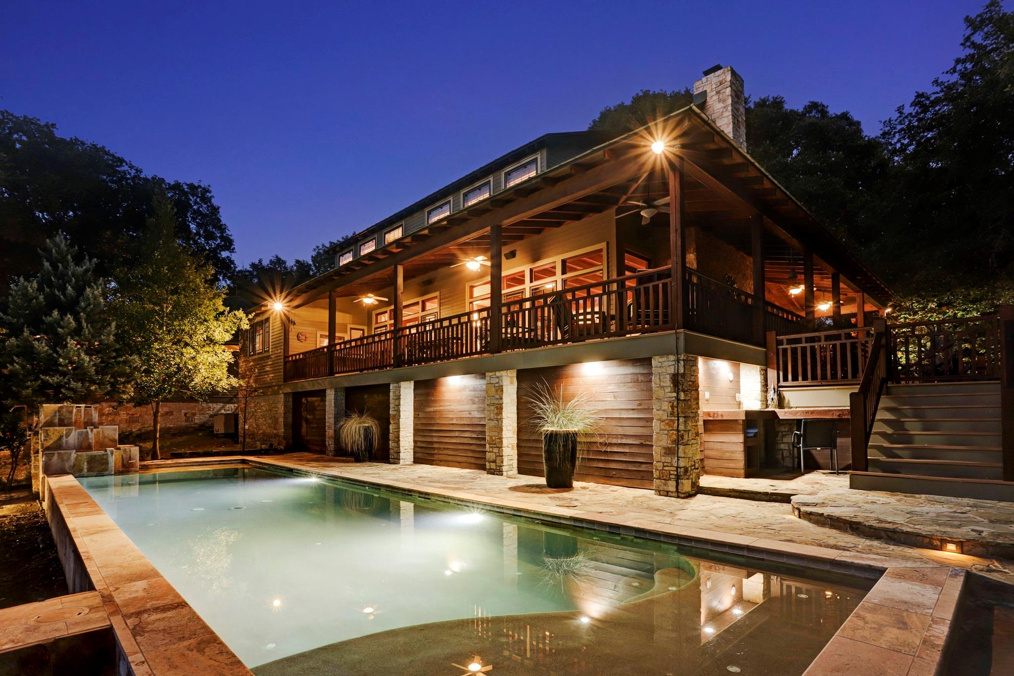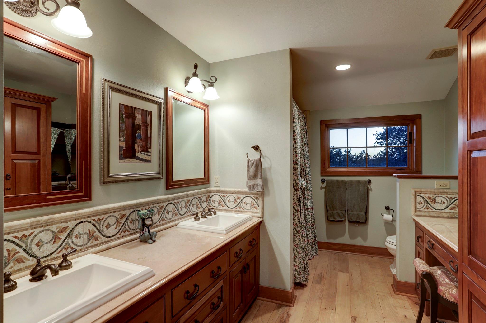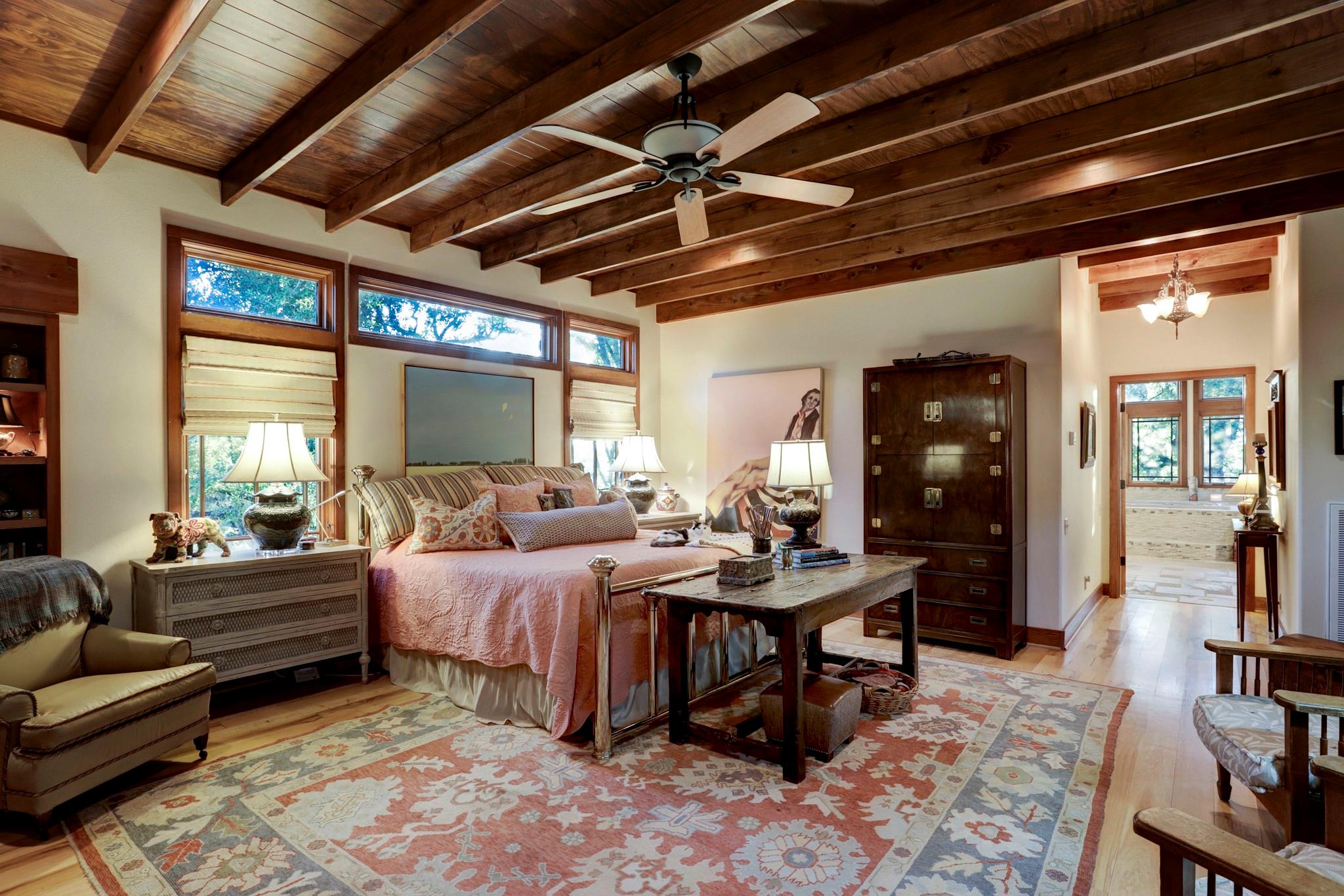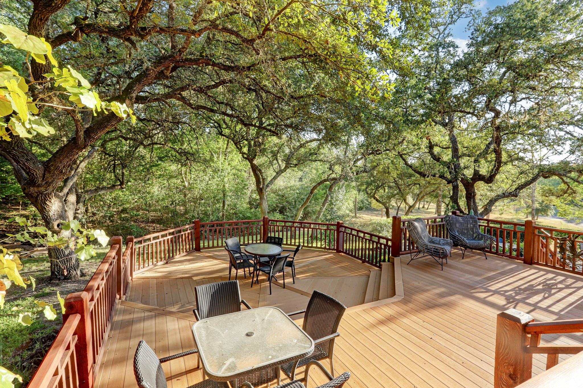 With a dramatic hilltop view at Round Top's very edge, this property offers 18 acres of groomed, rolling terrain with two ponds and Rocky Creek as one of its boundaries. Abundant Century Live Oaks appoint the landscape with the gracious custom home (4873 sf) nestled within them. Living and dining open to wrap around porches (1200 sf) and decking (500 sf) for ideal outdoor entertainment. 2 primary suites down and 2 bedrooms/1 bath up. Gourmet kitchen with 6 burner range, Sub-Zero, custom cherry cabinetry throughout, huge walk-in butler's pantry and bar. 1st floor home office for 2 with built-ins. Pecan hardwood floors in living/dining/primary suites with Old Chicago brick in kitchen, gallery and sitting areas. Pella windows throughout. Craftsman style architectural detail throughout home. Pool with waterfall. 2.5 detached garage with artist studio. So private, yet so close to all that Round Top offers. 90 miles from Houston, 80 miles from Austin and 57 miles from College Station.