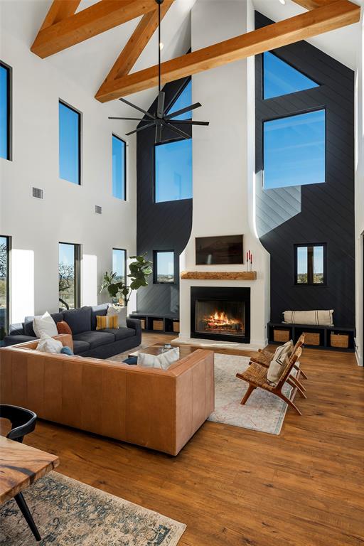 Iconic modern farmhouse situated amongst the rolling hills of Johnson City. Enjoy the peace and tranquility of this stunning custom home completed in 2022. Entertain in style with the open floor plan showcasing the perfect mix of limestone and shiplap walls, beamed ceilings, zellige tiles, and brick floors; the feature list of this home never stops! Family room has large windows, a towering fireplace, and custom fur beams. A slide and stack slider off the family room allows you to bring the outdoors inside while taking in some spectacular Hill Country views. A chef’s delight kitchen with a Cristallo Quartzite waterfall island and backsplash, white oak cabinets, gas range, potfiller, and apron sink. Decked out butler’s pantry with sink, dishwasher, advantium oven, and wine fridge; large dinner parties have never been so easy to prepare. The master bedroom has a private porch, vaulted ceilings, and gas fireplace. In the master bath you will find a freestanding tub, large walk in shower with two shower heads, his and her vanities, separate women’s dressing area/makeup vanity space, and large walk in closet with an additional stackable washer and dryer space. A flex area with ample amount of built ins for storage is centered between two secondary bedrooms. Upstairs you will find a large dedicated office space with private porch and a guest bedroom with full bathroom. The catwalk upstairs leads to a large entertaining space equipped with a full wet bar, spiral staircase to a loft, additional powder bath and glass doors that lead to a private covered balcony with unbeatable views. Fantastic outdoor area with wrap around porches, outdoor kitchen and fireplace, pool + spa, separately fenced areas for a chicken coop and garden, fire pit, outdoor shower, and a pool bath. Other exceptional features include solar panels for power alternative, water softener, tankless water heaters, and a central vacuum system. Perfect location with a short hour drive to Austin or San Antonio!