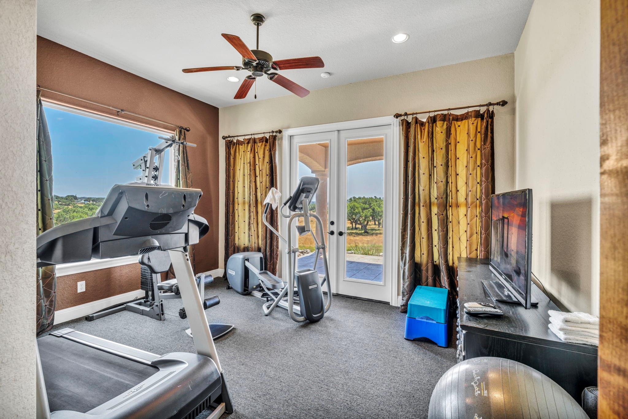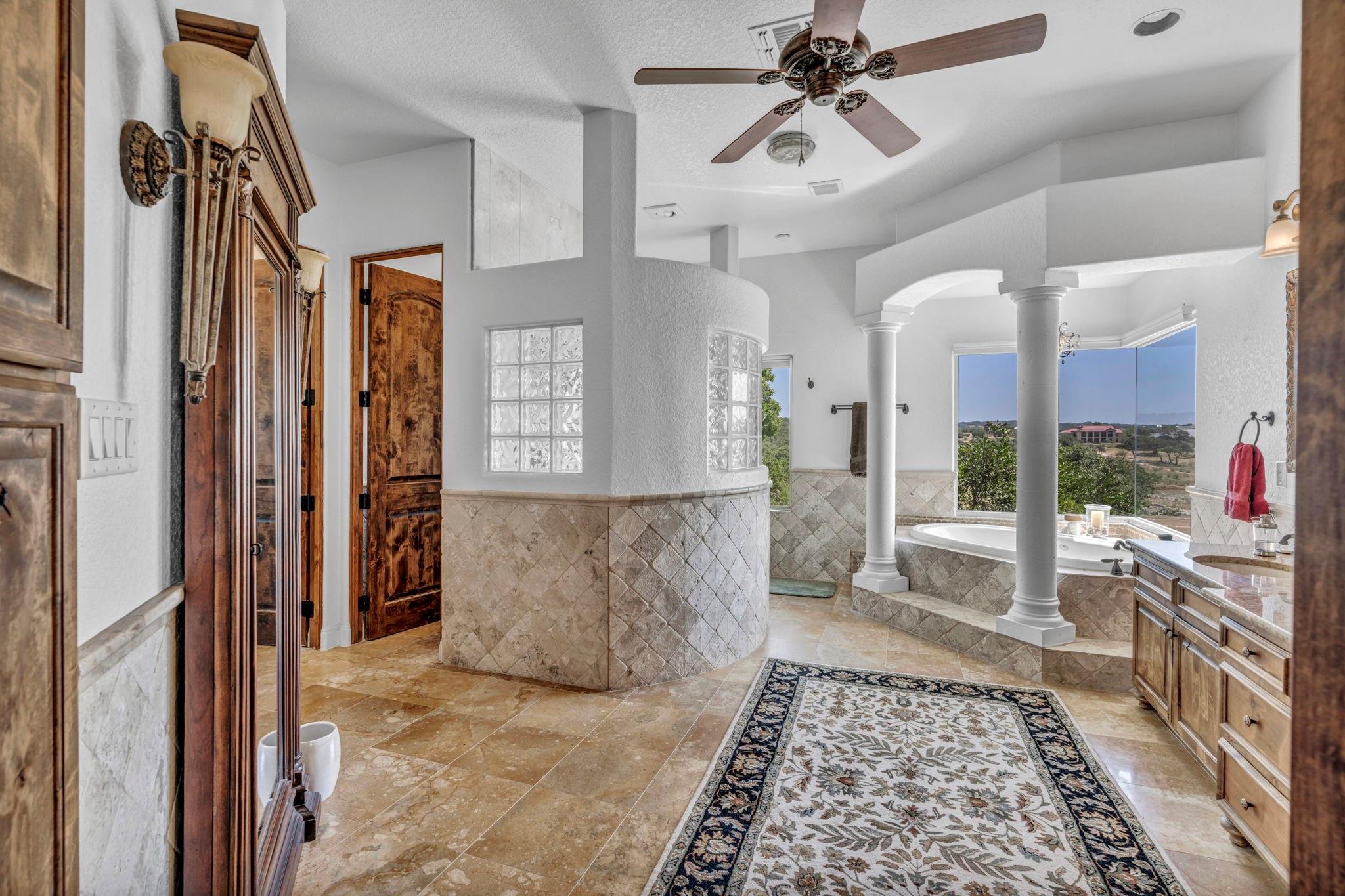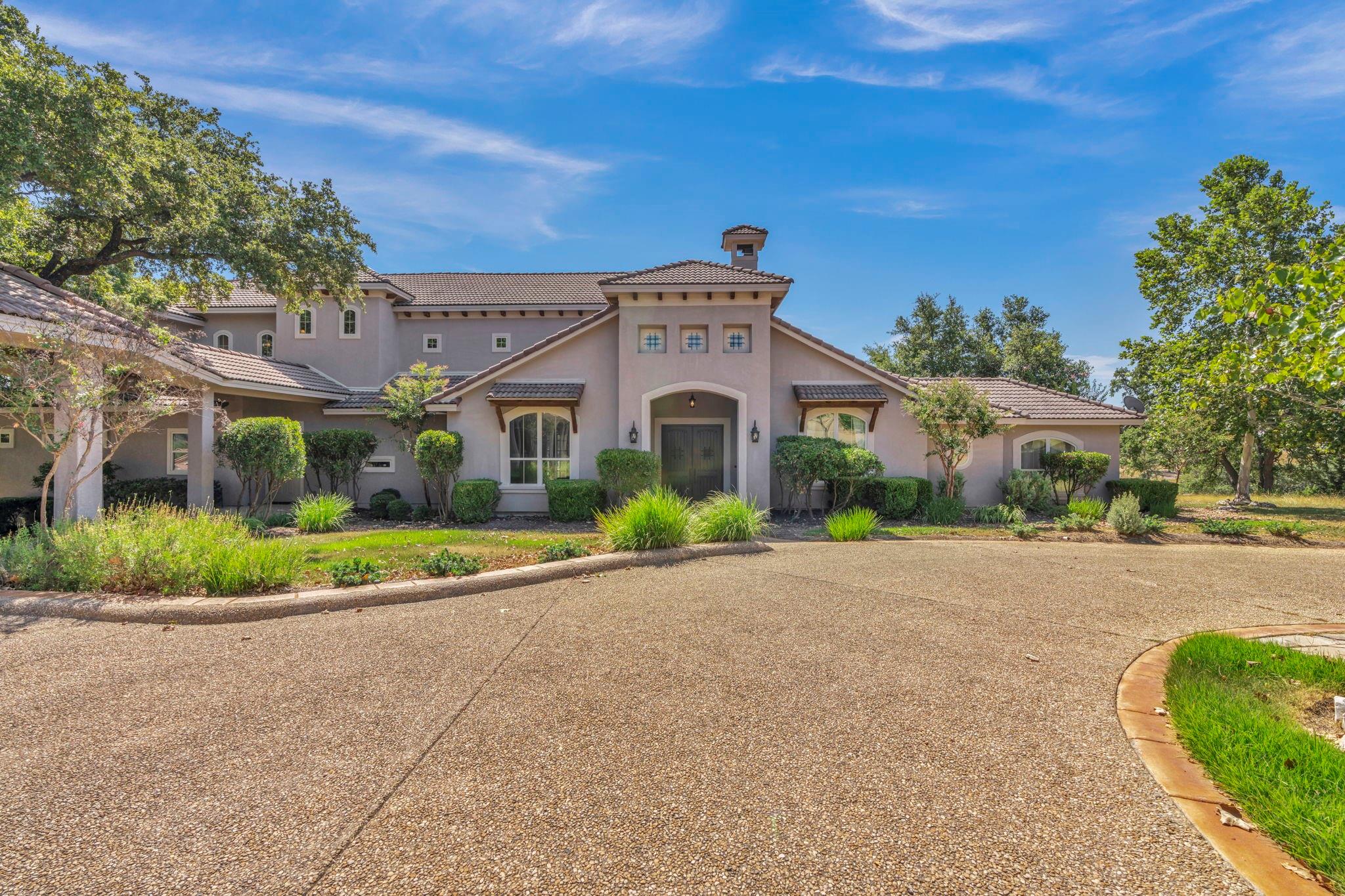 Welcome to this serene setting on Canyon Lake in the prestigious gated-community of the Peninsula at Mystic Shores. The 5.9 acres boasts mature landscaping (irrigated from a private well) of oaks and sycamores around the home and native plants and grasses down to the 500 ft of waterfront with private watercraft launch. The adjacent, buildable, 4-acre lot with an additional 500+ ft of waterfront is also available separately or can be bundled if desired to produce a 10-acre homestead with over 1000+ ft of lakefront. The 5300 sq ft Mediterranean home is perfect for entertaining or large family gatherings. The open-concept main living/dining/kitchen area has 25 ft vaulted ceilings with exposed beam trusses, stone fireplace and accents, alderwood built-ins, and sweeping lake views. His and her offices/libraries off the main living area provide flexible work-from-home options. The master suite consists of a luxurious bath with tub and shower, large walk-in closet with built-ins, and private exercise room. Additionally, there are two guest bedrooms with en suites on the main level and a third guest bedroom upstairs off the game room. Relax in the upstairs six-recliner custom movie room or soak in the Hill Country views from the upper porch off the bar-equipped game room. Enjoy the lake breezes on the covered lower back porch equipped with a fireplace, outdoor kitchen, and ceiling fans over both dining and sitting spaces. The view across the infinity pool and down the 7-mile lake expanse to Canyon dam is breathtaking. A covered breezeway leads from the mudroom/laundryroom to a 4-car garage with one bay large enough to accommodate a boat or other water toys. Don’t miss out on this rare opportunity to own multiple acres of gently sloping and highly accessible water frontage!