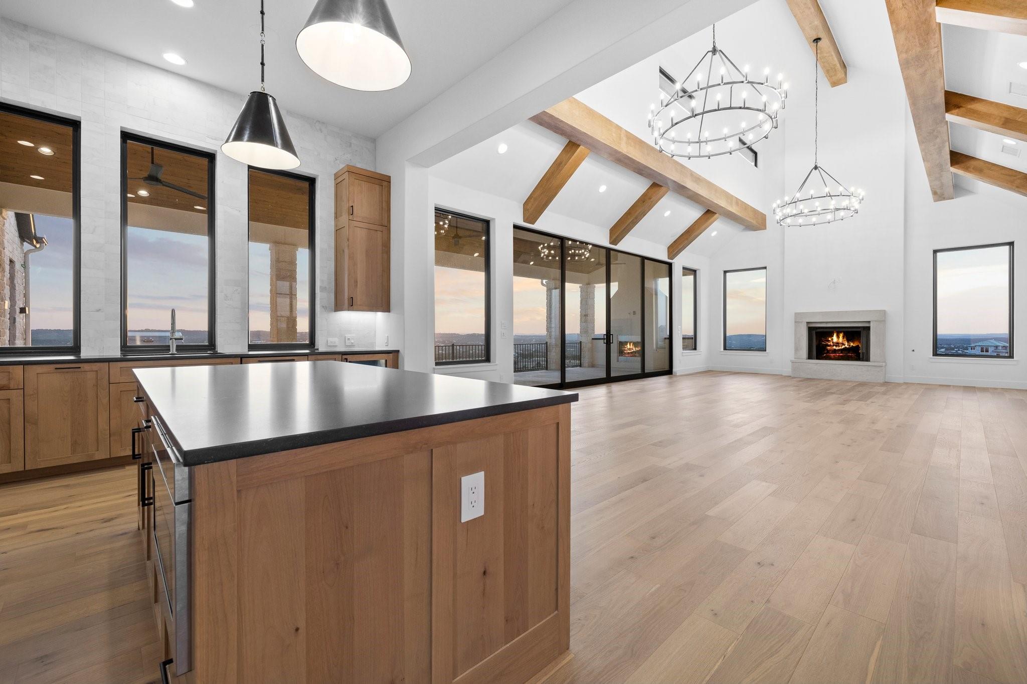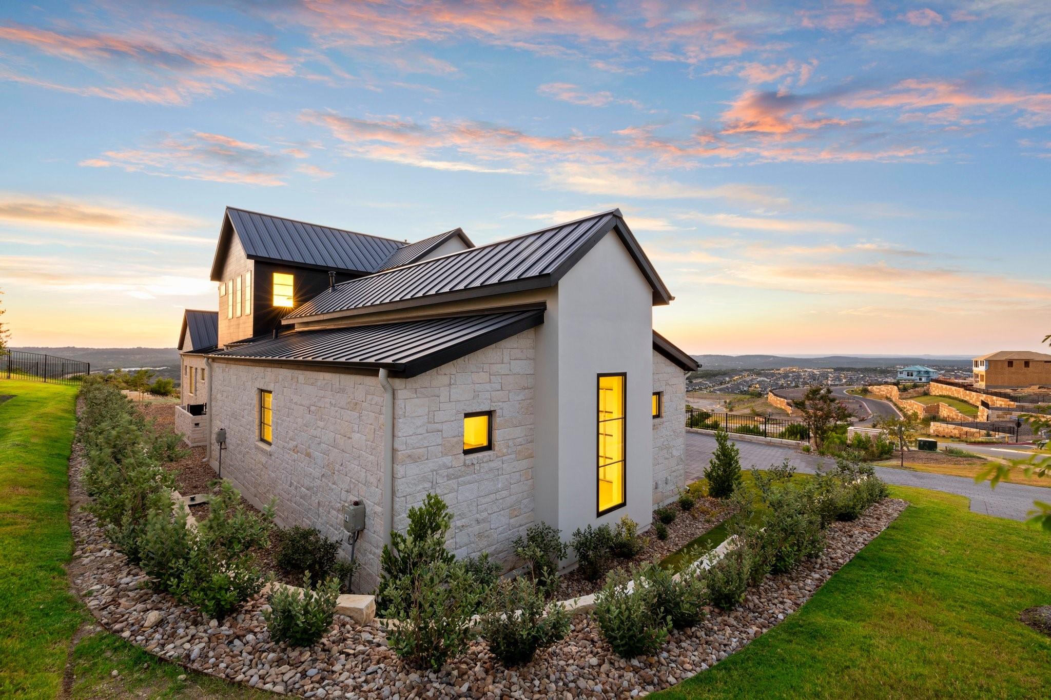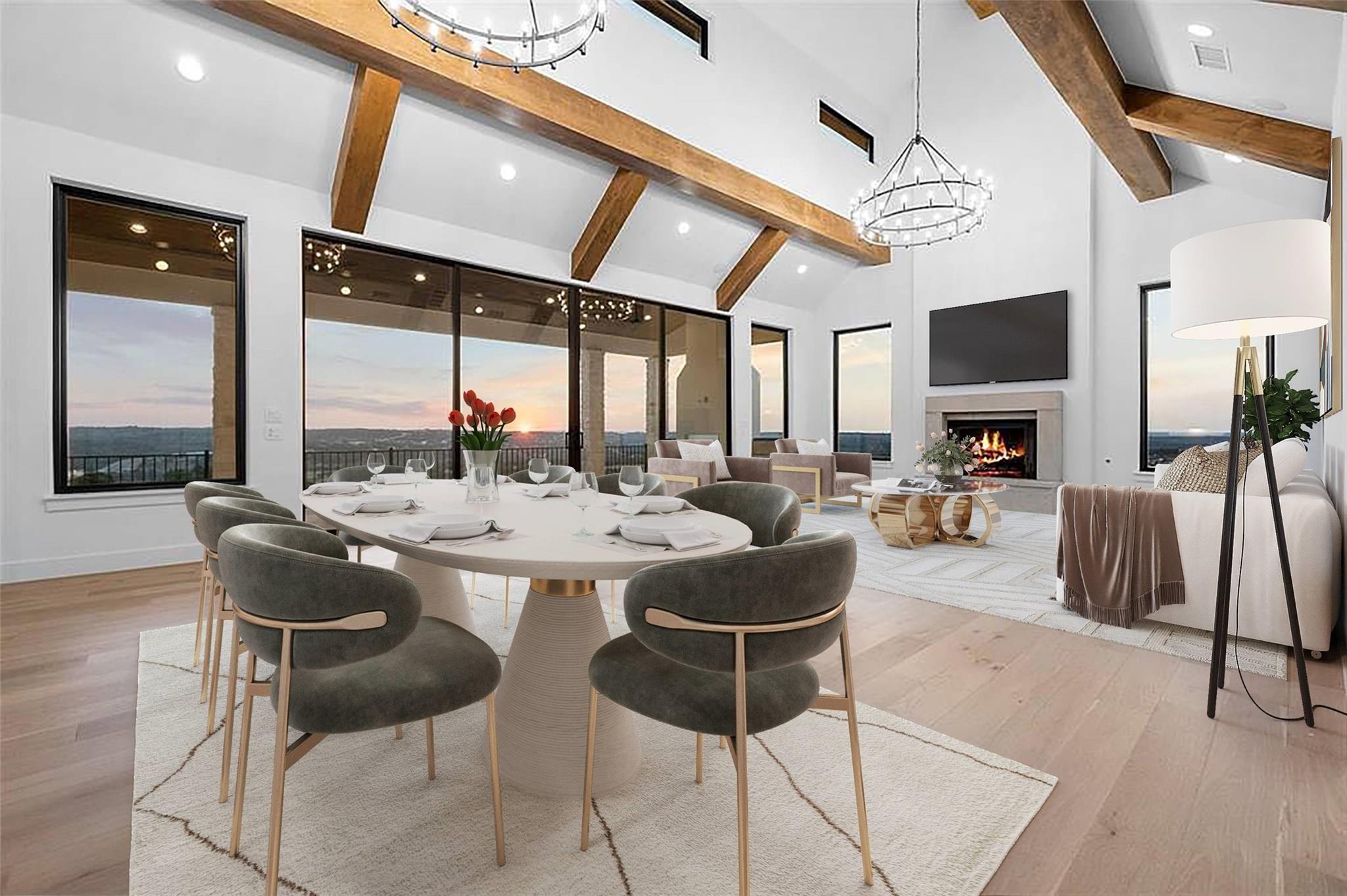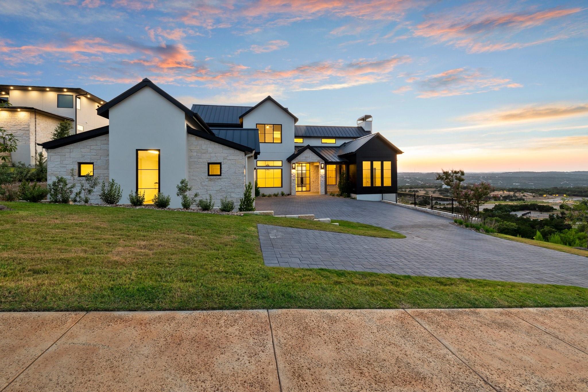 Panoramic views in Rough Hollow, this newly constructed home with captivating views is complete with 4 bedrooms, 4.5 baths, indoor/outdoor fireplaces, gameroom/media, office/flex, and 3-car oversized garage. The open flow between the kitchen, dining, and living room leading to the outdoor covered patio creates a perfect entertaining space. Attached 4th bedroom casita style allowing separate entry from front covered patio as well as interior from the entry gallery hallway. Vaulted ceilings throughout with clear alder beams and custom cabinetry throughout. Thermador appliances, wine refrigerator, gas grill and beverage center outdoor. Ready for move-in. Perfect views for future pool, concept design and information available, not part of sales price, see agent for more details.