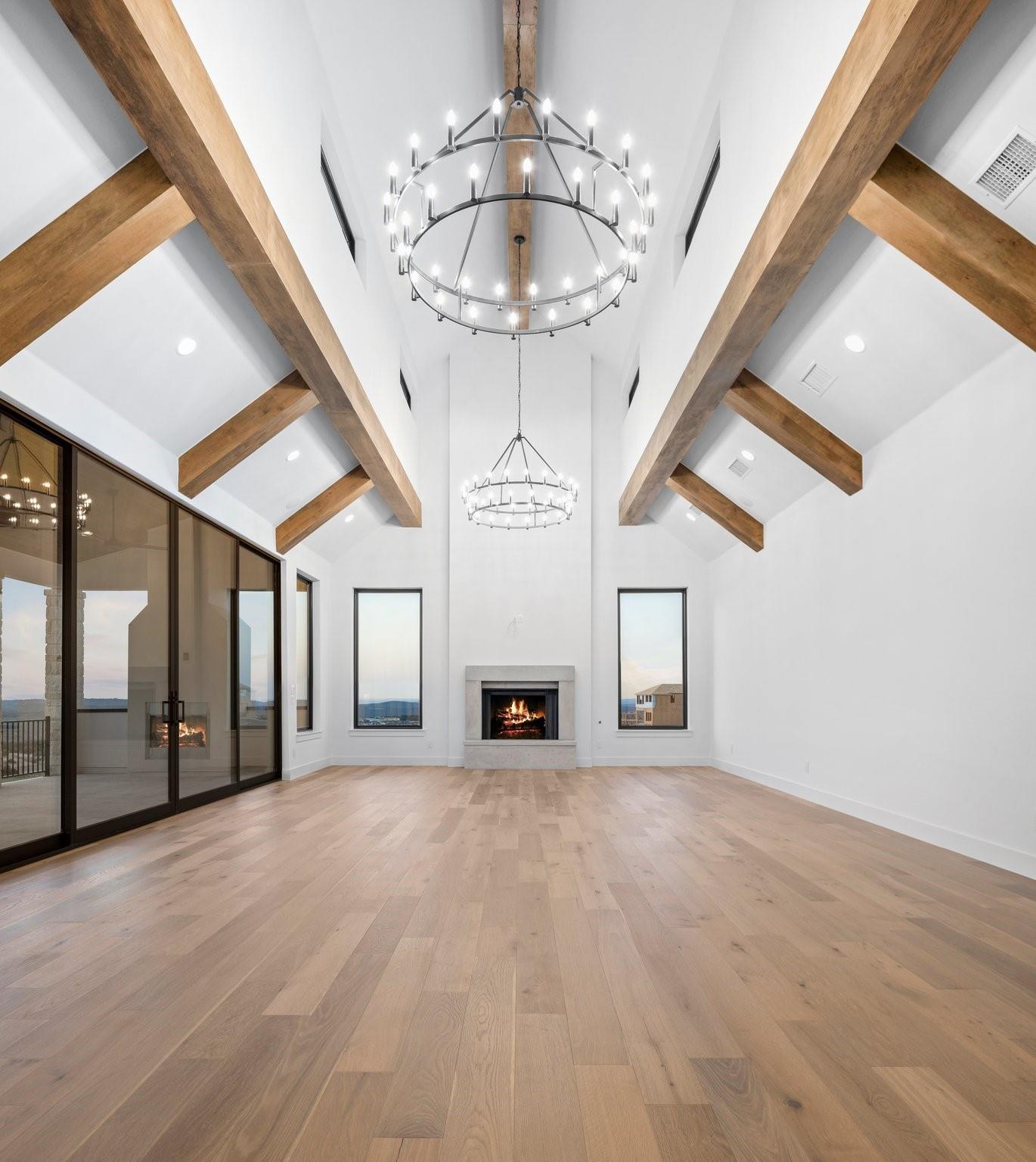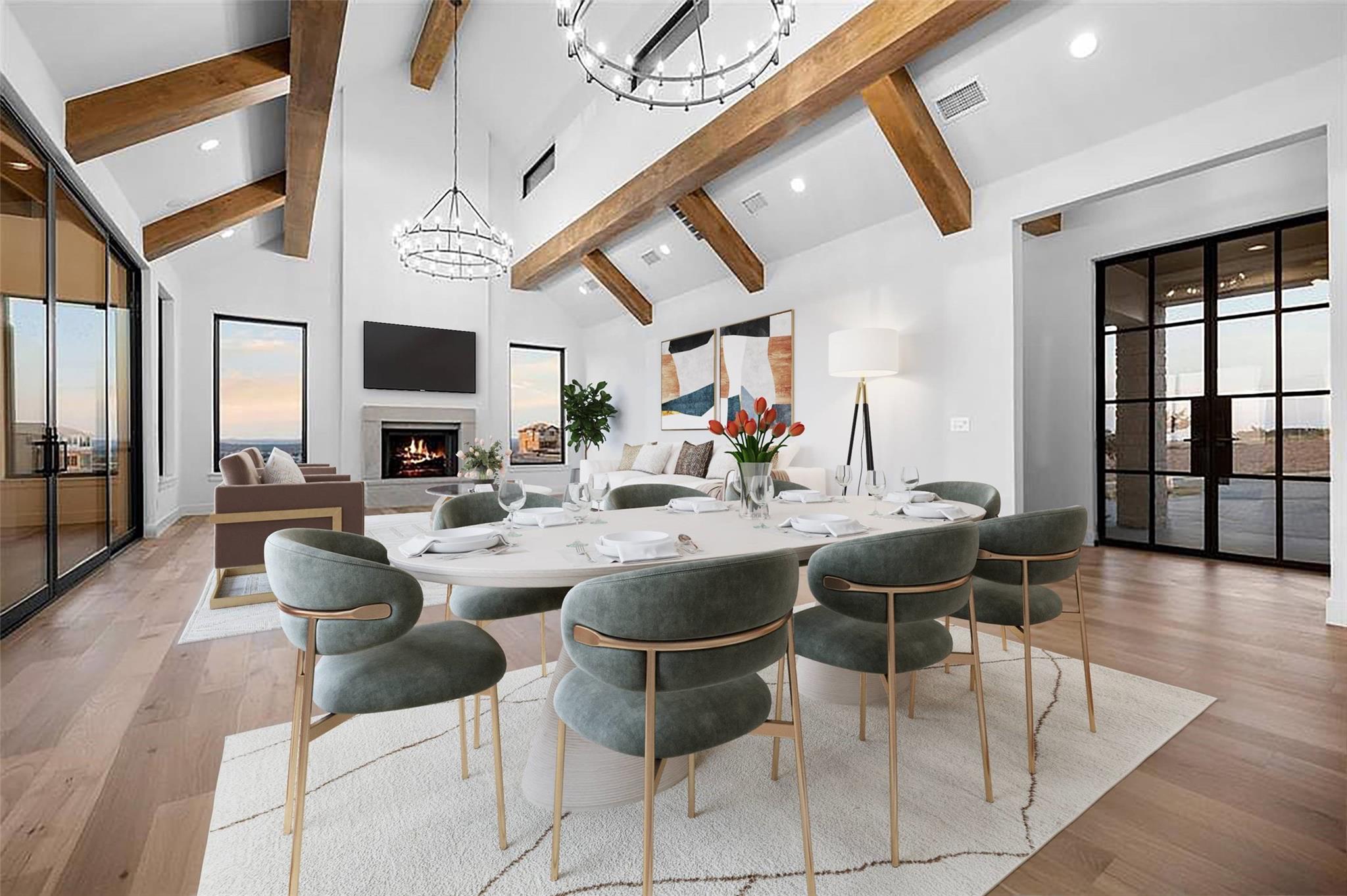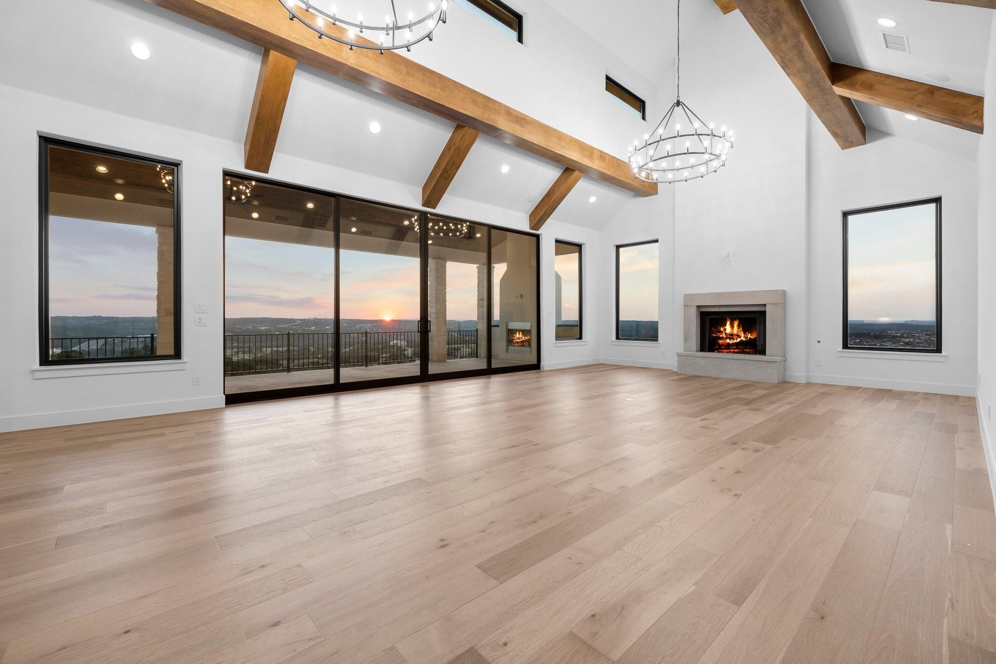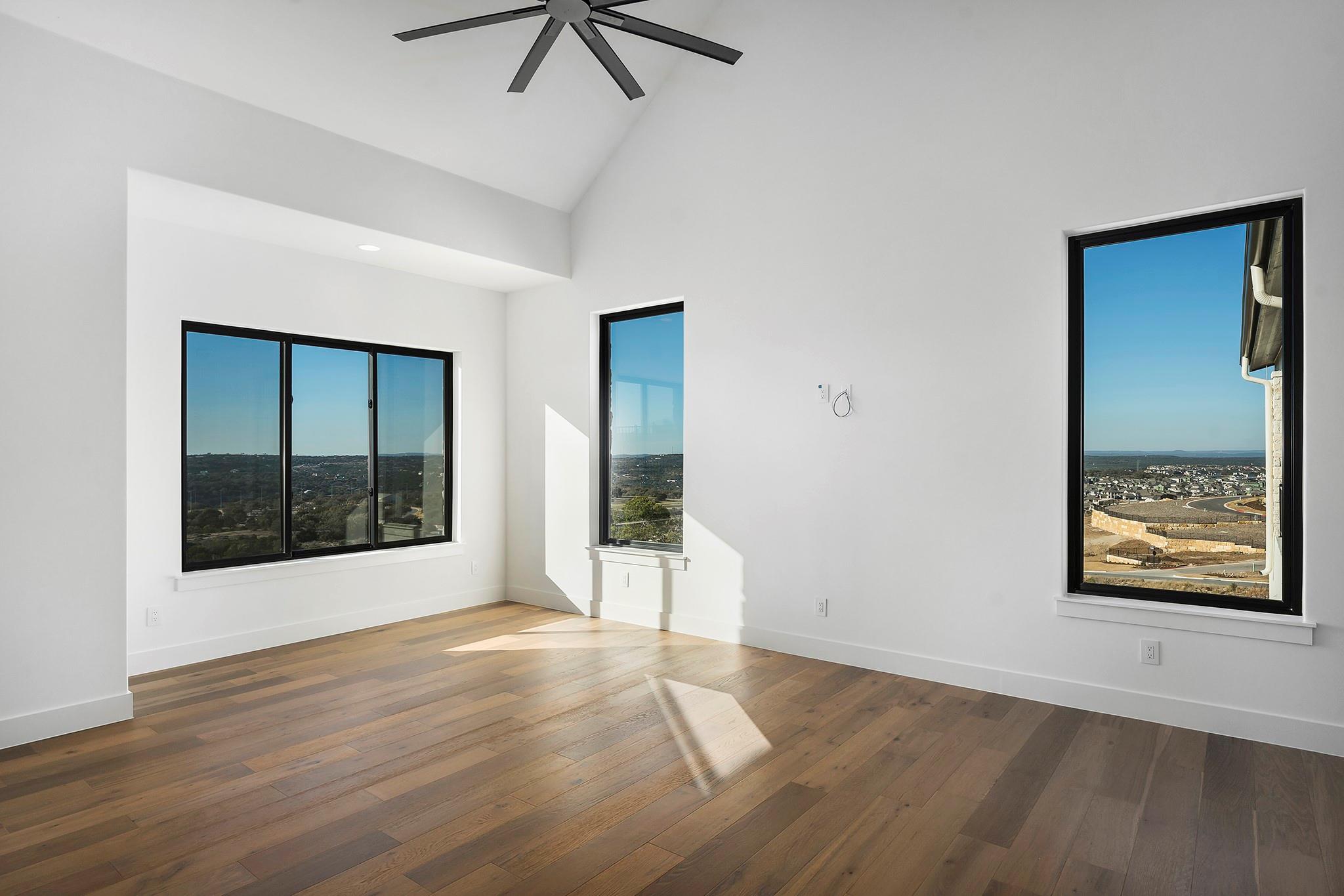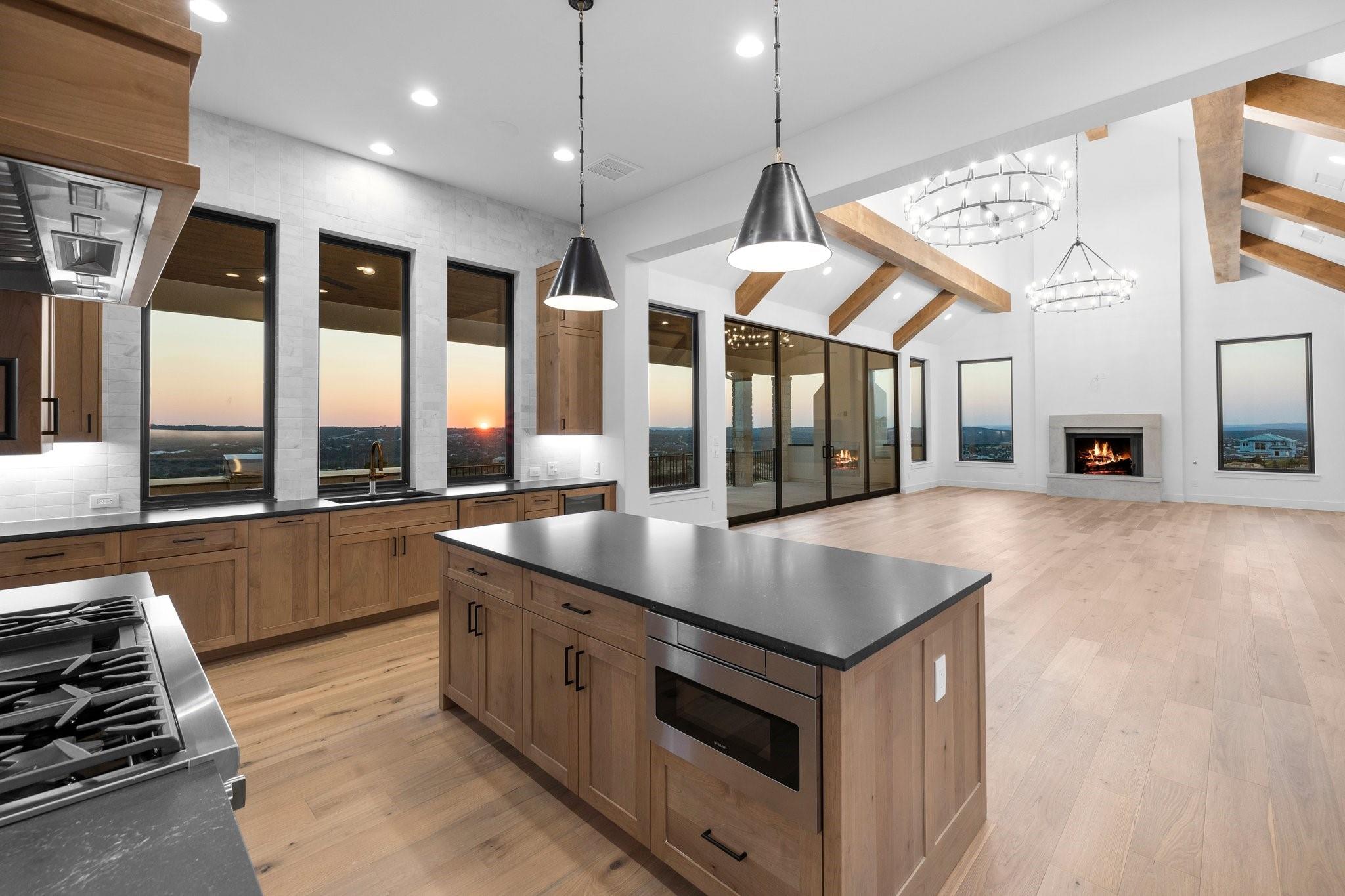Panoramic views in Rough Hollow, this newly constructed home with captivating views is complete with 4 bedrooms, 4.5 baths, indoor/outdoor fireplaces, gameroom/media, office/flex, and 3-car oversized garage. The open flow between the kitchen, dining, and living room leading to the outdoor covered patio creates a perfect entertaining space. Attached 4th bedroom casita style allowing separate entry from front covered patio as well as interior from the entry gallery hallway. Vaulted ceilings throughout with clear alder beams and custom cabinetry throughout. Thermador appliances, wine refrigerator, gas grill and beverage center outdoor. Ready for move-in. Perfect views for future pool, concept design and information available, not part of sales price, see agent for more details.