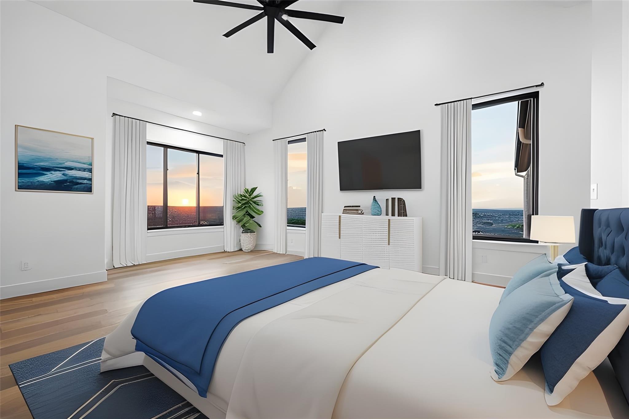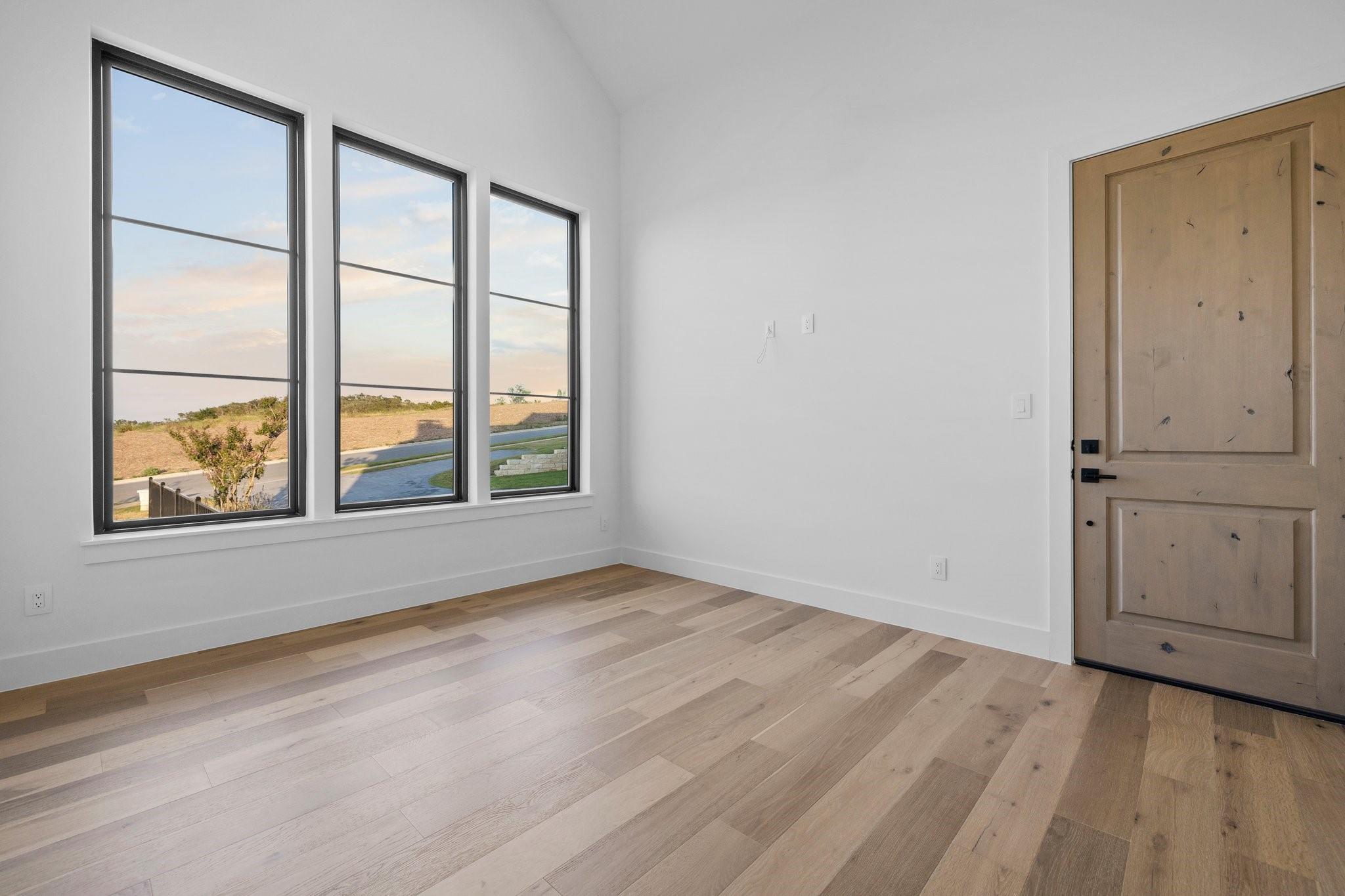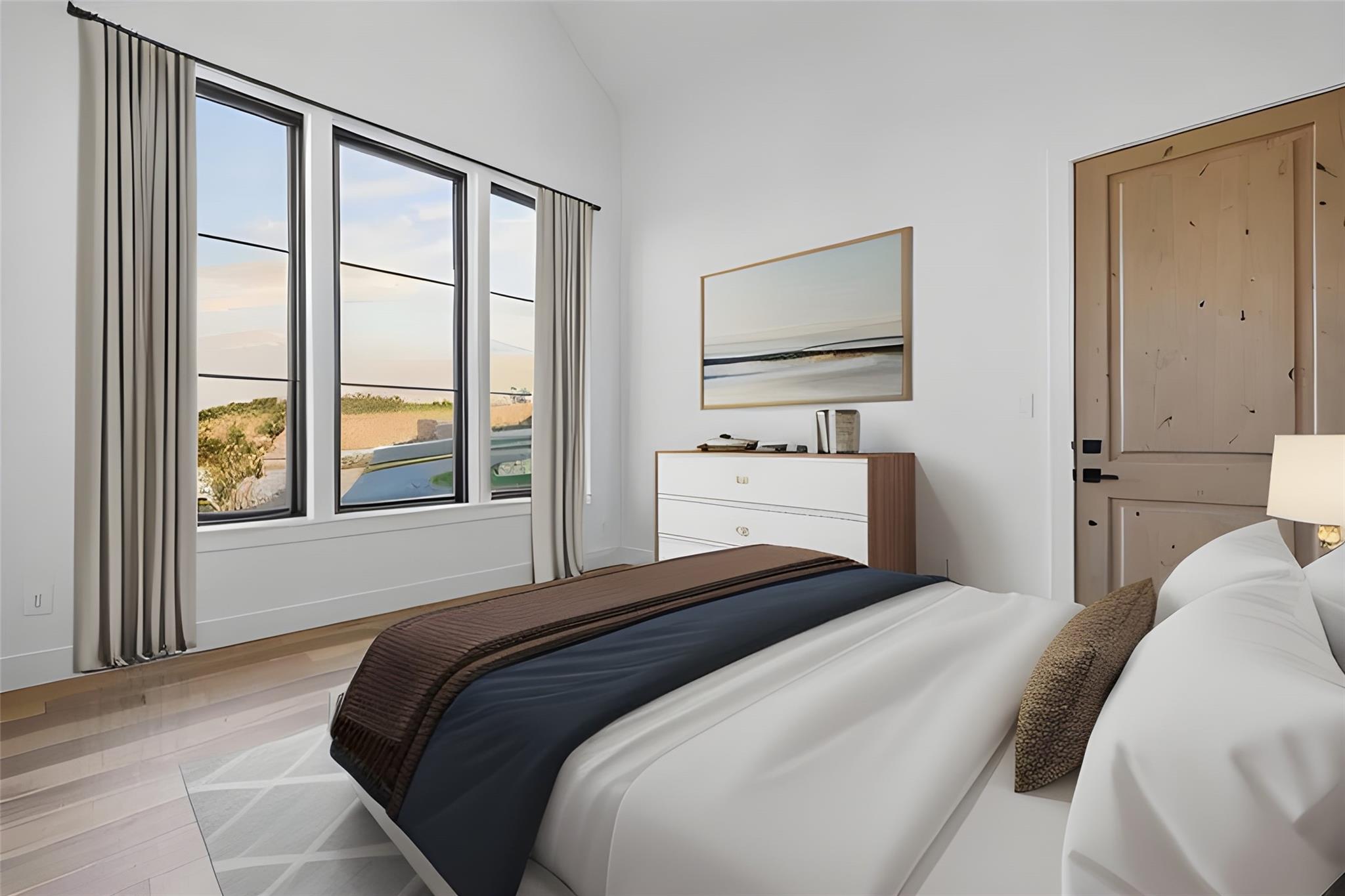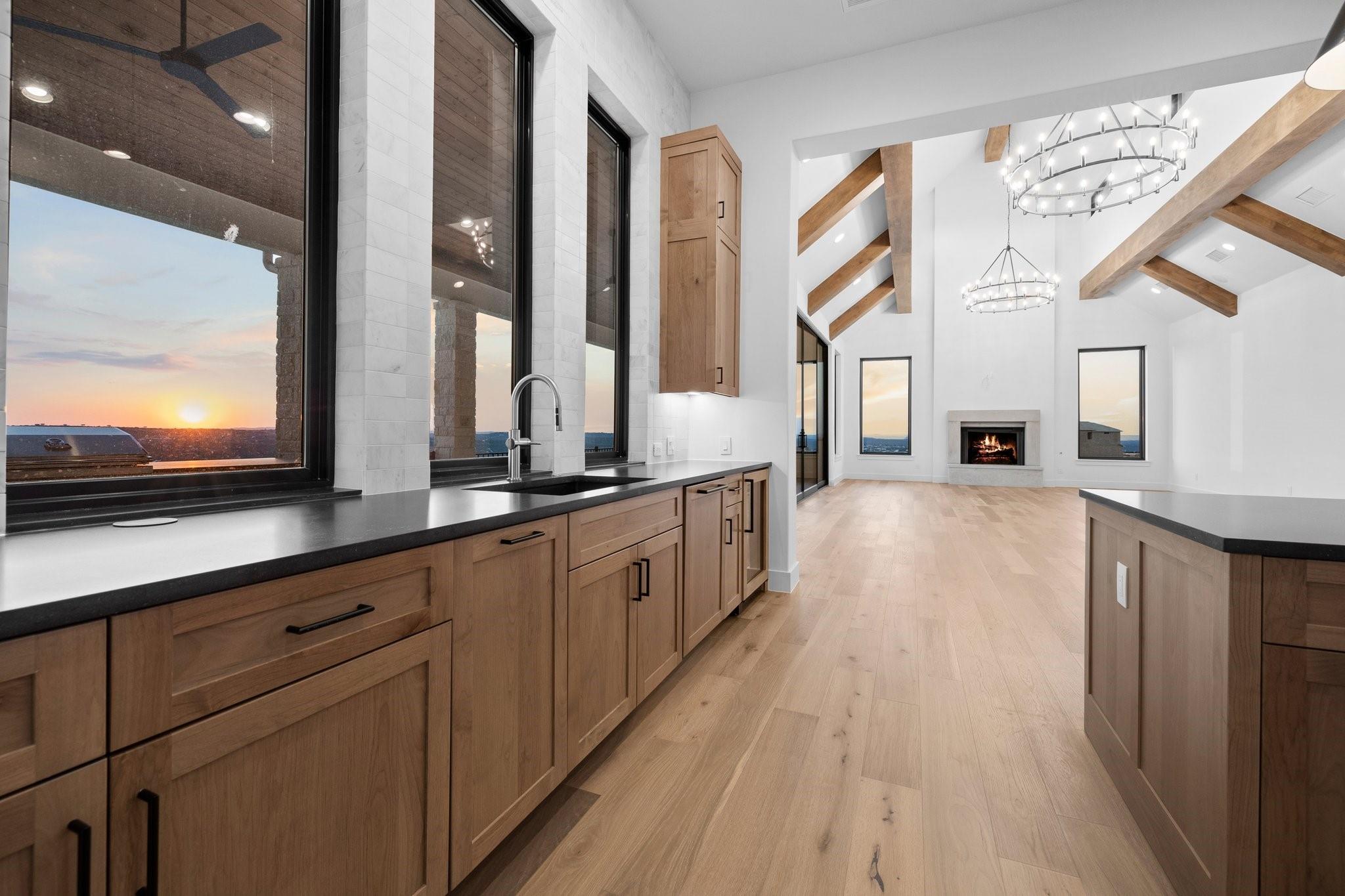Panoramic views in Rough Hollow, this newly constructed home with captivating views is complete with 4 bedrooms, 4.5 baths, indoor/outdoor fireplaces, gameroom/media, office/flex, and 3-car oversized garage. The open flow between the kitchen, dining, and living room leading to the outdoor covered patio creates a perfect entertaining space. Attached 4th bedroom casita style allowing separate entry from front covered patio as well as interior from the entry gallery hallway. Vaulted ceilings throughout with clear alder beams and custom cabinetry throughout. Thermador appliances, wine refrigerator, gas grill and beverage center outdoor. Ready for move-in. Perfect views for future pool, concept design and information available, not part of sales price, see agent for more details.