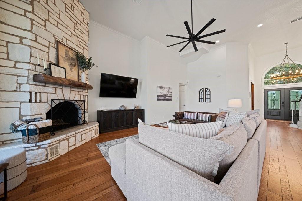 | Interior Features | Bookcases, Breakfast Bar, Ceiling Fan(s), Cathedral Ceiling(s), High Ceilings, Chandelier, Granite Counters, Quartz Counters, Crown Molding, Entrance Foyer, High Speed Internet, Kitchen Island, Primary Bedroom on Main, Smart Thermostat, Sound System, Walk-In Closet(s) | |