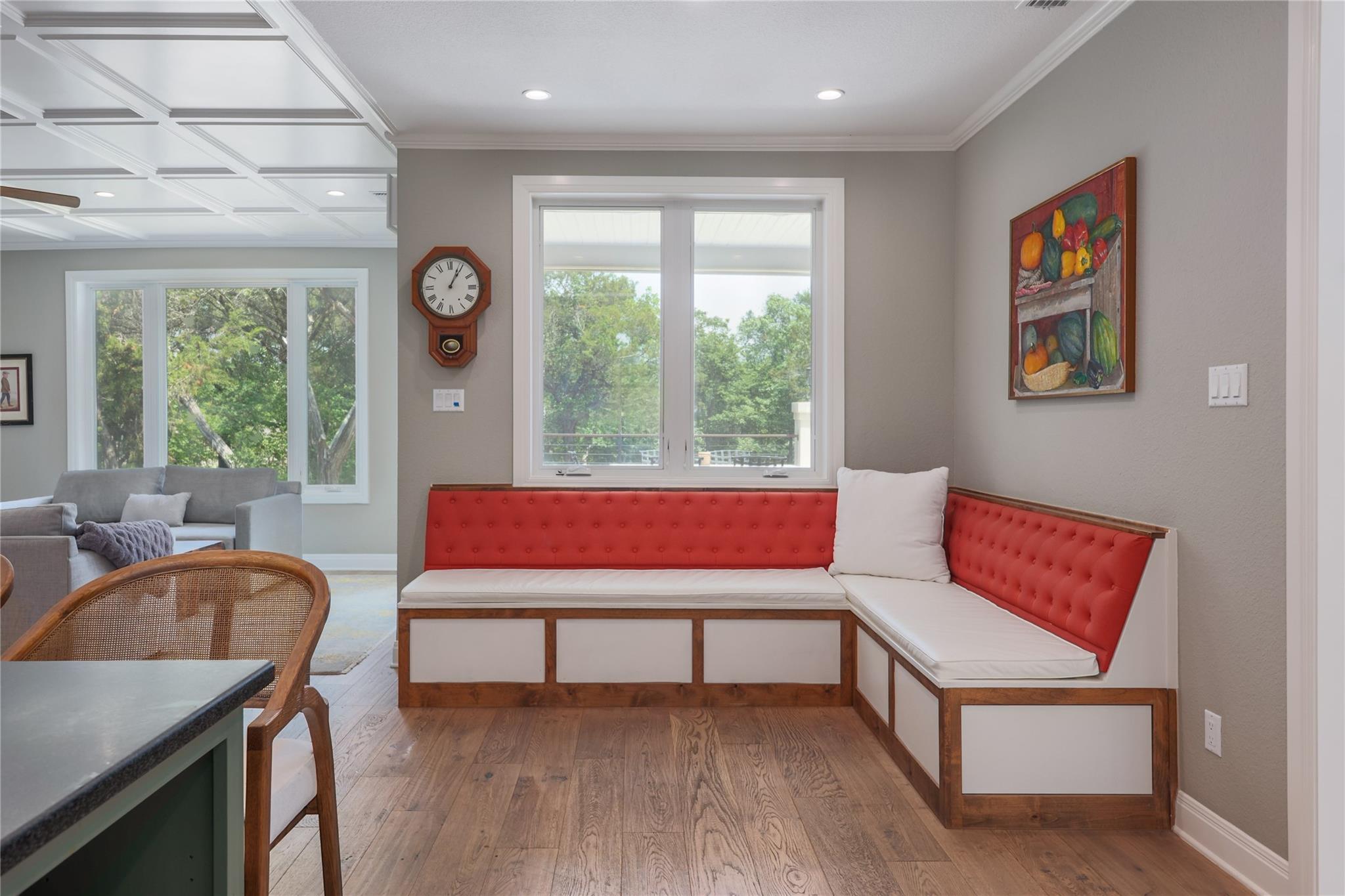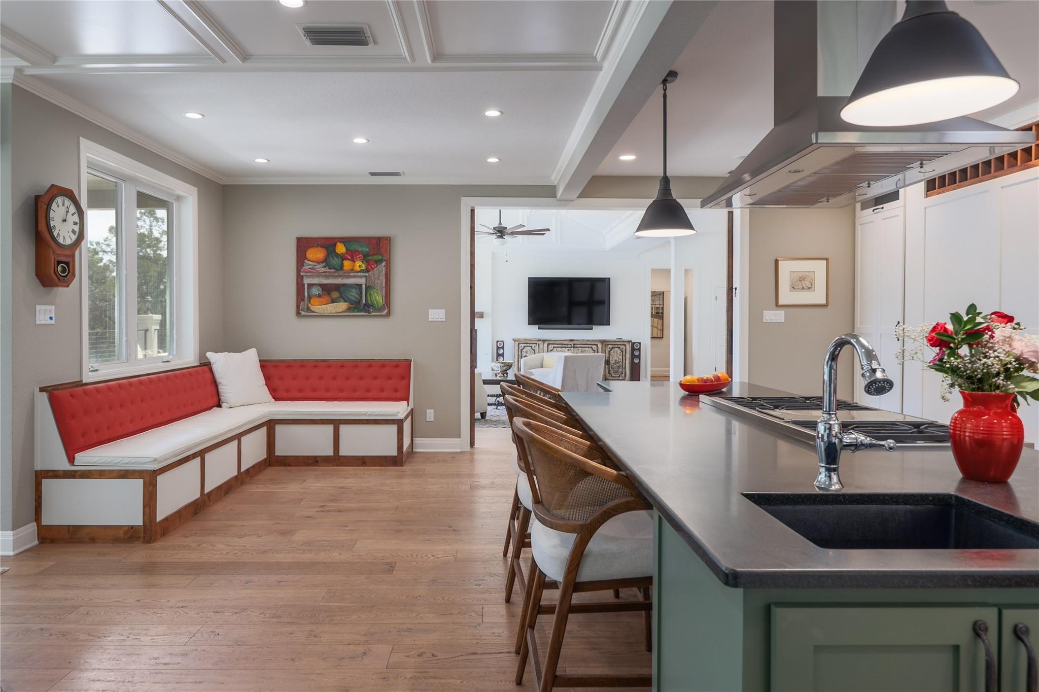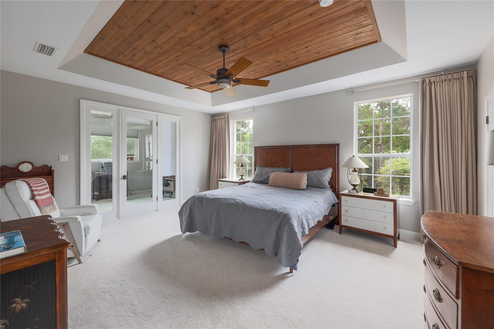 | Interior Features | Breakfast Bar, Cedar Closet(s), Ceiling Fan(s), Coffered Ceiling(s), High Ceilings, Tray Ceiling(s), Vaulted Ceiling(s), Granite Counters, Double Vanity, Electric Dryer Hookup, Gas Dryer Hookup, Eat-in Kitchen, Entrance Foyer, High Speed Internet, In-Law Floorplan, Kitchen Island, Multiple Dining Areas, Multiple Living Areas, No Interior Steps, Open Floorplan, Pantry, Primary Bedroom on Main, Storage, Walk-In Closet(s), Washer Hookup, Wired for Sound | |