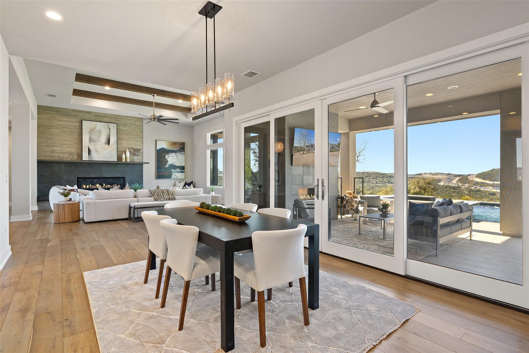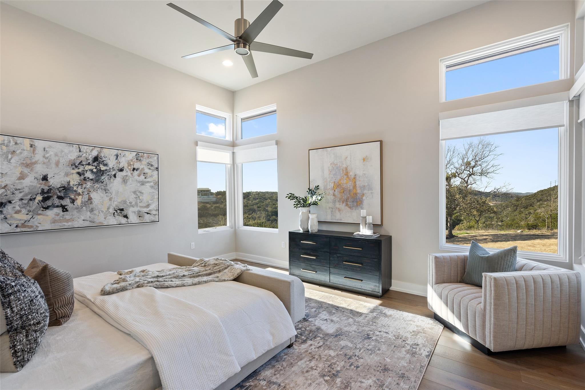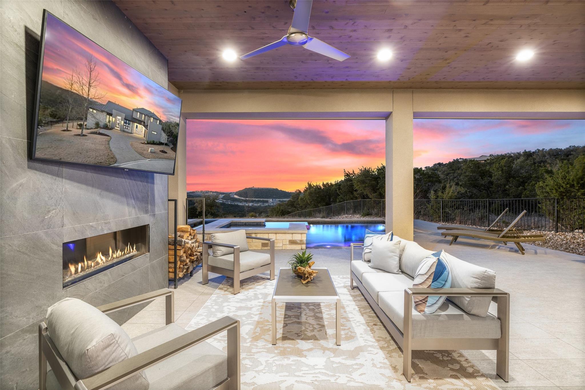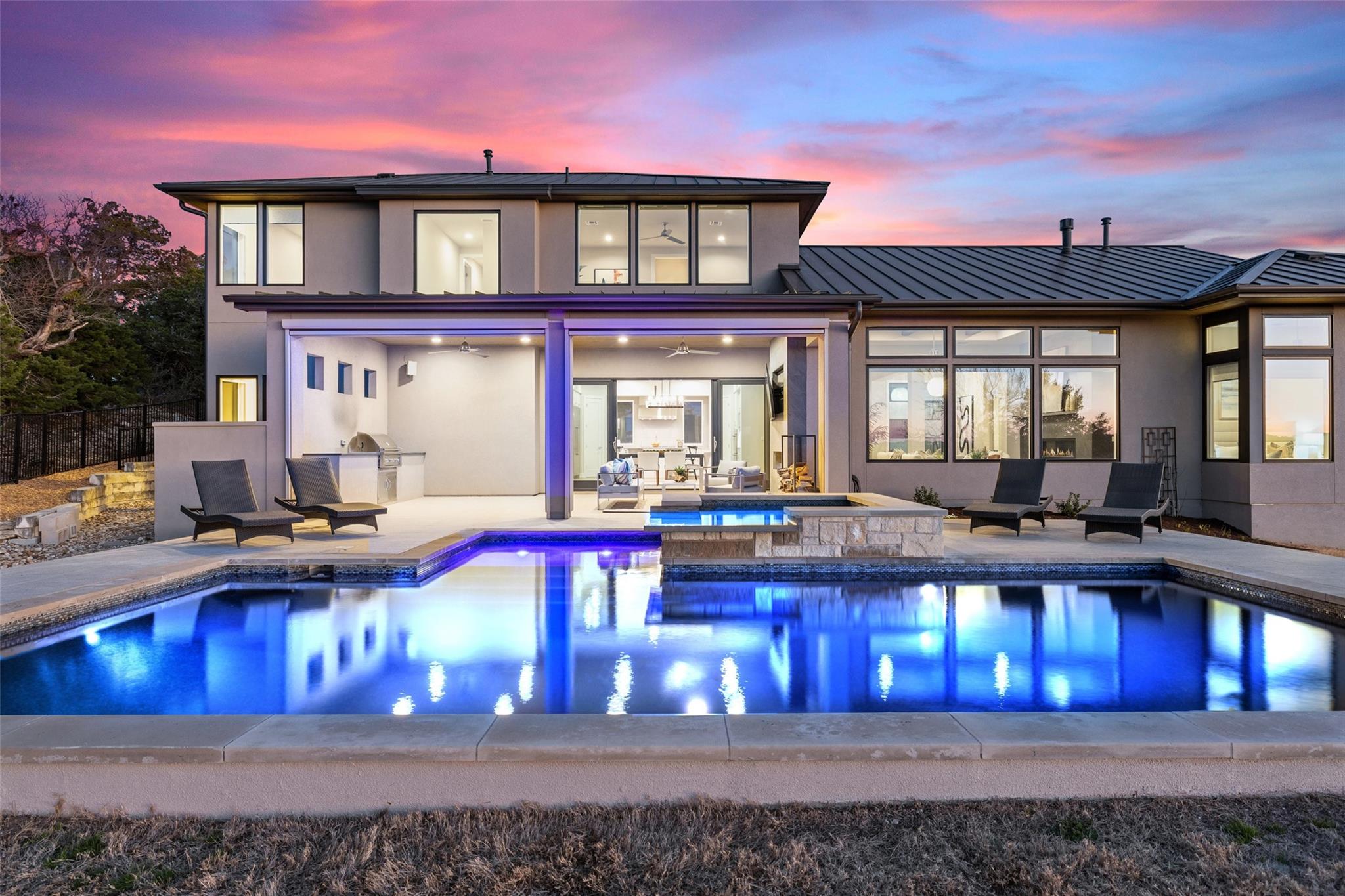 Welcome to 513 Bowcross Point, stunning modern estate living, situated on .75 acre lot in the highly sought after Serene Hills neighborhood. Panoramic and unobstructed hill country views, this custom home is one of a kind. The residence features an open floor plan encompassing 4466 square feet, offering 5 bedrooms, 4.5 bathrooms, separate office, game room and spacious layout. Meticulously crafted and built by Eppright, this home is designed for the perfect harmony of contemporary and comfortable living. Oversized windows throughout offer the perfect blend of natural lighting. The gourmet kitchen, an entertainer's delight features top-of-the-line appliances, double walk-in pantry, and grand island for hosting guests. The main level boasts a private office, guest room and primary retreat. Upstairs you will find three additional rooms and a versatile game room overlooking the backyard oasis. On its very own wing, meander to and rejuvenate in the luxurious primary suite where you will be met with a spa like bath, dual vanities, oversized soaking tub and spacious closet boasting plenty of storage. This sprawling estate and captivating floor plan welcomes an abundance of indoor / outdoor living with breathtaking surroundings. Soaring floor-to-ceiling windows and grand sliders open up to serene living. A massive, covered patio with built in BBQ and fireplace awaits. Enjoy the tranquility and beauty of a sparkling pool and spa. Stroll down a ways to find a huge yard for play and lush natural landscape where you will be met with an outdoor fire pit for gatherings and chasing sunsets.