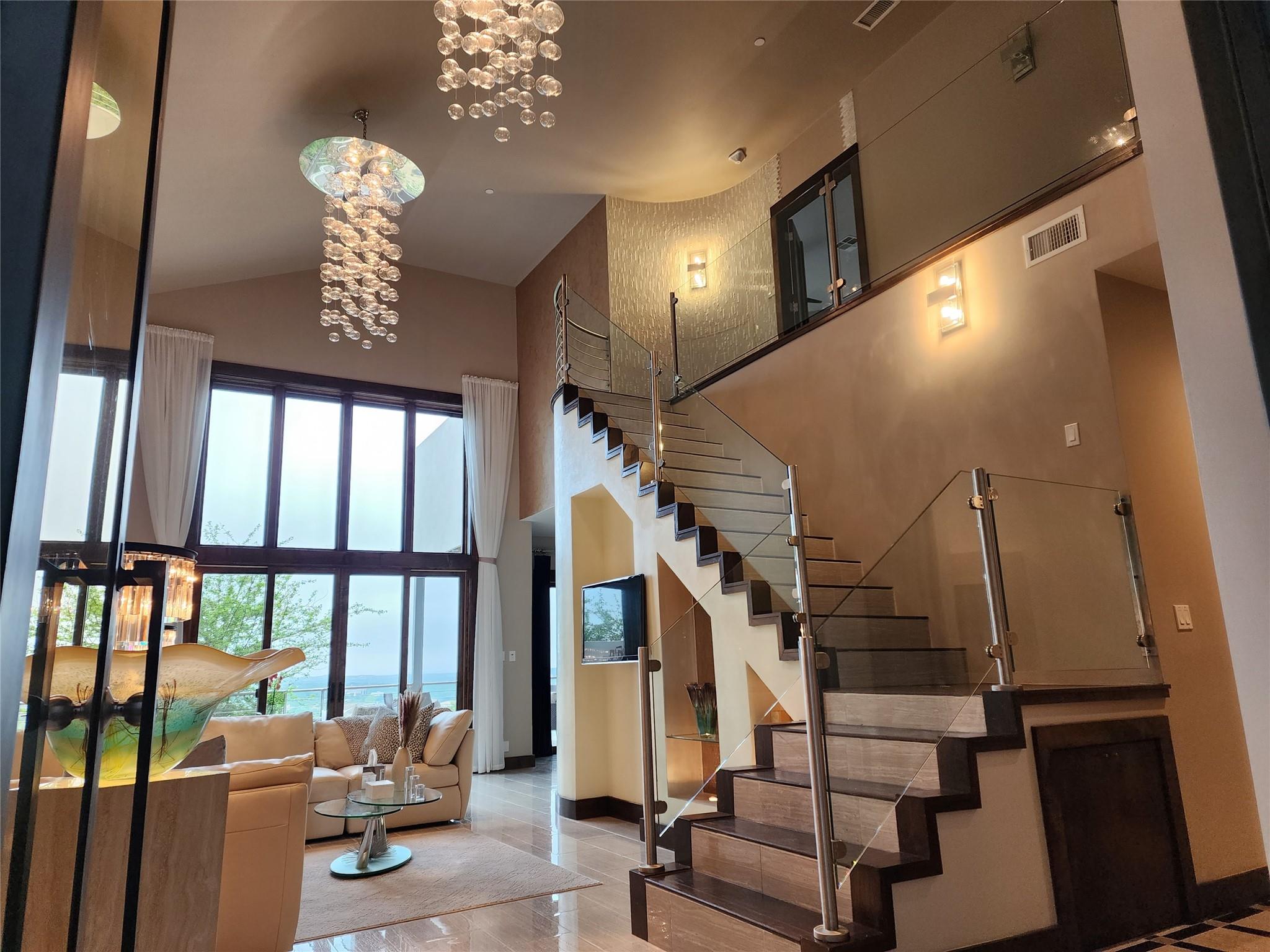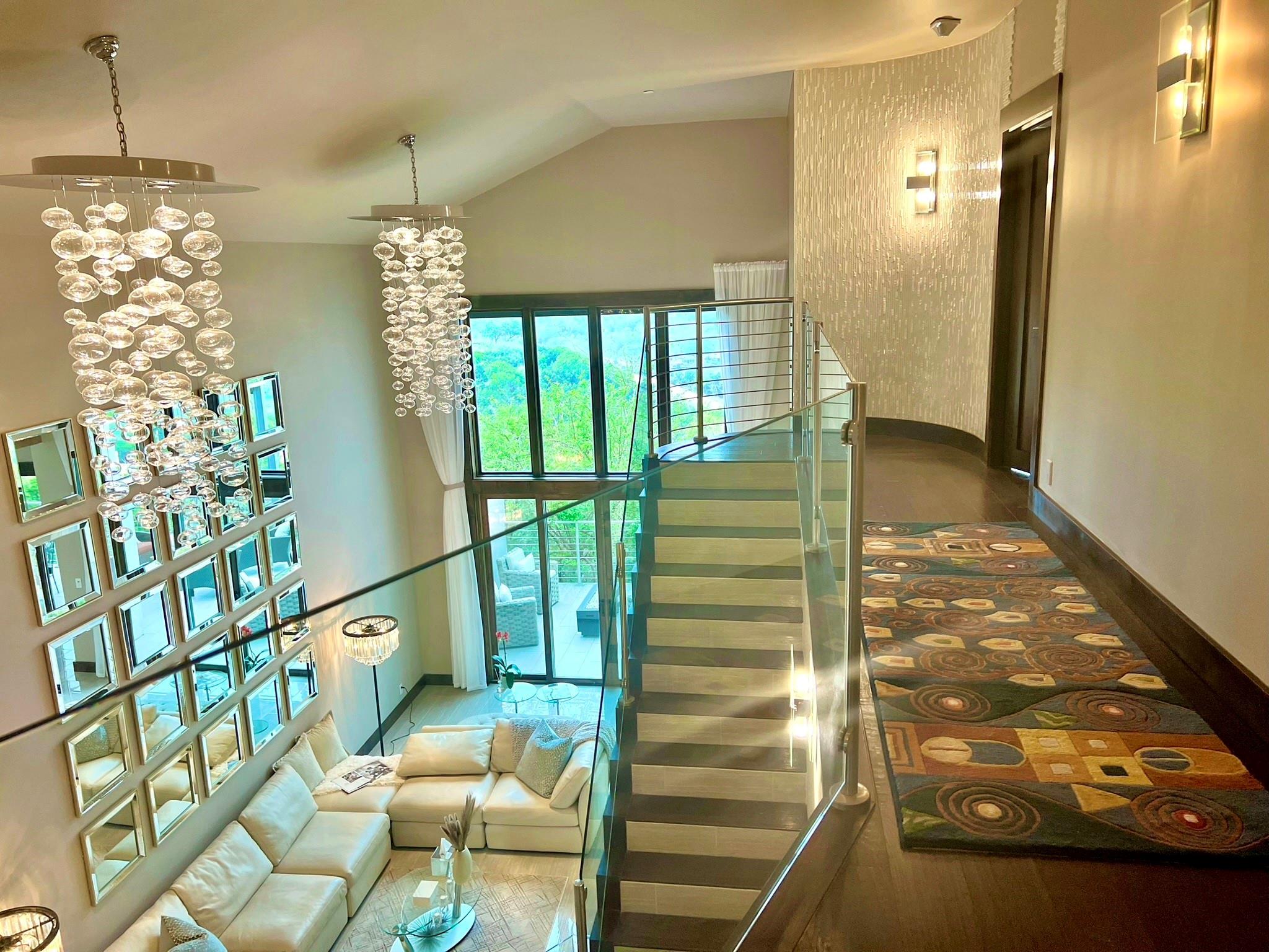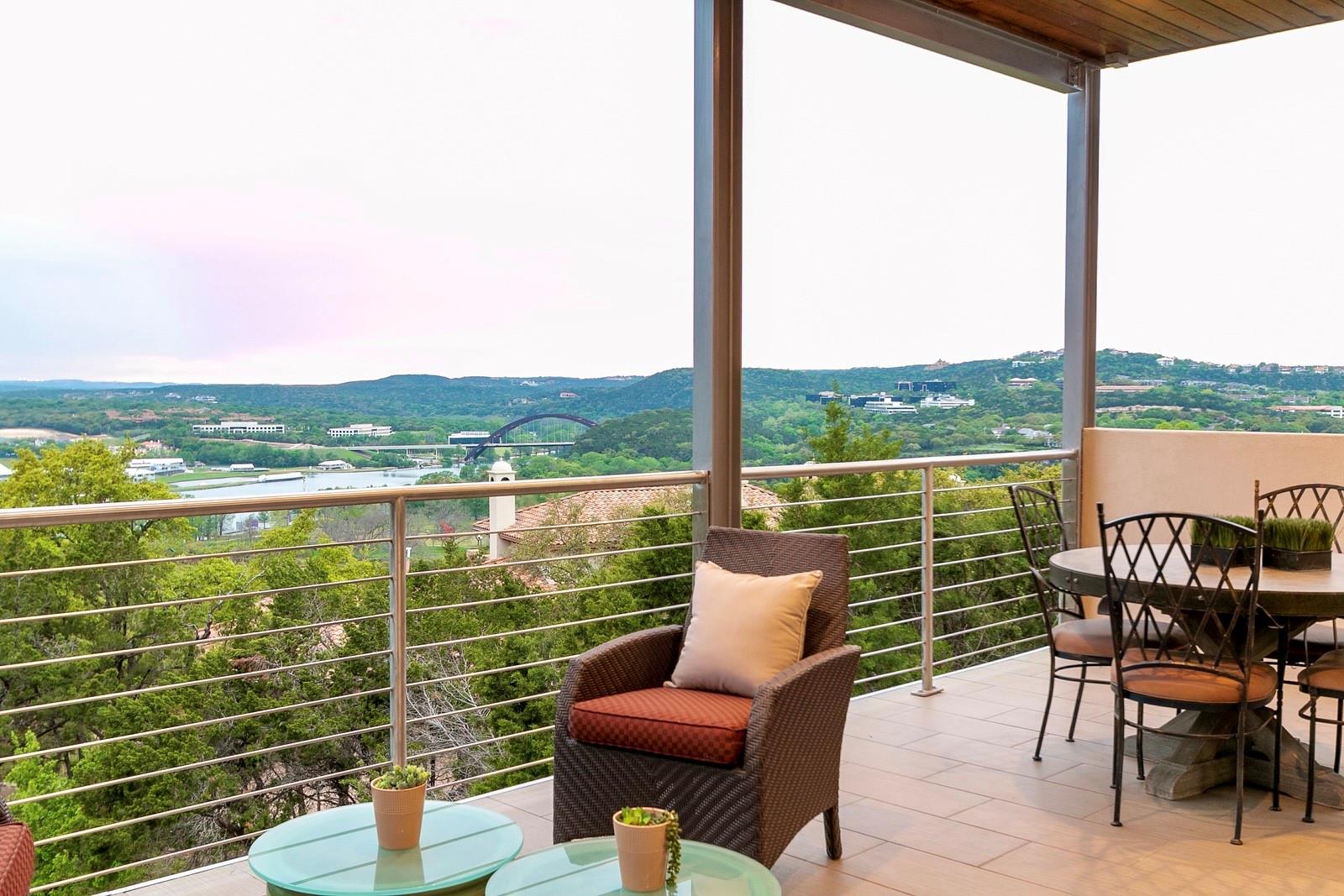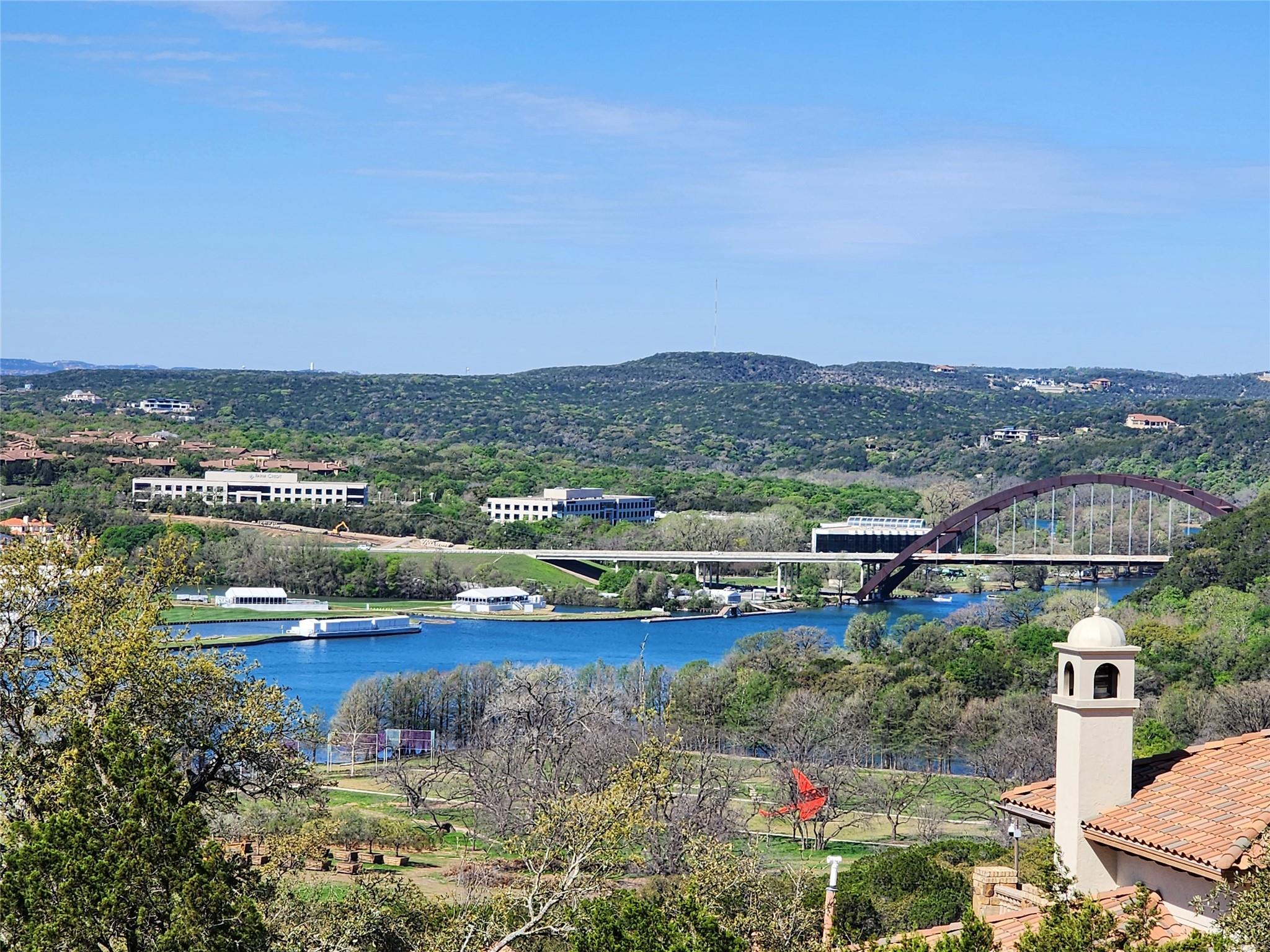Reduced by 200K~Sunset/Lake Views from Three Deck/Patios~Perfectly perched in the Hills of Cat Mountain, this beautiful custom home offers modern luxury at the heart of Northwest Hills~unparalleled views of Lake Austin, Pennybacker Bridge & Austin Country Club~ move-in ready masterpiece w/magazine-worthy finishings, jaw-dropping views & dazzling light fixtures curated by Lights Fantastic. Main level features expansive open floor plan w/ gourmet kitchen including Kotty Alder cabinetry, spacious bi-level kitchen island w/ seating, full wet bar, Bosch & Thermador Appliances. Down the hall, are 2 bedrooms & an exquisite all-marble full bathroom. Laundry room directly accesses over-sized garage (18" wide overhead door), side-by-side parking & built-in cabinets providing abundant storage. The living & dining rooms feature glamorous light fixtures anchored by dramatic ceiling heights, a sleek floor-to-ceiling tiled accent wall w/ fireplace, wall-to-wall sliding doors perfectly frame spectacular bridge & lake views while allowing direct access to patio. Take the beautifully crafted glass ballister staircase to upper level & enter the primary suite. Primary hosts private view terrace, luxury ZaZa tile accent wall, floor-to-ceiling tile wall w/ fireplace. The lavish ensuite bathroom drips in opulence w/ its ceiling fountain fill garden jetted tub & massive glass shower w/ built-in steamer. Glide past the floating vanities to enter the custom-built California closet. Down the hall, pass the mezzanine glass walkway & enter the 2nd ensuite bedroom featured on this floor, considerably sized w/ custom walk-in closet & full bathroom. Accessible by elevator or stairs from the main level is the lower level, featuring as a private suite w/ 2 generously sized bedrooms, a jack & jill handicap accessible full bathroom, full kitchen, dining, & living room w/ direct patio access. Backyard allows direct access to storage room & greenbelt. All patios in home are steel framed.
