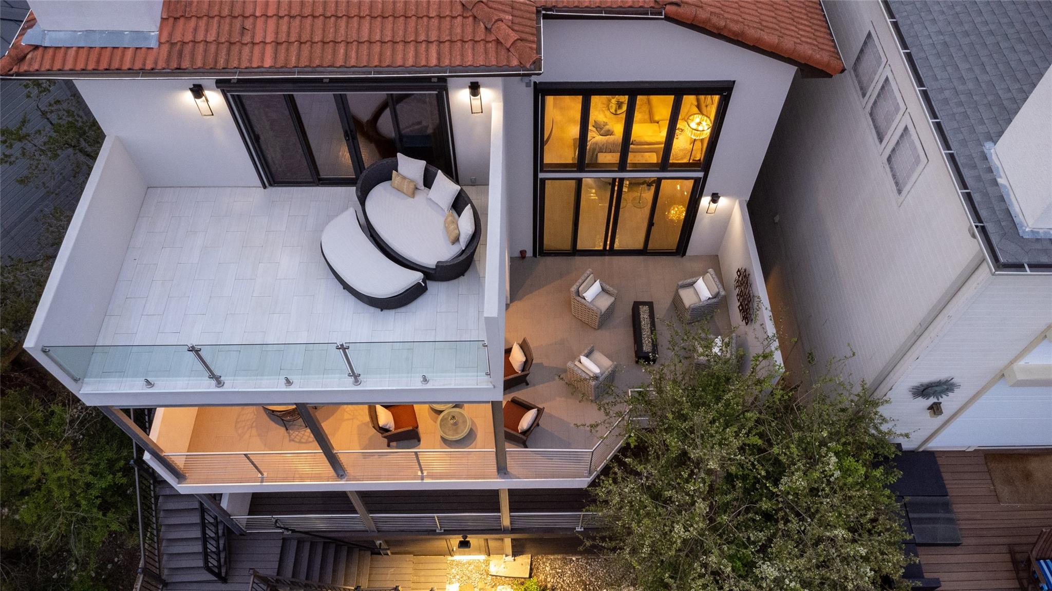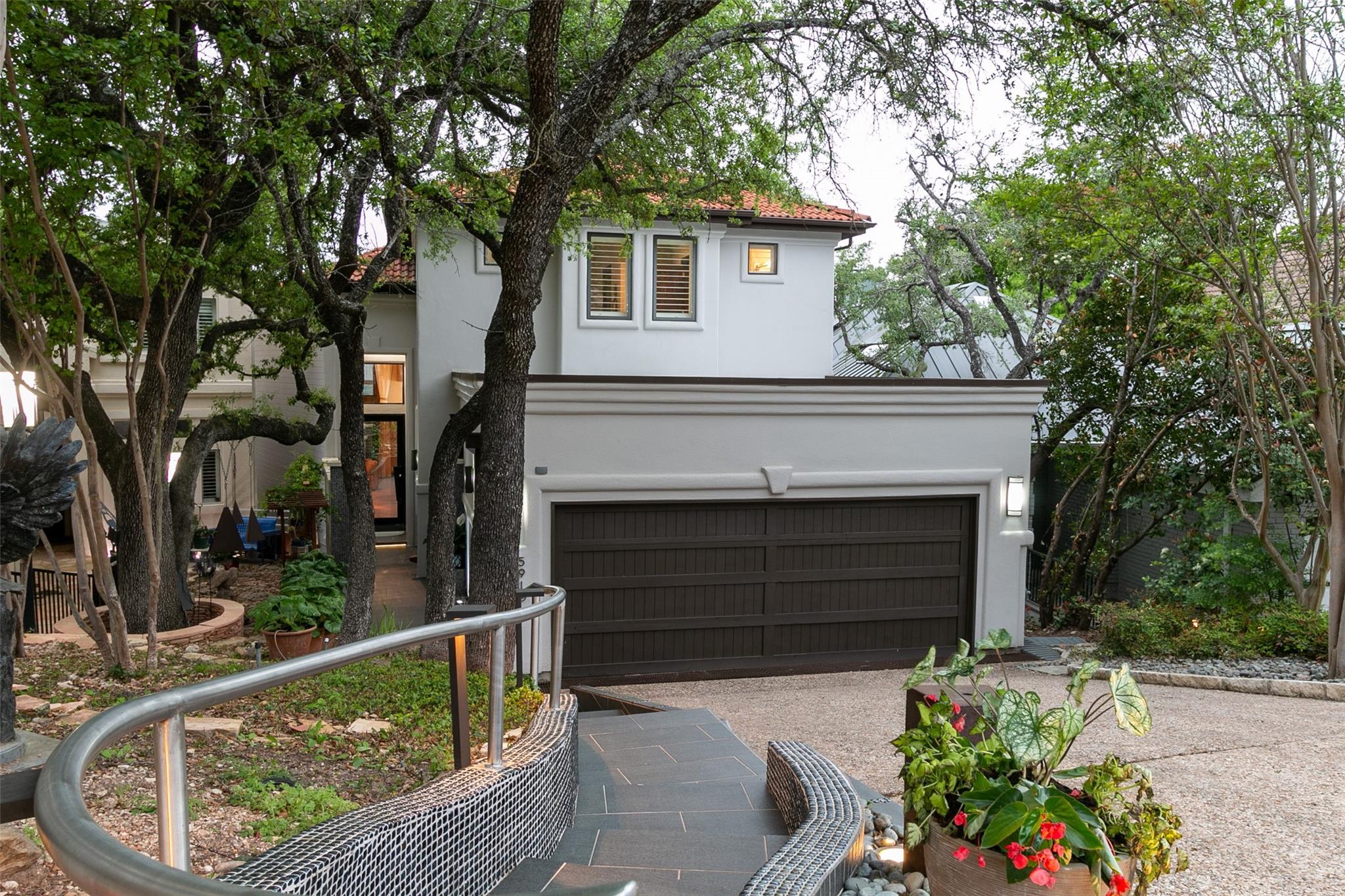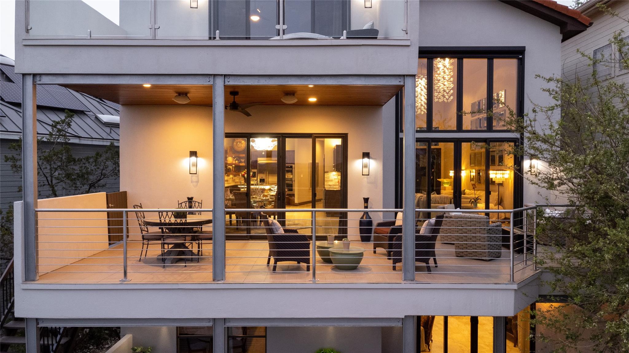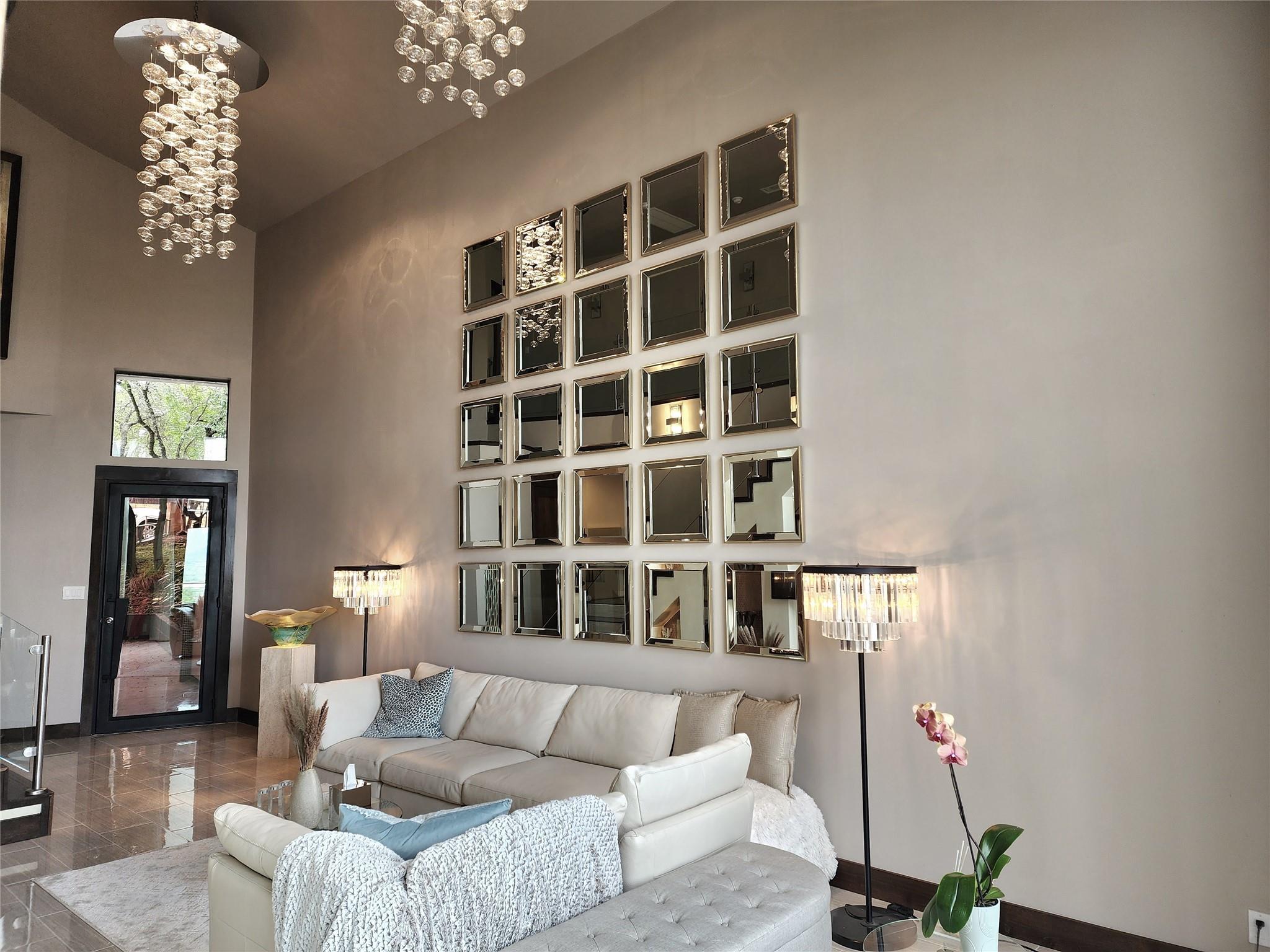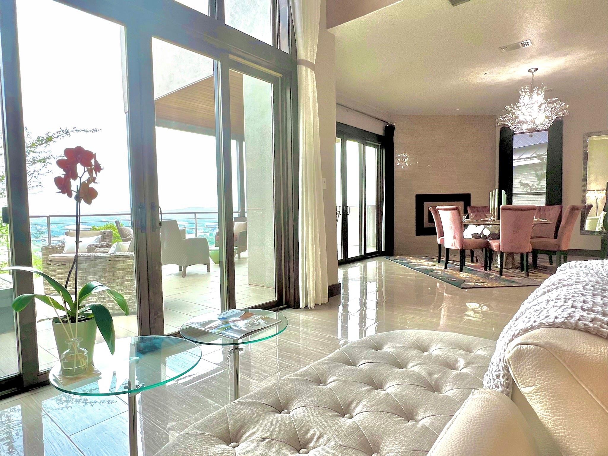 Reduced by 200K~Sunset/Lake Views from Three Deck/Patios~Perfectly perched in the Hills of Cat Mountain, this beautiful custom home offers modern luxury at the heart of Northwest Hills~unparalleled views of Lake Austin, Pennybacker Bridge & Austin Country Club~ move-in ready masterpiece w/magazine-worthy finishings, jaw-dropping views & dazzling light fixtures curated by Lights Fantastic. Main level features expansive open floor plan w/ gourmet kitchen including Kotty Alder cabinetry, spacious bi-level kitchen island w/ seating, full wet bar, Bosch & Thermador Appliances. Down the hall, are 2 bedrooms & an exquisite all-marble full bathroom. Laundry room directly accesses over-sized garage (18" wide overhead door), side-by-side parking & built-in cabinets providing abundant storage. The living & dining rooms feature glamorous light fixtures anchored by dramatic ceiling heights, a sleek floor-to-ceiling tiled accent wall w/ fireplace, wall-to-wall sliding doors perfectly frame spectacular bridge & lake views while allowing direct access to patio. Take the beautifully crafted glass ballister staircase to upper level & enter the primary suite. Primary hosts private view terrace, luxury ZaZa tile accent wall, floor-to-ceiling tile wall w/ fireplace. The lavish ensuite bathroom drips in opulence w/ its ceiling fountain fill garden jetted tub & massive glass shower w/ built-in steamer. Glide past the floating vanities to enter the custom-built California closet. Down the hall, pass the mezzanine glass walkway & enter the 2nd ensuite bedroom featured on this floor, considerably sized w/ custom walk-in closet & full bathroom. Accessible by elevator or stairs from the main level is the lower level, featuring as a private suite w/ 2 generously sized bedrooms, a jack & jill handicap accessible full bathroom, full kitchen, dining, & living room w/ direct patio access. Backyard allows direct access to storage room & greenbelt. All patios in home are steel framed.